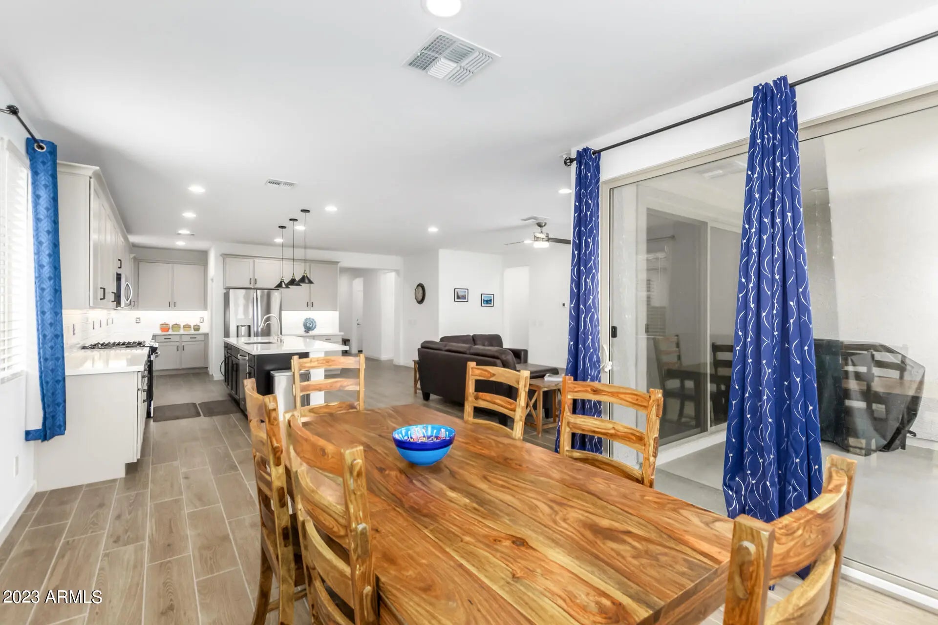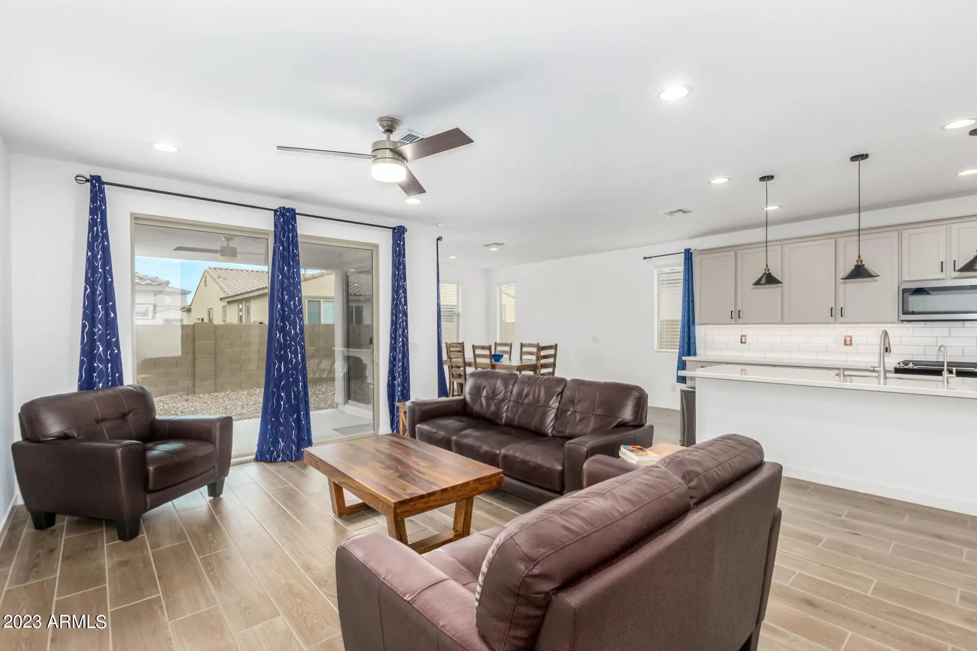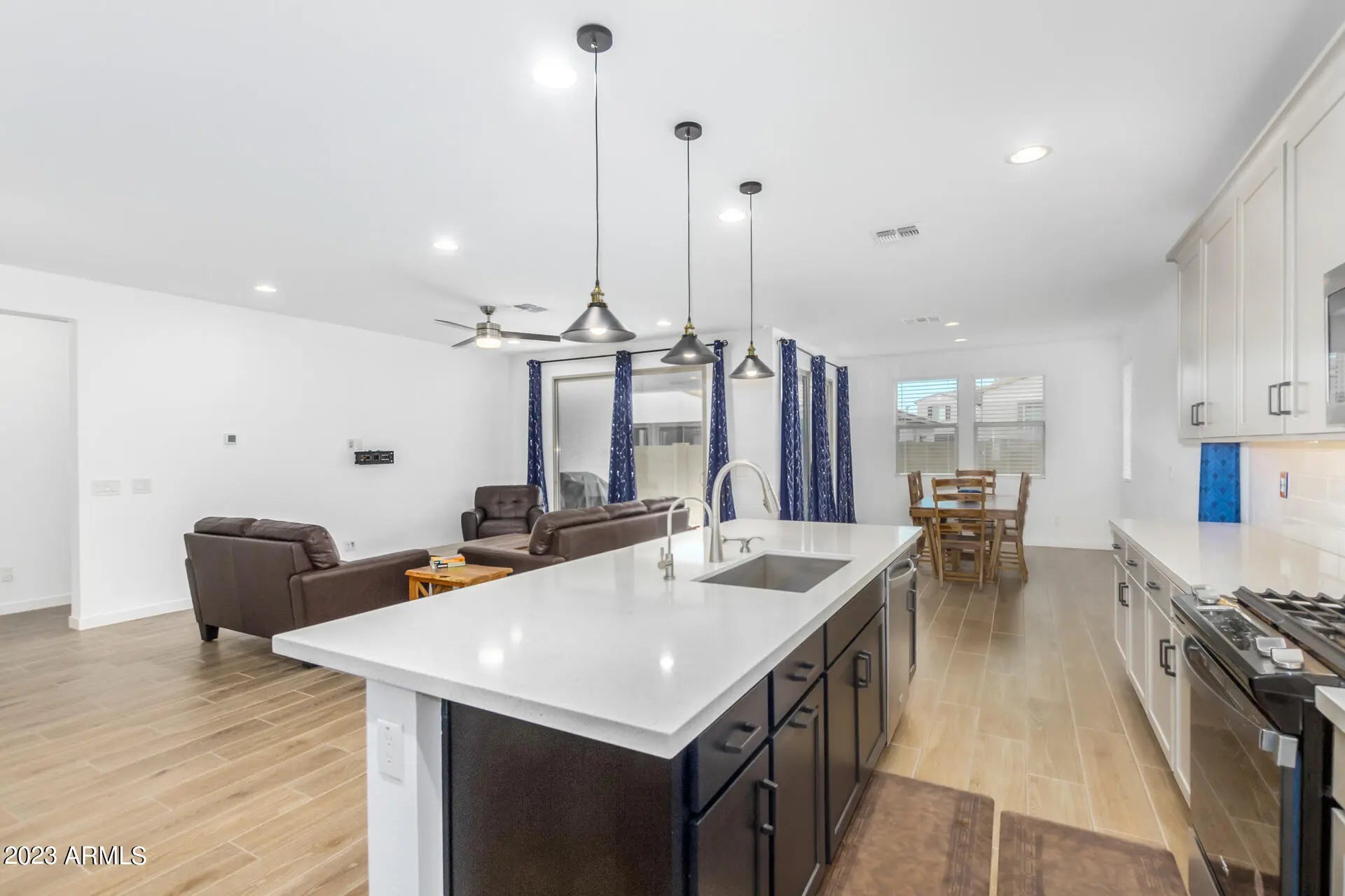 Highly Motivated Seller!! Immaculate 3-bed, 3-bath plus office/den in the award-winning Estrella Mountain Ranch master-planned community. This open-concept home features tall ceilings, wood-look tile, and a gourmet kitchen with quartz countertops, subway backsplash, upgraded cabinetry, large island, stainless steel appliances, and walk-in pantry. Whole house water softener with reverse osmosis connects to refrigerator. The split primary suite offers dual sinks, walk-in closet, and added insulation for comfort and soundproofing. Secondary bedrooms share a Jack & Jill bath. Smart Home system controls garage, locks, lights, thermostat, and security compatible with Alexa, Google, and Apple. EV 240-volt outlet, CAT6 wiring. Washer, dryer, and curtains may convey with an acceptable offer. Enjoy two resident clubs with pools, marina, golf, fitness, trails & dining.