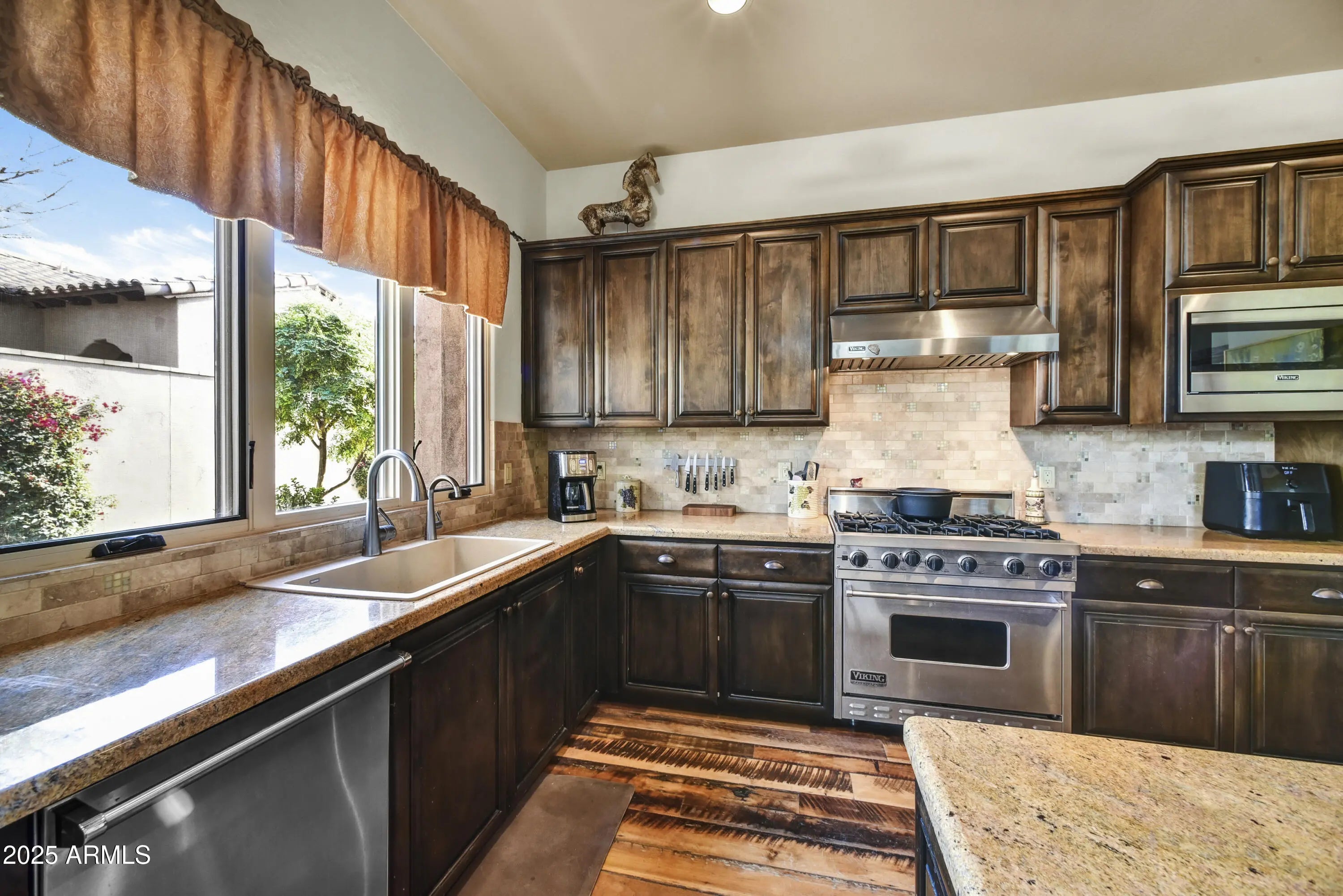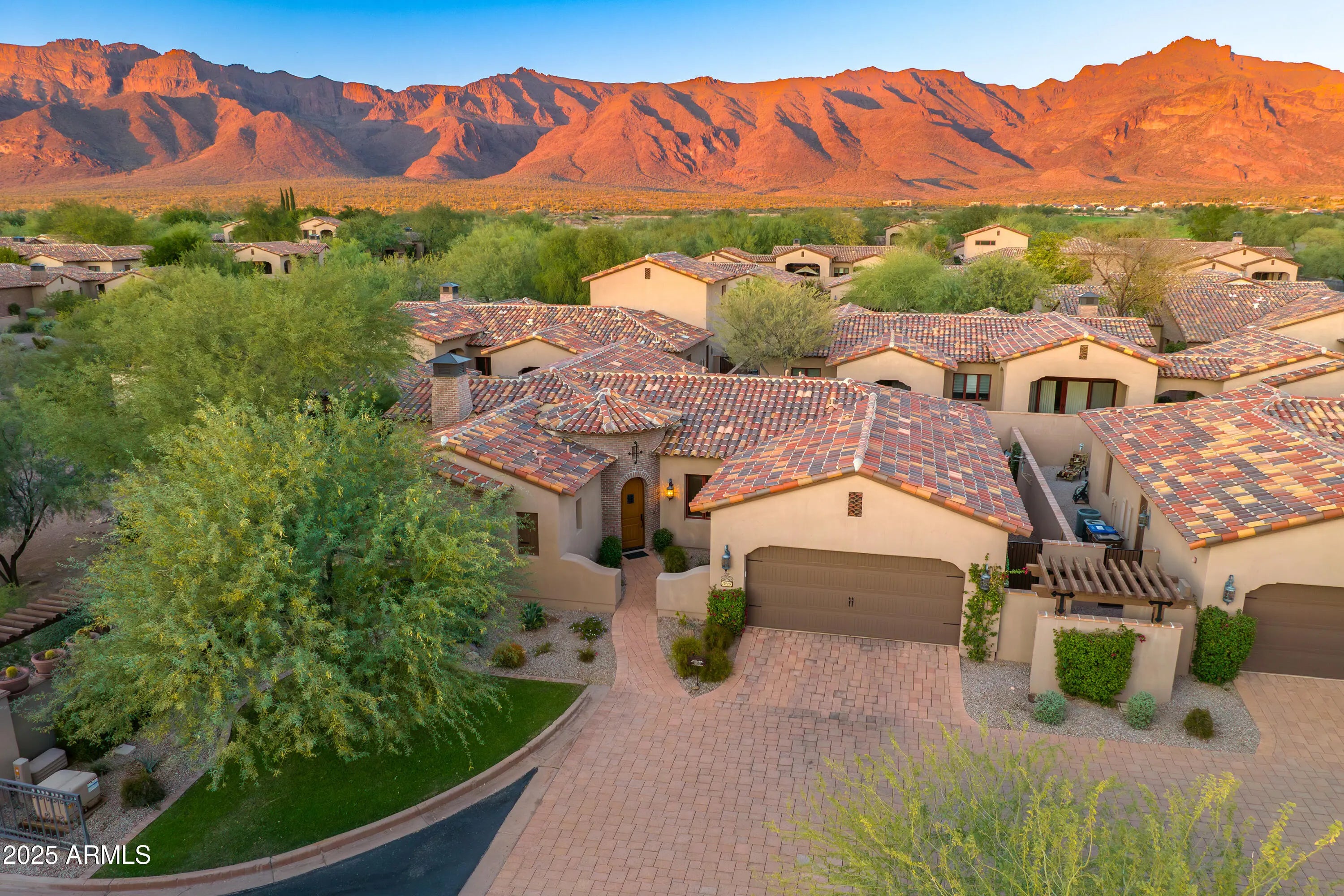 Welcome to one of the most coveted residences in the esteemed Superstition Mountain Golf & Country Club community. This exquisite 2-bedroom, 2-bathroom newly painted villa is sited on a generous 0.19‑acre corner lot. Interior highlights include open-concept layout with 9'+ ceilings and abundant natural light, rich distressed wood flooring (aged/character finish) adds warmth and texture, chef's kitchen featuring Viking appliances, granite countertops, upgraded cabinetry, double pantry, and breakfast bar, two fireplaces (one interior, one exterior) add both ambiance and utility, solid-core 8′ knotty alder doors, built-out closets, upgraded finishes, and a Rinnai tankless water heater. Primary suite with full bath, separate tub and shower and dual vanities. Exterior features include, large outdoor covered Ramada complete with a fireplace, built-in BBQ with sink, mini-fridge, misting system, artificial turf, and beautifully landscaped surroundings. Positioned adjacent to a common area to preserve privacy. Desert front and backscapes with low-maintenance design. Large back yard. Plenty of room to add a small pool or spa. Two-car garage equipped with built-in cabinets and direct access to the villa. A 24/7 guarded, gated community featuring 36 holes of Nicklaus-designed private golf, 50,000 sq ft clubhouse, fine dining, bocce, fitness center, tennis & pickleball courts, heated lap pool & spa, concierge and airport service. Walking distance to the Clubhouse and Fitness Center. Country Club living at its best! Club membership is optional and available under a separate agreement. Conveniently located 35 minutes to Sky Harbor and 25 minutes to Mesa Gateway airports. Buyer and/or buyer's agent to verify all pertinent information, including square footage.