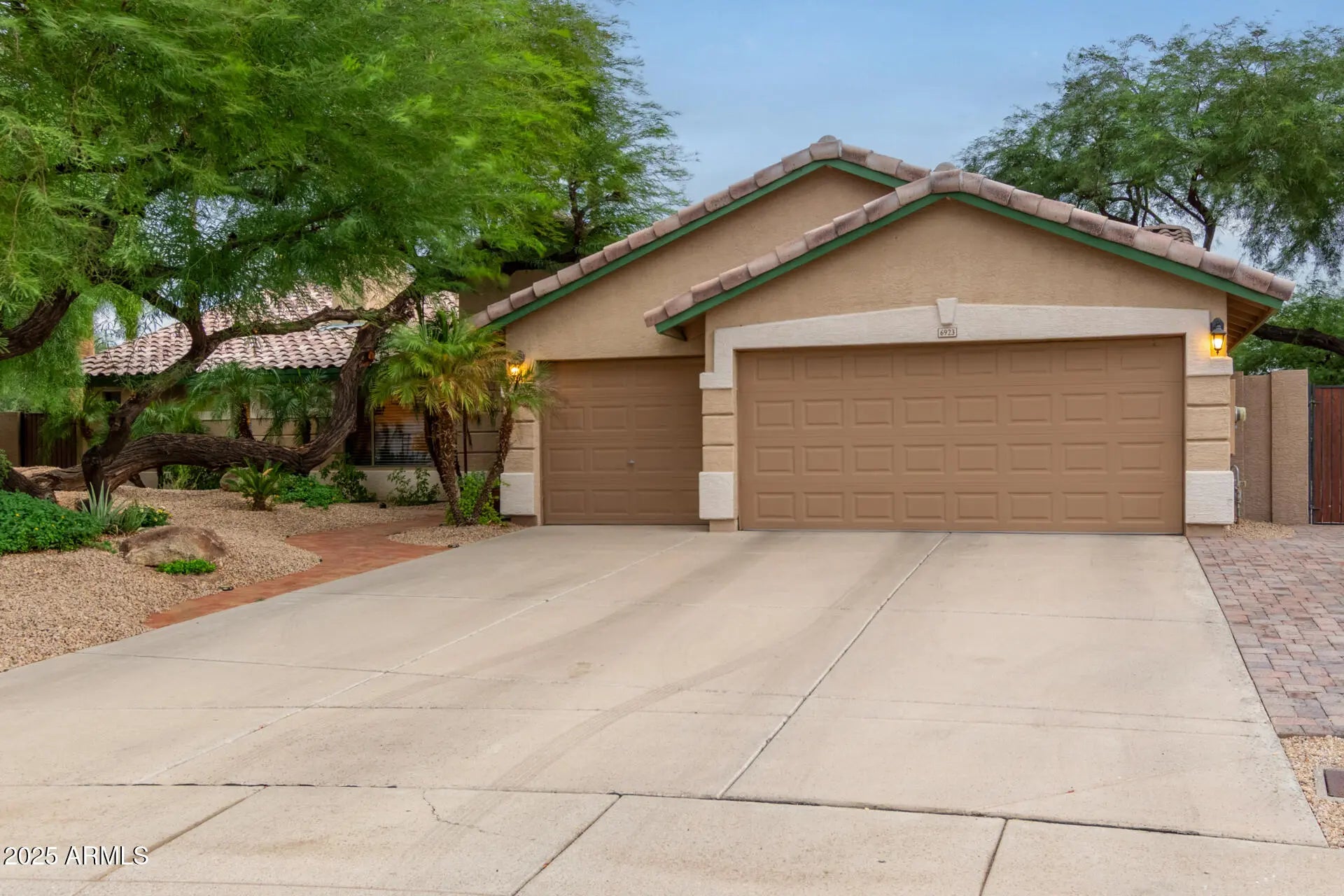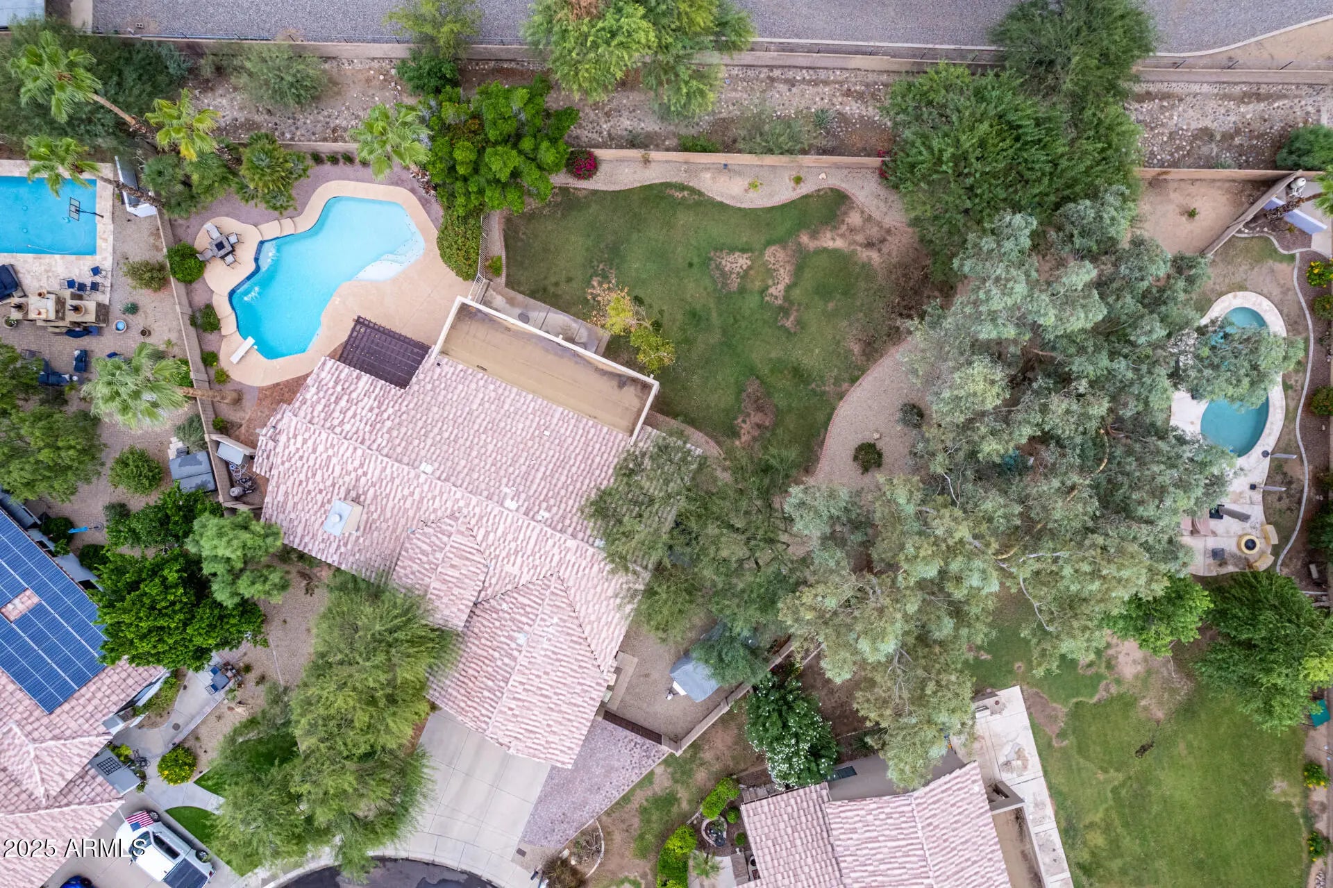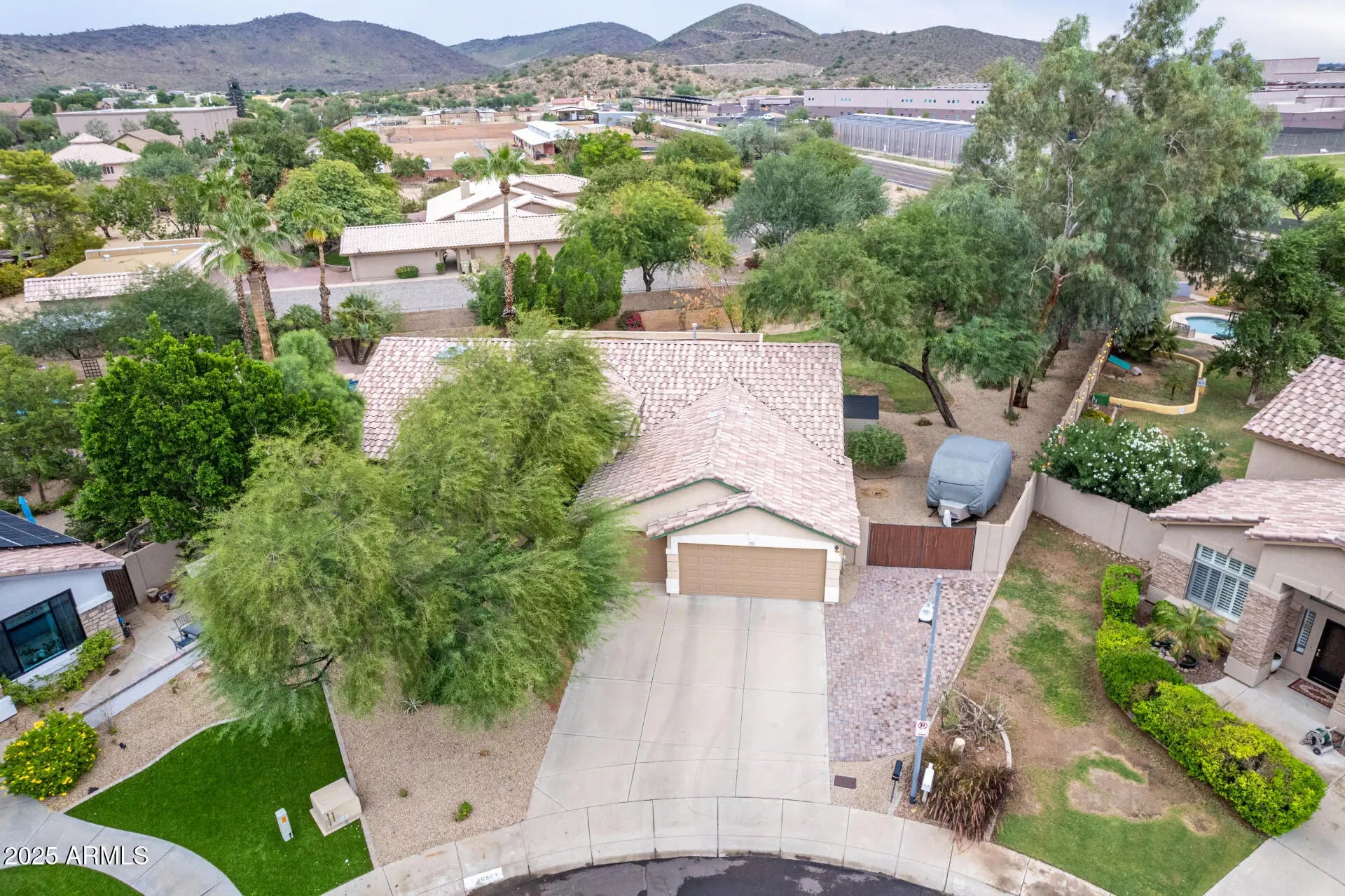 Hard-to-find large cul-de-sac lot in the desirable Patrick Ranch community with RV Parking! This home sits on an oversized lot with room to grow. Beautifully maintained one-owner home offers a spacious layout featuring a huge bonus flex room with a closet and private bath--perfect for a second master suite, guest retreat, or home office--with easy access to the stunning backyard and a sparkling diving pool for seamless indoor-outdoor living. Enjoy beautiful curb appeal with an RV gate, three-car garage, additional paver parking, and a paver walkway leading to the front entry. The great room centers around a cozy gas fireplace and opens to the formal dining area, all enhanced by cathedral ceilings throughout. Pre-wired surround sound is available in the great room, family room and bonus room. The office/den features double doors and connects to three spacious bedrooms. The primary suite offers a double-door entry, walk-in closet, separate heated jacuzzi tub and shower, dual-sink vanity, private toilet room and a sliding glass door with direct access to the backyard oasis. The heart of the home is the kitchen, which flows into the main living areas featuring a center island with counter seating, gas range, and a charming breakfast nook overlooking the backyard. Despite being in an HOA community, the home sits on a 21,402 sq ft lot and offers the flexibility to build a detached workshop, garage, or guest house/ADUideal for hobbyists, business owners, or multigenerational living (buyer to verify with HOA). The backyard showcases an extended covered patio, sparkling diving pool, custom pergola with mountain and sunset views and an expansive side yard perfect for RV Parking with a 30-amp plug-in and tool shed. A cozy corner seating area surrounds a six-foot soothing water feature, with mature landscaping front and back. Conveniently located near top-rated schools, restaurants, shopping, and Thunderbird Park with hiking trails plus quick access to Loop 101 and I-17 freeways. This exceptional property truly offers everything you ever wanted in a home!!