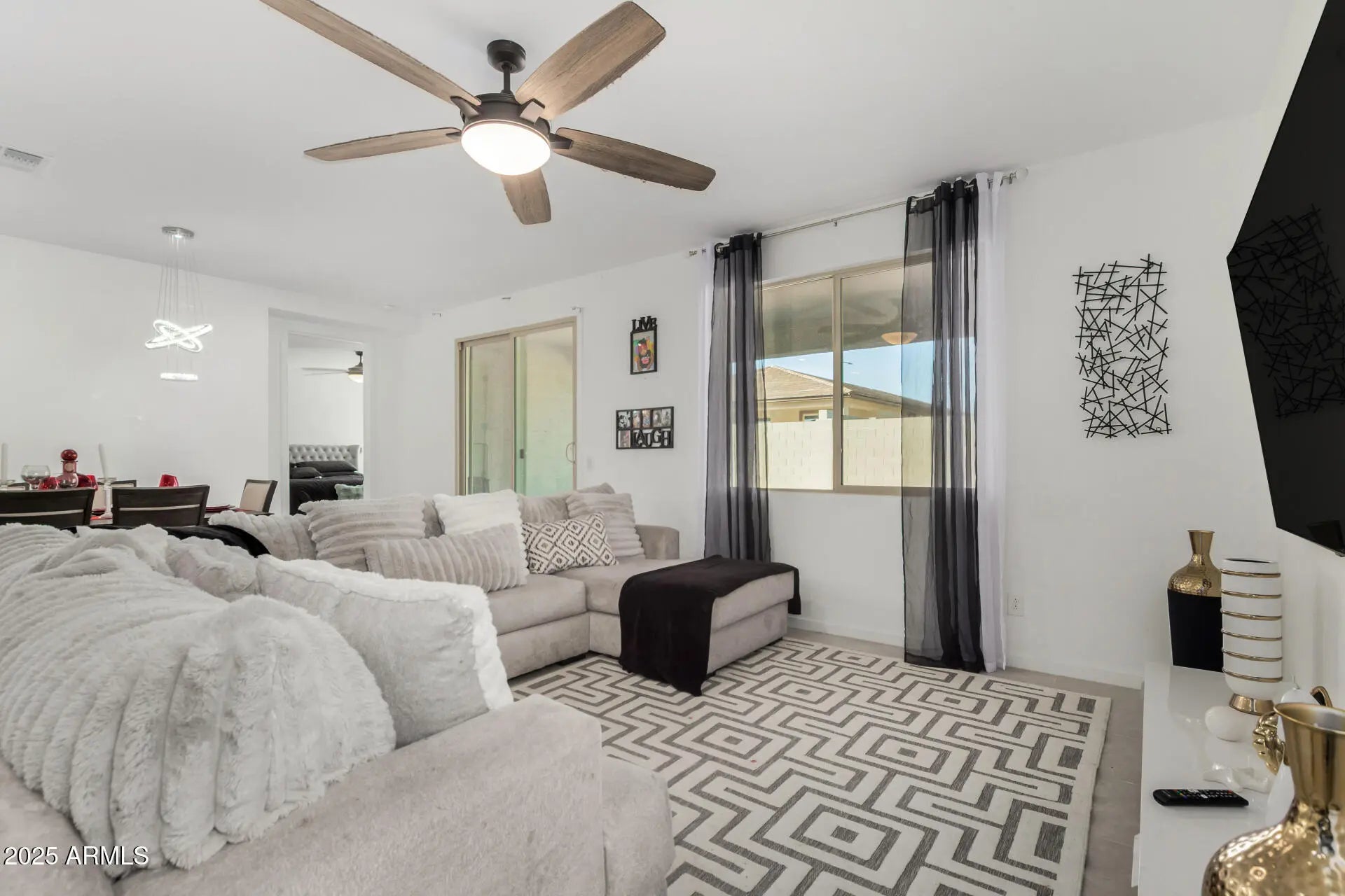 Discover all the charm of this adorable 4-bedroom home in Copper Falls! The inviting curb appeal, easy-care landscape, and 2-car garage are just the beginning! Fall in love with the bright & open layout designed with comfortable everyday living in mind, featuring tile flooring, neutral tones, and abundant natural light. The pristine culinary space boasts shaker-style cabinetry, tile backsplash, solid-surface counters, SS appliances, a walk-in pantry, and an island. The serene main bedroom showcases a walk-in closet and a bathroom with double sinks. The flex room and den are ideal for a craft area and an office. The low-maintenance backyard is complete with a cozy covered patio where you can unwind after a long day and a nice space for outdoor fun. What's not to love? Make it yours!