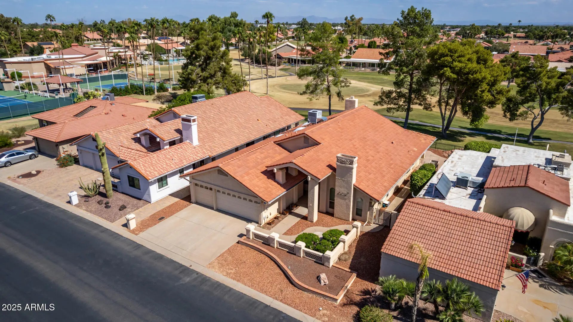 Resort-style living w/panoramic GOLF COURSE VIEWS in this elegant POSADA model perfectly positioned on the 9th hole of the sought-after gated community of Palo Verde CC-walking distance to the clubhouse. A grand courtyard & double-door entry welcome you into refined interiors featuring PLANTATION SHUTTERS, VAULTED ceilings, formal living, dining & a spacious study w/ custom built-ins. The chef's kitchen w/oversized peninsula, GRANITE countertops, BAY WINDOW & breakfast nook opens to the inviting family rm w/ dry bar. Expansive primary suite offers a coffee station, fireplace, patio access, walk-in closet, soaking tub, shower & dual sinks. A RARE 3-CAR GARAGE, newer HIGH-END MISTING SYSTEM, water heater & soft water (2023), newer windows, newer HVAC (2023) & updated roof complete this home Venture out onto the backyard, complete with a spacious covered patio and serene golf course views. Make this gem yours now!