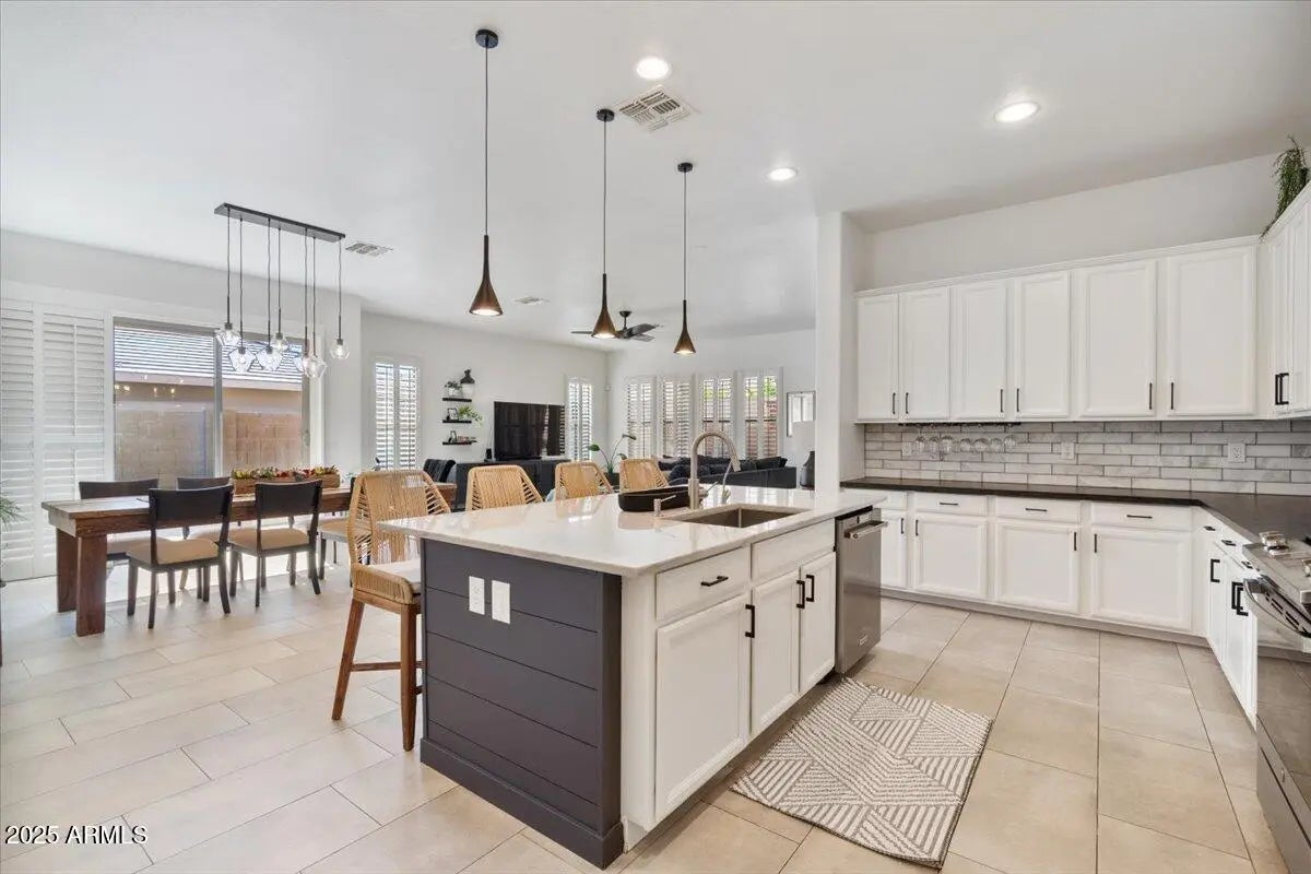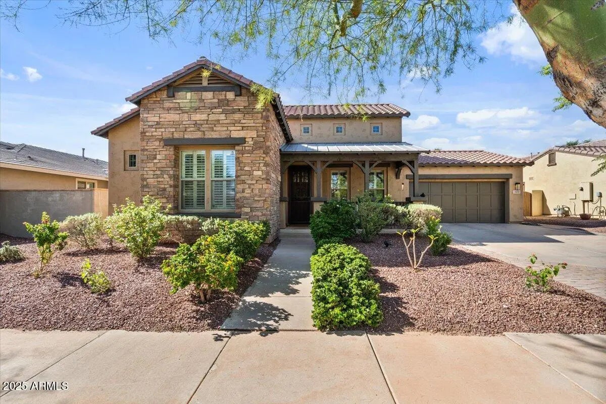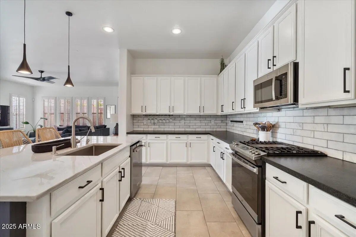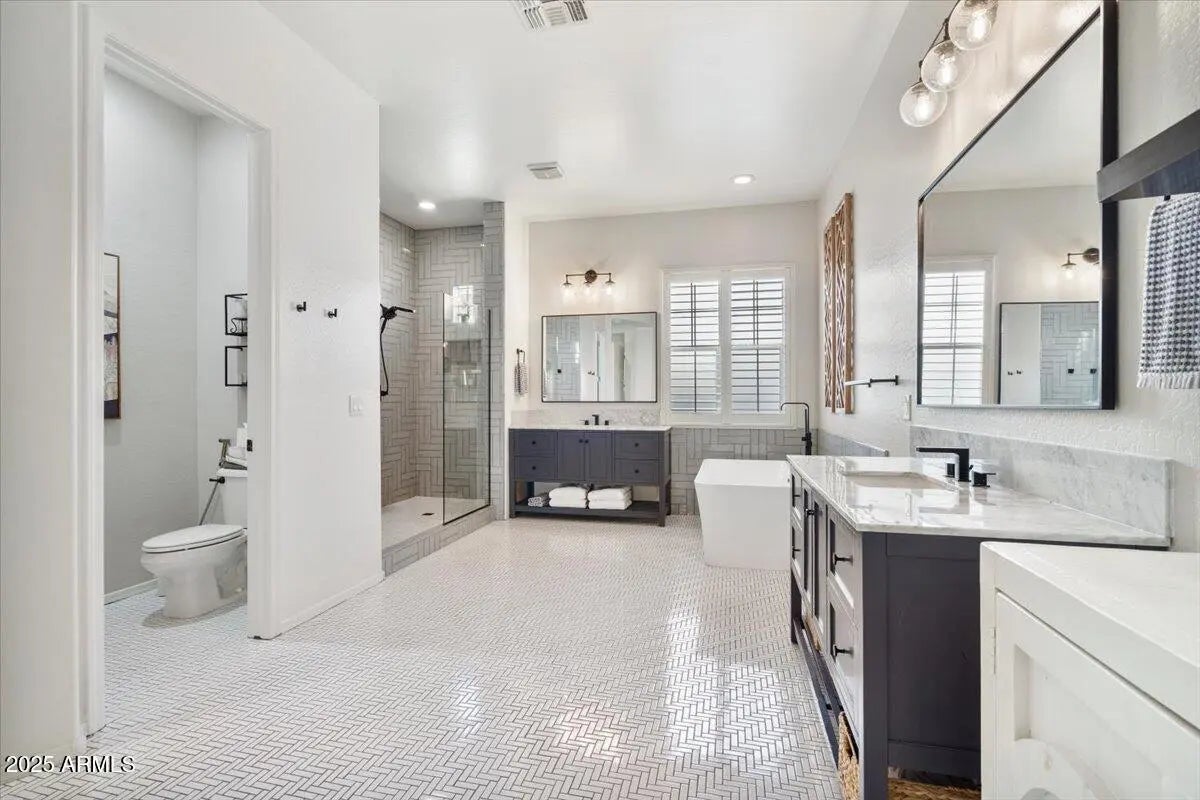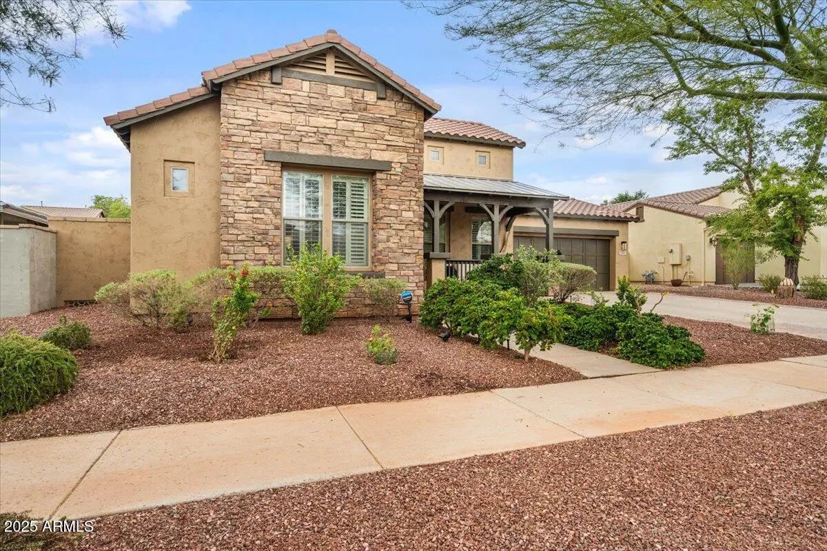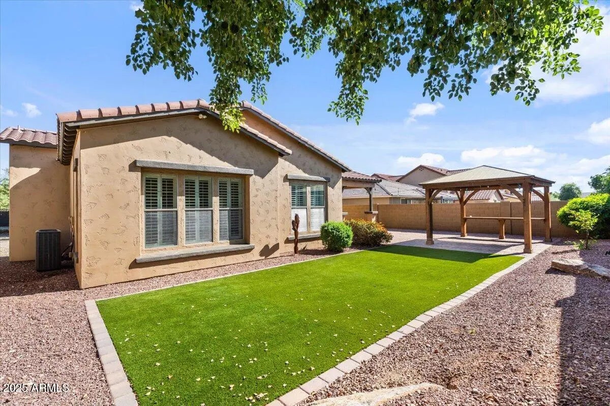 Gorgeous Verrado Engle Palmcroft single story home. This floorplan is a neighborhood favorite, because of its open floorplan, and ample room size. With a 4-car garage, brand new AC units and complete interior updates including large scale tile throughout, updated kitchen with quartzite and granite countertops, tile backsplash, refinished cabinetry with added hardware and modern light fixtures. Just off the kitchen, the oversized family room is perfect for entertaining, with access to the backyard and a large dining area. The renovated primary ensuite boasts a stunning spa-like bath with stand-alone tub, large shower, and custom tile. The exterior includes a large front porch, covered back patio with pergola, and lush private yard. This home checks all the boxes! Additional custom tiled butler's pantry, guest bath, and storage niche, highlight the pride of ownership that has gone into this stunning home. Located in Verrado, this beauty grants you access to all of what makes Verrado an Oasis in the desert. Community pools, fitness center, mountain hiking trails, golf course, restaurants, and entertainment. This master-planned community has so much to offer, and just keeps getting better.