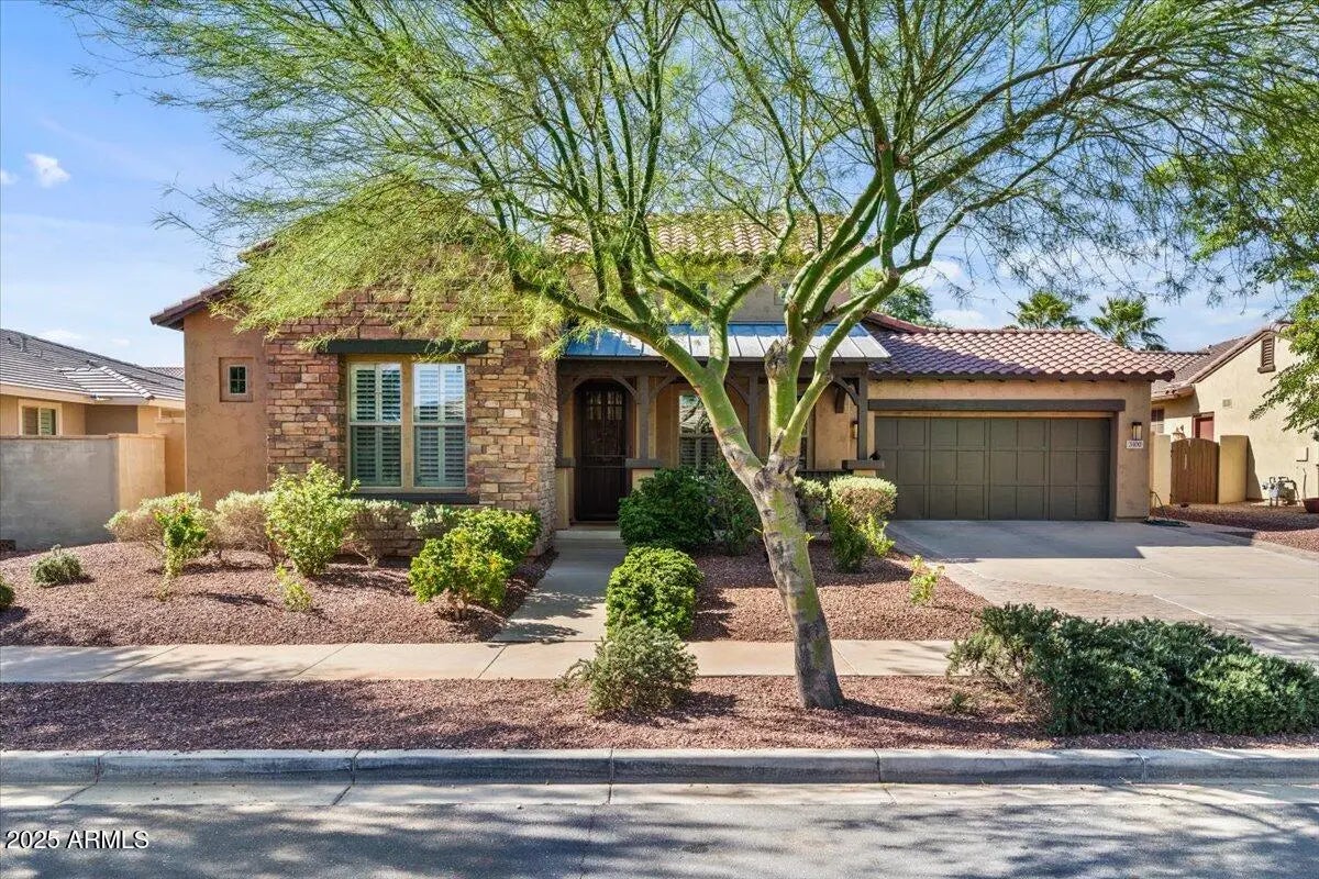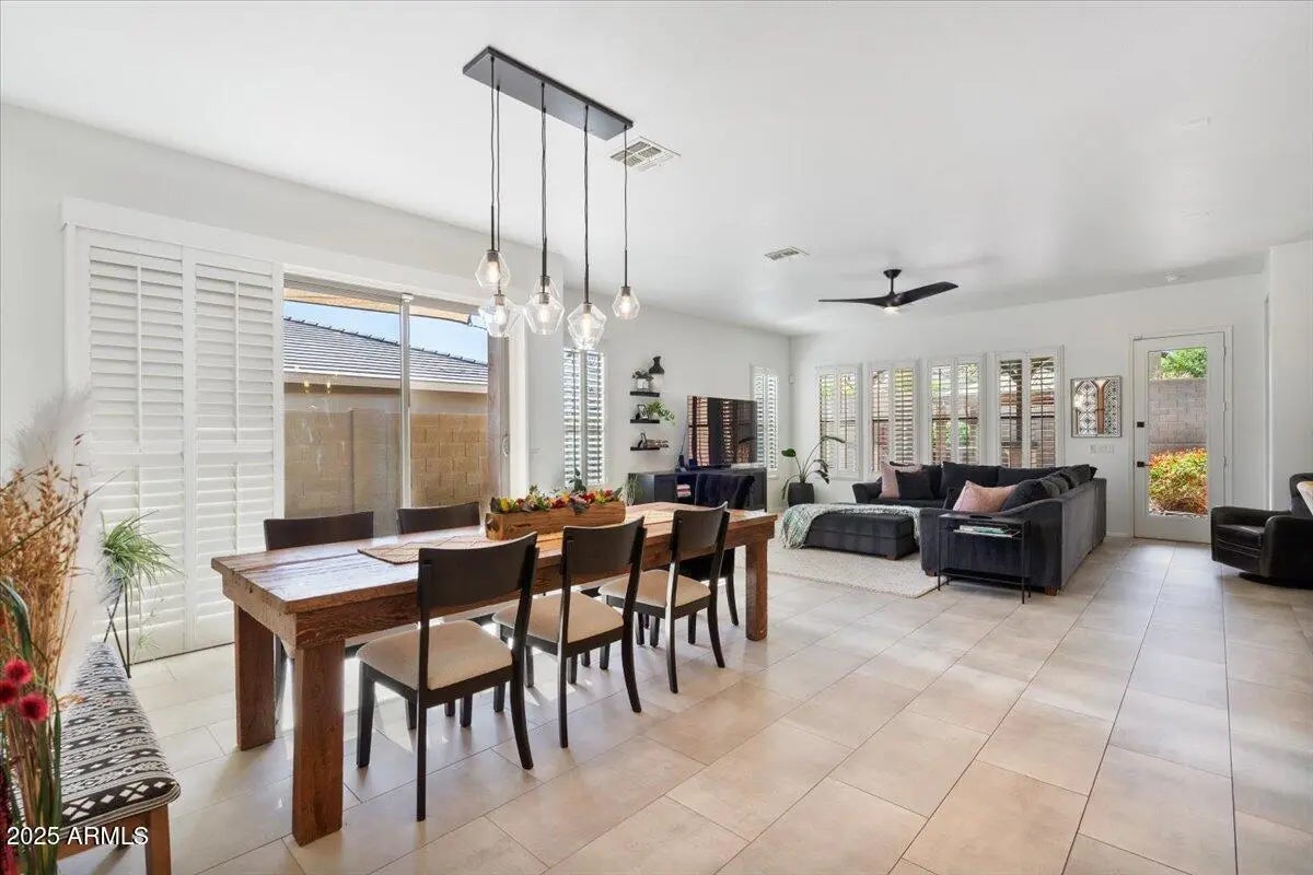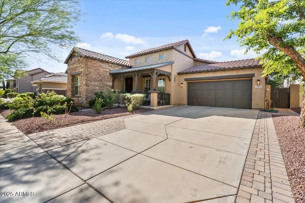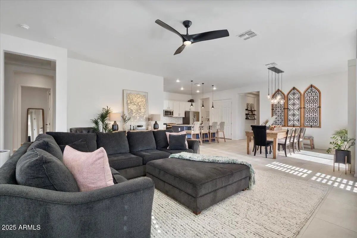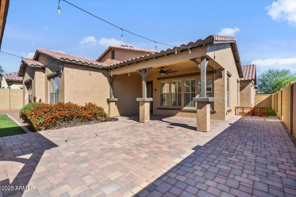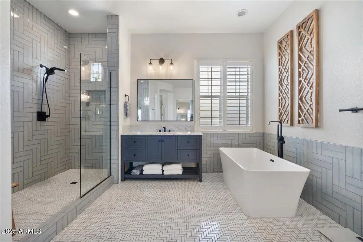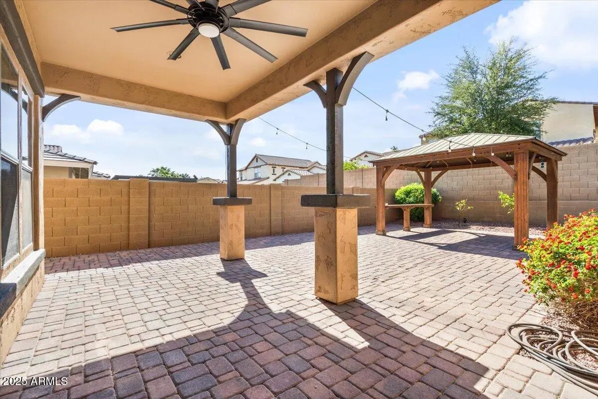 Gorgeous Verrado Engle Palmcroft single story home. This floorplan is a neighborhood favorite, because of its open floorplan, and ample room size. With a 4-car garage, brand new AC units and complete interior updates including large scale tile throughout, updated kitchen with quartzite and granite countertops, tile backsplash, refinished cabinetry with added hardware and modern light fixtures. Just off the kitchen, the oversized family room is perfect for entertaining, with access to the backyard and a large dining area. The renovated primary ensuite boasts a stunning spa-like bath with stand-alone tub, large shower, and custom tile. The exterior includes a large front porch, covered back patio with pergola, and lush private yard. This home checks all the boxes! Additional custom tiled butler's pantry, guest bath, and storage niche, highlight the pride of ownership that has gone into this stunning home. Located in Verrado, this beauty grants you access to all of what makes Verrado an Oasis in the desert. Community pools, fitness center, mountain hiking trails, golf course, restaurants, and entertainment. This master-planned community has so much to offer, and just keeps getting better.