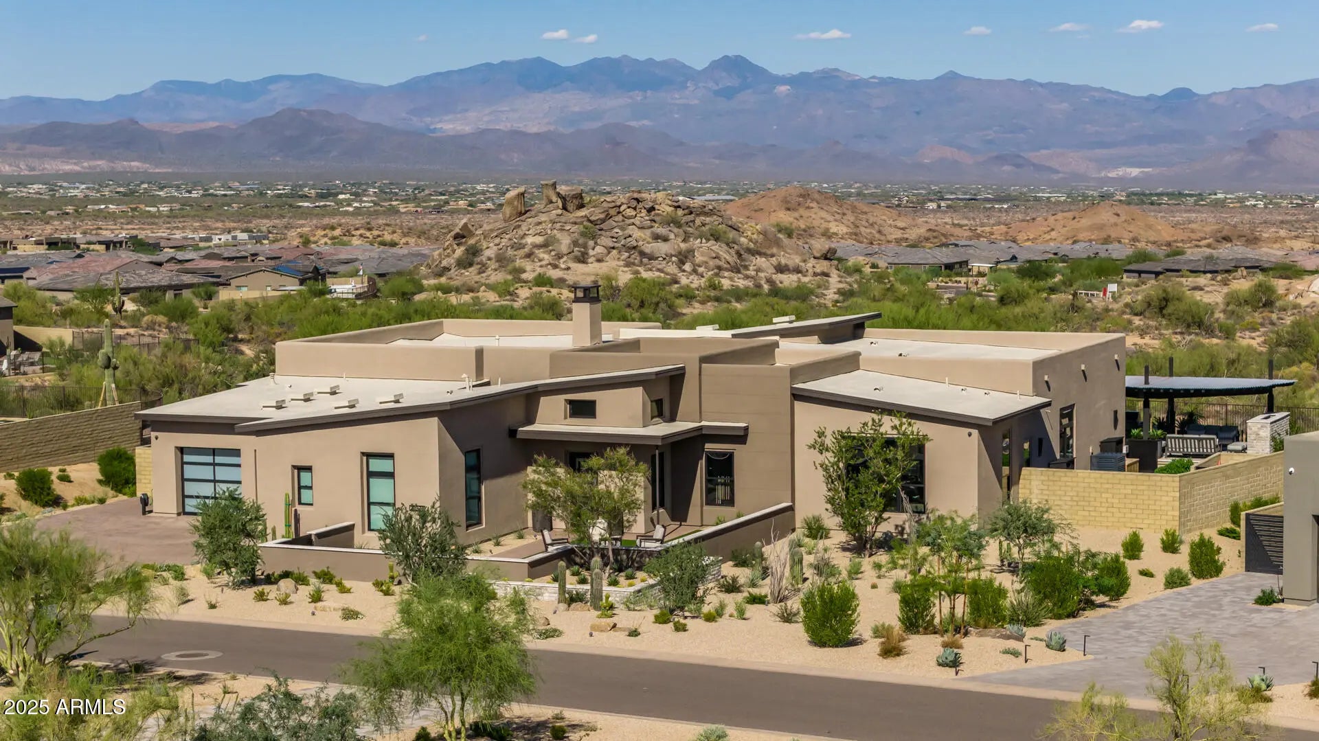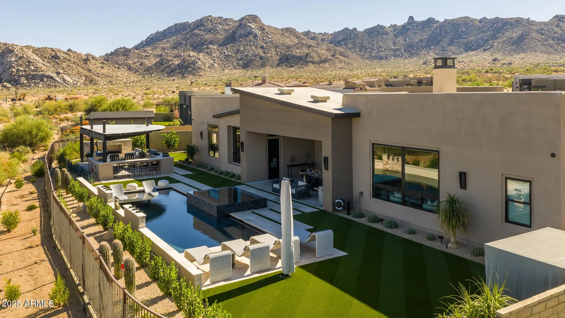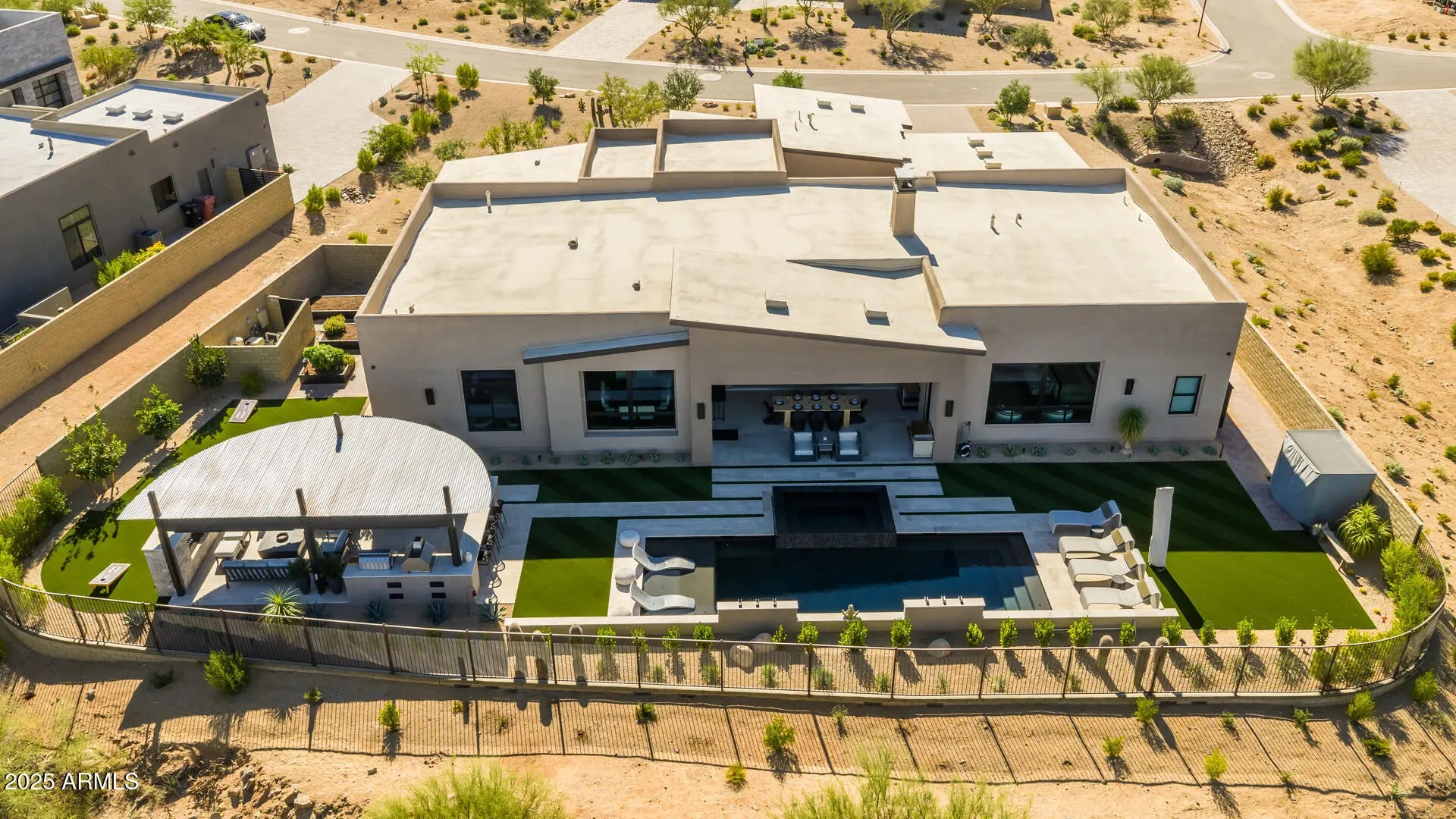 Nestled in the prestigious new development of Storyrock, this extraordinary Rosewood semi-custom home occupies the premier homesite in the community, offering unobstructed, panoramic views of Four Peaks and Tom's Thumb. With an east-facing backyard, you'll enjoy both breathtaking sunrises and vibrant sunsets from the comfort of your home and outdoor living areas. Exceeding $2M in premium upgrades, this residence is finished to the highest standards. This home is a true masterpiece, blending timeless modern design with cutting-edge technology and luxurious desert living. Come experience why Storyrock is among Scottsdale's most sought-after enclaves. Expansive floor-to-ceiling windows in the Great Room flood the interiors with natural light and frame the captivating mountain views and surrounding desert landscape. The chef's kitchen is outfitted with top-of-the-line Wolf Pro Series and Sub-Zero appliances, and features an extended layout with 24 feet of additional custom cabinetry and countertops, perfect for entertaining and ample storage. The oversized kitchen island boasts a sleek waterfall-edge leathered granite countertop with a stainless steel apron sink, while matching granite continues seamlessly up the backsplash for a modern, unified look. The split floor plan offers maximum privacy. The Primary Suite is a tranquil retreat with stunning views, direct access to the backyard oasis, and a lavish ensuite bathroom featuring two custom-designed walk-in closets, an oversized walk-in shower with floor-to-ceiling tile, triple shower heads, and a deep soaking tub. Each ancillary bedroom includes an ensuite bath and walk-in closet, offering comfort and privacy for guests or family members. Just off the foyer, a custom executive office/library showcases floor-to-ceiling built-in bookcases with integrated LED lighting an ideal setting for work or study. The resort-style backyard is a true entertainer's dream, featuring a heated pool with a 6-person spa and Four Peaks views, a fully custom outdoor kitchen with a high-end Heston grill, pizza oven, Memphis wood-fired smoker, refrigerator, and sealed storage, a large gas fireplace, and expansive covered patios and lounge areas. Come experience why Storyrock is among Scottsdale's most sought-after enclaves.
