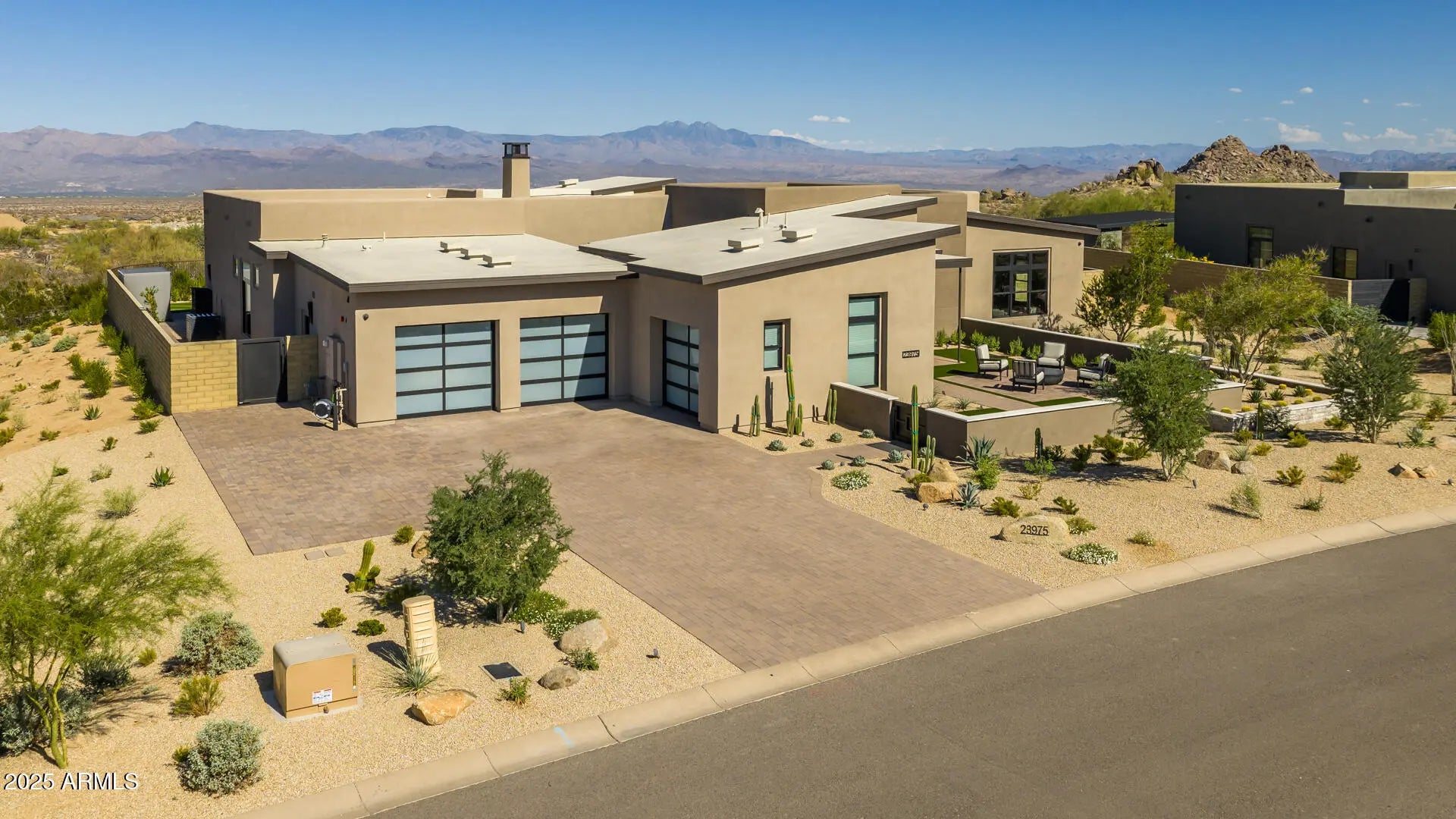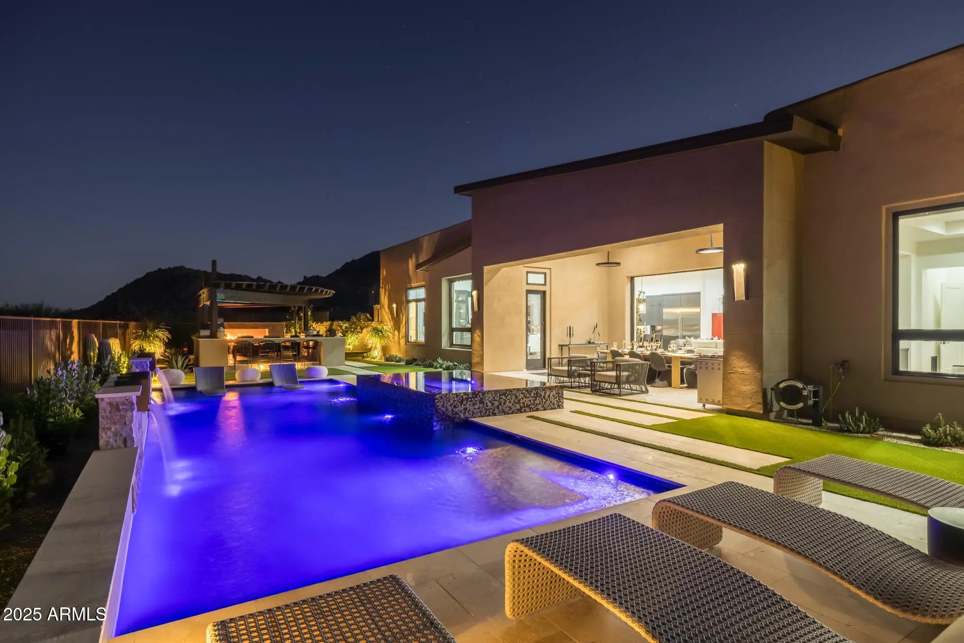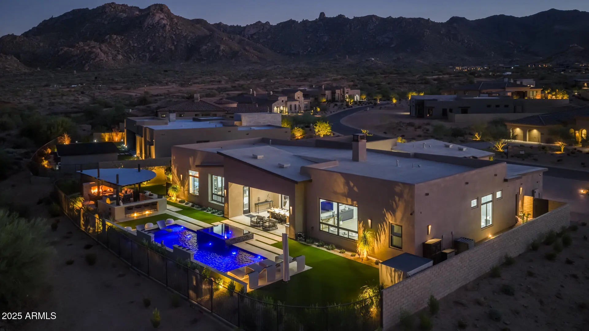 Nestled in the prestigious new development of Storyrock, this extraordinary Rosewood semi-custom home occupies the premier homesite in the community, offering unobstructed, panoramic views of Four Peaks and Tom's Thumb. With an east-facing backyard, you'll enjoy both breathtaking sunrises and vibrant sunsets from the comfort of your home and outdoor living areas. Exceeding $2M in premium upgrades, this residence is finished to the highest standards. This home is a true masterpiece, blending timeless modern design with cutting-edge technology and luxurious desert living. Come experience why Storyrock is among Scottsdale's most sought-after enclaves. Expansive floor-to-ceiling windows in the Great Room flood the interiors with natural light and frame the captivating mountain views and surrounding desert landscape. The chef's kitchen is outfitted with top-of-the-line Wolf Pro Series and Sub-Zero appliances, and features an extended layout with 24 feet of additional custom cabinetry and countertops, perfect for entertaining and ample storage. The oversized kitchen island boasts a sleek waterfall-edge leathered granite countertop with a stainless steel apron sink, while matching granite continues seamlessly up the backsplash for a modern, unified look. The split floor plan offers maximum privacy. The Primary Suite is a tranquil retreat with stunning views, direct access to the backyard oasis, and a lavish ensuite bathroom featuring two custom-designed walk-in closets, an oversized walk-in shower with floor-to-ceiling tile, triple shower heads, and a deep soaking tub. Each ancillary bedroom includes an ensuite bath and walk-in closet, offering comfort and privacy for guests or family members. Just off the foyer, a custom executive office/library showcases floor-to-ceiling built-in bookcases with integrated LED lighting an ideal setting for work or study. The resort-style backyard is a true entertainer's dream, featuring a heated pool with a 6-person spa and Four Peaks views, a fully custom outdoor kitchen with a high-end Heston grill, pizza oven, Memphis wood-fired smoker, refrigerator, and sealed storage, a large gas fireplace, and expansive covered patios and lounge areas. Come experience why Storyrock is among Scottsdale's most sought-after enclaves.