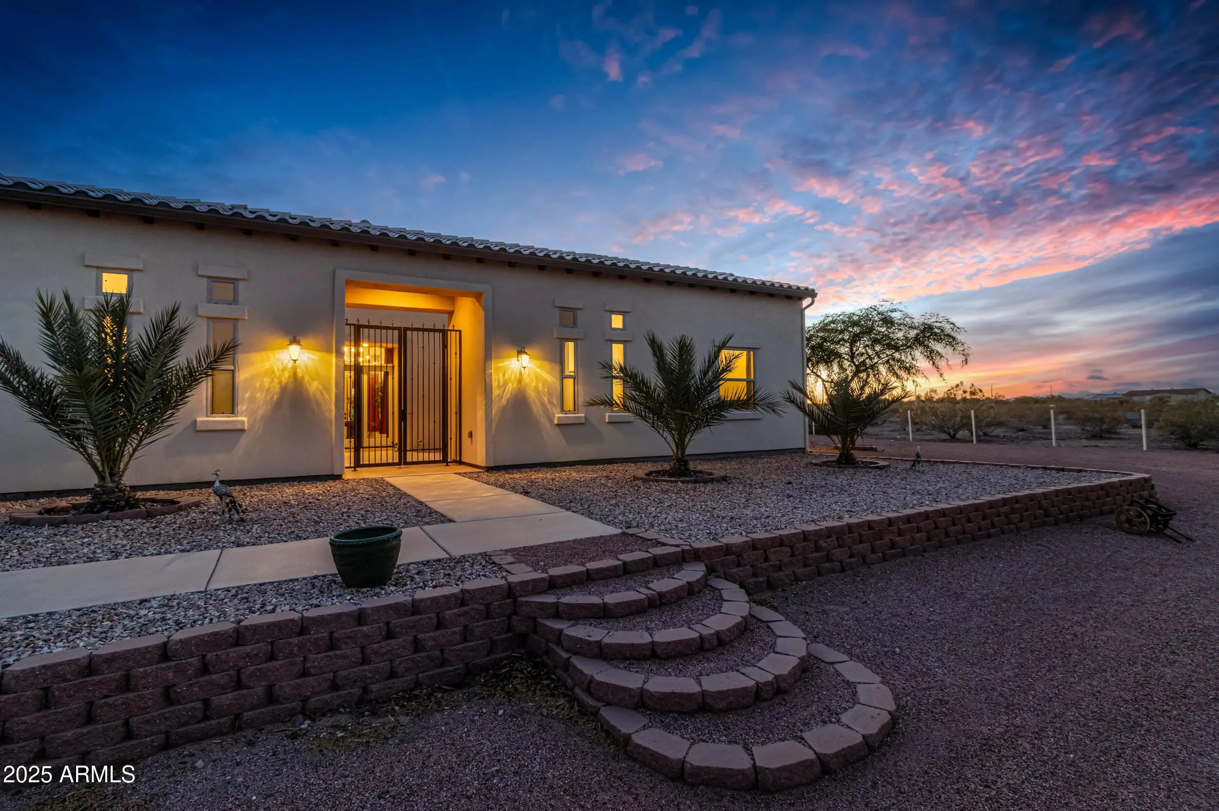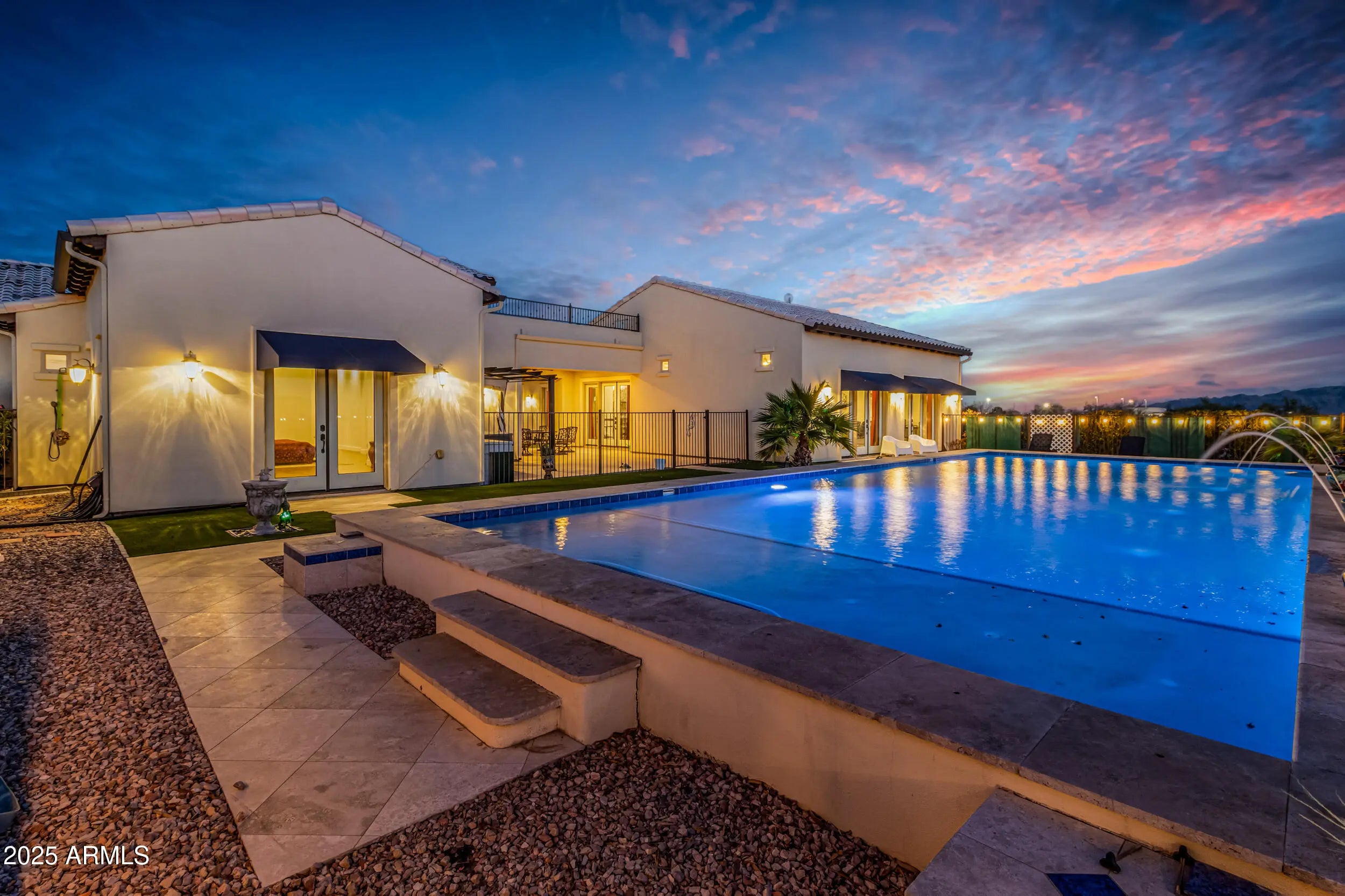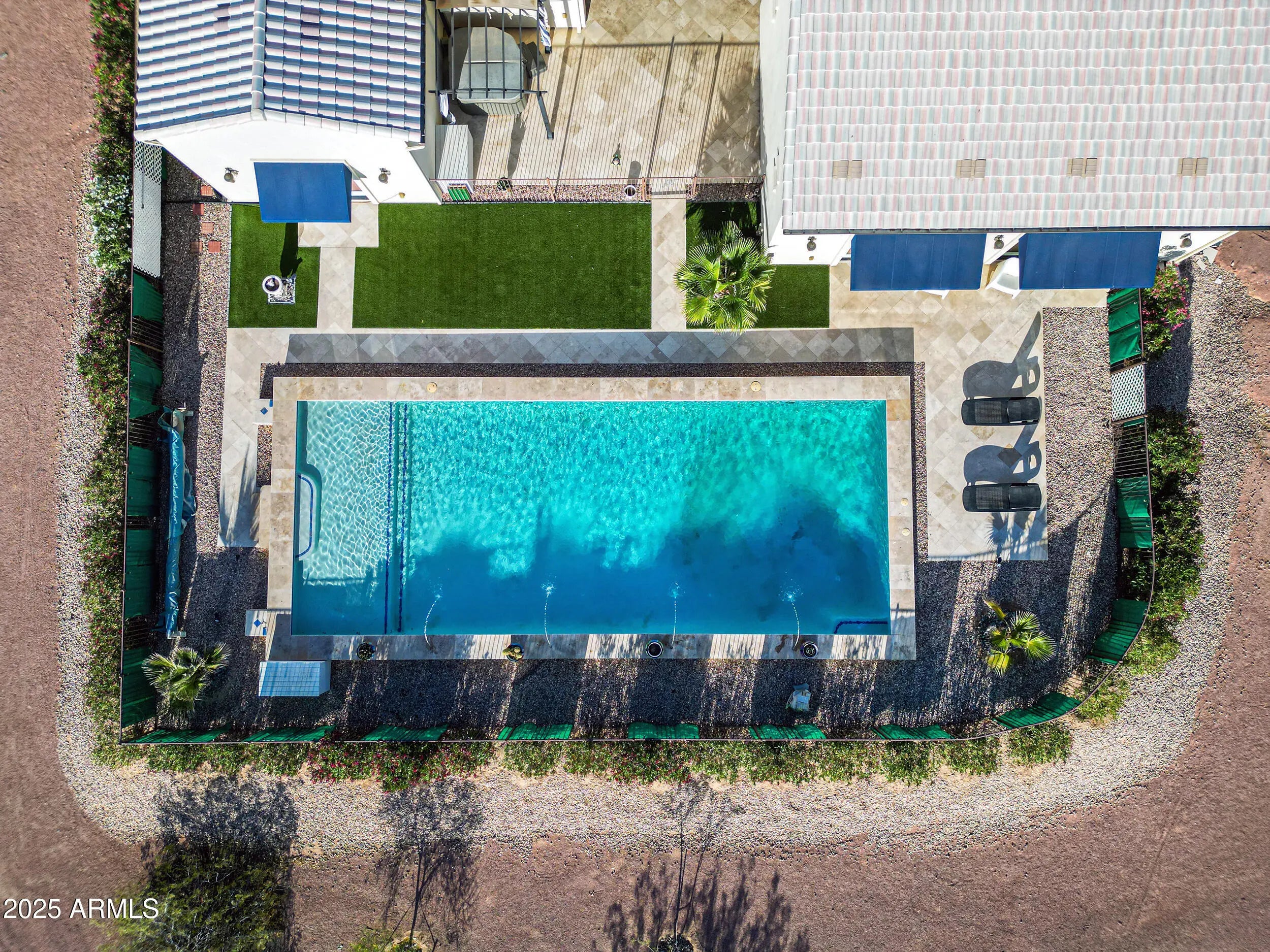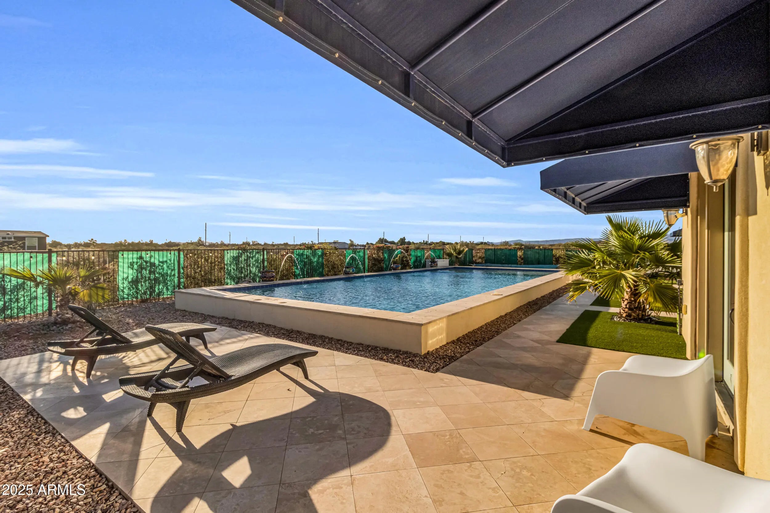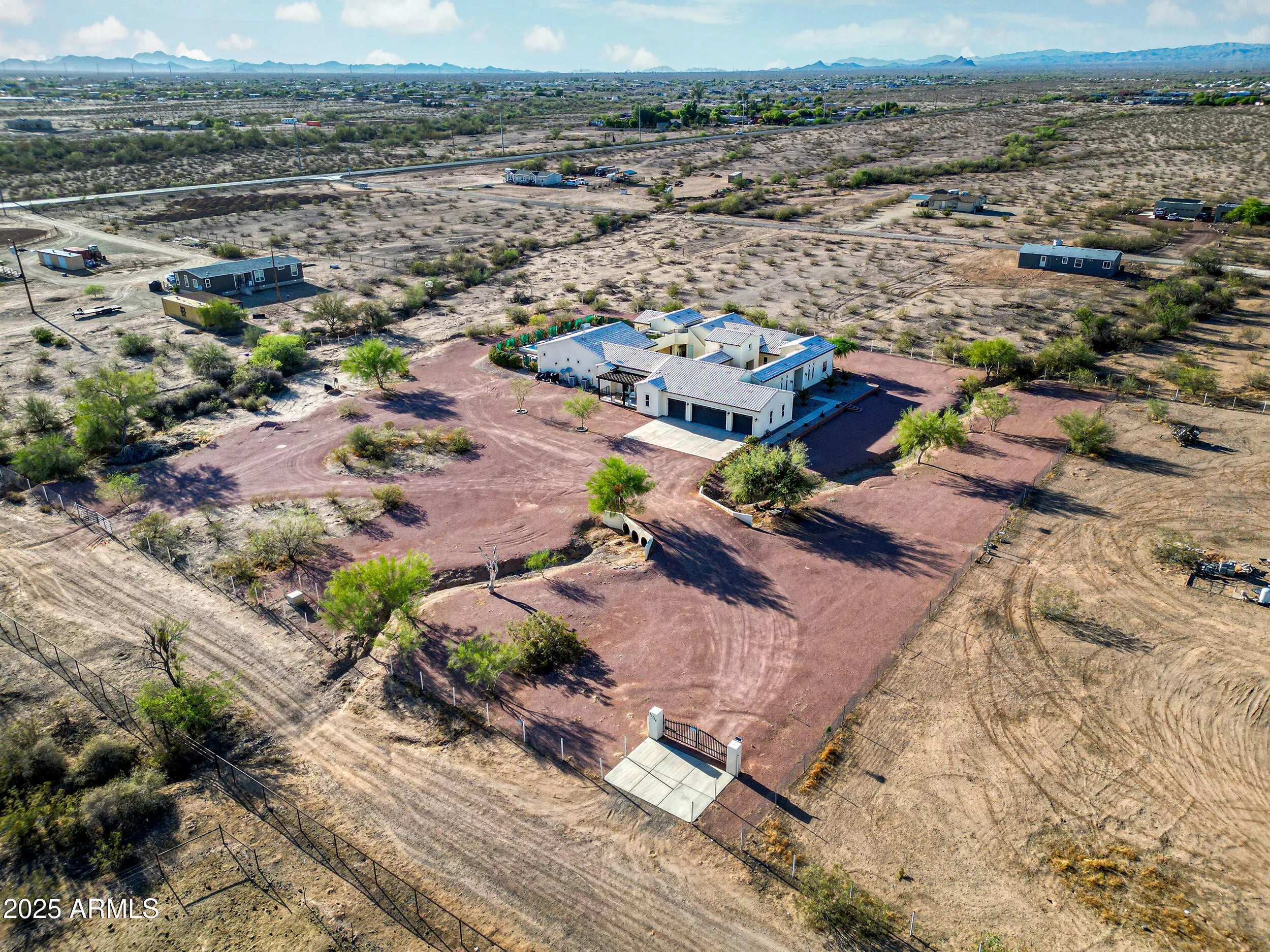 A Rare Private Estate — Luxury, Privacy & Thoughtful Design...This is the kind of home that rarely comes on the market!! A nearly 6,000 sq ft private compound on over 2.5 acres with mature trees, lush landscape, a private well, and every detail thoughtfully curated. You have plenty of room for horses, chickens, and storage for even the largest of hobbies. This gated entrance leads to a private driveway, beautifully landscaped entrance and 4-car garage, setting the tone for inside. At the heart of the home, a central courtyard with turf and rooftop terrace offers panoramic views in every direction. The resort-style backyard features a massive hotel-sized pool with 4 water features, a full size hot tub, travertine tile, turf, and multiple access points to the interior Inside, you're welcomed by 22 foot foyer entrance, 12 foot tray ceilings, striking chandeliers, and luxury engineered wood plank floors. Your oversized laundry room has with plenty of storage. The chef's kitchen includes quartz countertops, double wall ovens, a large island with storage and a breakfast bar that seats 12! -- perfect for entertaining even the largest crowds. Each of the 4 bedrooms HAS IT'S OWN EN SUITE BATHROOM, while the primary suite is a private sanctuary with a full size sitting area, large walk-in closet, a spa-like bath, dual vanities and a shower the size of a bedroom. This home offers a rare blend of space, elegance, and privacy - a true one-of-a-kind retreat.