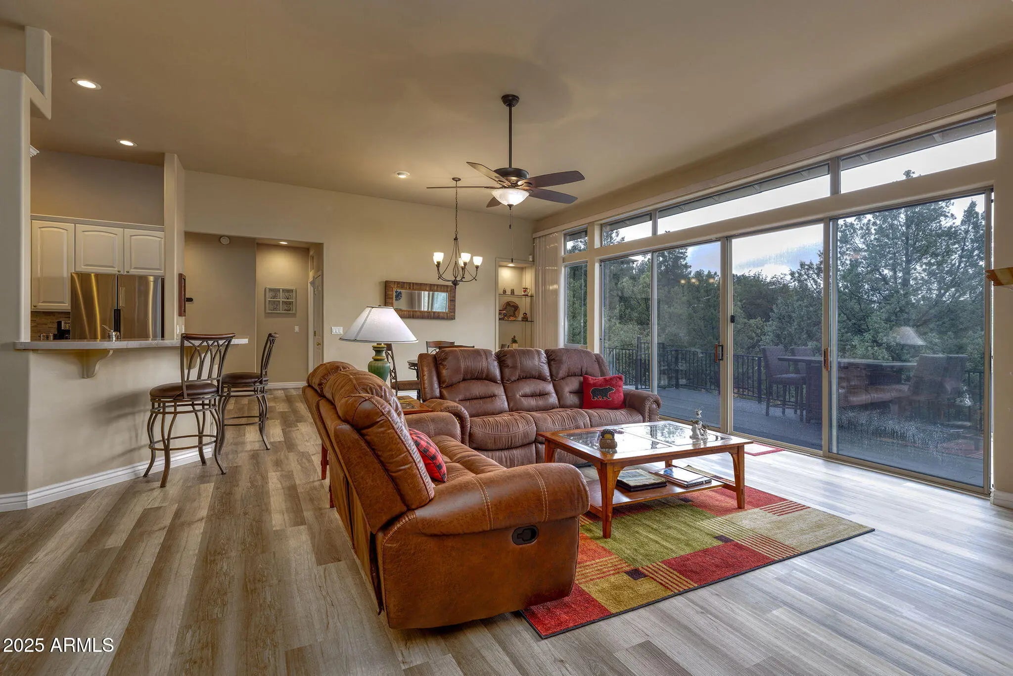 Seller Carryback options available. Looking for a private retreat in the mountains? This custom home in Rim View Heights sits on a large .60-acre. Open great room floorplan with floor to ceiling windows that provide natural light throughout and open to the large deck overlooking the beautiful private lot. The kitchen has new quartz counters in 2024 and is open to the great room perfect for entertaining family and friends. This home shows pride of ownership with many upgrades and updates; In 2023 the owners installed 3 sets of wrought iron security screen doors at the front of the home and one security screen door at the lower level rear exit. 2023 rear yard chain link fence, 2021 new roof and remodeled master bath with tiled shower, separate tub, quartz countertops and double sin Upstairs guest bath remodeled in 2021 with new quartz countertops/sink. In 2022 new HVAC and vinyl plank waterproof flooring upstairs. Kitchen and laundry room appliances have been replaced. Back deck was rebuilt and remodeled in 2020 with new railing to include spiral staircase on rear deck installed in 2023. 2024 New hot water heater and in 2025 a new garage door opener. All bedrooms are spacious plus there is an extra office/den area upstairs. Downstairs is a large family room, bedroom with 3/4 bath and access to patio. Two car garage also has a workspace area. The lot has been surveyed and is marked with stakes. Property is being sold partially furnished.