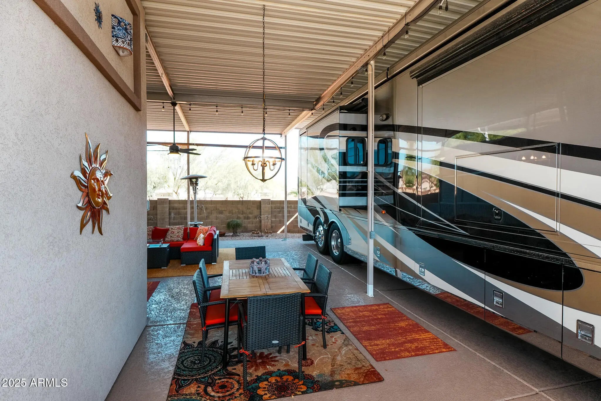 Enjoy effortless resort living on one of the nicest RV lots in Happy Trails Resort. A 14'6'' full cover and 4' fence provide shade and privacy, while the outdoor kitchen, cozy seating, and fireplace make it ideal for gatherings or quiet evenings. The two-story stucco casita includes a shower, toilet, and sink behind a charming barn door, plus a full-size washer/dryer, refrigerator, and upstairs loft for storage or hobbies. Thoughtful touches—sunshades, security lighting, furniture covers, and tasteful décor—add comfort and peace of mind. You'll own your lot and enjoy low HOA fees, friendly neighbors, and resort amenities like pickleball, golf, pools, and 100+ clubs. Pride of ownership shines throughout—just unpack, unwind, and start living the Happy Trails lifestyle.