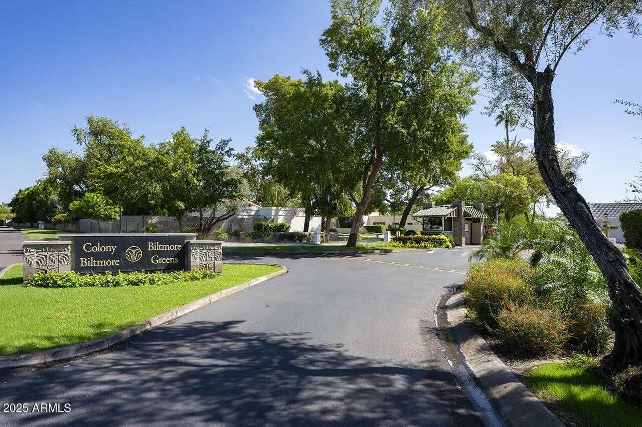 Private and quiet corner lot home perfectly situated in the luxurious Colony Biltmore Greens. This charming 3 bed, 3 bath residence is move-in ready! The home boasts ample natural lighting with soaring vaulted ceilings in the living room and multiple sliders opening to the private backyard oasis lined with ficus trees, turf, pavers, and a serene fountain. Cozy up by the dual-sided fireplace shared between the dining and living areas. Enjoy a newer remodeled kitchen and hardwood flooring throughout. New roof & water heater in 2024. New electrical panel & EV Charging in 2025. Newer AC. Located in a 24-hour guard-gated private & quiet community with tennis courts. Walking distance to the Biltmore Resort, Biltmore Mall, & restaurants.