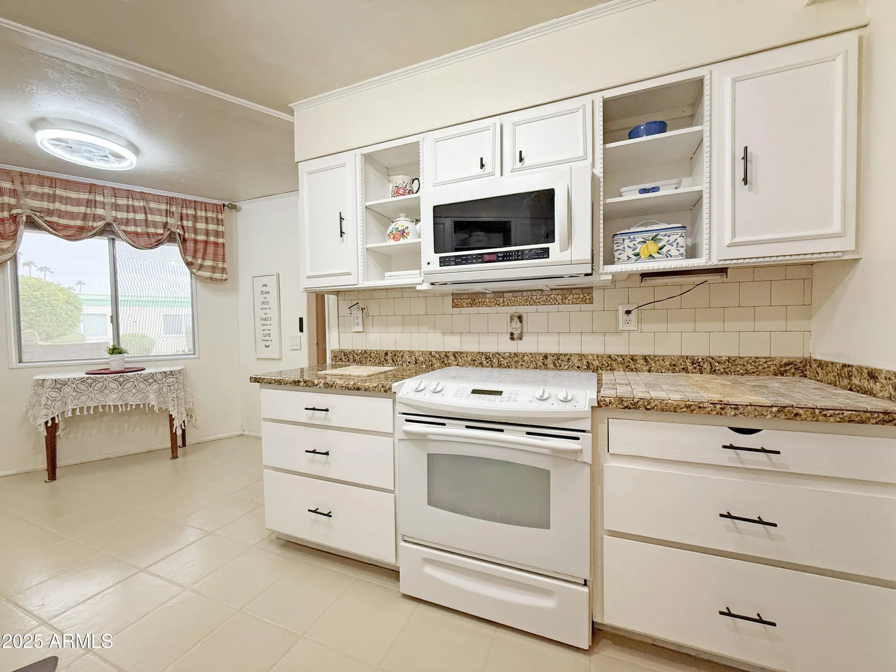 Charming and well-maintained furnished home in a prime Sun City location! Features include new roofing in 2025, solar tubes in 3 rooms, ceramic tile in the kitchen and high-traffic areas, laminate flooring in the bedrooms, living, and dining areas. The kitchen offers laminate countertops, a tiled backsplash, electric stove, microwave, and pantry. Beautiful landscaping. You'll also find ceiling fans in every room (including the enclosed patio) and ample cabinet and storage space throughout. The bathroom includes grab bars for added safety and convenience. Single-car garage with storage cabinets. Fantastic location! Just two blocks from Oakmont Rec Center and the golf course. Close to shopping, Starbucks, and groceries, and 1 mile from Banner hospital. Enjoy the Sun City lifestyle