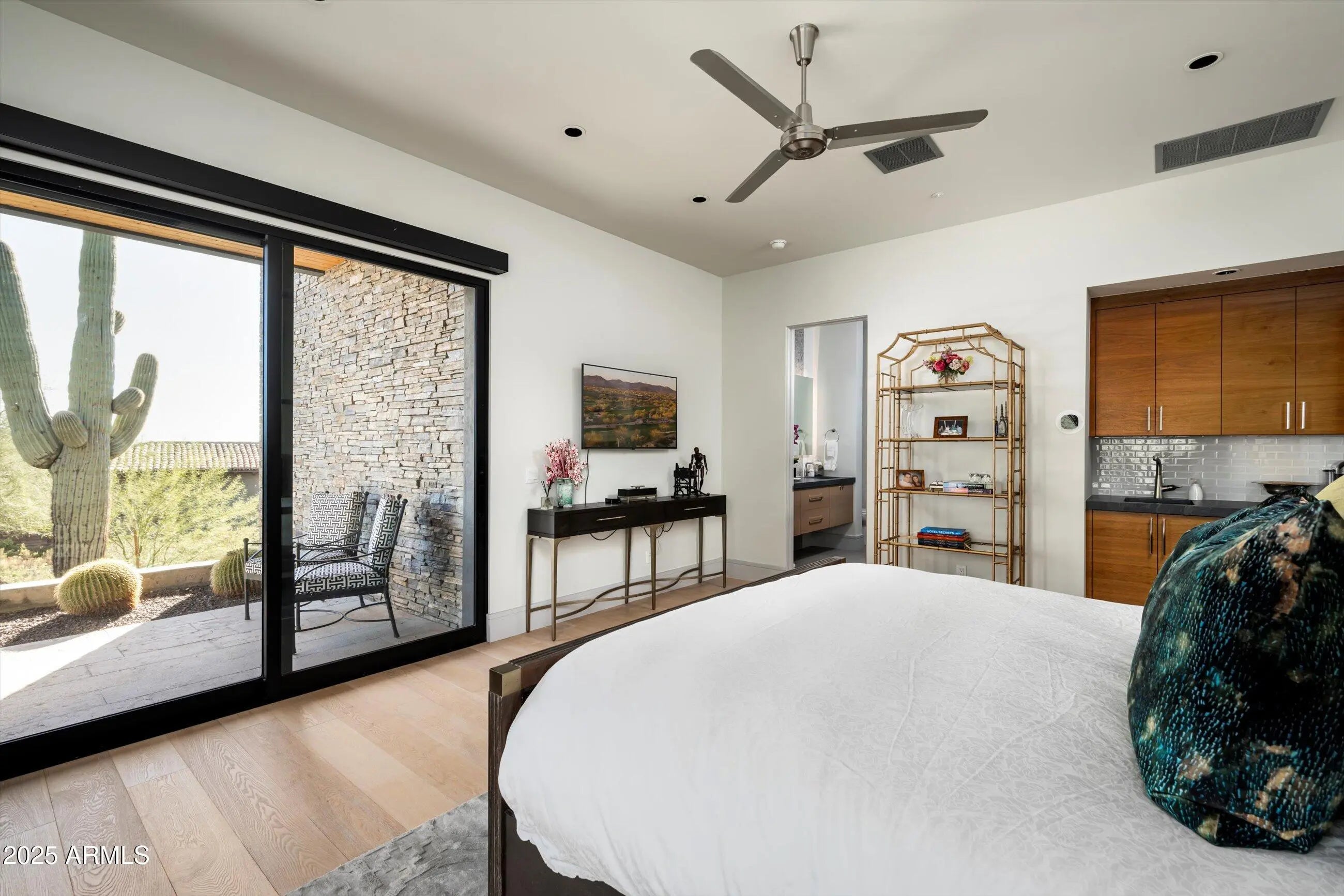 GOLF MEMBERSHIP AVAILABLE. Located within Desert Mountain's prestigious, double-gated Saguaro Forest Village, this refined 2018 contemporary estate offers exceptional privacy, architectural distinction, and expansive desert, mountain, sunset, and city-light views. Designed and built by Blackstone Development, the home reflects a deliberate modern aesthetic where stone, metal, glass, and warm wood are thoughtfully layered to complement the surrounding Sonoran Desert landscape. Spanning approximately 6,000 square feet, the residence is designed for effortless single-level living and elevated entertaining, offering 4 bedrooms, 5 bathrooms, a private guest casita with separate entrance and patio, and multiple flexible living and office spaces well suited to today's lifestyle. Arrival unfolds through a serene entry courtyard featuring a tongue-and-groove ceiling, contemporary fireplace, and dramatic iron-and-glass pivot door. Inside, architectural wood detailing and a temperature-controlled glass wine display create a striking first impression, flowing seamlessly into the dining area with custom built-in shelving. The great room serves as the heart of the home, anchored by a floor-to-ceiling slate fireplace and articulated ceiling elements. Expansive pocket doors open to sweeping desert and mountain vistas and twinkling city lights, creating a seamless indoor-outdoor living experience ideal for entertaining or quiet evenings at home. The chef's kitchen balances form and performance, featuring dual Carrara marble waterfall islands, book-matched custom cabinetry, and a curated suite of Wolf and Sub-Zero appliances, highlighted by the iconic La Cornue Le Château 150 range. A refined butler's pantry with custom cabinetry, integrated wine refrigeration, and generous storage supports gatherings of any scale. The home offers two dedicated office spaces, providing exceptional flexibility. One is ideal for focused work or creative pursuits, while the secondlocated off the primary suitecan easily be reimagined as a private fitness or wellness studio. The primary suite is a private retreat featuring DuChâteau wood flooring, a fireplace, sitting area, and beverage center. The spa-inspired bath includes dual vanities, dual water closets, a sculptural soaking tub, and an expansive walk-in shower, complemented by a boutique-style closet with center island and discreet washer and dryer. Two ensuite guest bedrooms open directly to the backyard, embracing the home's indoor-outdoor lifestyle, while the detached casita offers exceptional autonomy for guests seeking privacy and comfort. Outdoor living captures the essence of Arizona luxury, with multiple fireplaces, a built-in BBQ, resort-style pool and spa, and sunset skies transitioning to city lightsframed by pristine desert and mountain surroundings. Desert Mountain is renowned for its social vibrancy, wellness-focused lifestyle, and year-round livability. The Desert Mountain Club offers seven championship golf courses, extensive pickleball and tennis facilities, seven dining venues, and a world-class fitness and wellness center. Additional features include a four-car garage, EV-charging capability, and thoughtful design details throughout. This is more than a residenceit is a modern desert sanctuary offering architectural presence, privacy, flexibility, and a rare opportunity for Golf Membership within one of Scottsdale's most distinguished communities. Golf Membership available through application and customary Club approval.
