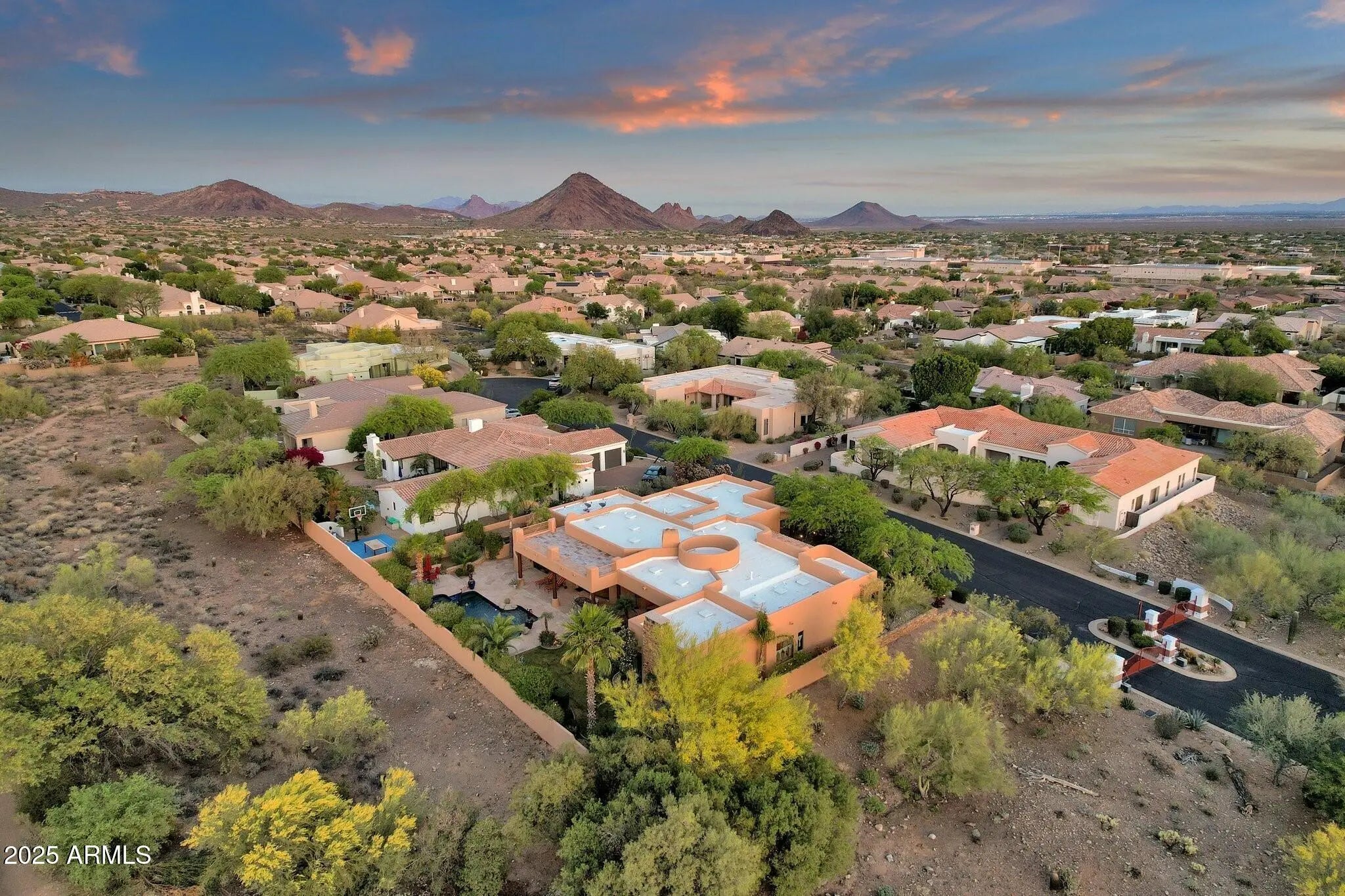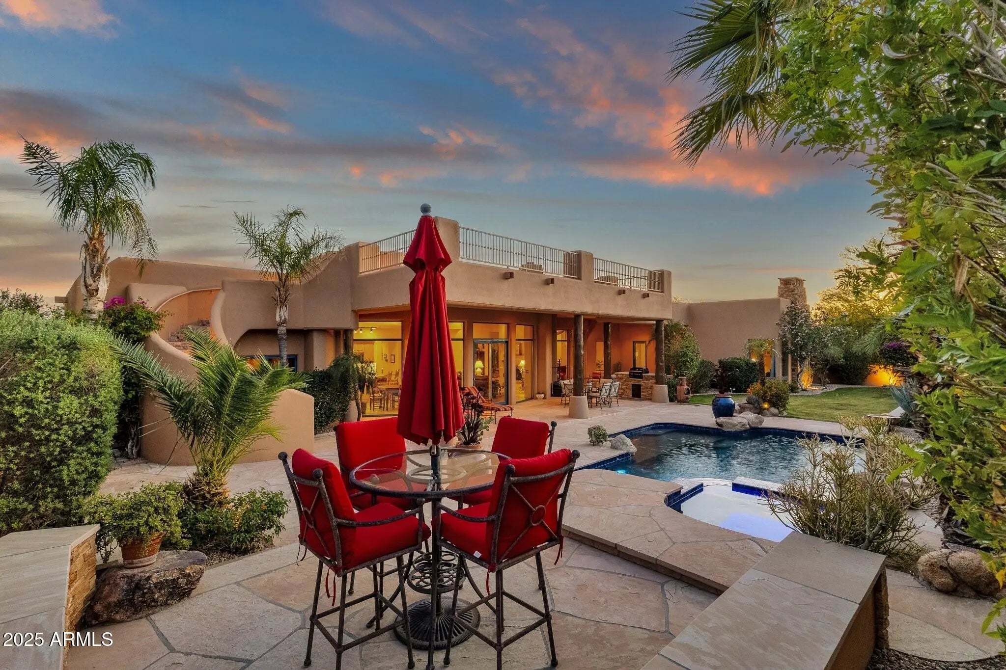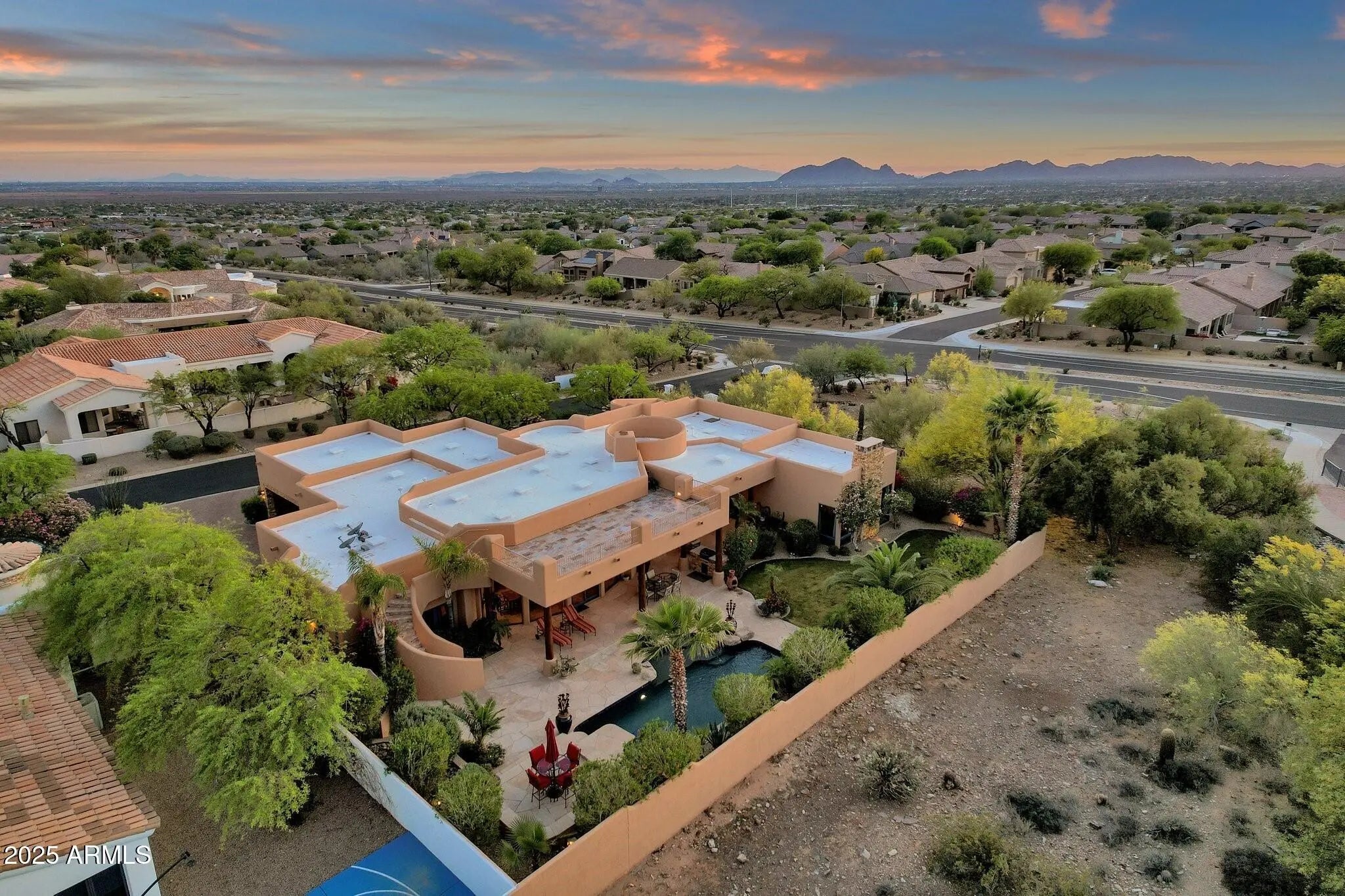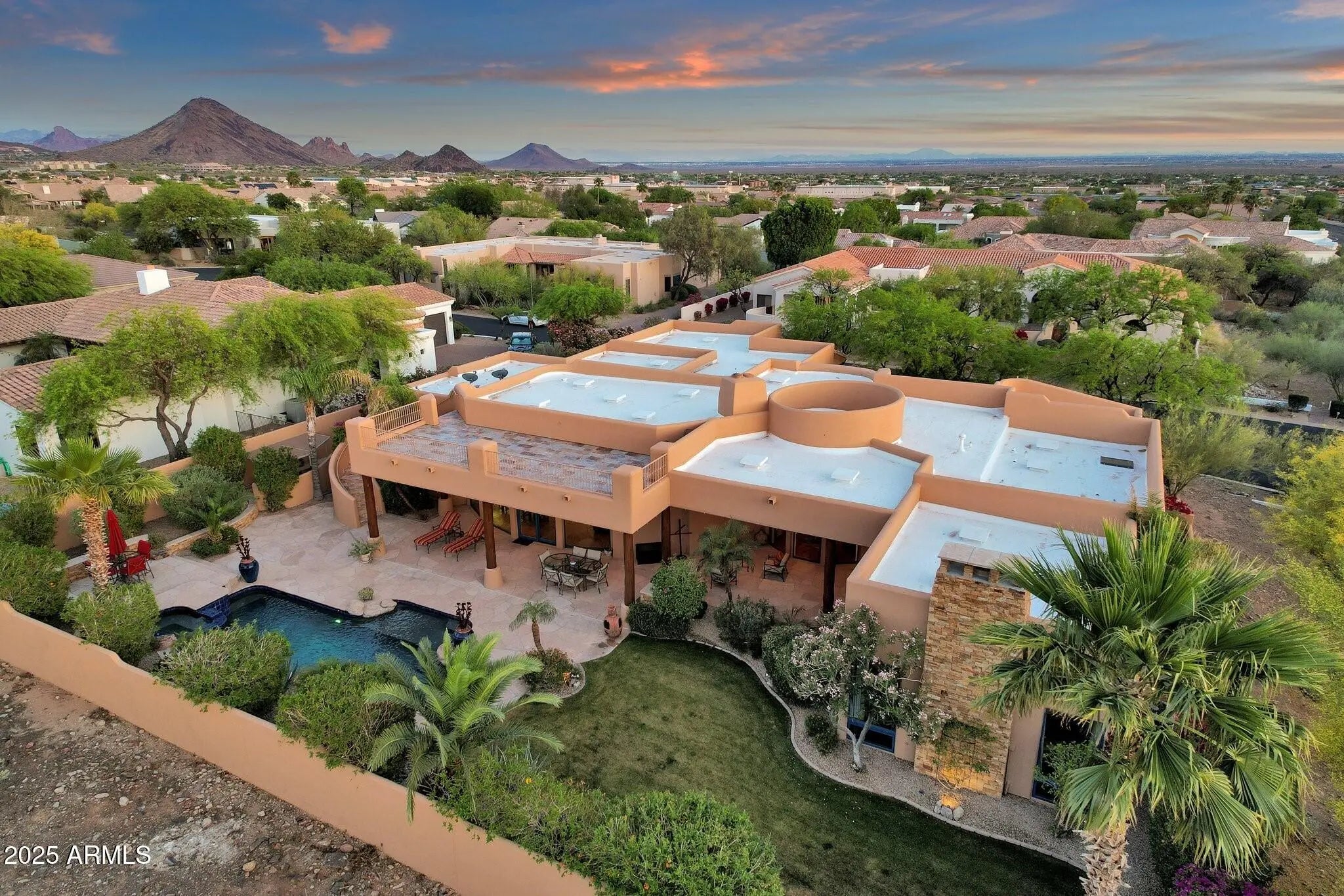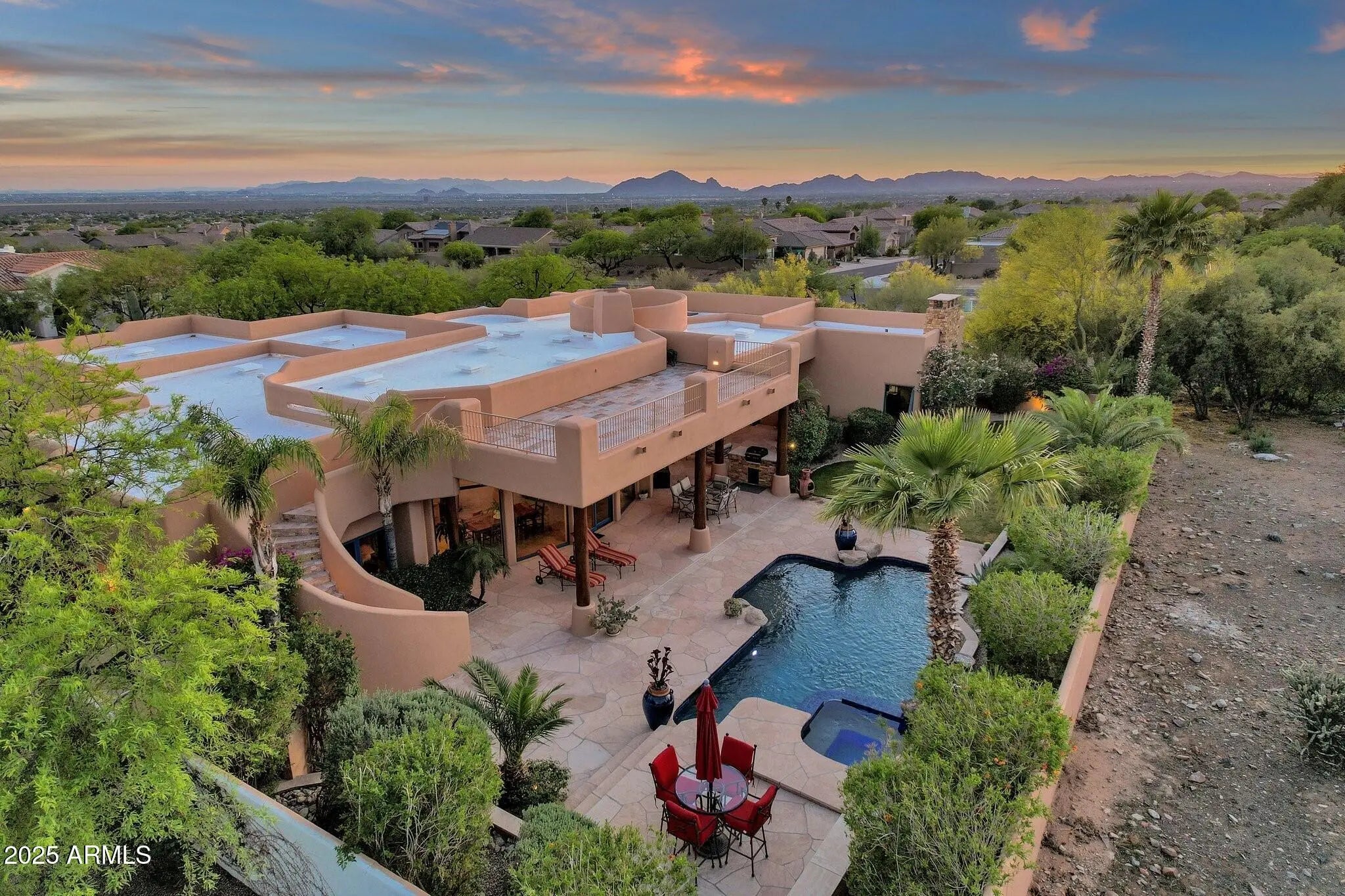 Sophisticated Single-Level Estate with Unrivaled Style and Serenity ~ Nestled within the exclusive gated enclave of Sombras Montaña, home to just seven residences, this impeccably maintained custom estate embodies timeless elegance and modern livability. Thoughtfully designed on a single level, the 5-bedroom, 4.5-bath floor plan spans over 4,100 square feet of refined living space. Every room captures sweeping McDowell Mountain views through dual-pane Pella windows and showcases meticulous craftsmanship with travertine and Marazzi tile floors, custom cabinetry, and architectural ceiling details... See more. The gourmet kitchen delights with Sub-Zero refrigeration, Dacor double ovens, gas cooktop, granite counters, and an expansive island overlooking the great roomcomplete with a wet bar and one of three gas fireplaces. The split primary suite offers a serene retreat with a spa-inspired bath featuring a jetted tub, dual vanities, and a walk-in shower. Outside, discover a true resort oasis featuring a heated pool and spa with a variable-speed pump, misting system, built-in BBQ, and lush grass landscapingall perfectly positioned to capture the beauty of Arizona sunsets. The rooftop deck delivers 360° panoramic mountain and city-light views. Notable improvements include a completely new HVAC system (October 2025) and fresh interior and exterior paint (2025), enhancing both comfort and curb appeal. Additional highlights include smart-home technology, an owned water softener, central vacuum, fire sprinkler system, and an oversized three-car garage with built-in cabinetry. Experience exceptional privacy, sophisticated design, and breathtaking views in one of Scottsdale's most intimate gated communities.
