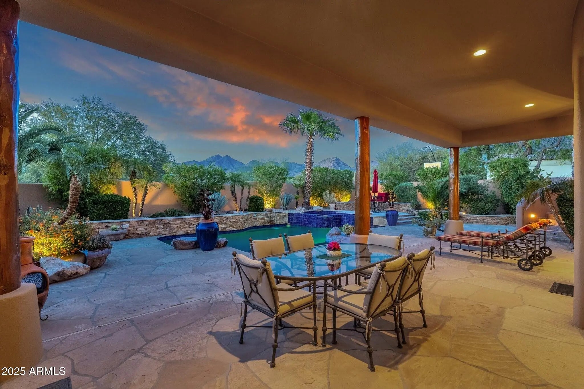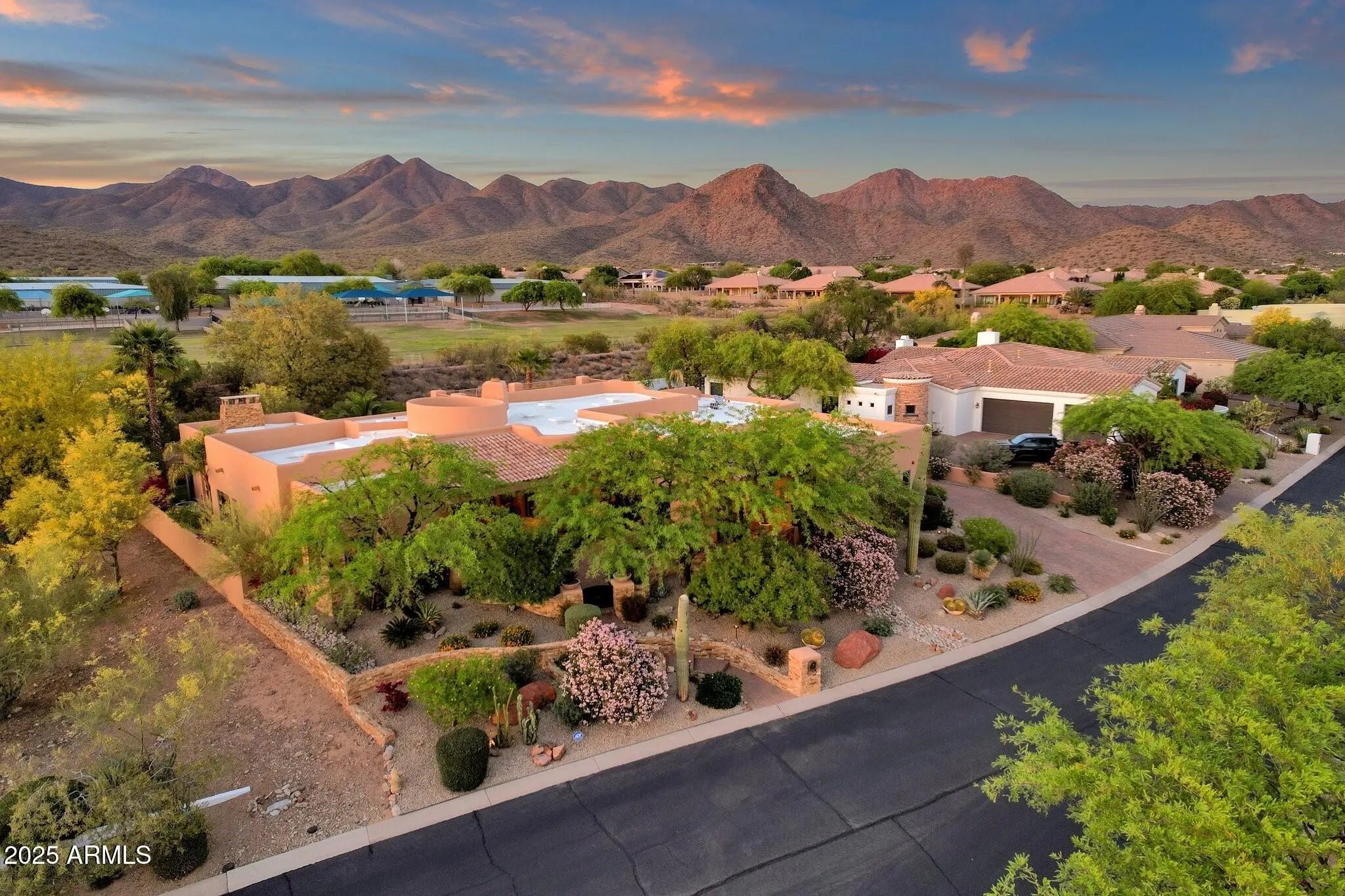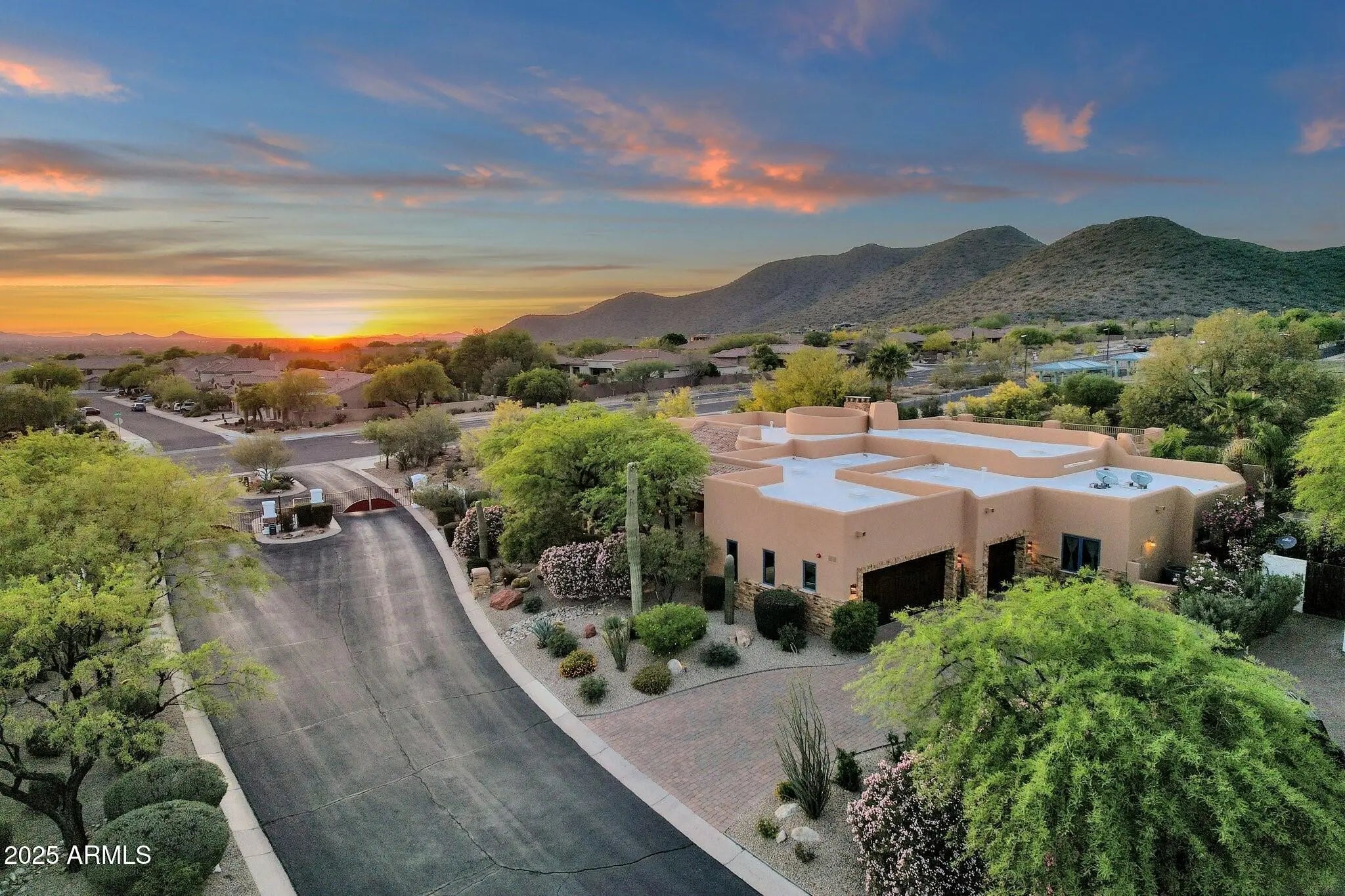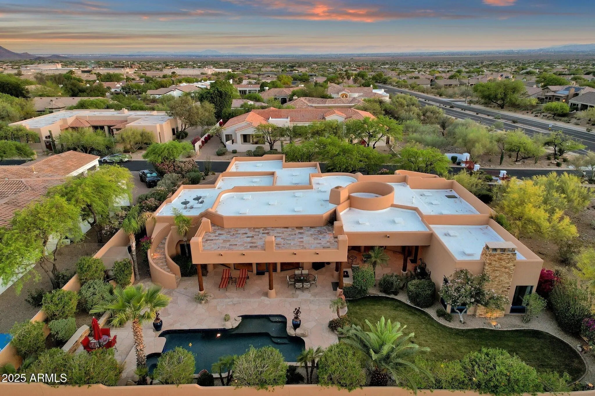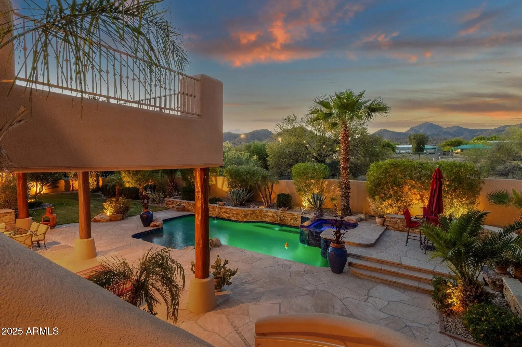 Sophisticated Single-Level Estate with Unrivaled Style and Serenity ~ Nestled within the exclusive gated enclave of Sombras Montaña, home to just seven residences, this impeccably maintained custom estate embodies timeless elegance and modern livability. Thoughtfully designed on a single level, the 5-bedroom, 4.5-bath floor plan spans over 4,100 square feet of refined living space. Every room captures sweeping McDowell Mountain views through dual-pane Pella windows and showcases meticulous craftsmanship with travertine and Marazzi tile floors, custom cabinetry, and architectural ceiling details... See more. The gourmet kitchen delights with Sub-Zero refrigeration, Dacor double ovens, gas cooktop, granite counters, and an expansive island overlooking the great roomcomplete with a wet bar and one of three gas fireplaces. The split primary suite offers a serene retreat with a spa-inspired bath featuring a jetted tub, dual vanities, and a walk-in shower. Outside, discover a true resort oasis featuring a heated pool and spa with a variable-speed pump, misting system, built-in BBQ, and lush grass landscapingall perfectly positioned to capture the beauty of Arizona sunsets. The rooftop deck delivers 360° panoramic mountain and city-light views. Notable improvements include a completely new HVAC system (October 2025) and fresh interior and exterior paint (2025), enhancing both comfort and curb appeal. Additional highlights include smart-home technology, an owned water softener, central vacuum, fire sprinkler system, and an oversized three-car garage with built-in cabinetry. Experience exceptional privacy, sophisticated design, and breathtaking views in one of Scottsdale's most intimate gated communities.
