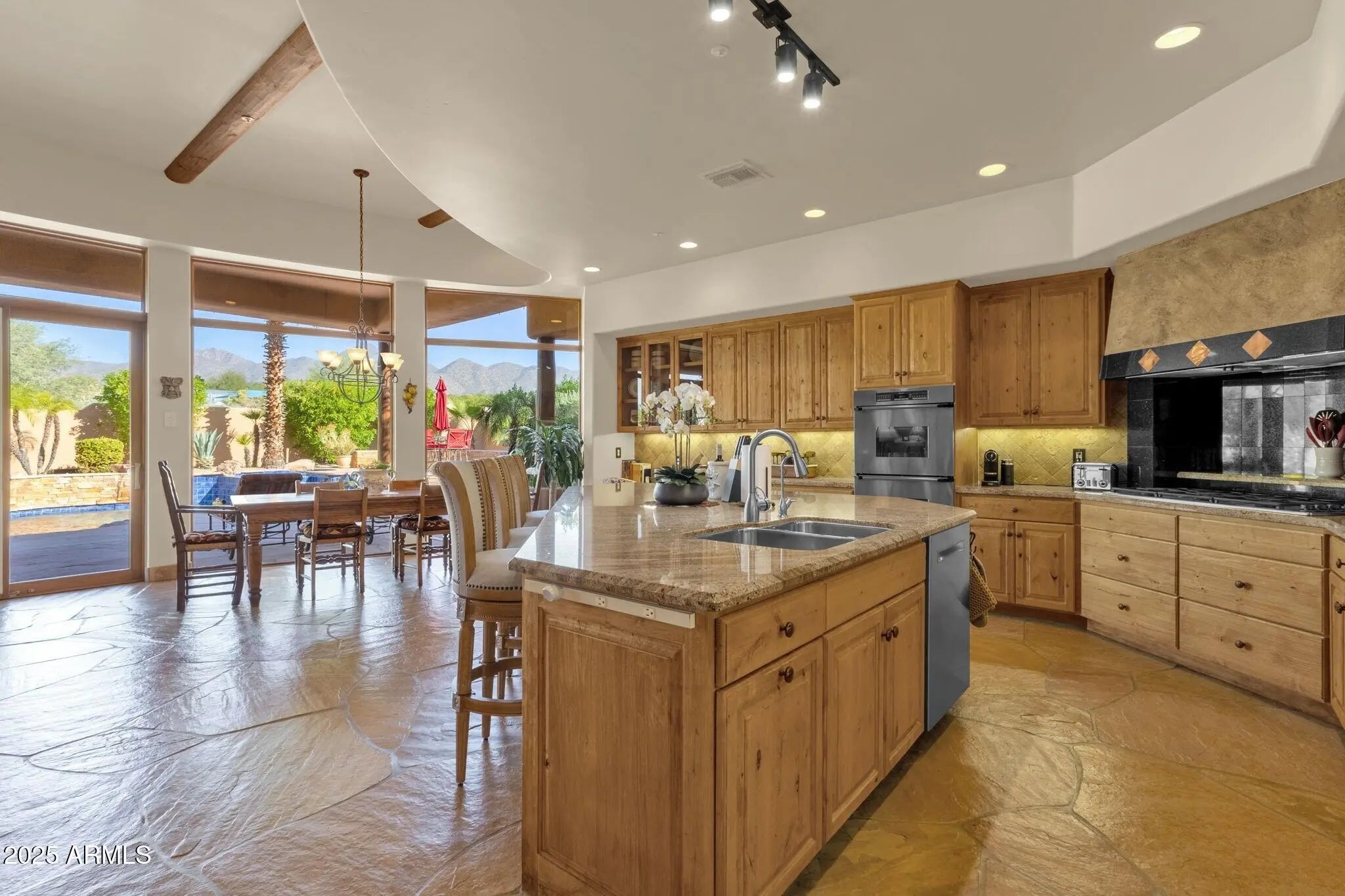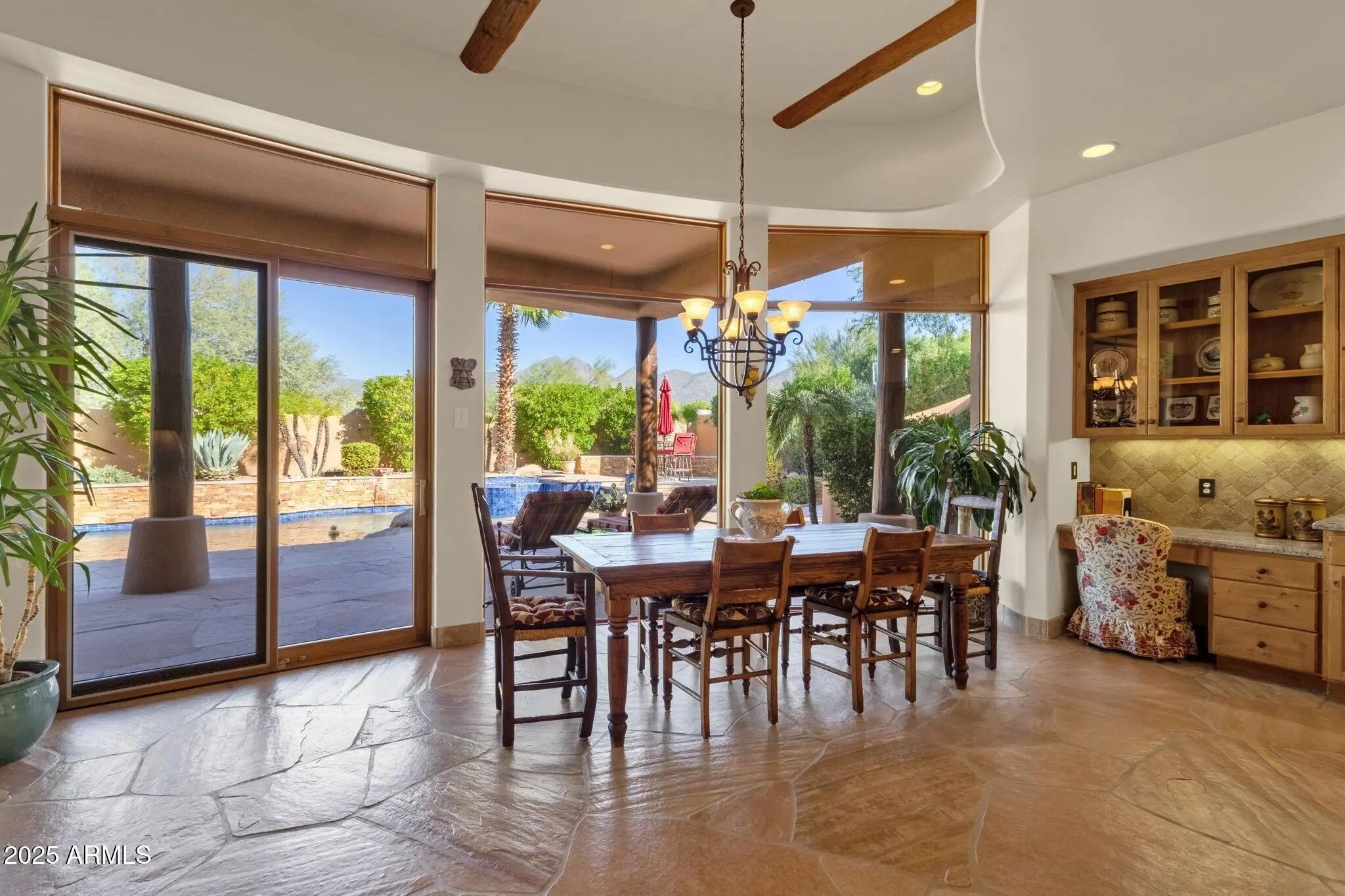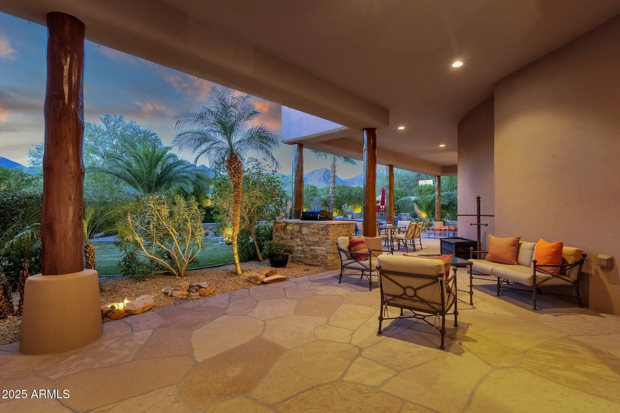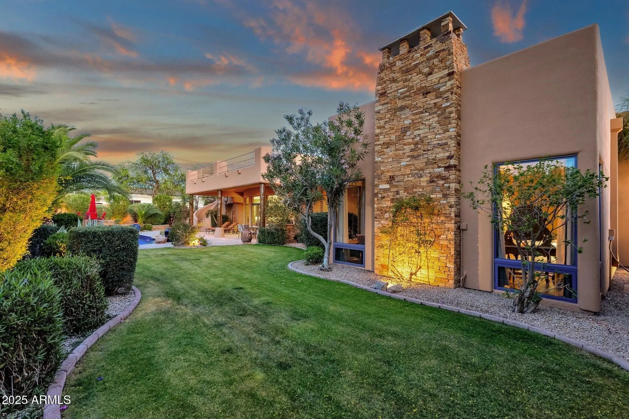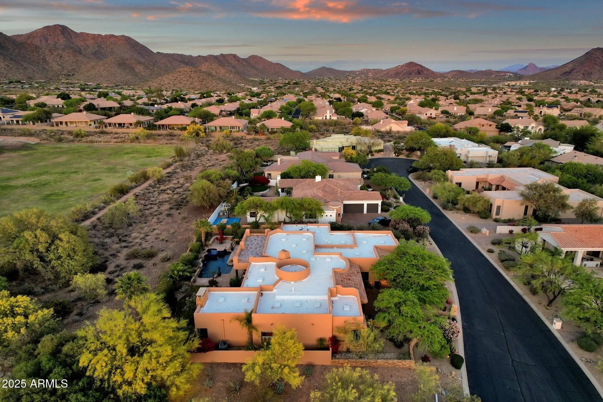 Sophisticated Single-Level Estate with Unrivaled Style and Serenity ~ Nestled within the exclusive gated enclave of Sombras Montaña, home to just seven residences, this impeccably maintained custom estate embodies timeless elegance and modern livability. Thoughtfully designed on a single level, the 5-bedroom, 4.5-bath floor plan spans over 4,100 square feet of refined living space. Every room captures sweeping McDowell Mountain views through dual-pane Pella windows and showcases meticulous craftsmanship with travertine and Marazzi tile floors, custom cabinetry, and architectural ceiling details... See more. The gourmet kitchen delights with Sub-Zero refrigeration, Dacor double ovens, gas cooktop, granite counters, and an expansive island overlooking the great roomcomplete with a wet bar and one of three gas fireplaces. The split primary suite offers a serene retreat with a spa-inspired bath featuring a jetted tub, dual vanities, and a walk-in shower. Outside, discover a true resort oasis featuring a heated pool and spa with a variable-speed pump, misting system, built-in BBQ, and lush grass landscapingall perfectly positioned to capture the beauty of Arizona sunsets. The rooftop deck delivers 360° panoramic mountain and city-light views. Notable improvements include a completely new HVAC system (October 2025) and fresh interior and exterior paint (2025), enhancing both comfort and curb appeal. Additional highlights include smart-home technology, an owned water softener, central vacuum, fire sprinkler system, and an oversized three-car garage with built-in cabinetry. Experience exceptional privacy, sophisticated design, and breathtaking views in one of Scottsdale's most intimate gated communities.