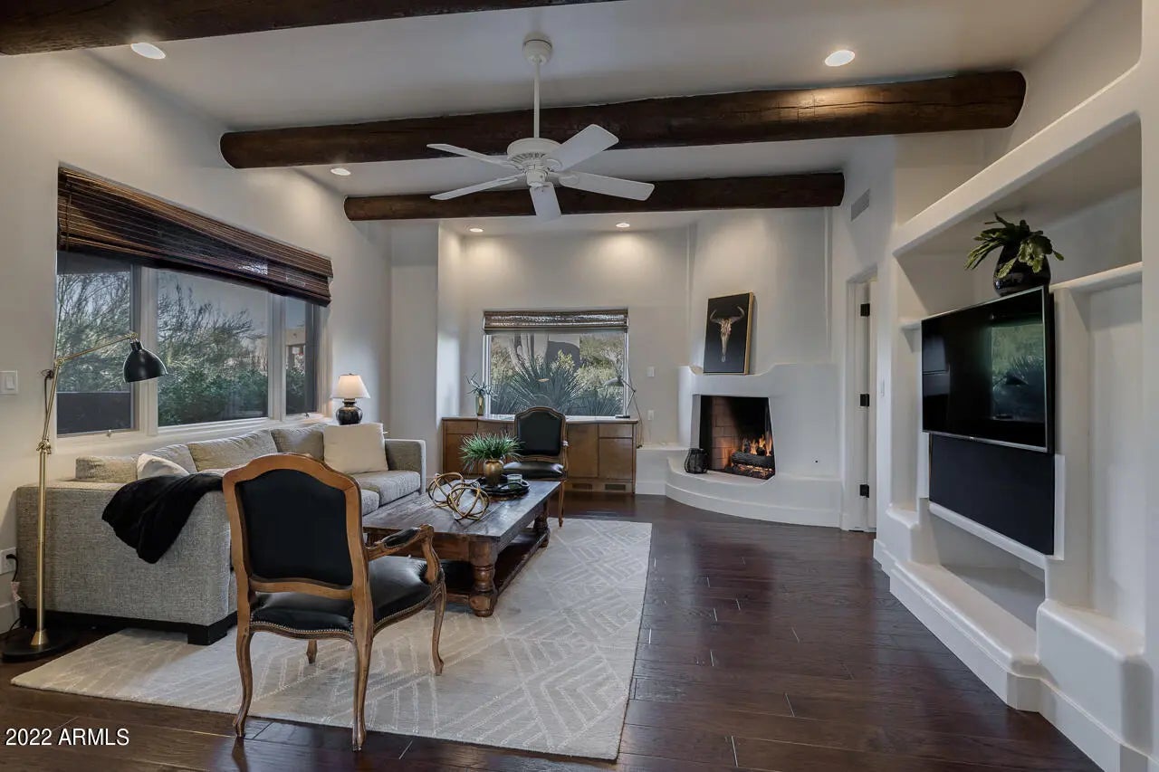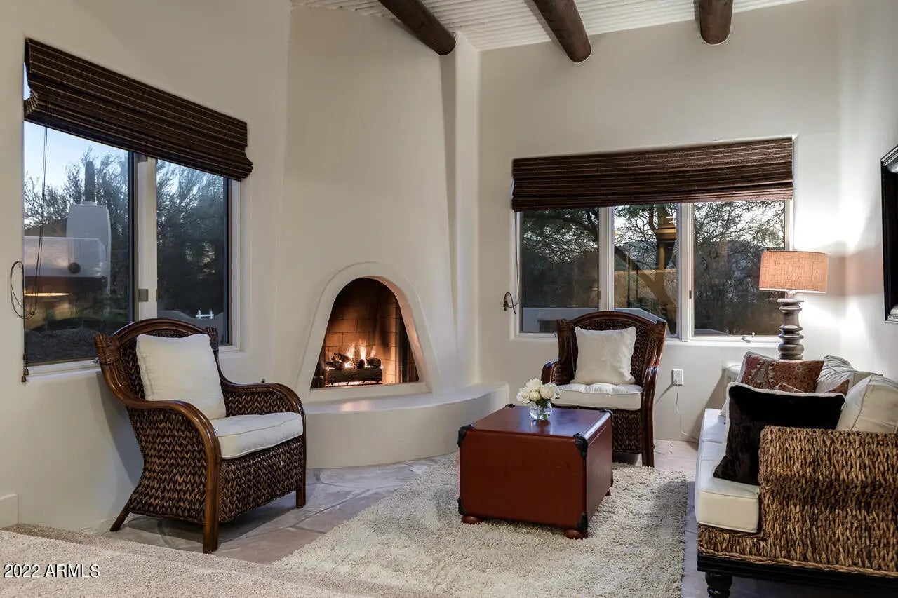 Fully furnished charming Santa Barbara Desert design renovation with abundant style & character starting from the moment you cross the threshold of the hand-carved wood front door. Step into this gorgeous turn-key updated luxury home in the guard gated community of Glenn Moor in Troon. Not one detail has been overlooked on this completely transformed open floor plan that allows natural light to flow throughout the living spaces. This home boasts a large great room with soaring ceilings, bar area for entertaining, custom niches with wall space for exquisite artwork, open formal dining, gourmet kitchen with new quartz countertops, custom cabinetry, pantry, custom pendant lighting, Wolf and Kitchen Aid appliances, Hickory hand scraped wood floors, and 3 custom fireplaces.