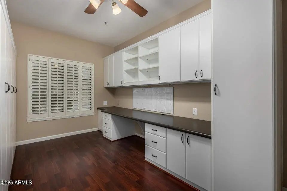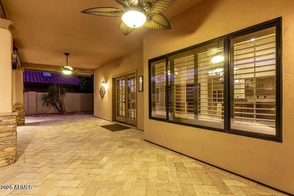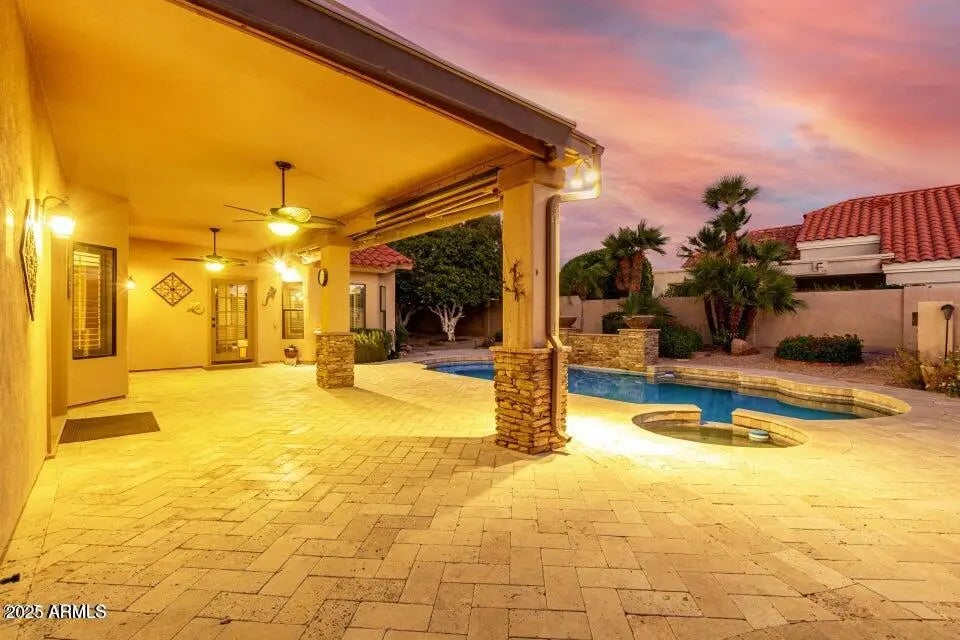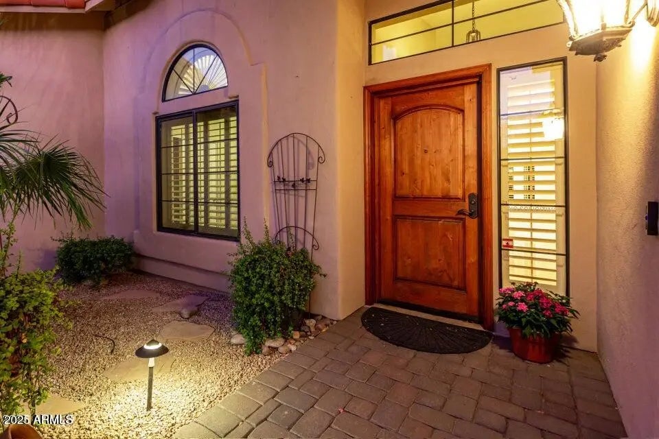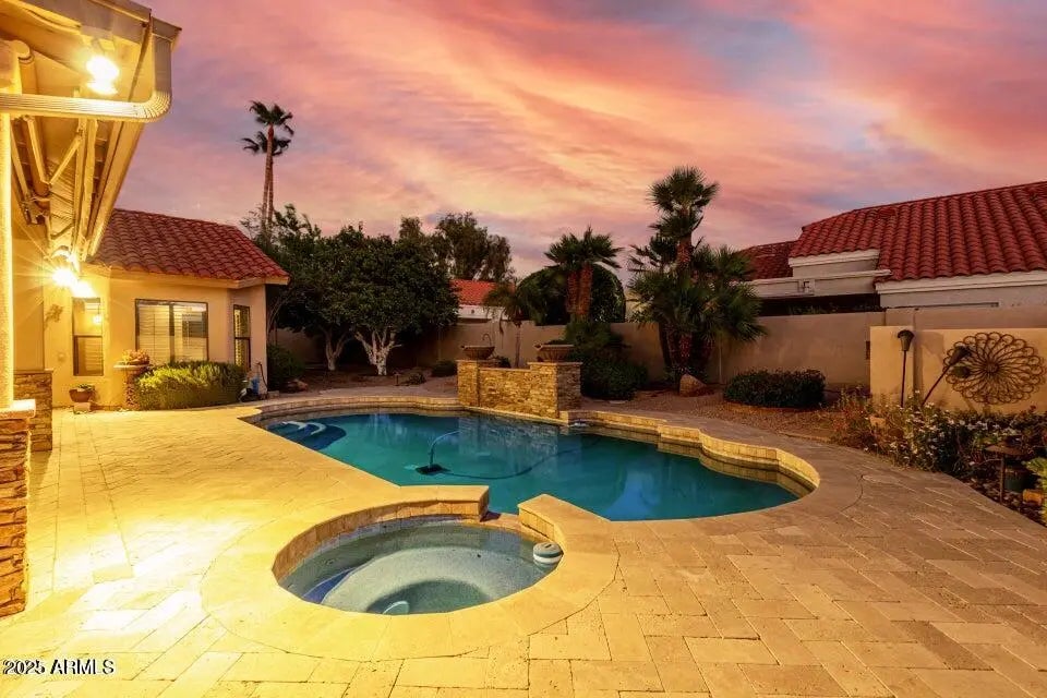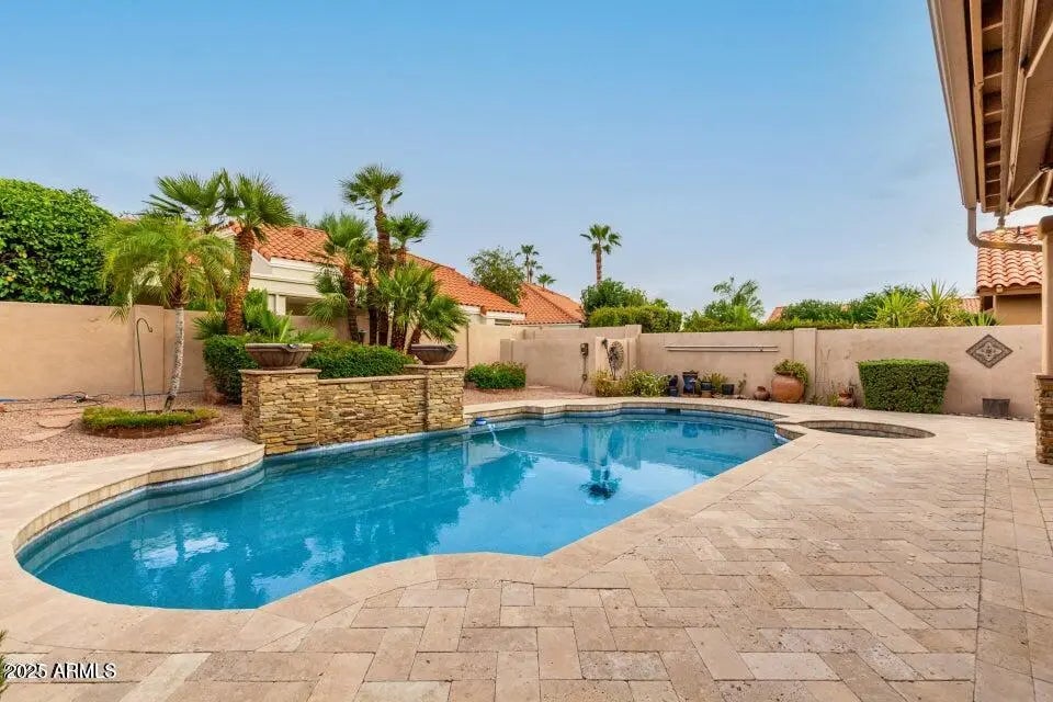 A stunning Scottsdale Ranch treasure, where luxury meets comfort. This beautiful, single-level home has four bedrooms and two amazing bathrooms, plus it is accented with details like plantation shutters, travertine tile, cozy fireplace, and custom built-ins. The masterpiece that is the kitchen boasts stainless steel appliances, ample cabinetry, and room to gather.. The primary suite offers 2 walk-in closets A special private backyard featuring north-south exposure, a heated pool and spa with a soothing water feature, mature citrus trees, and an extended covered patio with two remote control awnings, perfect for outdoor living. The garage also impresses with built-in storage cabinets, offering even more space and organization. Near everything you could ever want!