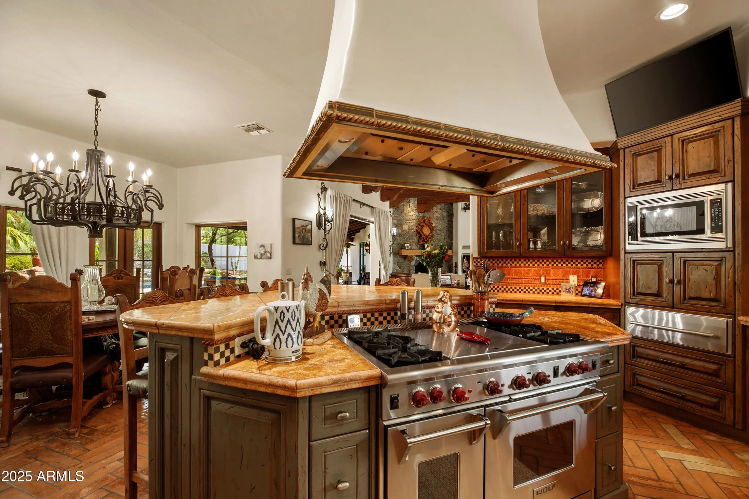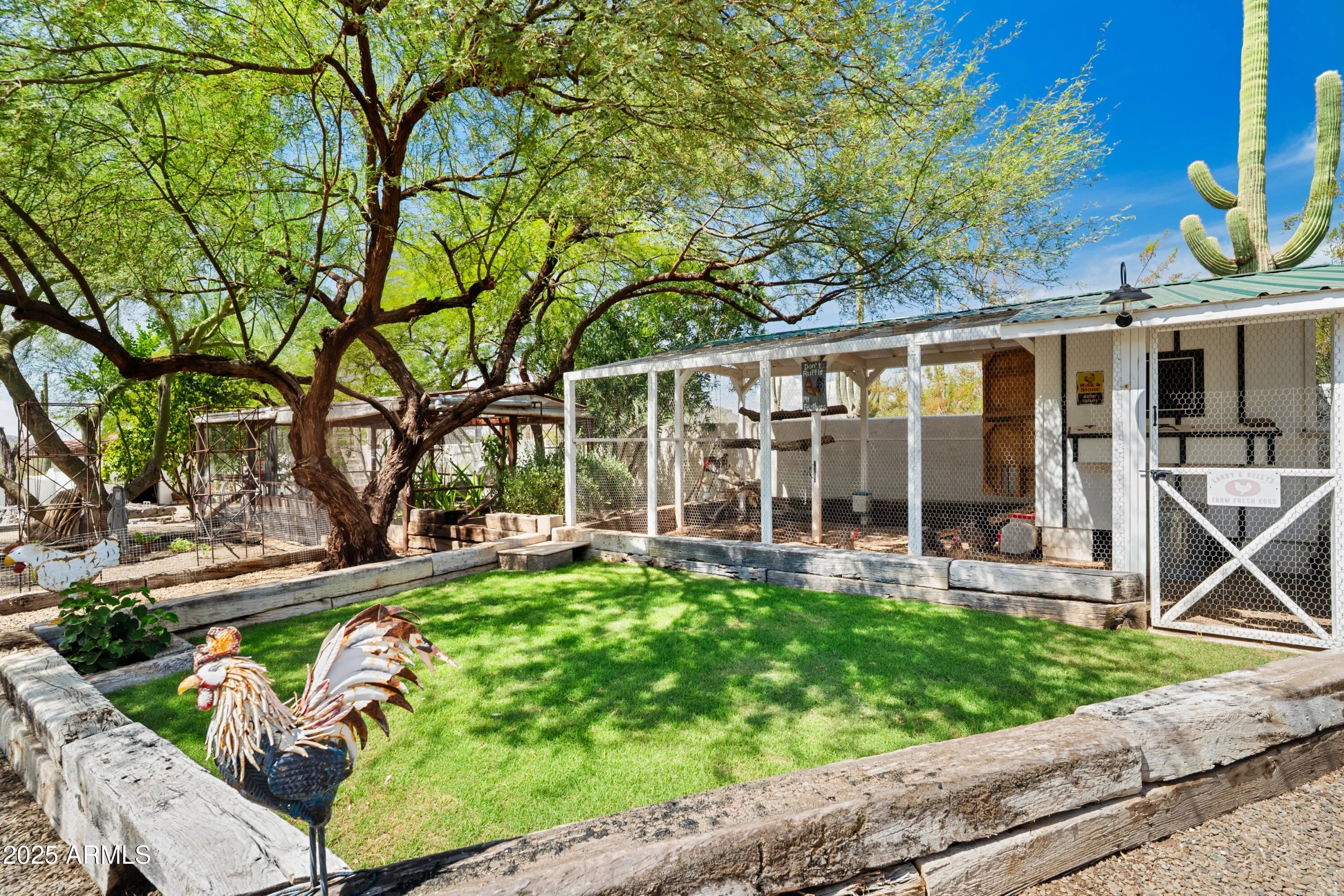 Stunning Spanish Hacienda !RESORT LIKE SETTING ON 5 AC. CAR LOVERS DREAM!3517 sft.,8-10 CAR SHOWROOM w/FP;bath.Pro's Workshop w/lift. Main hm 2673 sft~2 BD/OFFICE (EZ 3rd BR w/ensuite bath). Artisans touch; Corbel beamed ceilings ;handcrafted textiles; cabinetry & floors. Large Chef's kitchen! Farmhhouse sink;Wolf range; DBL subzero fridge;wine fridge. LR off kitchen w/FP. Spacious primary w/sitting room;FP;spa like bath; tiled shower ;walk in closet w/island;washer-dryer. BR 2, shares guest bath; BR 3 -ensuite bath. French Doors open to impressive covered patios ;5 FP's total! Charming custom chicken coop;Green House;2 grass areas;Palm trees;fruit trees;desert botanical feel!Pool/Jacuzzi/Outdoor shower. Covered RV Garage w/full hookups.No HOA; .Horses OK. Shared well ;Propane;2 Septics