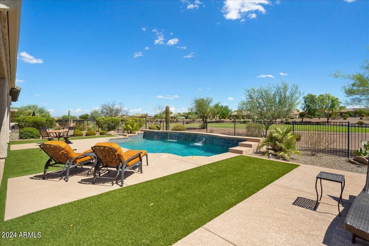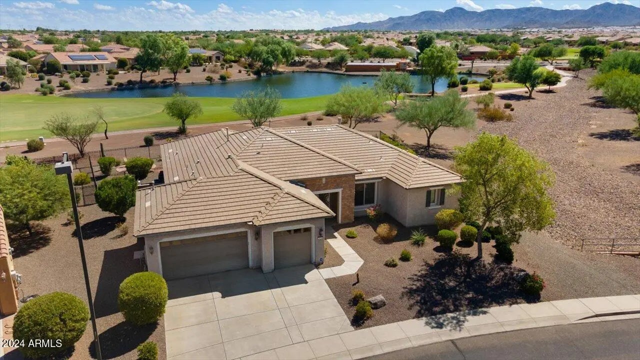 This is a very unique property in Sun City Festival, a 55+ active adult community with incomparable amenities! This 3-bed, 2.5 bath home features a formal dining area and a billiards room. AND the list price includes ALL furnishings. The best part is the east-facing backyard, nestled against the 5th hole on the Vista course, with a lake, fountain and mountain views! This oasis-like setting includes a pool with a heater and cooler and in-ground firepit, all perfect for entertaining. The spacious kitchen includes SS appliances and a gas cooktop. The master suite features dual vanities, shower and tub. The full-size 3-car garage includes built-in cabinets. Other special features include a Bose sound system, Brinks security, in-house vac and a new 2023 AC unit. This home is a MUST see!