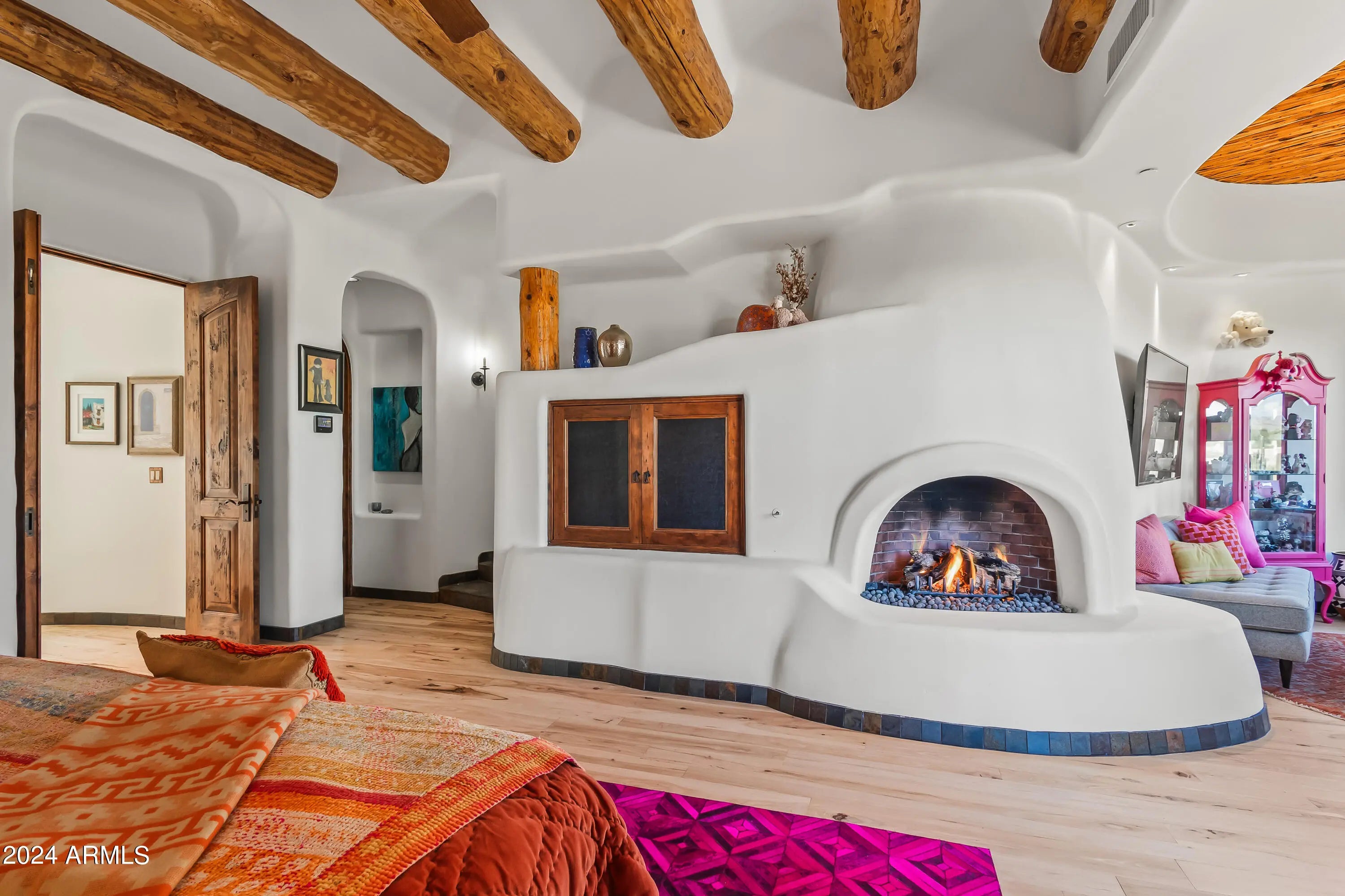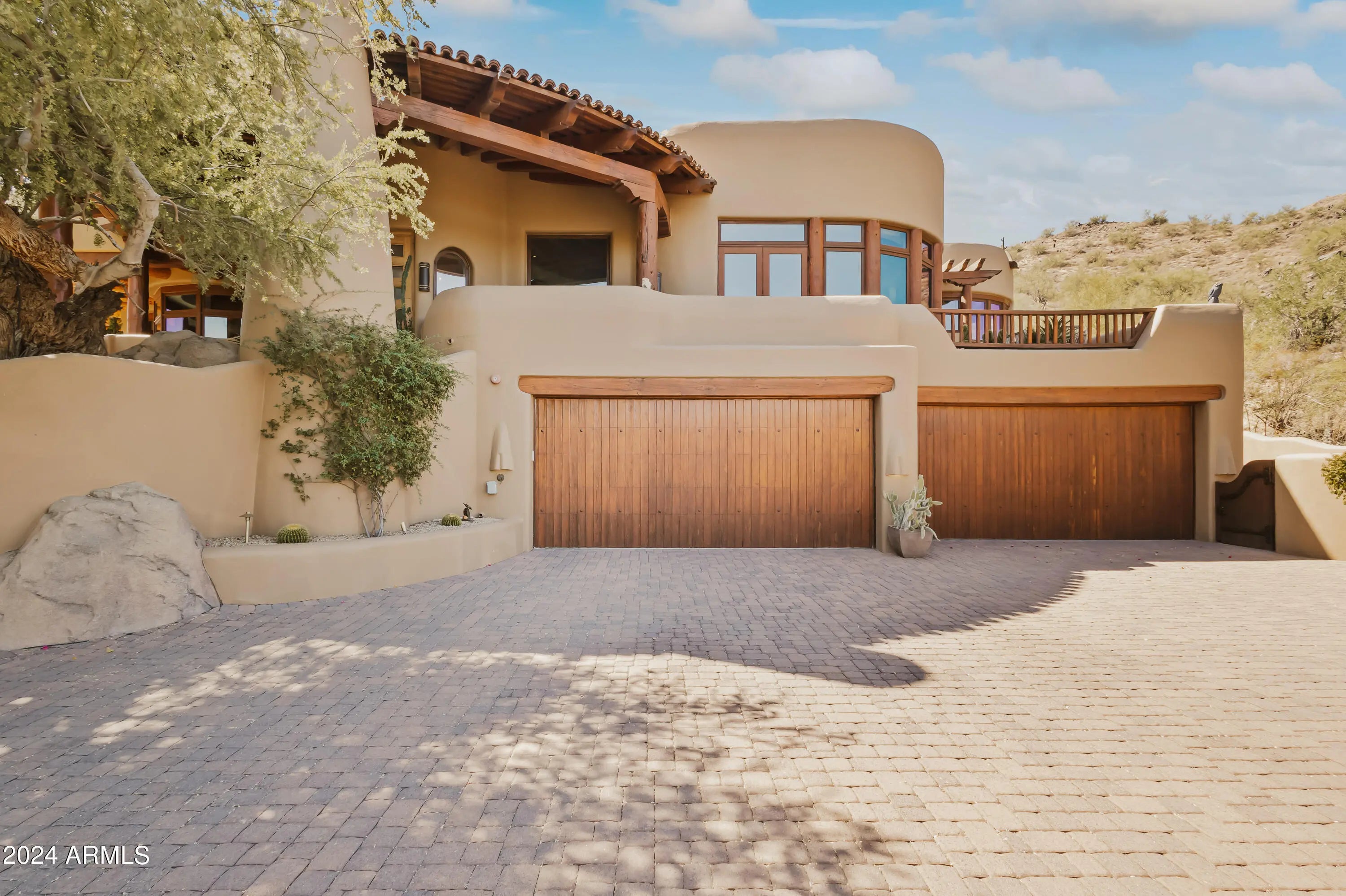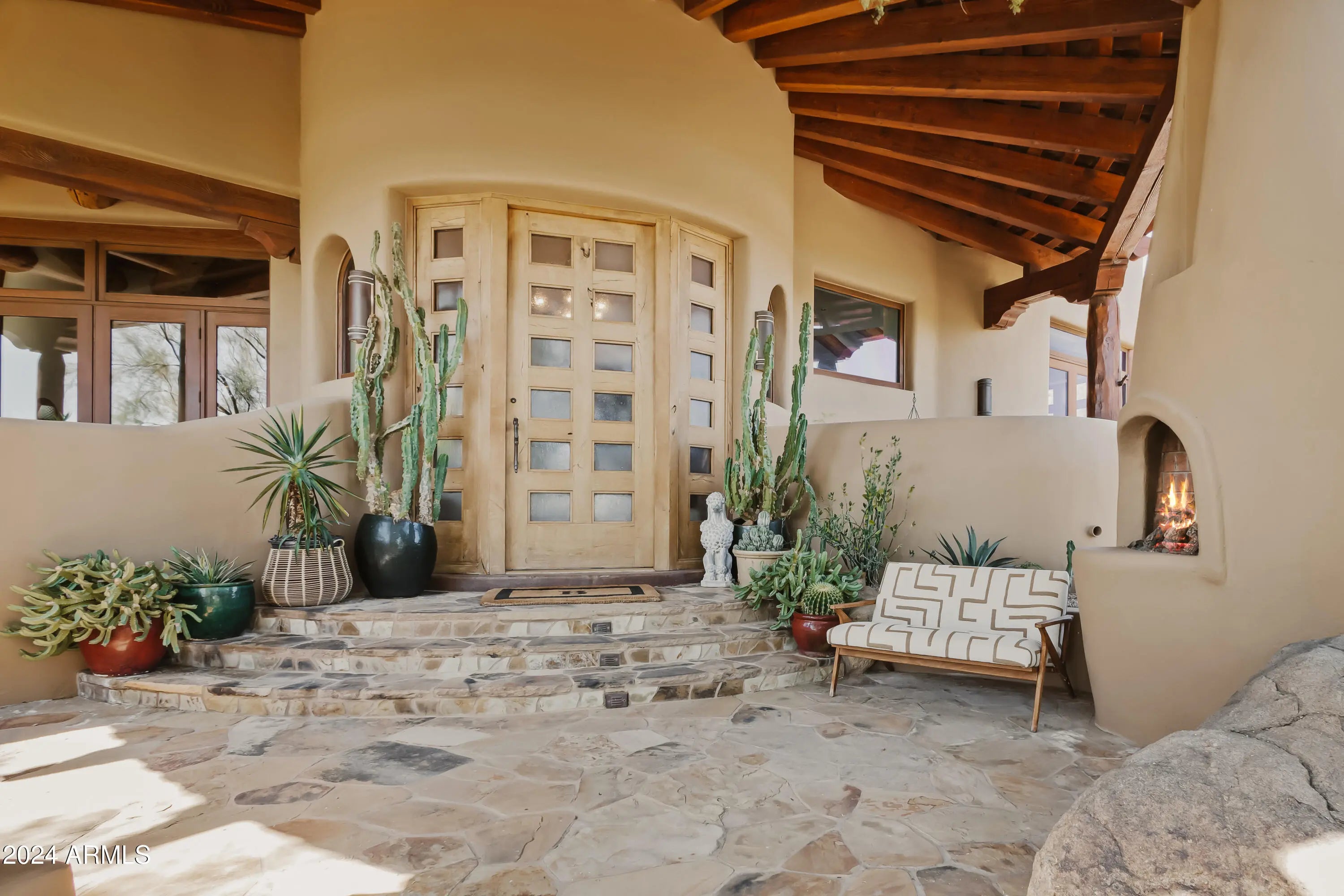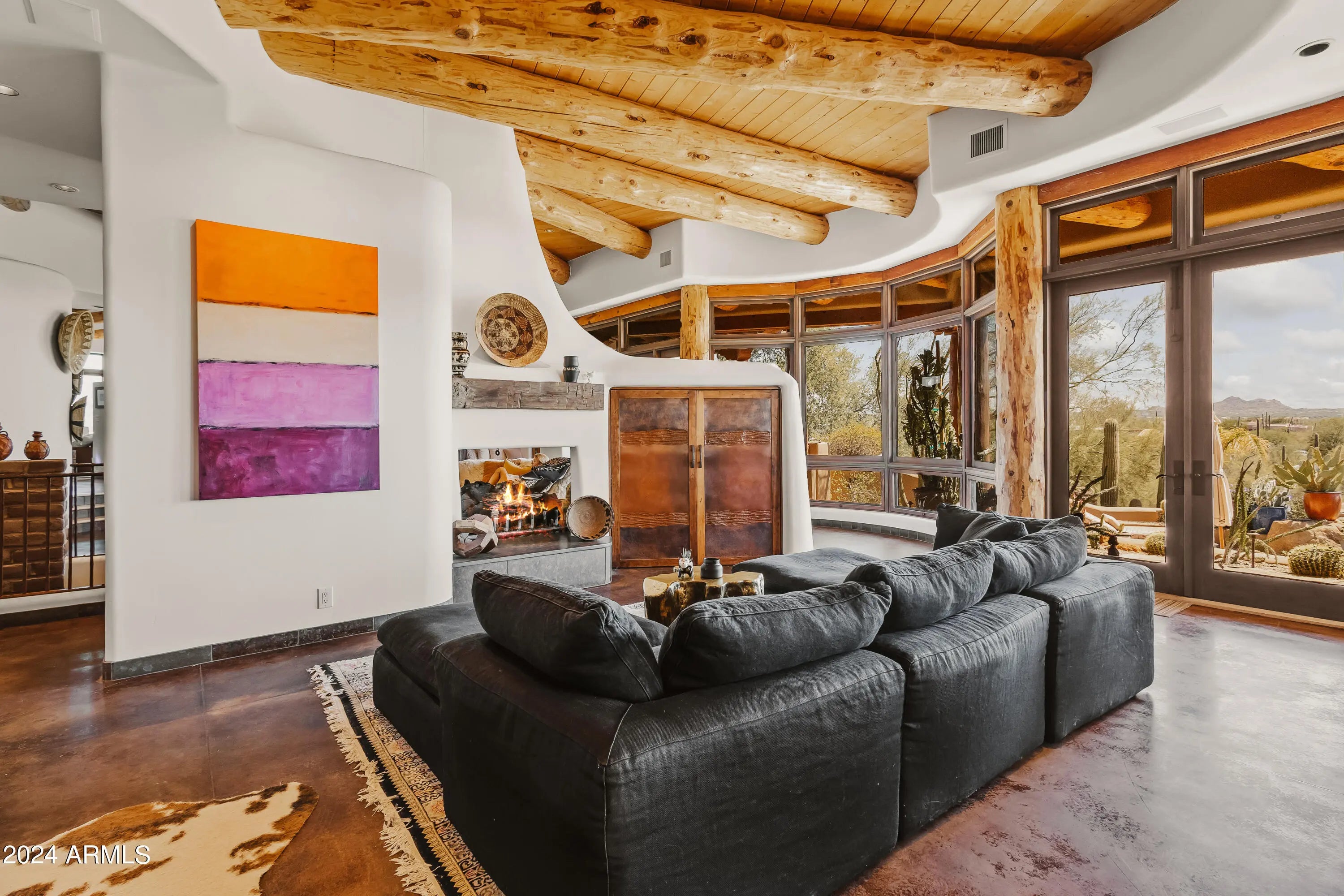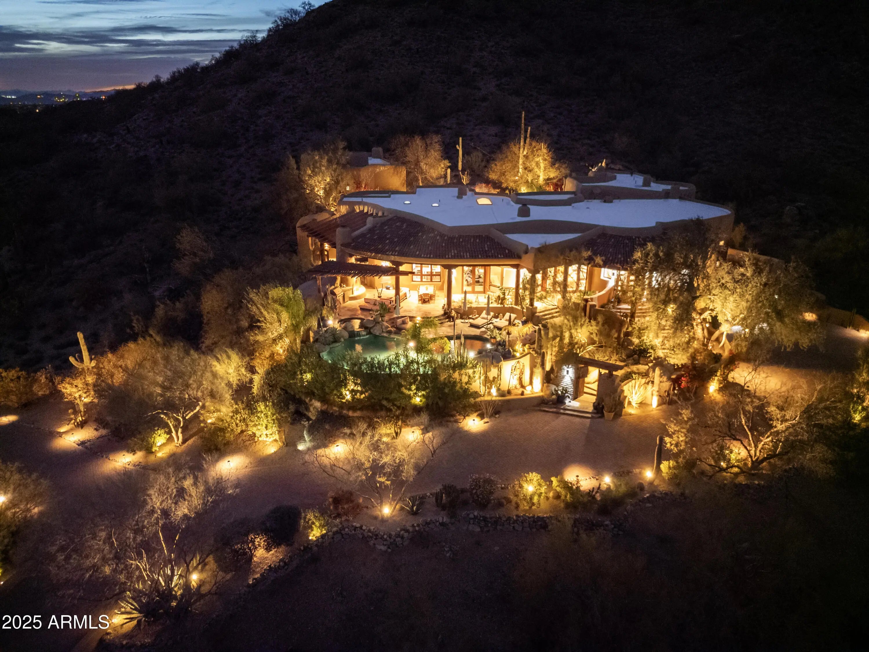This organic Pueblo-style estate sits high on Lone Mountain in the guard-gated community of Sincuidados, offering 3.4 acres and double lots with an adjacent acre for potential expansion. Designed by award-winning architect and Master of the Southwest, Lee Hutchison, the home blends warmth and Southwestern charm with real hickory wood floors, polished concrete accents, viga beams, and adobe brick walls. The spacious great room flows into a gourmet kitchen with a Viking Professional 6-burner range, a 24K gold farm sink, and hand-painted tile accents. The primary suite is a private retreat with a gas fireplace and a spa-like bath featuring a jacuzzi soaking tub with mountain views and a custom steam shower. Eight gas fireplaces bring comfort throughout the home, while a detached casita offers its own private escape with city light views. Outdoors, enjoy a heated infinity-edge pool with a dark pebble finish, a jetted spa, multiple covered flagstone patios, and an outdoor kitchen with a Viking BBQ. The oversized 4-car garage includes new epoxy flooring and built-in cabinets. The cost to replicate this home today, along with its magnificent lots, represents an extraordinary opportunity. This vibrant, guard-gated community is filled with amenities and activities. Sincuidados residents enjoy newly remodeled pickleball and tennis courts, as well as community wine tastings and social gatherings. This property combines luxury, space, and dramatic desert scenery.