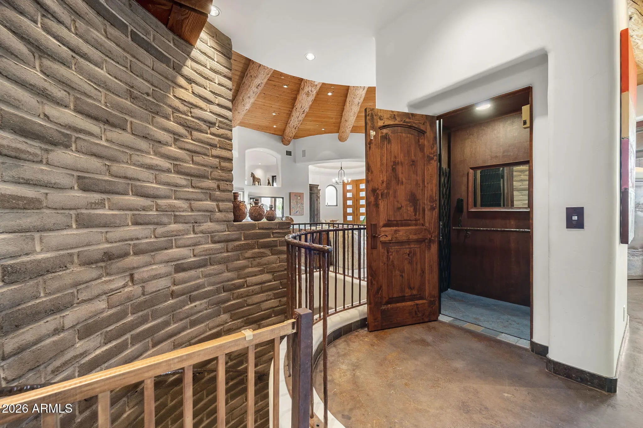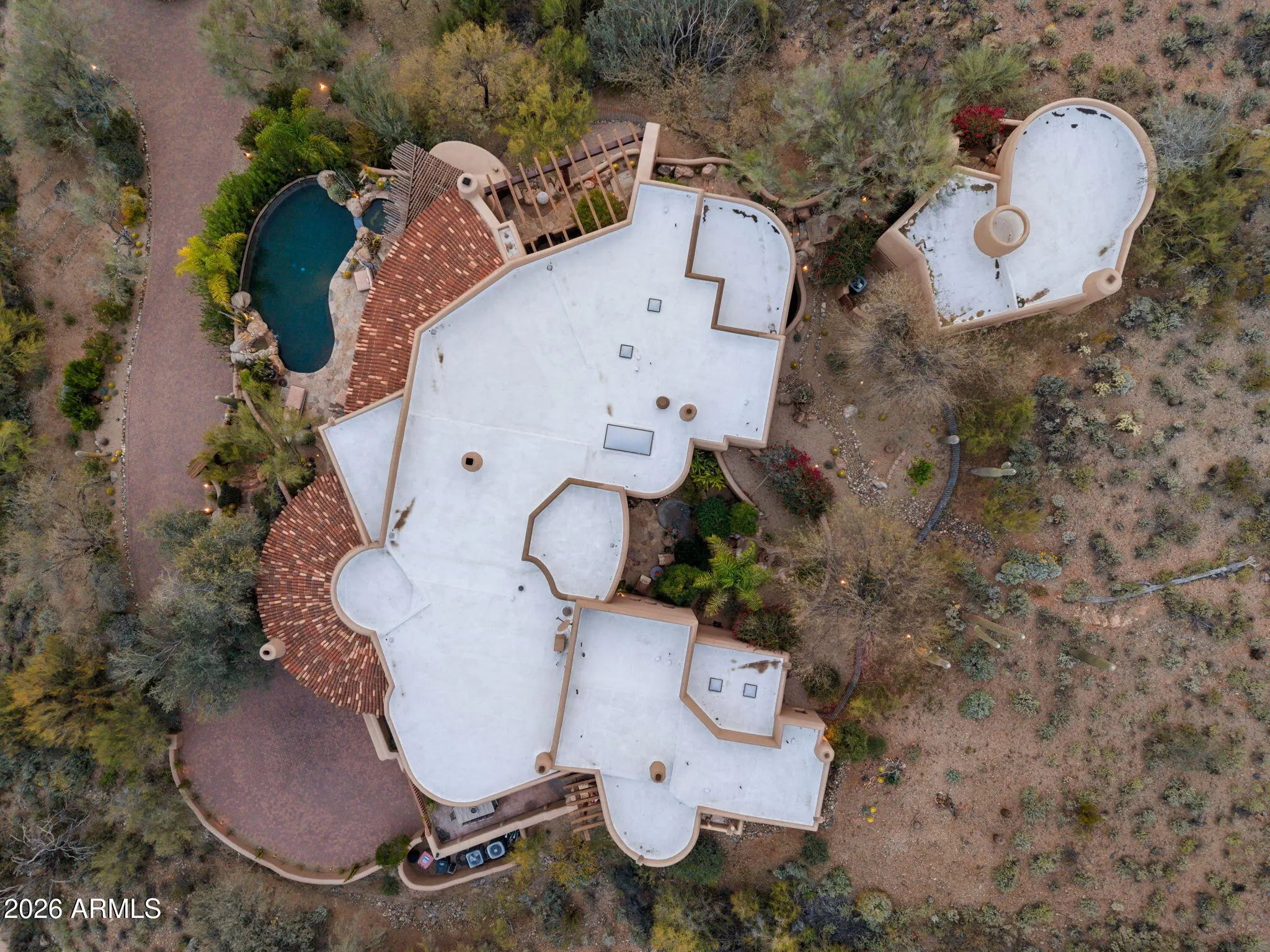 This organic Pueblo style estate sits high on Lone Mountain in the guard gated community of Sincuidados, offering 3.4 acres across double lots plus an additional adjacent acre for potential expansion. Perched on an exceptional view lot, the home captures magnificent mountain and city light views from virtually every room, delivering rare privacy while still enjoying the benefits of an active neighborhood. Designed by award winning architect and Master of the Southwest, Lee Hutchison, the residence showcases authentic Southwestern design. Real hickory wood floors, polished concrete accents, substantial viga beams, and hand laid adobe brick walls, complemented by handcrafted windows and screens and eight real gas fireplaces that add warmth, character, and timeless appeal throughout. The spacious great room flows seamlessly into a gourmet kitchen featuring a Viking Professional 6 burner range, 24K gold farm sink, and hand painted tile accents. An elevator provides convenient access from the oversized four car garage, complete with new epoxy flooring, built in cabinetry, and a large storage room, directly up to the main family room and kitchen level. The primary suite is a private retreat with a gas fireplace and spa like bath showcasing a jacuzzi soaking tub perfectly positioned to take in the mountain views, along with a custom steam shower. A detached casita offers its own private escape with sweeping city light views. Outdoors, a heated infinity edge pool with dark pebble finish and jetted spa appear to spill into the surrounding desert and distant mountains. Multiple covered flagstone patios and an outdoor kitchen with a Viking BBQ create ideal spaces for entertaining against a backdrop of dramatic desert scenery. The cost to replicate this home today, along with its magnificent lots, represents an extraordinary opportunity to own a true view estate in one of North Scottsdale's most vibrant guard gated communities, offering exceptional privacy across expansive acreage and the rare ability to expand.