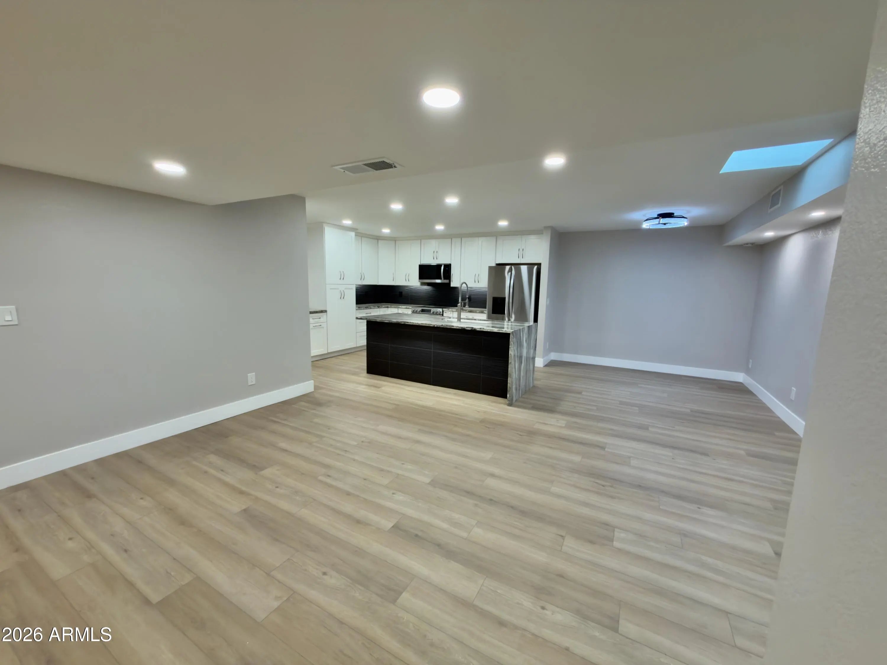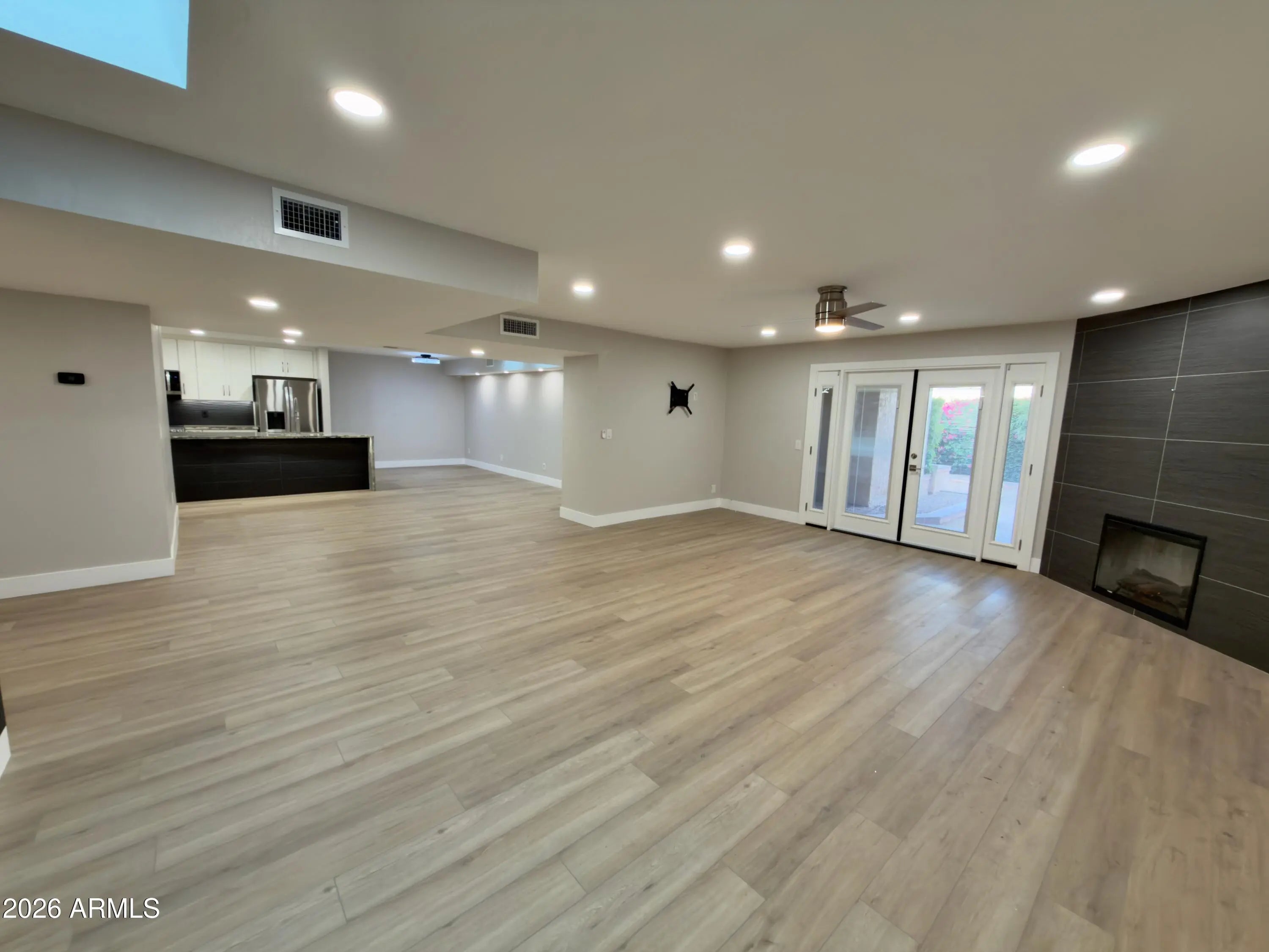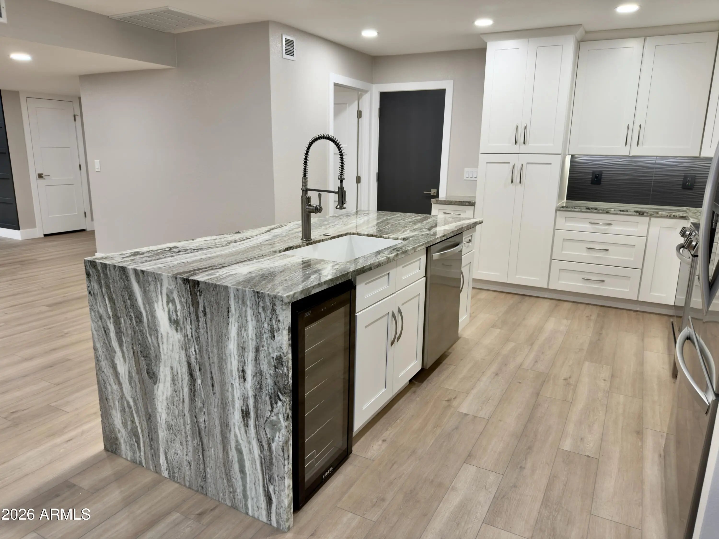 Stunning Fully Remodeled Home in Scottsdale's McCormick Ranch! Welcome to this gorgeous, top-to-bottom renovation in one of Scottsdale's most desirable neighborhoods — McCormick Ranch. This beautifully reimagined 2 bedroom, 2 bath home features a split floor plan that perfectly blends luxury, comfort, and modern style. Step inside to find luxury laminate flooring flowing throughout, paired with white shaker cabinets and soft-close drawers in the chef's kitchen. The kitchen also boasts Quartzite countertops with a waterfall edge, brand-new stainless steel appliances, and a built-in beverage fridge, making it ideal for both everyday living and entertaining. The open-concept living area features a designer accent wall and a modern tile fireplace with a sleek electric insert, creating an