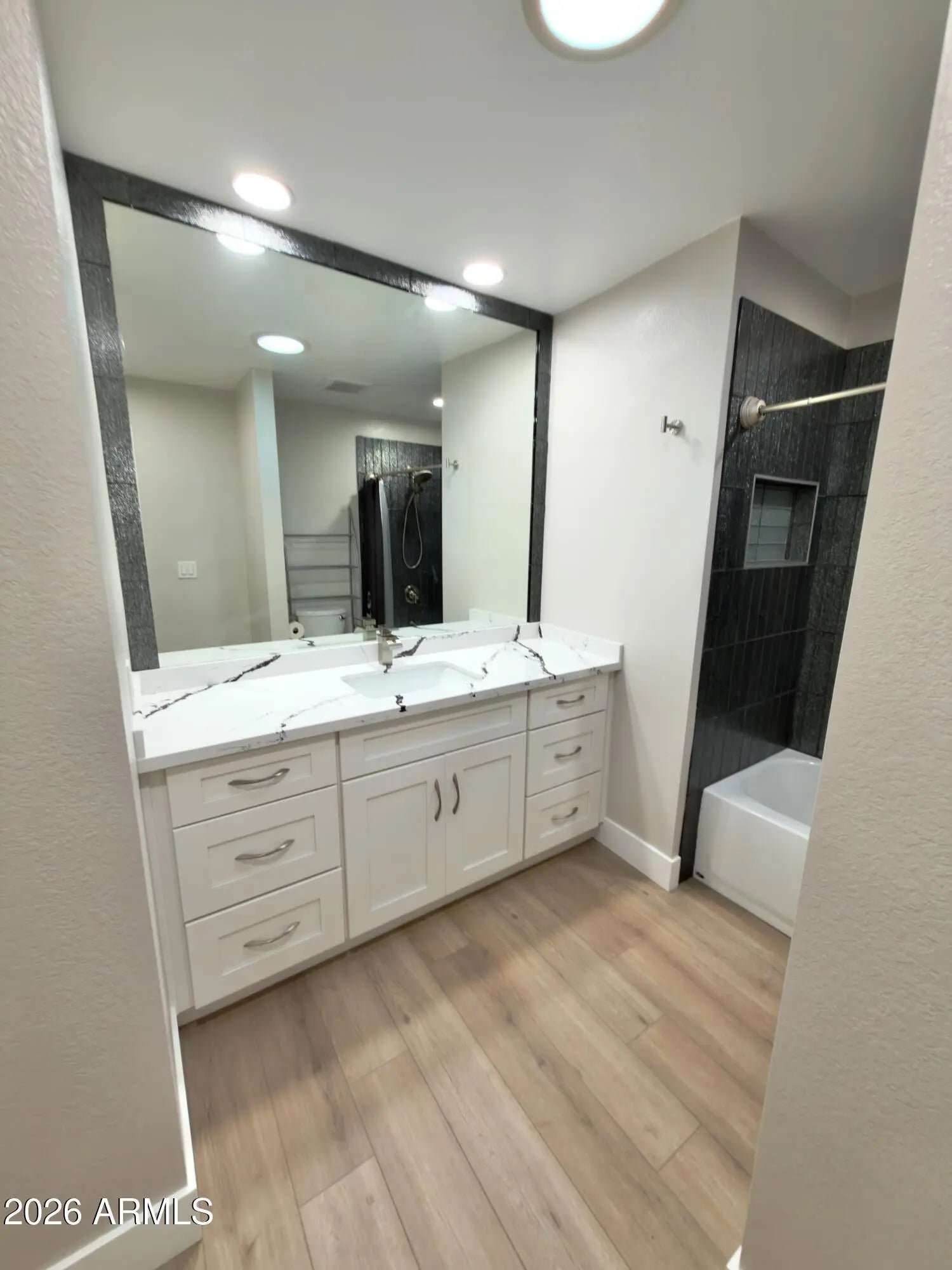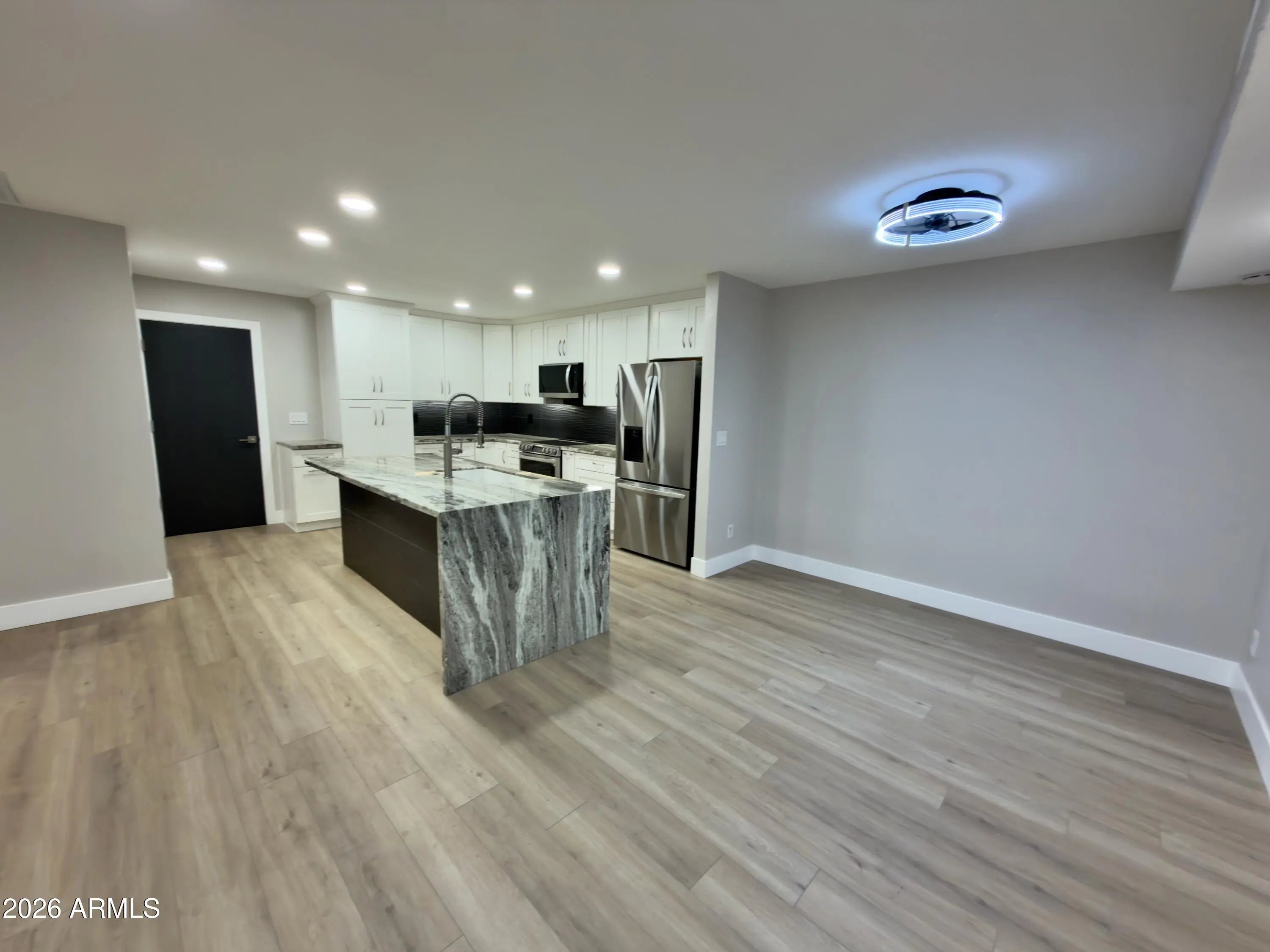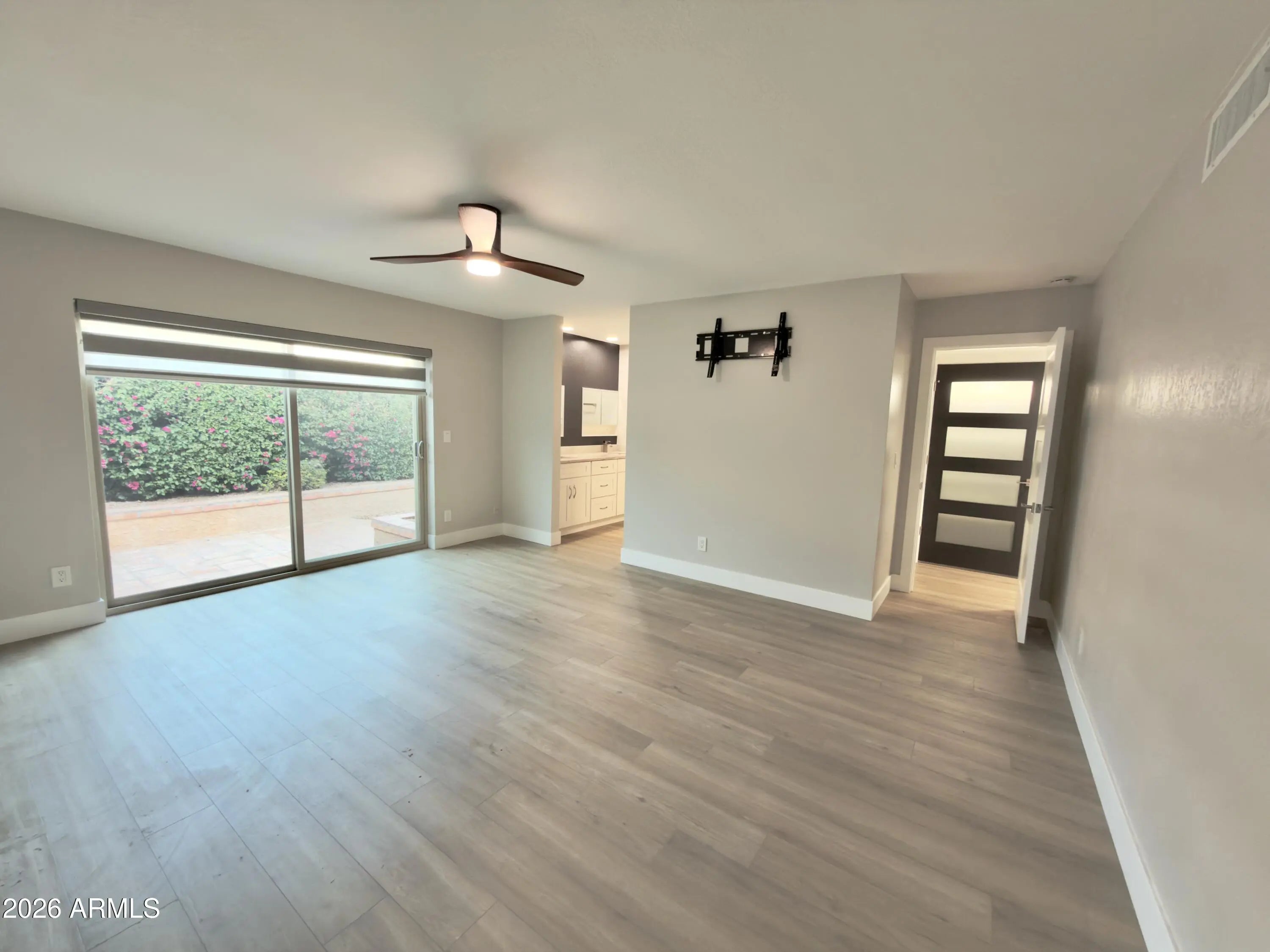 Stunning Fully Remodeled Home in Scottsdale's McCormick Ranch! Welcome to this gorgeous, top-to-bottom renovation in one of Scottsdale's most desirable neighborhoods — McCormick Ranch. This beautifully reimagined 2 bedroom, 2 bath home features a split floor plan that perfectly blends luxury, comfort, and modern style. Step inside to find luxury laminate flooring flowing throughout, paired with white shaker cabinets and soft-close drawers in the chef's kitchen. The kitchen also boasts Quartzite countertops with a waterfall edge, brand-new stainless steel appliances, and a built-in beverage fridge, making it ideal for both everyday living and entertaining. The open-concept living area features a designer accent wall and a modern tile fireplace with a sleek electric insert, creating an