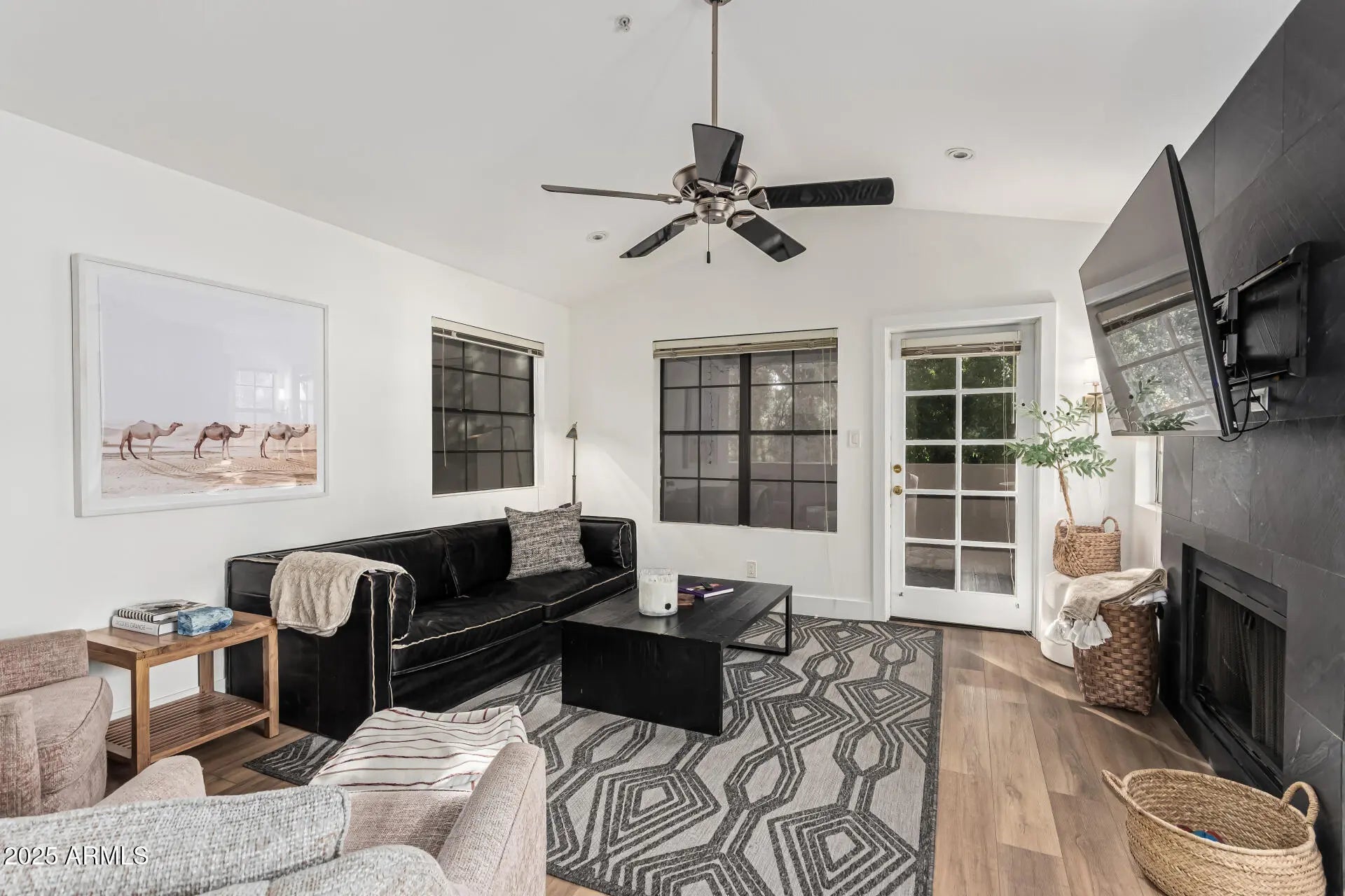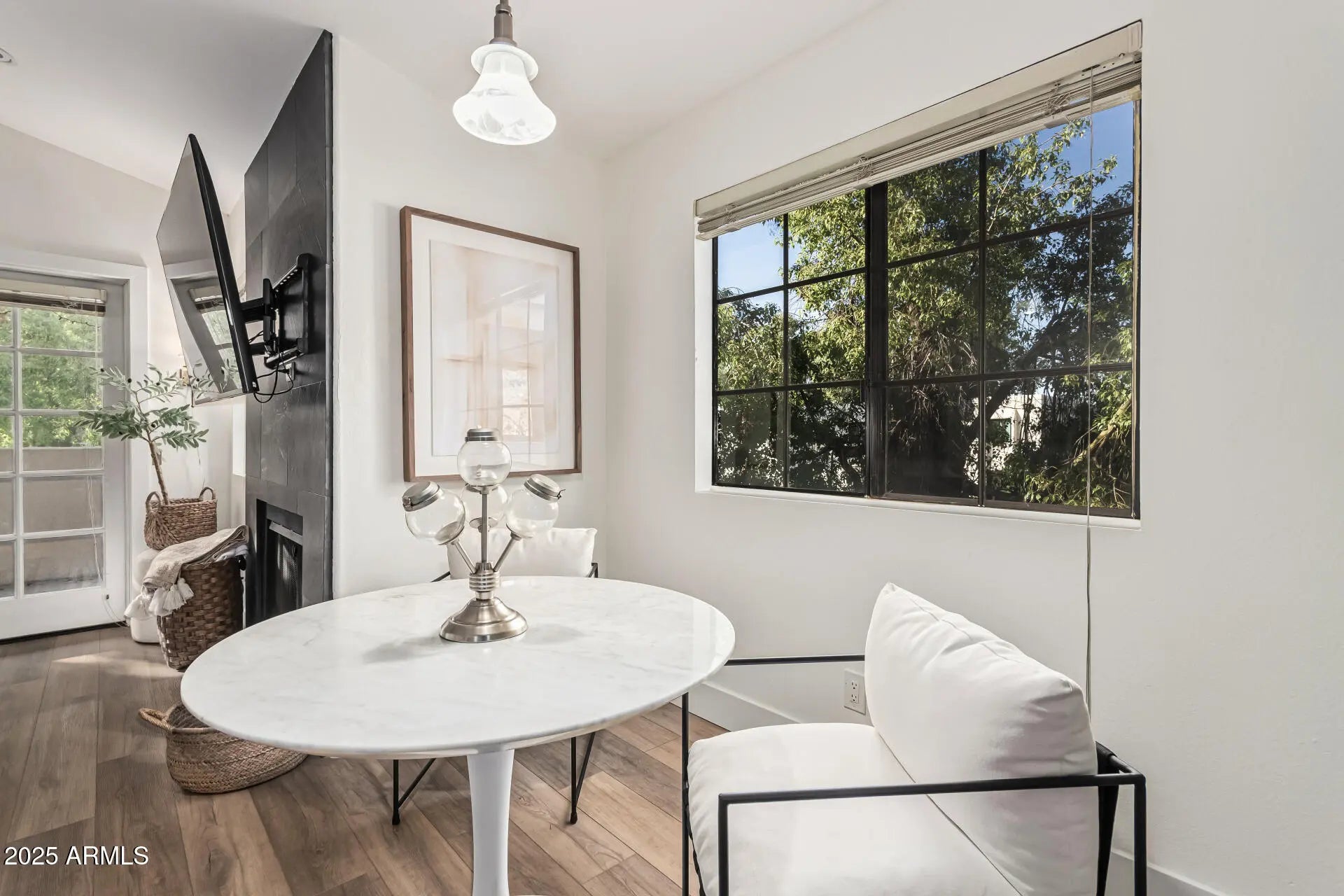 Beautifully remodeled condo located in a prime location. This fully remodeled condo has lots of natural light and features, tasteful LVP flooring, stainless-steel appliances, new bright white cabinets, beautiful open shelving and gorgeous Black Cosmic Leather finish granite. Looking out every window there are mature trees, and you can see the McDowell Mtns from your kitchen window. The patio overlooks a green space and offers a lot of privacy while enjoying the AZ sunsets. The great room has a stunning wood-burning fireplace and a lovely, dedicated dining space. Spacious bedroom has a big walk-in closet, and bathroom has a large countertop with double sinks. A new HVAC was installed during the remodel in 2022. Enjoy the heated pool, spa, BBQ area, clubhouse or workout room in this quiet.. park-like community. This location is known for its numerous restaurants, parks, location to resorts, highly rated schools, location to highways, and of course Scottsdale shopping.