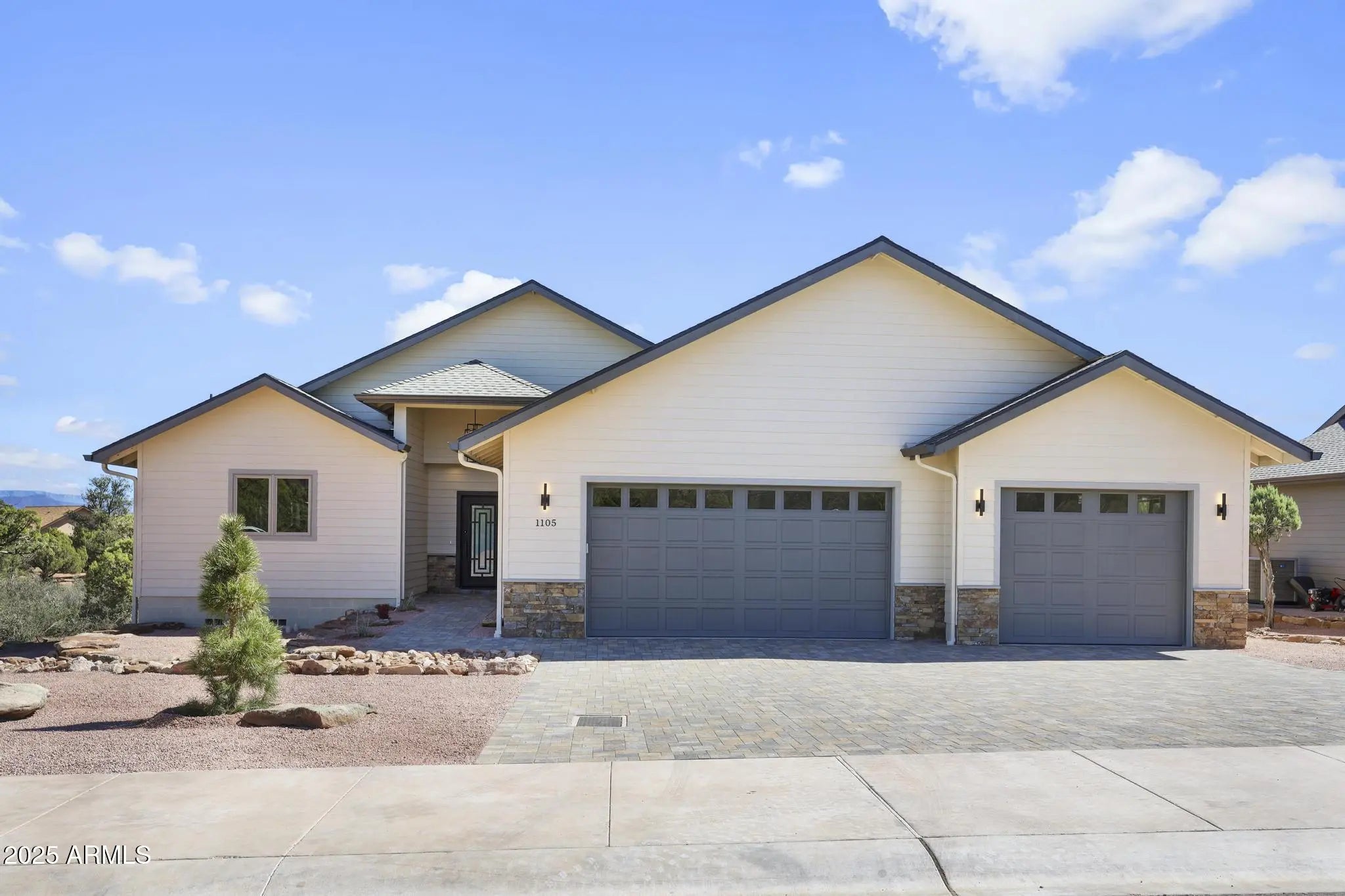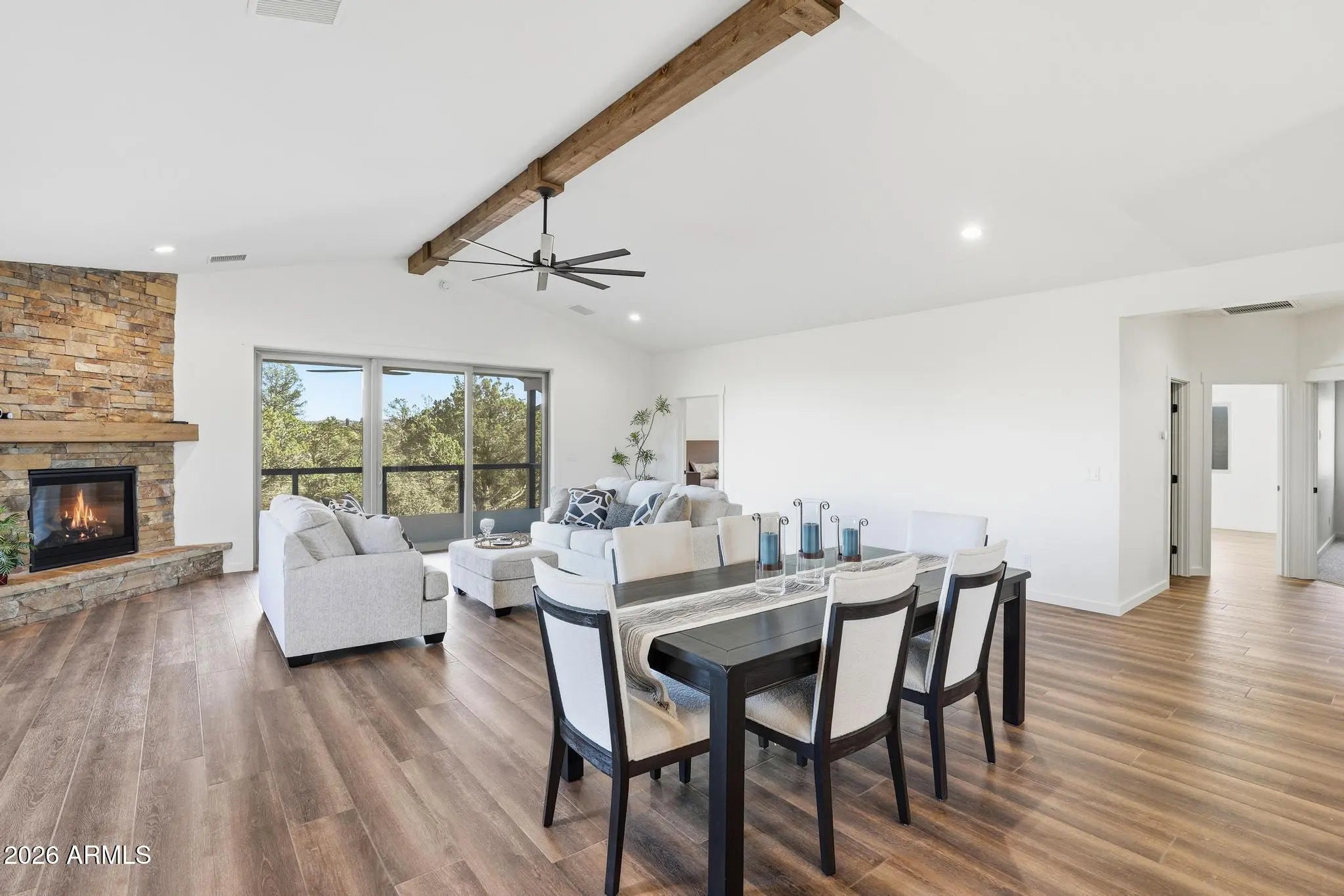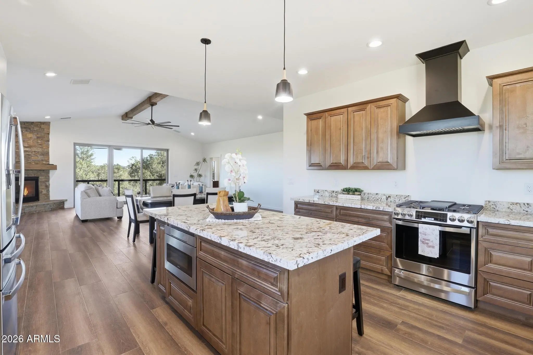 Brand-New Single-Level Home with Rim Views by Whelan Custom Homes! This immaculate 3-bedroom, 2-bath custom home is situated on a .28-acre lot in Green Valley Vista, a quiet subdivision of newer homes with no HOA and dark-sky lighting to showcase the star-filled nights. Designed for modern mountain living, this home features GE Profile stainless steel appliances, a spacious kitchen island, and solid wood cabinetry with under-cabinet lighting. The open-concept living area is highlighted by a stacked-stone propane fireplace, granite countertops in the kitchen and baths, and Paradigm luxury vinyl plank flooring throughout. Quality craftsmanship shines through with solid Alder doors, Pella windows, and Kohler and Delta sinks, toilets, and fixtures.