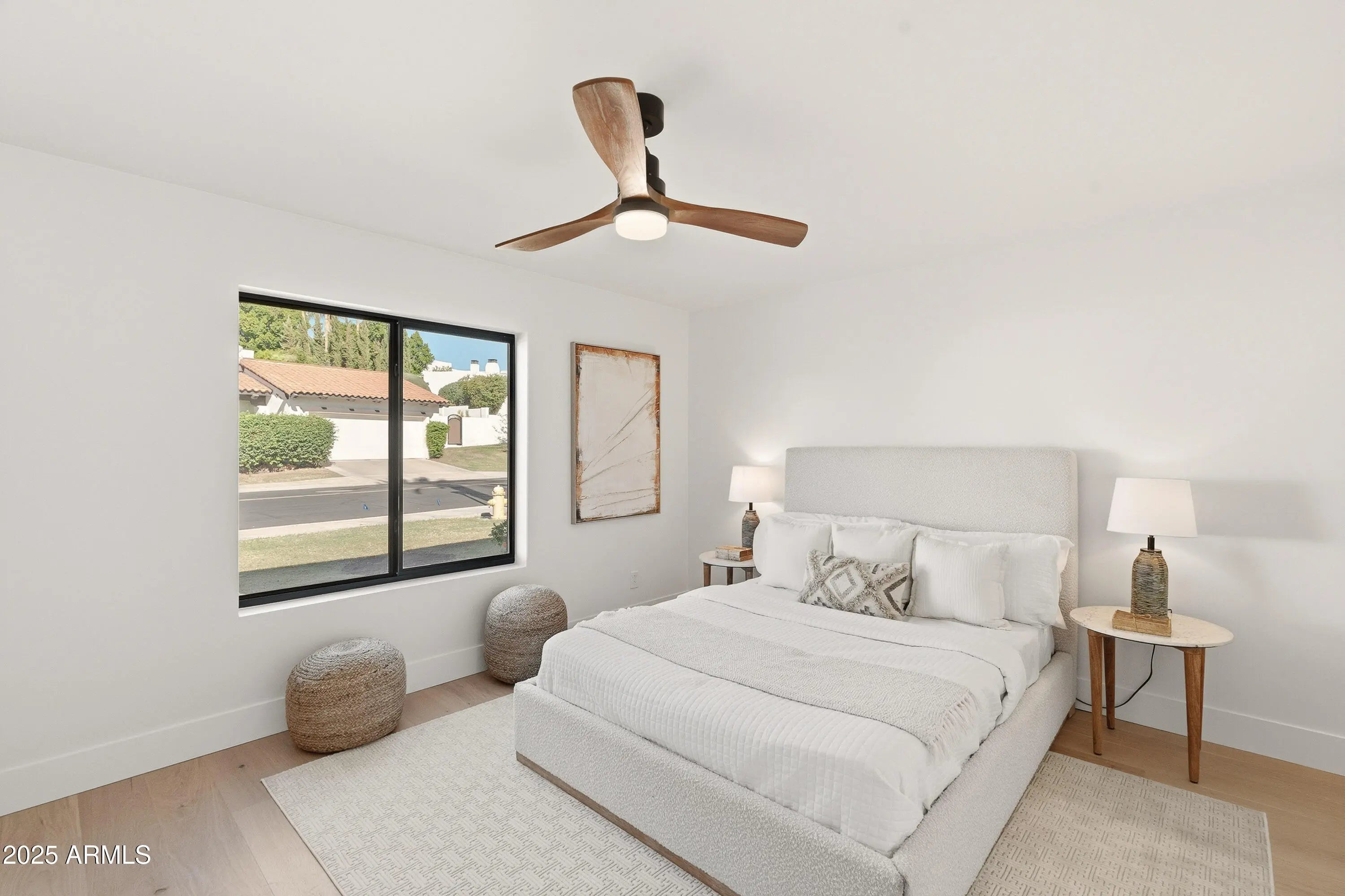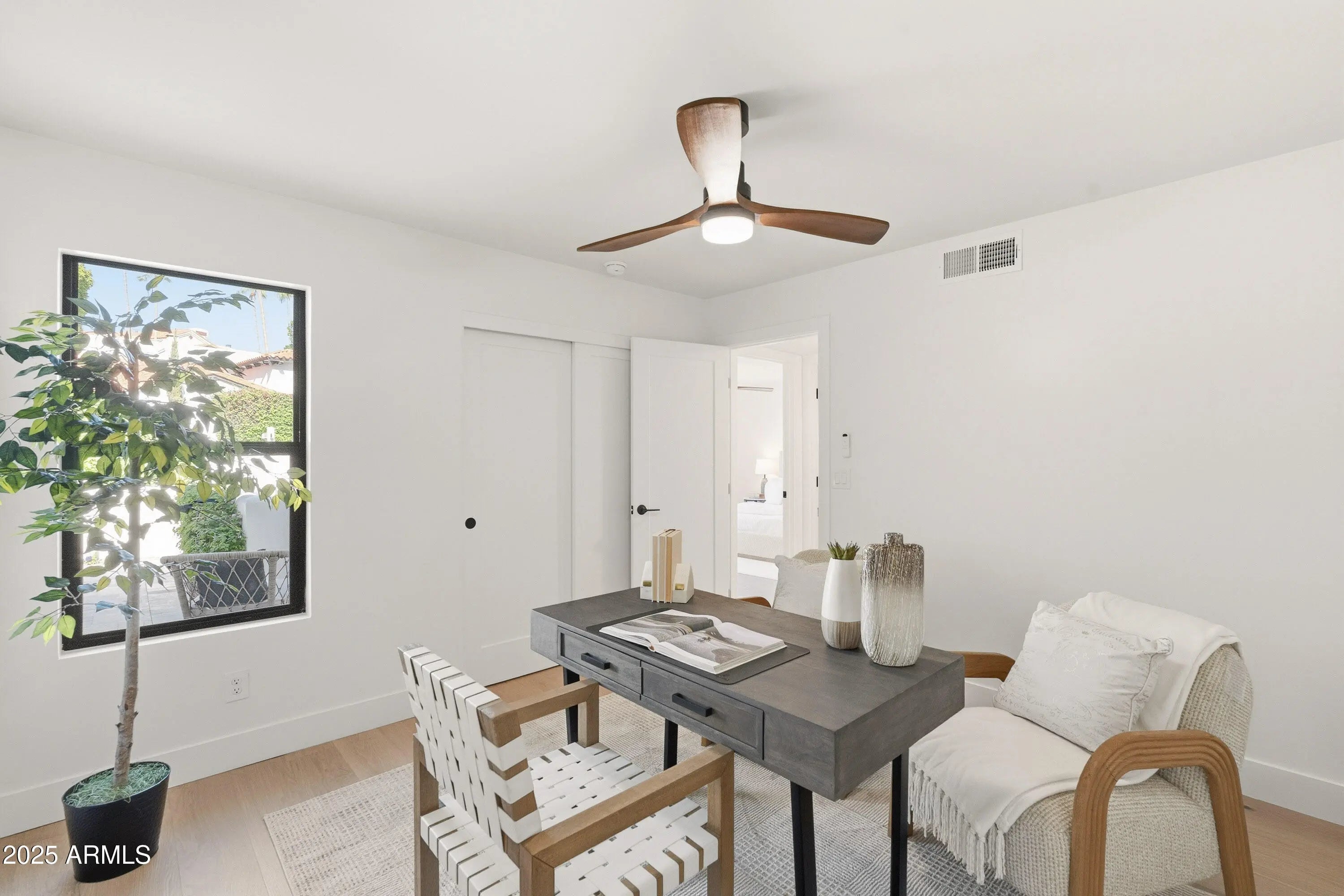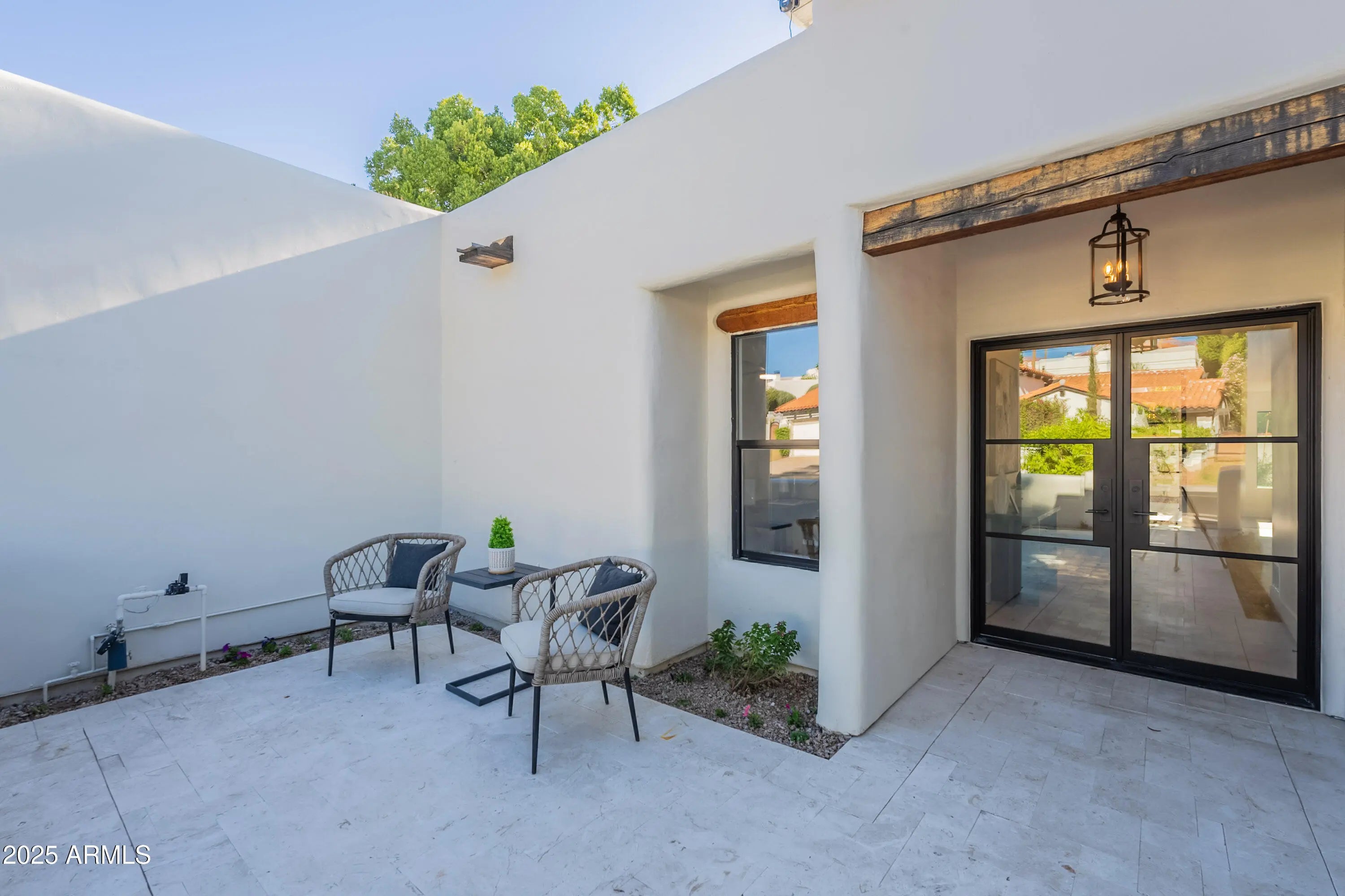 This impeccably renovated residence is tucked away within the prestigious guard-gated Biltmore Greens community. This elegant lock-and-leave home has been completely transformed from top to bottom with premium finishes throughout. The 3-bedroom, 2-bathroom home blends modern luxury with timeless elegance, offering a thoughtfully reimagined living space where every detail exudes quality and craftsmanship. On the exterior, the home features smooth stucco, fresh paint inside and out, new Milgard windows, and three sleek iron doors. The curb appeal is unmatched with professionally landscaped grounds, mature shade trees, and a stunning backyard featuring new rolled natural grass, expansive travertine hardscape, and a brand-new paver entertaining area. Inside, the craftsmanship shines. Brand new smooth drywall, hardwood flooring throughout, and designer tile create a cohesive and sophisticated aesthetic. The kitchen and bathrooms are beautifully appointed with quartz countertops, soft-close slim shaker cabinetry, and brand-new appliances. Porcelain sinks and Delta faucets add refined touches, while hand-selected sconces and designer lighting bring warmth and character to each room. The master suite is a true retreat, showcasing a luxurious shower with intricate tilework and elegant fixtures that embody comfort and class. From the flooring beneath your feet to the fixtures above, every detail has been intentionally curated to create a warm, inviting, and high-end living experience. This home is more than just remodeled; it's been completely redefined. With its seamless blend of modern updates and timeless finishes, it's ready to impress even the most discerning buyer.