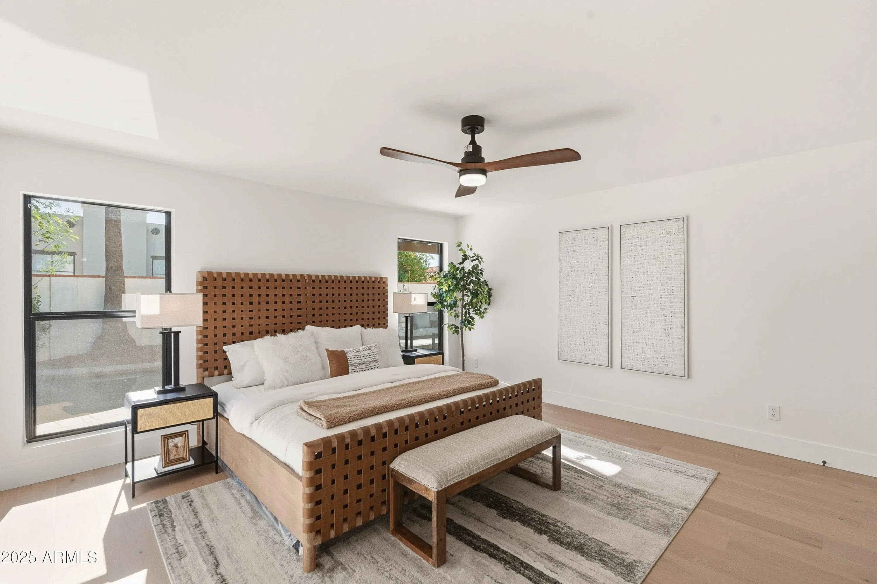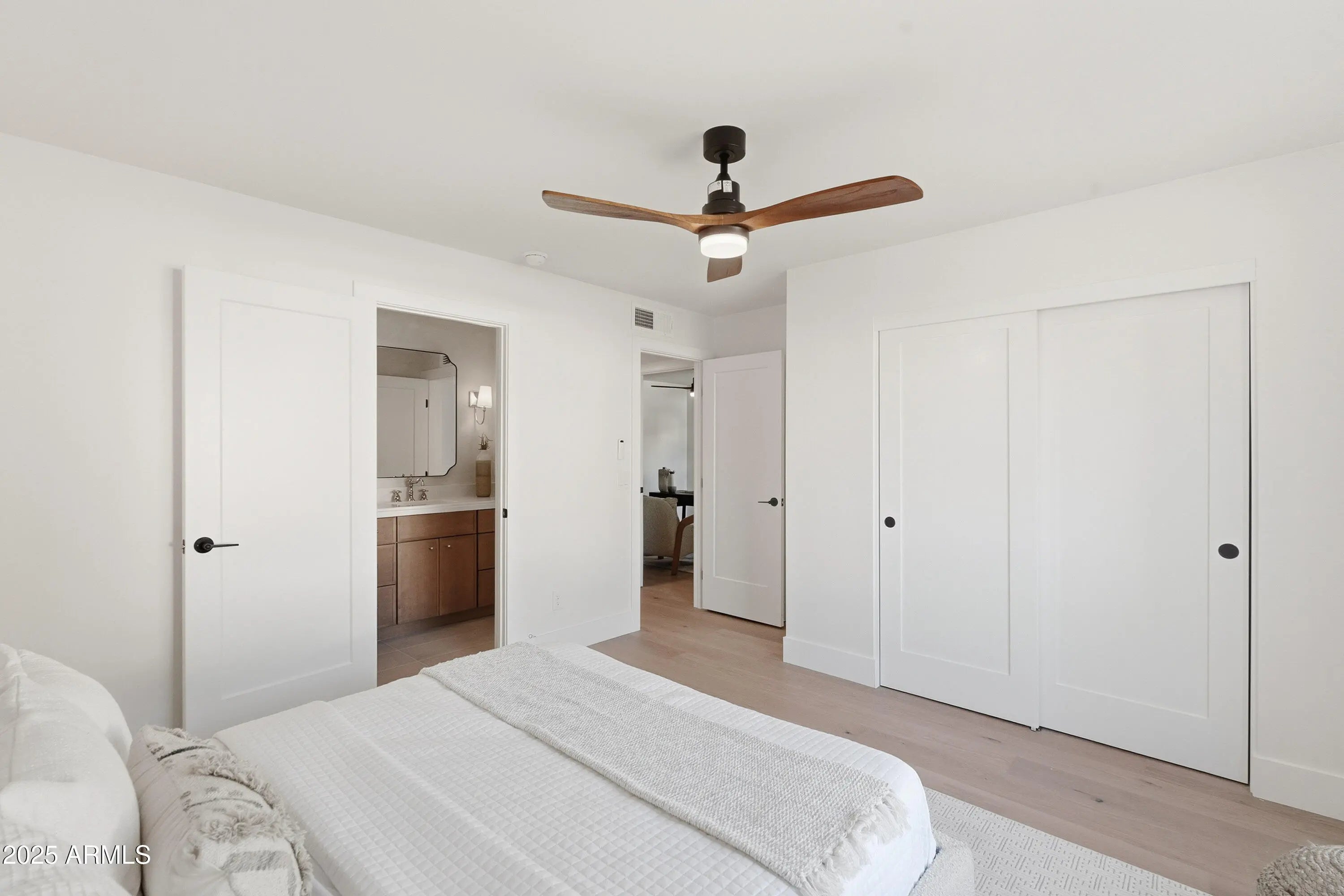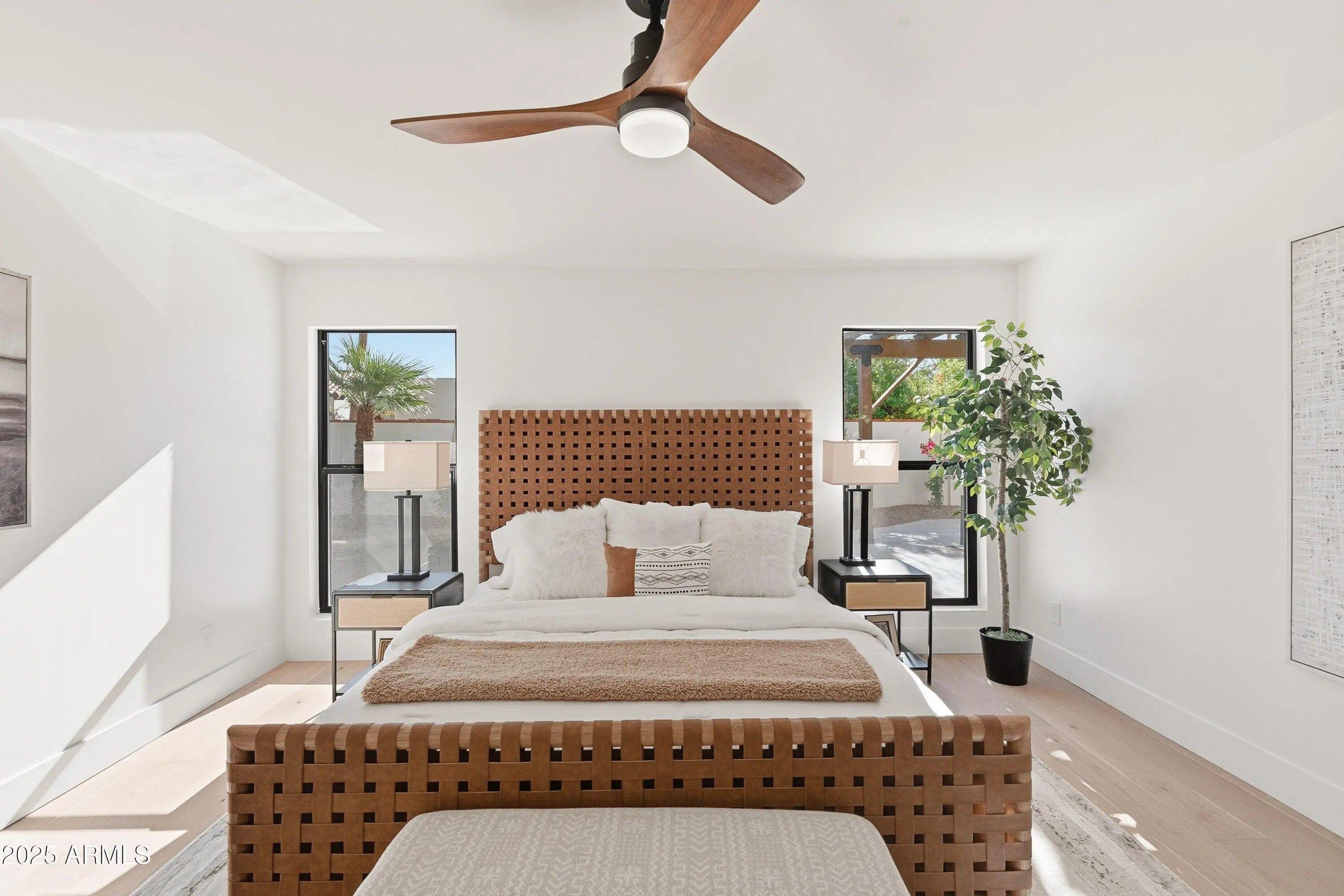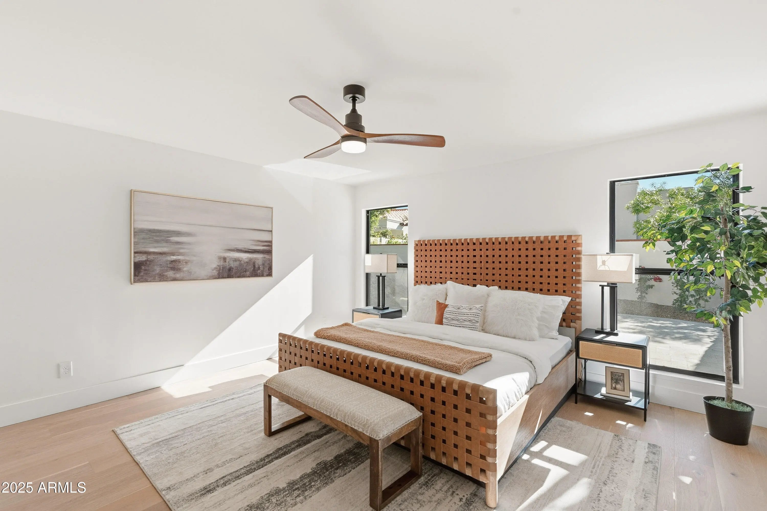 This impeccably renovated residence is tucked away within the prestigious guard-gated Biltmore Greens community. This elegant lock-and-leave home has been completely transformed from top to bottom with premium finishes throughout. The 3-bedroom, 2-bathroom home blends modern luxury with timeless elegance, offering a thoughtfully reimagined living space where every detail exudes quality and craftsmanship. On the exterior, the home features smooth stucco, fresh paint inside and out, new Milgard windows, and three sleek iron doors. The curb appeal is unmatched with professionally landscaped grounds, mature shade trees, and a stunning backyard featuring new rolled natural grass, expansive travertine hardscape, and a brand-new paver entertaining area. Inside, the craftsmanship shines. Brand new smooth drywall, hardwood flooring throughout, and designer tile create a cohesive and sophisticated aesthetic. The kitchen and bathrooms are beautifully appointed with quartz countertops, soft-close slim shaker cabinetry, and brand-new appliances. Porcelain sinks and Delta faucets add refined touches, while hand-selected sconces and designer lighting bring warmth and character to each room. The master suite is a true retreat, showcasing a luxurious shower with intricate tilework and elegant fixtures that embody comfort and class. From the flooring beneath your feet to the fixtures above, every detail has been intentionally curated to create a warm, inviting, and high-end living experience. This home is more than just remodeled; it's been completely redefined. With its seamless blend of modern updates and timeless finishes, it's ready to impress even the most discerning buyer.