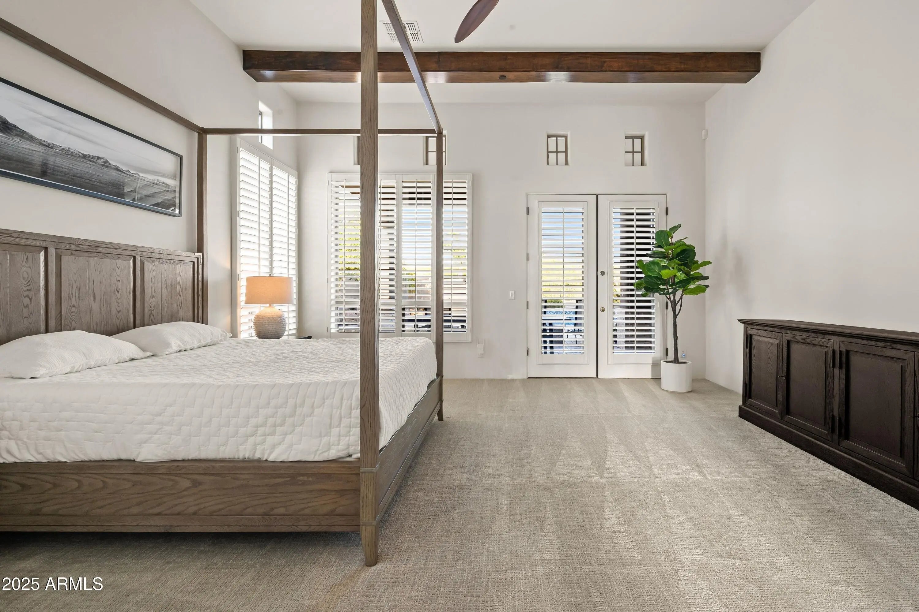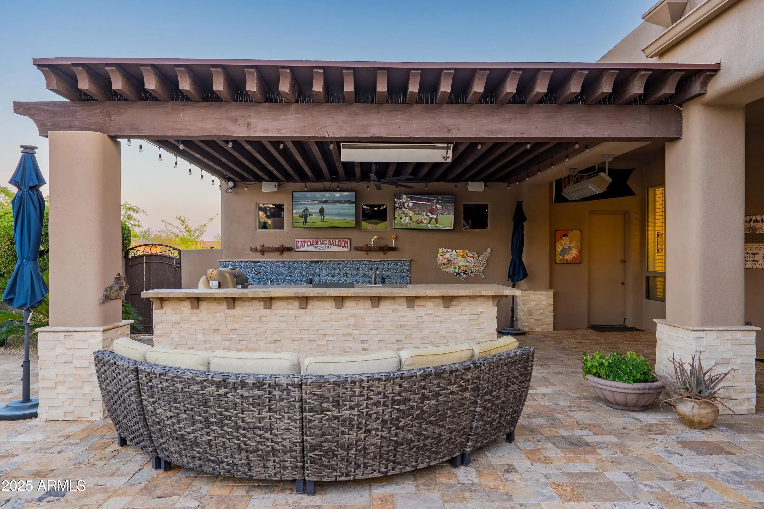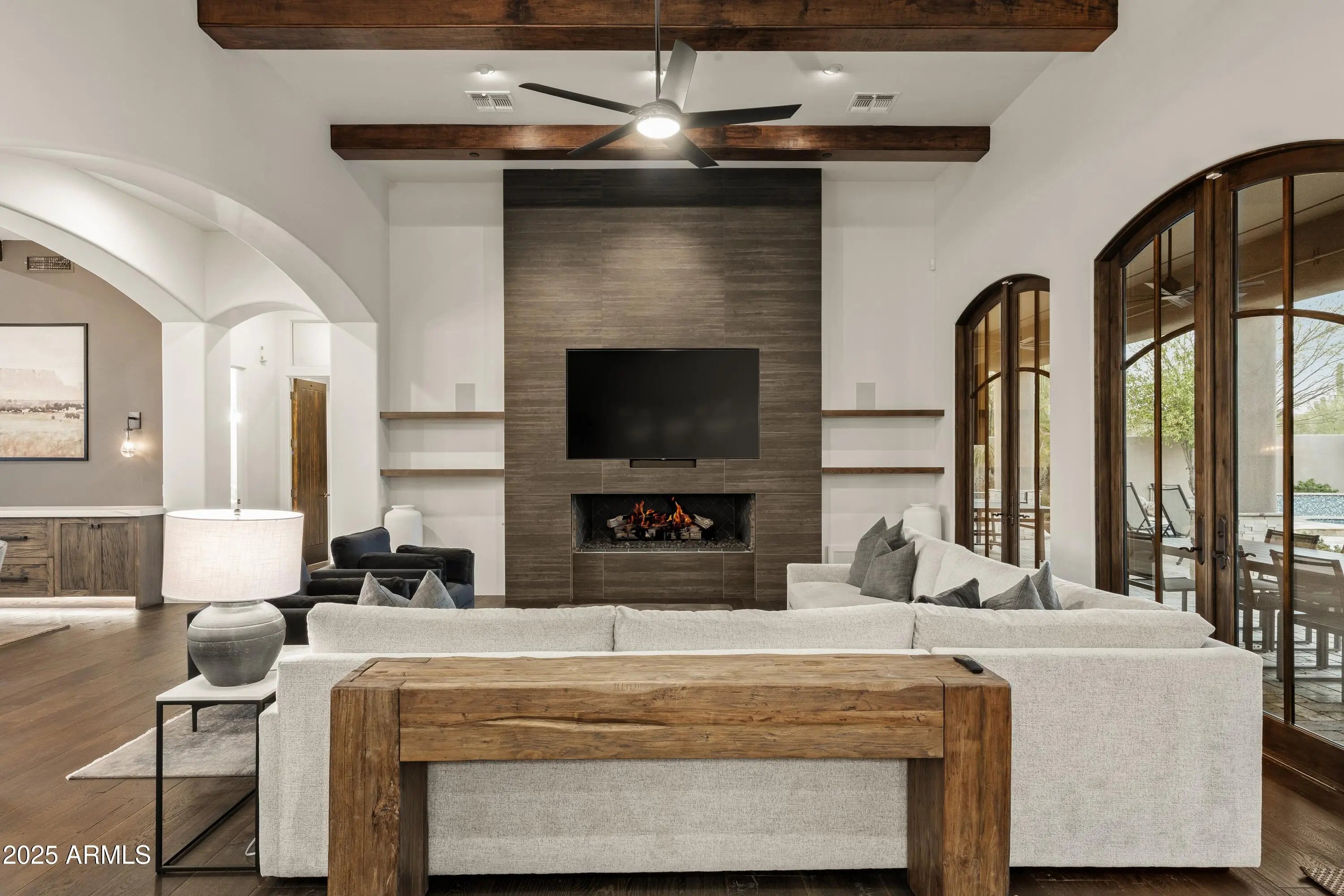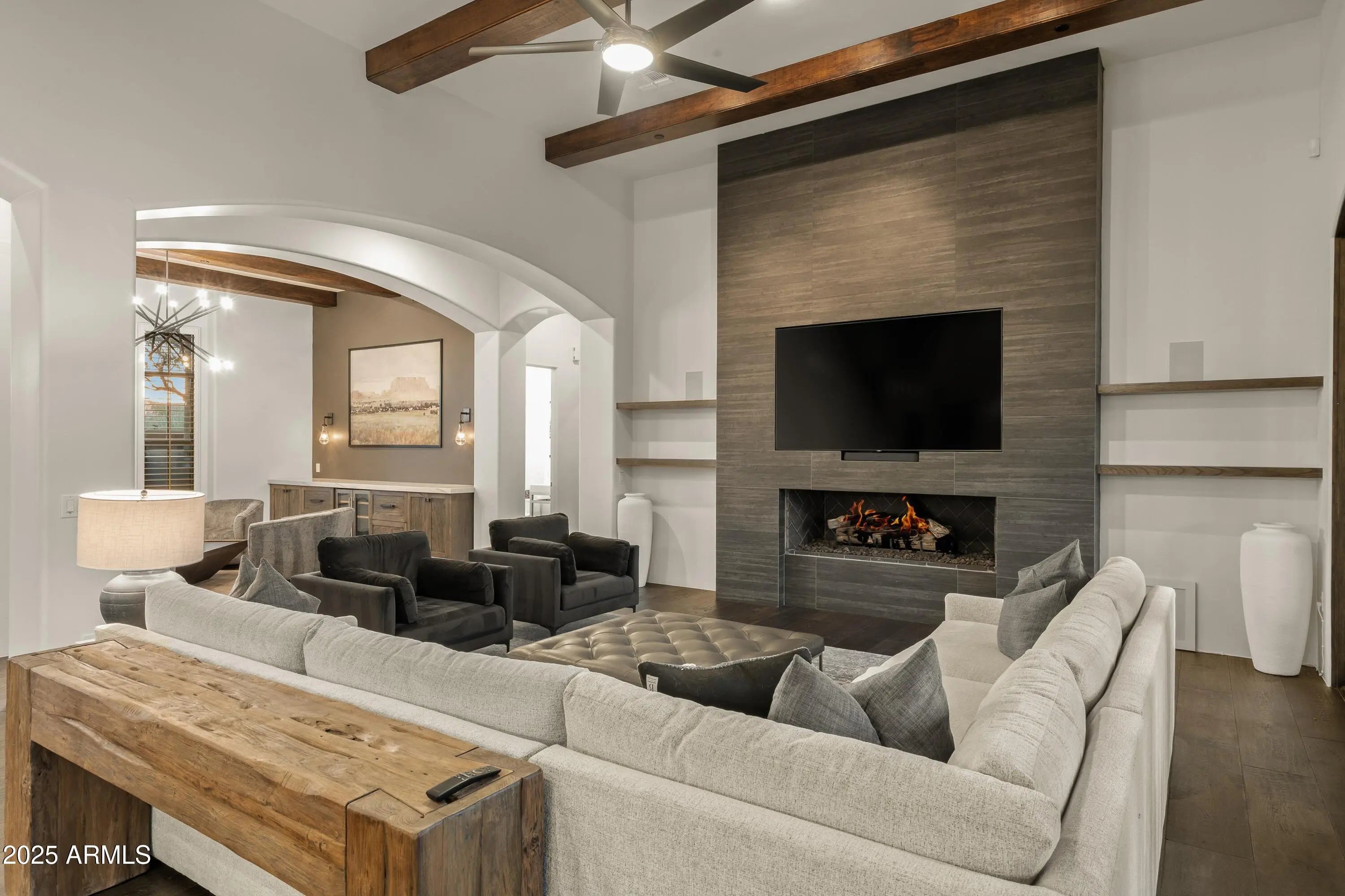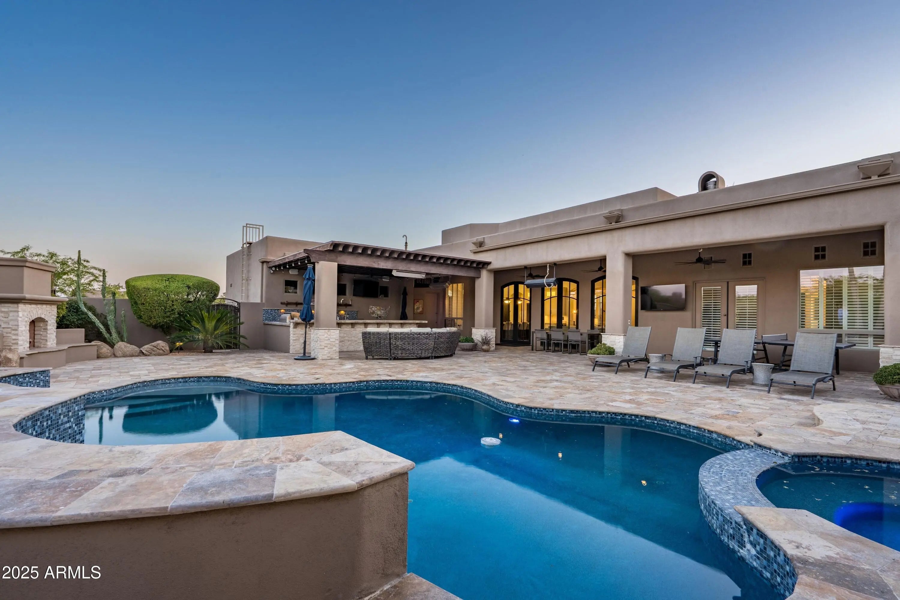 Welcome to the epitome of relaxed, refined indoor-outdoor living in the heart of the Sonoran Desert. Perfectly positioned within the privately gated and intimate community of Boulder Ridge in North Scottsdale, this exceptional residence showcases the ideal blend of Southwest Contemporary architecture and resort-inspired design. Every element of this single-level, open great-room split floor plan and extraordinary resort backyard is crafted for seamless living, entertaining, and relaxation. From the moment you enter through the front gated courtyard, you are embraced by warmth and sophistication. The spacious interior unfolds with effortless flow — elegant yet comfortable, open yet thoughtfully defined. The main living spaces are adorned with beamed ceilings, wide-plank wood flooring, and flat arched entryways, creating a sense of understated luxury. The great room anchors the home with three sets of French doors opening to the patio, a floor-to-ceiling linear fireplace, and a perfectly positioned inset mounted TV, allowing the outdoors to become a natural extension of the interior. Yet, it's the resort-style backyard that truly distinguishes this property as an entertainer's dream. The expansive stone patio meanders around a curvilinear pool with a tiled water feature, spa, built-in bench seating, and multiple lounging areas for sun and shade. The covered patio is a living destination in itself complete with a mounted TV, alfresco dining area, and an extraordinary U-shaped bar with wraparound seating. This outdoor kitchen rivals any resort setup, offering a built-in grill, gas burners, keg installation, sink, inset ice bin, and dual mounted TVs all framed by lush desert landscaping with palm trees, citrus, and two stunning stone-and-stucco fireplaces with hearth seating. The Chef's kitchen is a showpiece, featuring a remarkable 70" x 116" island with bar seating, sleek white Shaker cabinetry, Quartz countertops with full backsplash, a walk-in pantry, and a bright casual dining area illuminated by designer pendant lighting. Adjacent spaces include a formal dining area and a sitting area or flex room, each accented with modern metal chandeliers that enhance the home's contemporary desert charm. The primary suite defines luxury and privacy, accessed through double doors into a serene retreat. The expansive bedroom opens directly to the patio and includes a spa-like ensuite bath with a floating double vanity, a freestanding soaking tub, and a doorless walk-in shower with bench. A generous custom walk-in closet completes this peaceful haven. On the opposite wing, an elegant French door enclosed office or bedroom with Jack-and-Jill bath access connects to a guest suite with walk-in closet, while a third ensuite guest bedroom conveniently adjoins the garage entry corridor ideal for visitors or extended family. Every architectural and design element in this home from the wide wood floors, solar roof panels to the contemporary tiled baths and beamed ceiling accents contributes to its exceptional harmony and sophistication. Designed for those who value beauty, comfort, and effortless entertaining, this residence offers a tranquil escape while remaining just moments from North Scottsdale's premier shopping, dining, and entertainment. Experience the art of desert living at its finest where modern luxury meets timeless Southwest character in an intimate, exclusive setting.