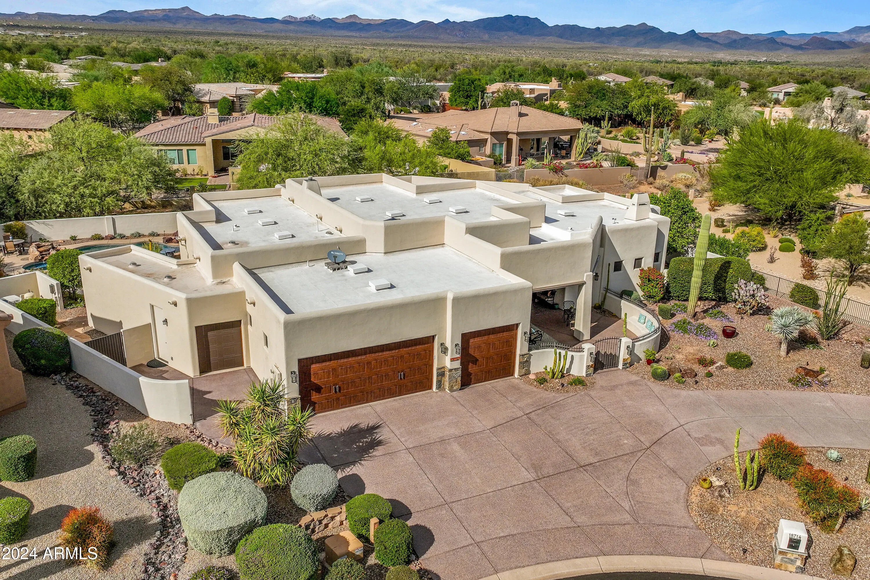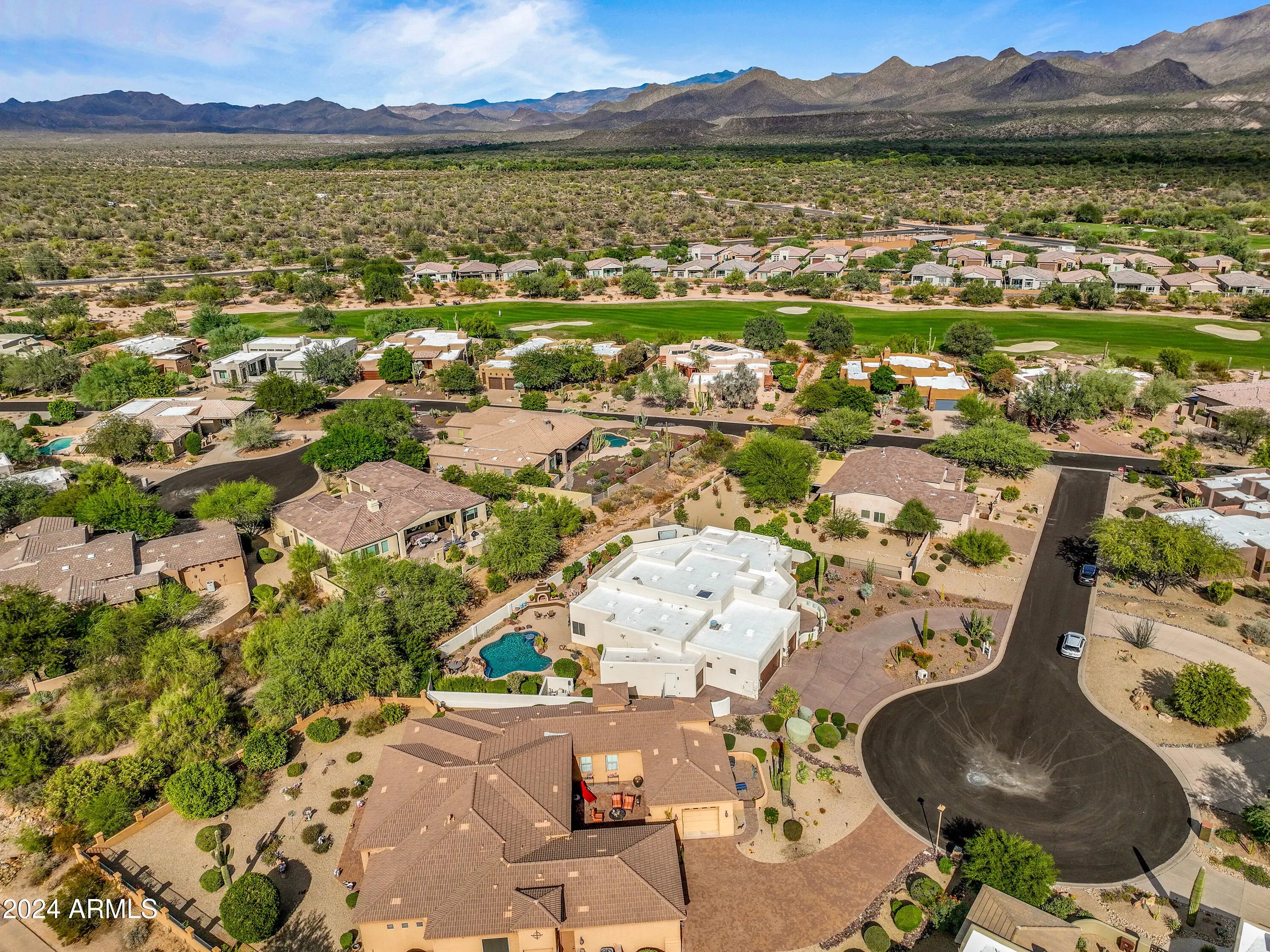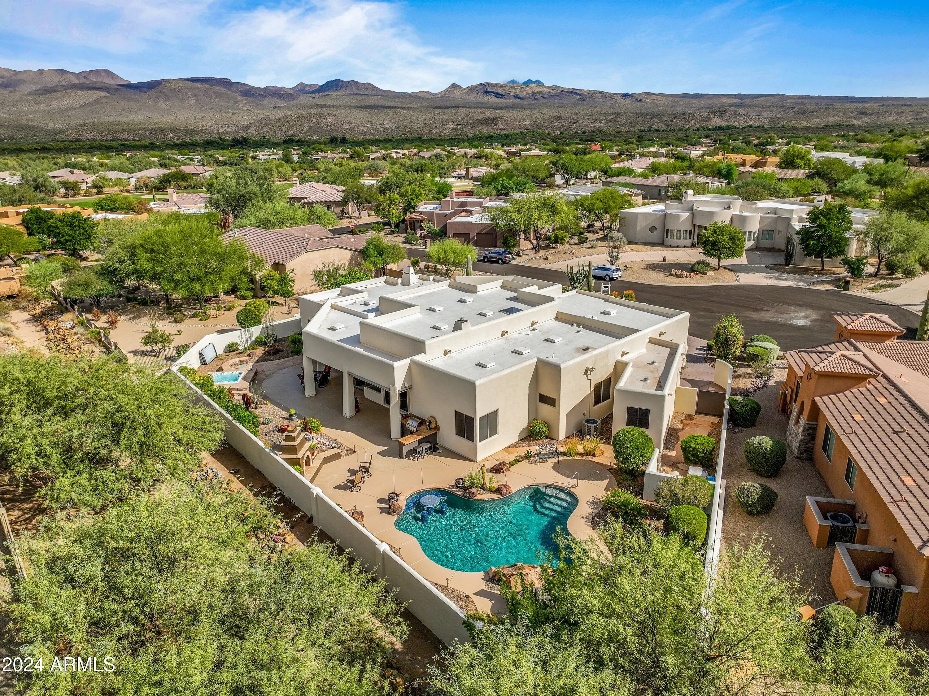 Quality home, meticulously cared for in gated Tonto Verde. RStarting with the beautiful white exterior, a gated front courtyard with mountain views, then enter this warm designer home with gorgeous wood floors and elegant smooth skim coating on the cream colored walls. The kitchen has all new appliances. The dining room has a custom light fixture to illuminate the magnificent round table that will be included with the purchase. The primary bedroom is oversized with its own fireplace and extra bonus room for exercise, sewing or office.The 2nd bedroom is so large it could be considered a second primary suite. The 3rd bedroom is set up as an office with could be a bedroom with a nice walk-in closet.The backyard is a resort with a private pool & spa and the 3 1/2 car garage with epoxy surface