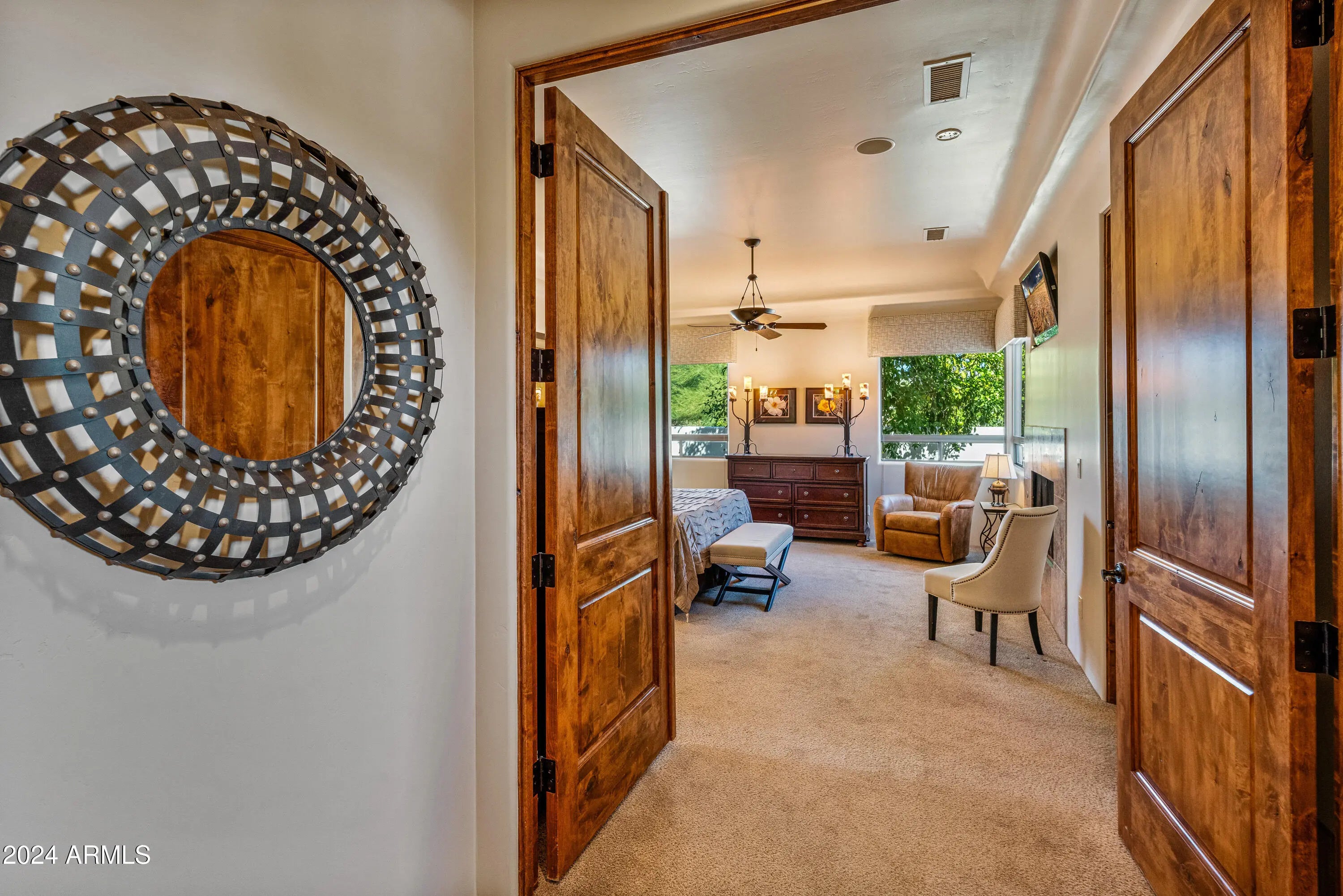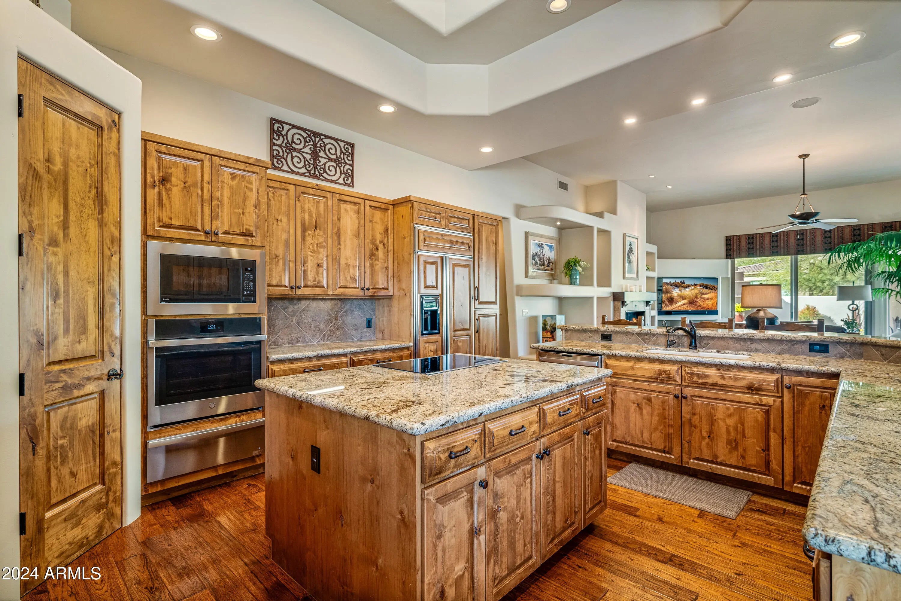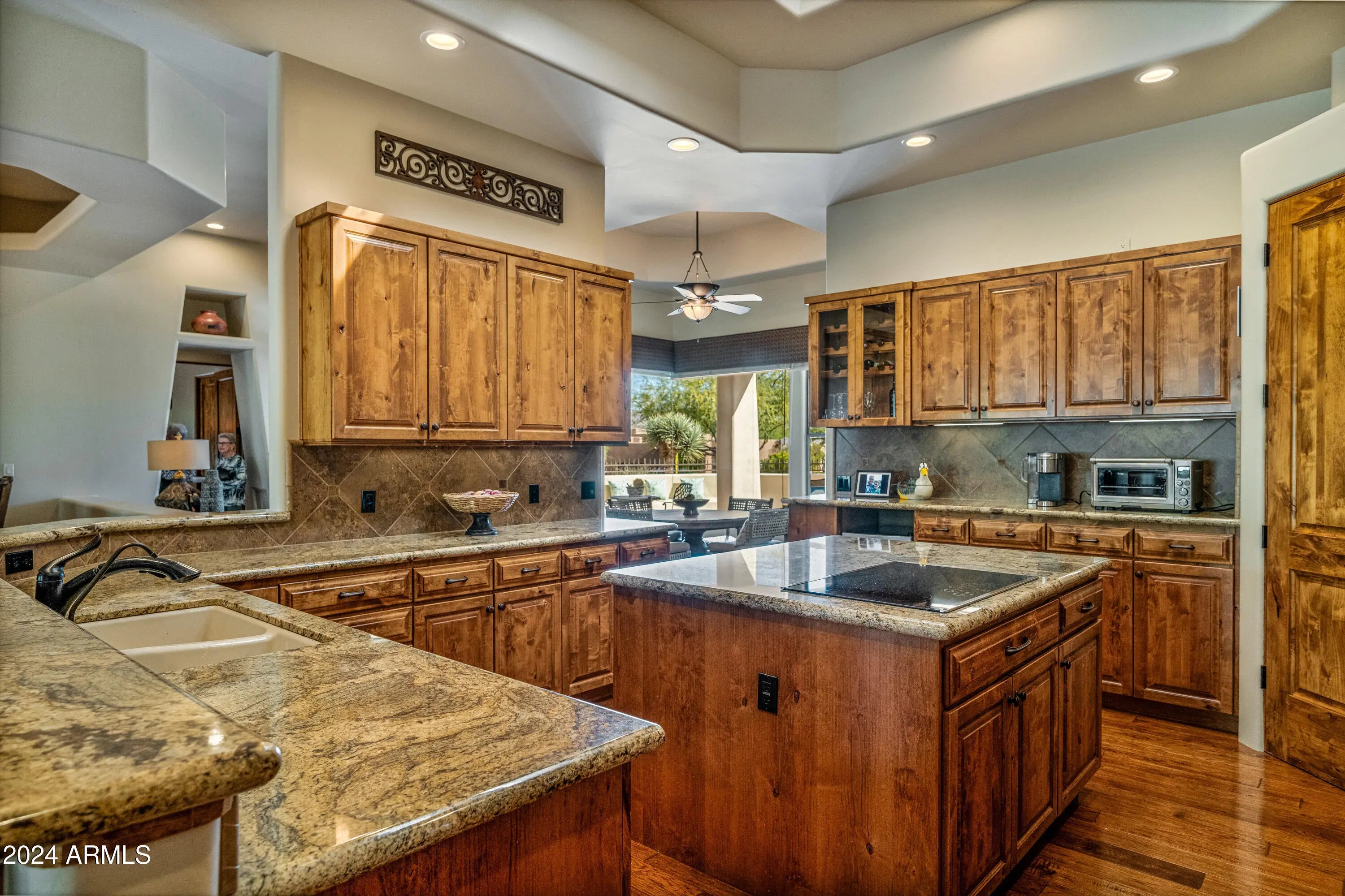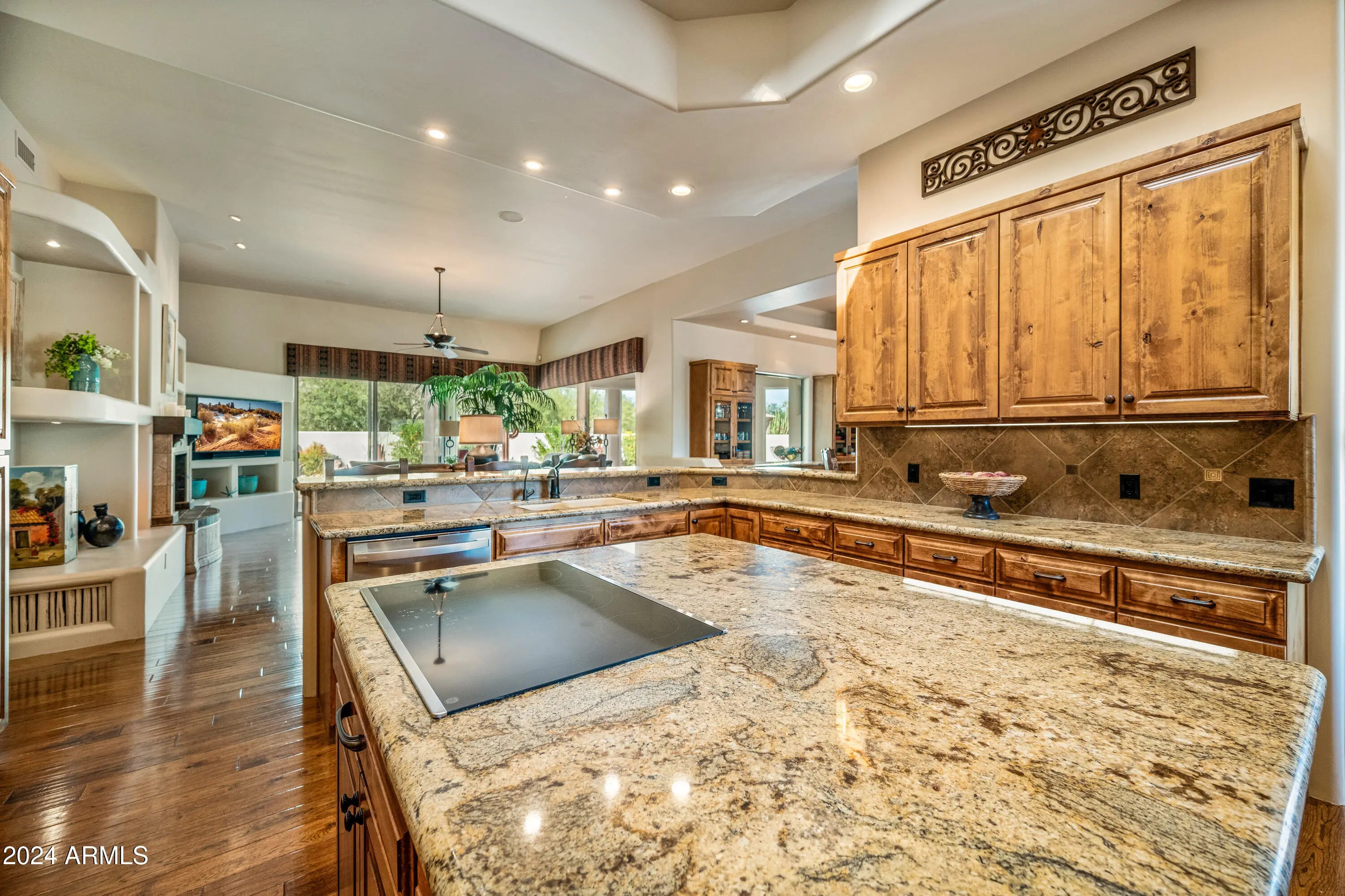 Quality home, meticulously cared for in gated Tonto Verde. RStarting with the beautiful white exterior, a gated front courtyard with mountain views, then enter this warm designer home with gorgeous wood floors and elegant smooth skim coating on the cream colored walls. The kitchen has all new appliances. The dining room has a custom light fixture to illuminate the magnificent round table that will be included with the purchase. The primary bedroom is oversized with its own fireplace and extra bonus room for exercise, sewing or office.The 2nd bedroom is so large it could be considered a second primary suite. The 3rd bedroom is set up as an office with could be a bedroom with a nice walk-in closet.The backyard is a resort with a private pool & spa and the 3 1/2 car garage with epoxy surface
