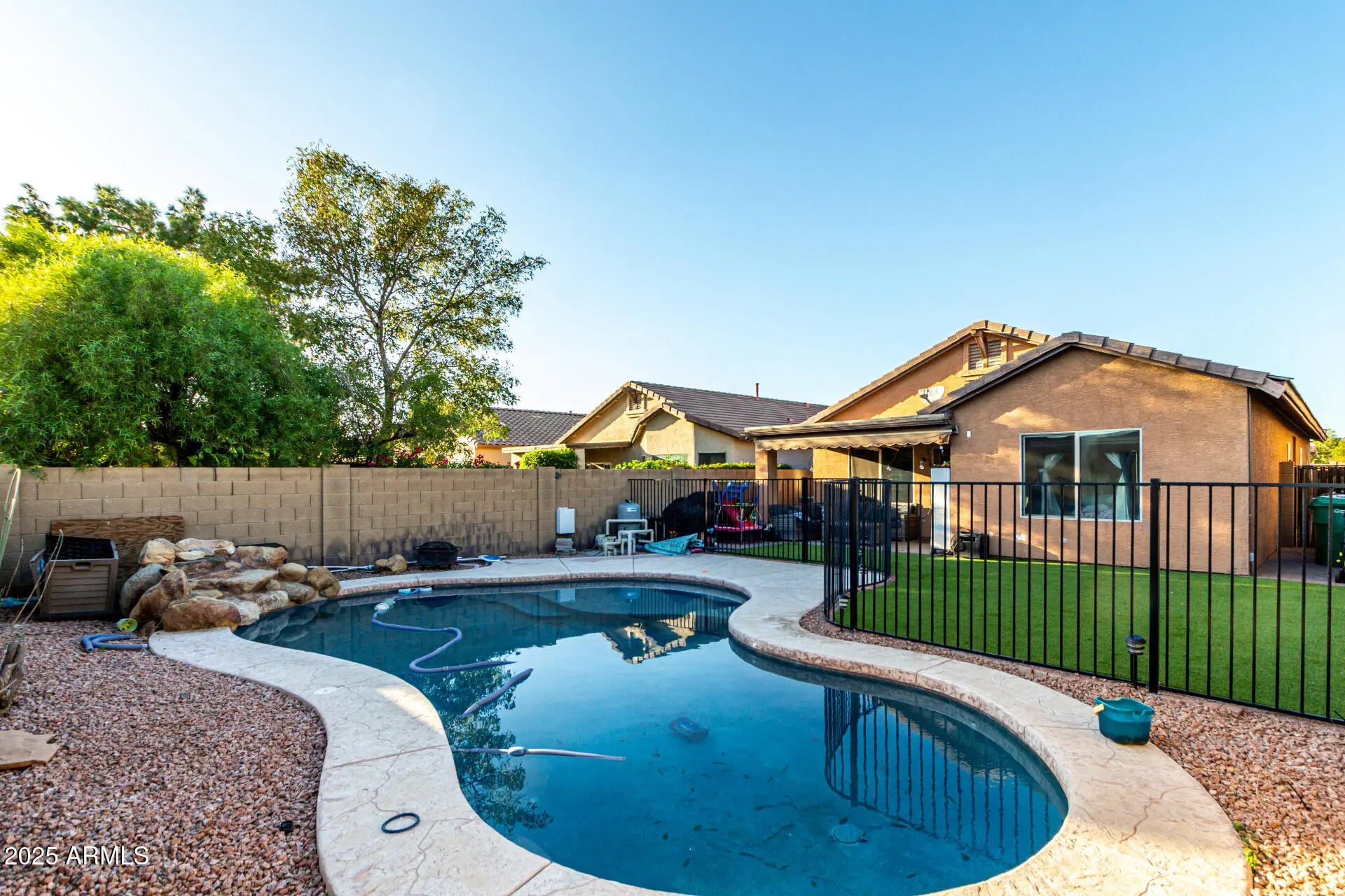 Fantastic opportunity to own this attractive 4-bedroom home in Apache Manor! Discover an inviting living room with high ceilings, a soothing palette, blinds, and soft carpeting for added comfort. The eat-in kitchen features ample wood cabinetry, recessed lighting, stainless steel appliances, a handy pantry, and a peninsula with a breakfast bar for casual dining. The cozy primary bedroom includes an ensuite with double sinks and a walk-in closet for keeping an organized wardrobe. Spend enchanting evenings in the lovely backyard, which offers a covered patio, pristine artificial turf, and a fenced pool for refreshing dips on hot summer days. Conveniently located close to restaurants and shopping options. Don't miss out on this incredible gem!