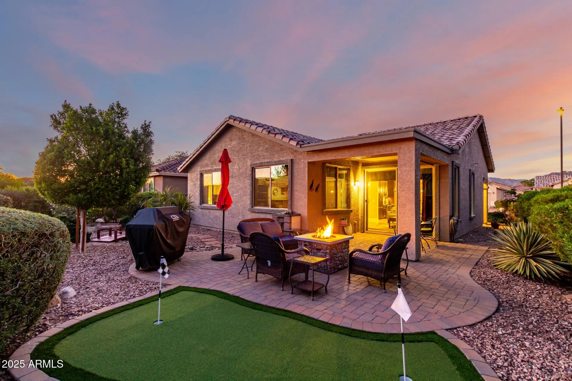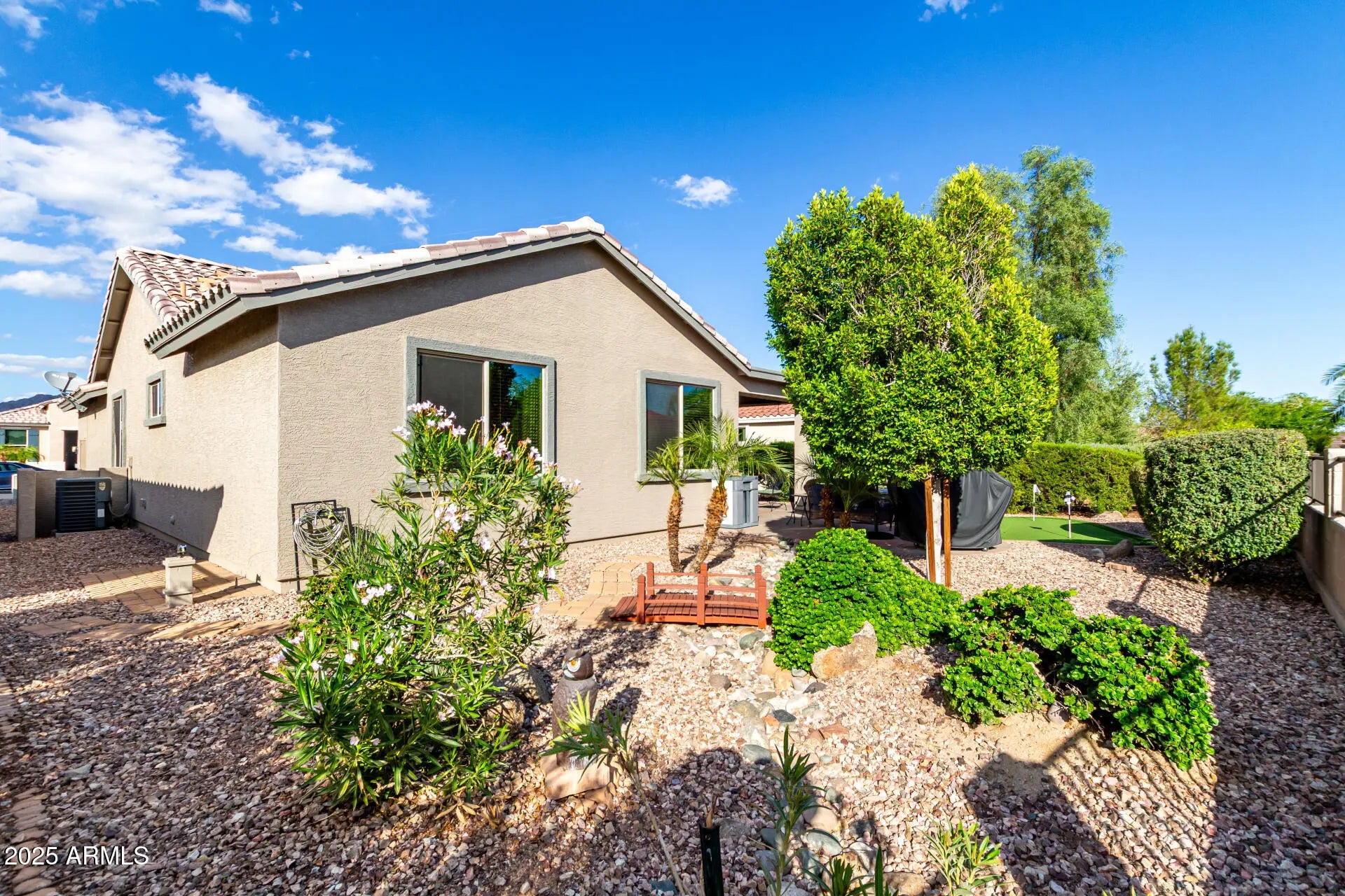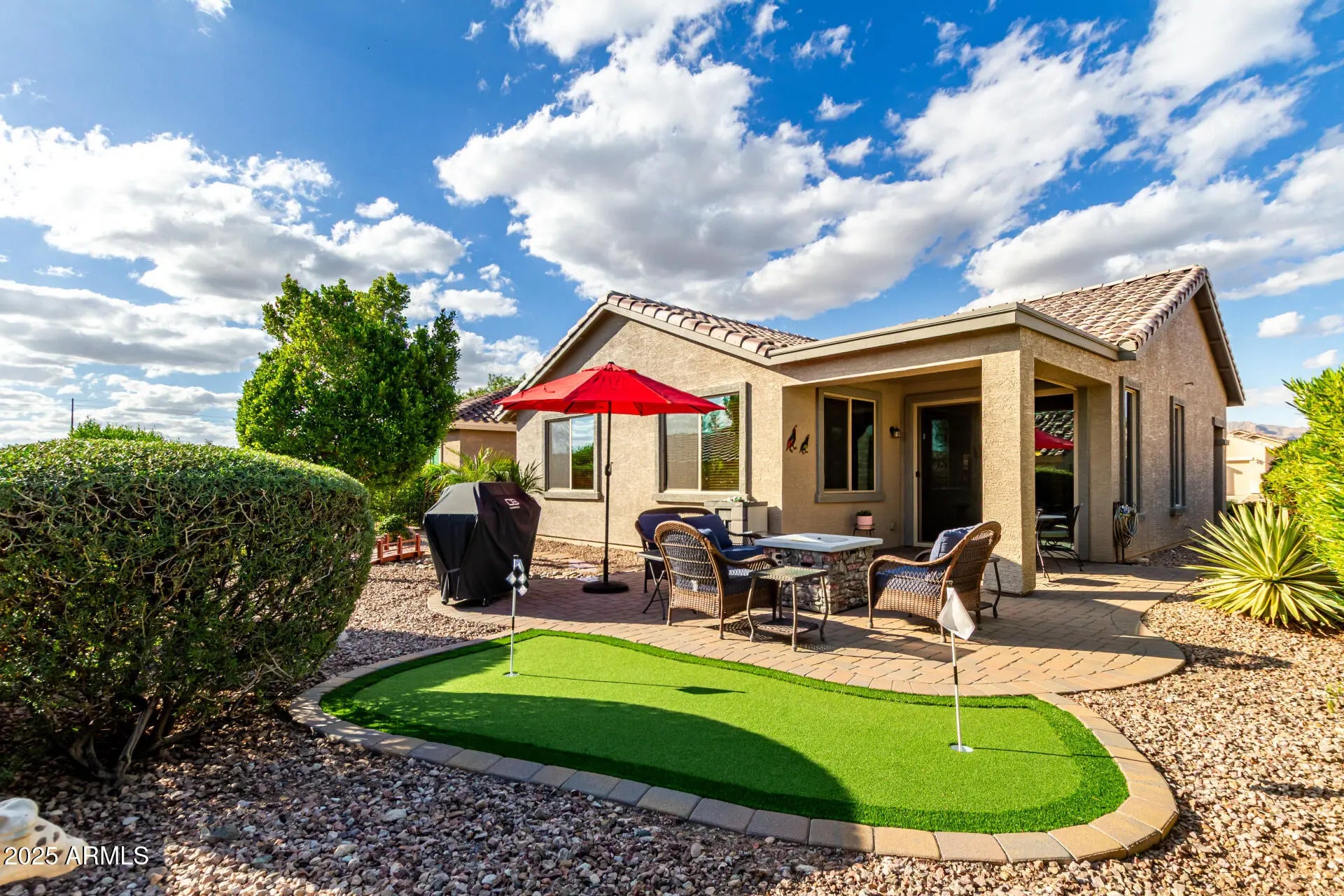 Welcome to Sundance 55+ in peaceful Buckeye—where life feels like vacation with a golf cart instead of a suitcase. This single-level gem sits on a premium lot so private no one can look in your backyard without a creepy effort. Enjoy open living with tile floors, natural light, & a granite kitchen with Cherrywood cabinets, SS appliances, & a breakfast bar perfect for morning coffee or evening laughs. The split primary suite offers dual sinks, step-in shower, & walk-in closet. A versatile den fits work or play. Outside, relax on the covered patio with pavers, putting green, & desert landscaping. Offered turnkey—lock, stock, & barrel, with all interior contents, outdoor furniture, & BBQ or not - Buyer's choice :). Enjoy golf, clubhouse, pool, heated spa, fitness center, restaurant & FUN!