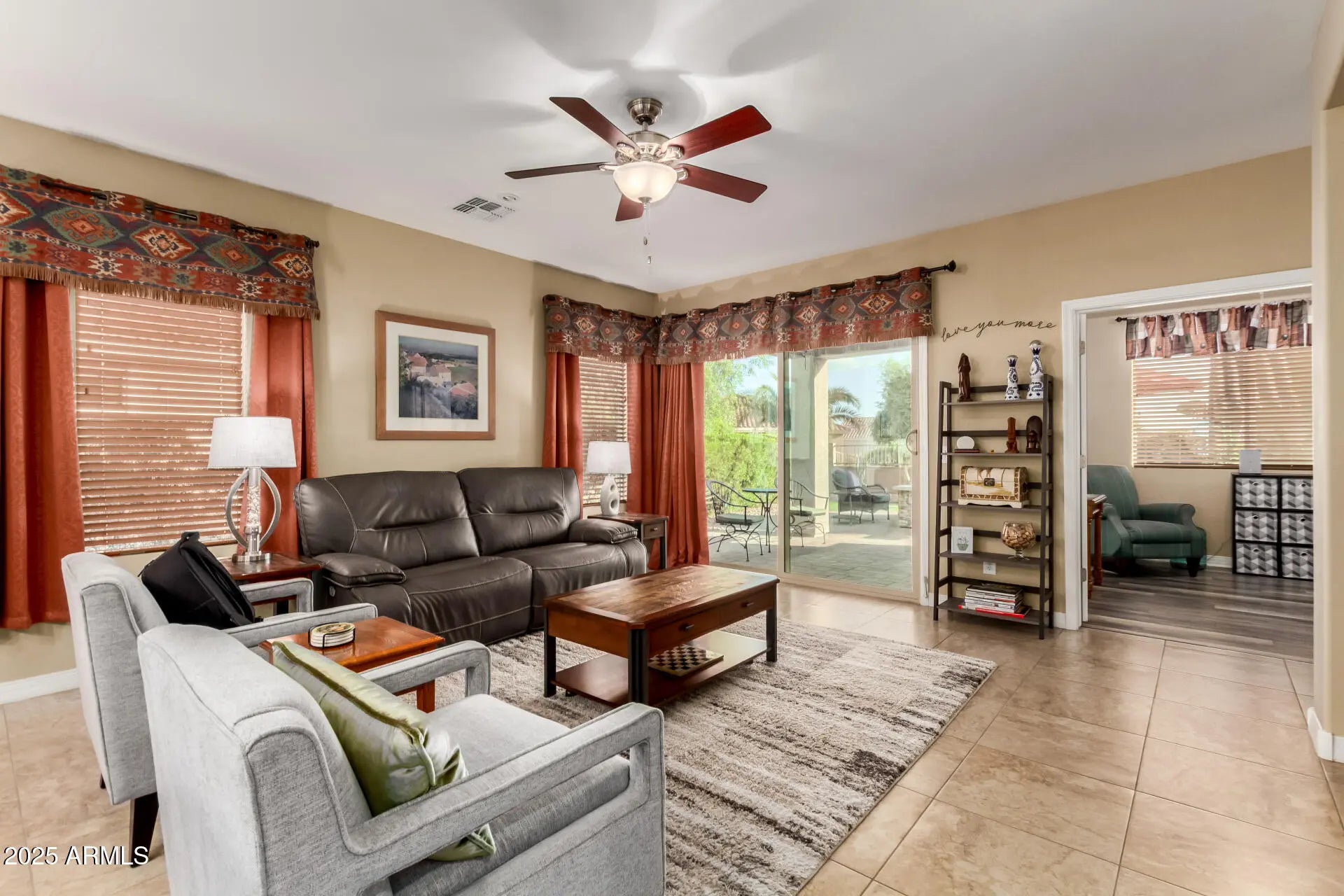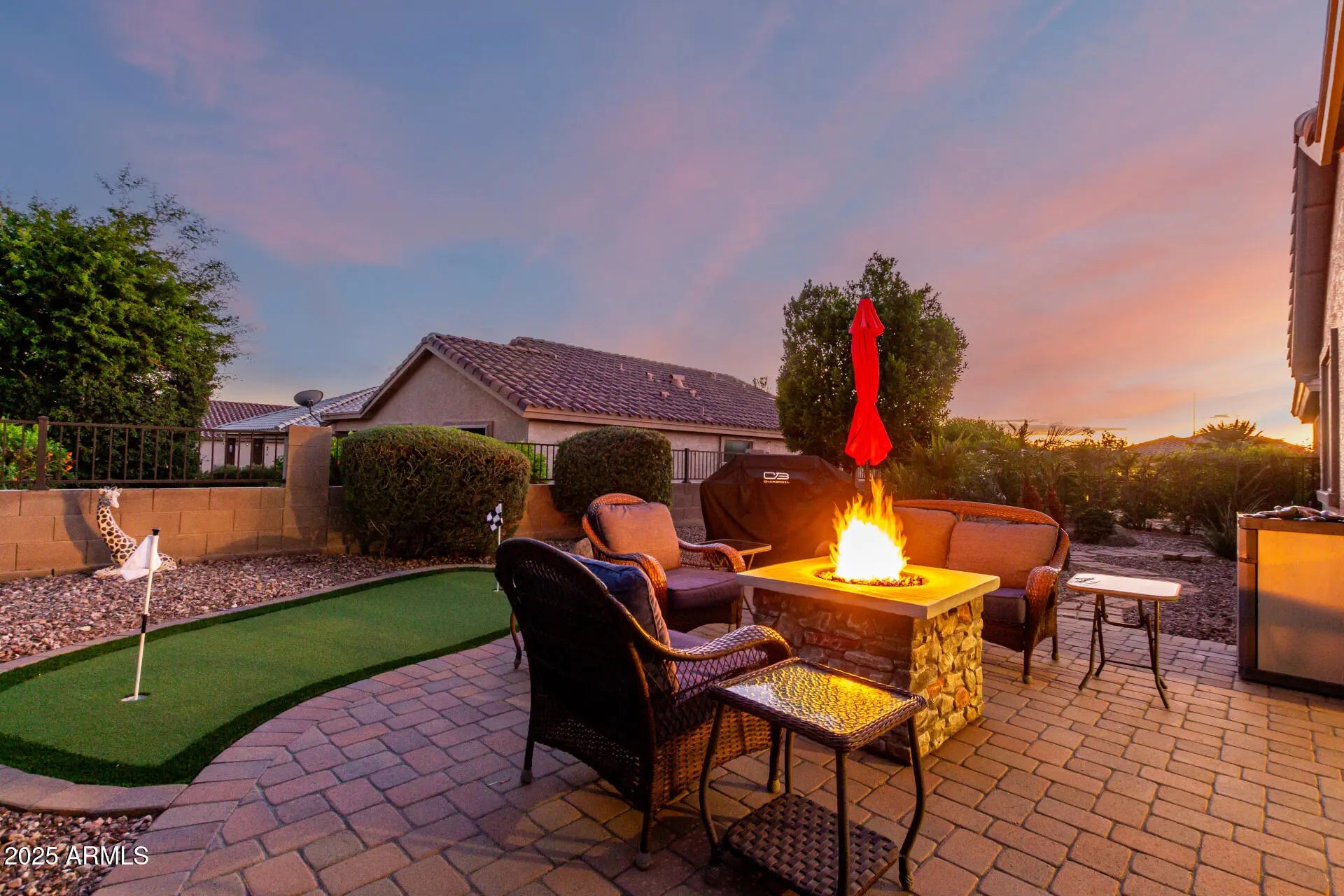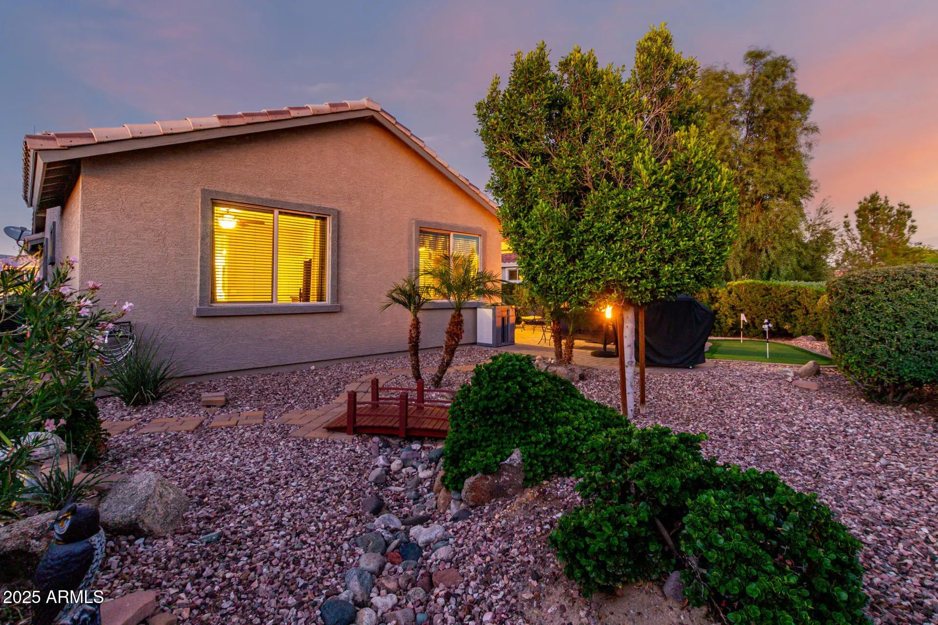 Welcome to Sundance 55+ in peaceful Buckeye—where life feels like vacation with a golf cart instead of a suitcase. This single-level gem sits on a premium lot so private no one can look in your backyard without a creepy effort. Enjoy open living with tile floors, natural light, & a granite kitchen with Cherrywood cabinets, SS appliances, & a breakfast bar perfect for morning coffee or evening laughs. The split primary suite offers dual sinks, step-in shower, & walk-in closet. A versatile den fits work or play. Outside, relax on the covered patio with pavers, putting green, & desert landscaping. Offered turnkey—lock, stock, & barrel, with all interior contents, outdoor furniture, & BBQ or not - Buyer's choice :). Enjoy golf, clubhouse, pool, heated spa, fitness center, restaurant & FUN!