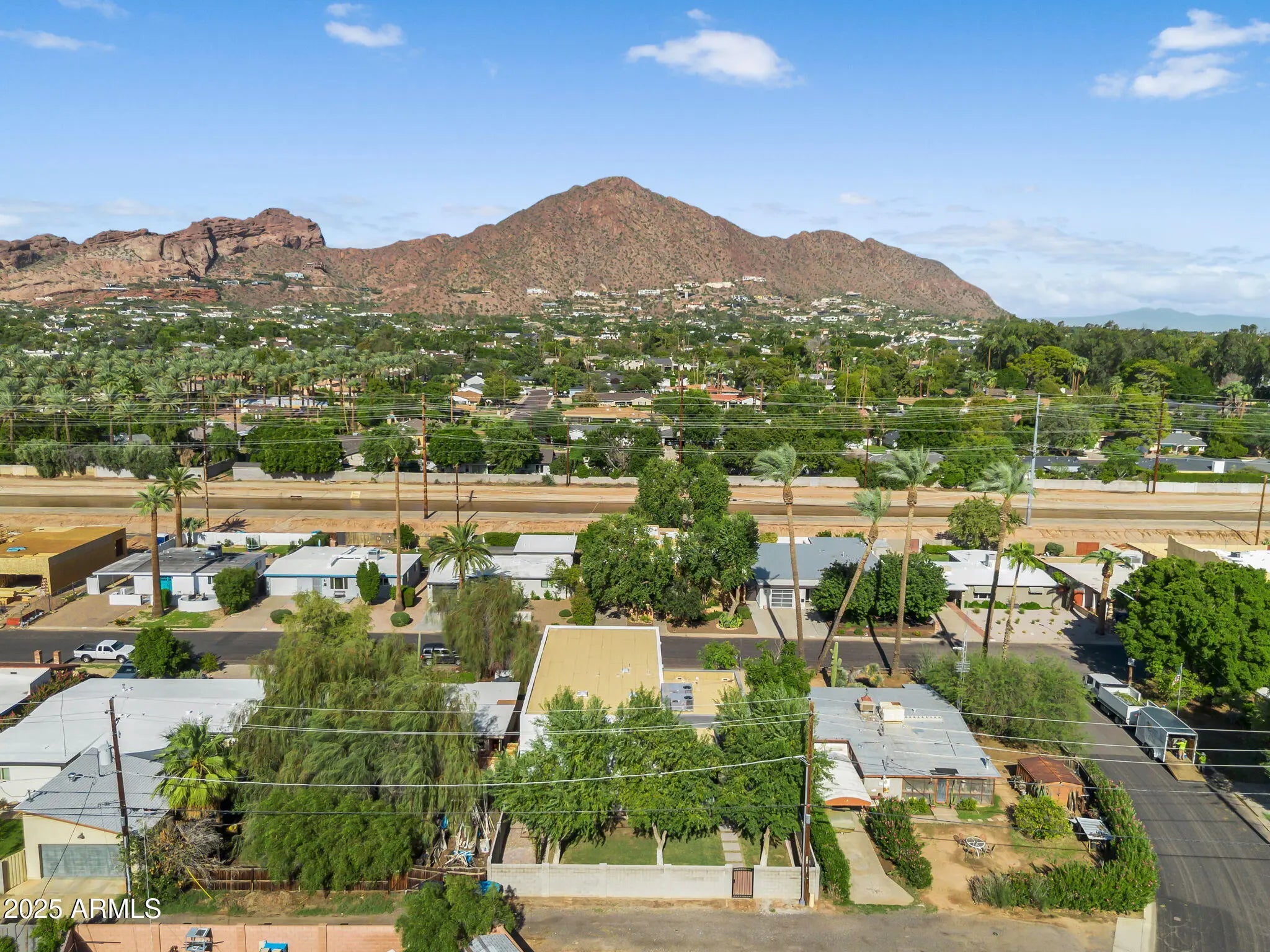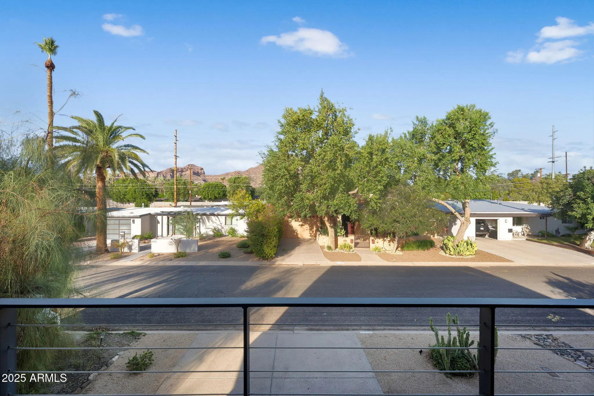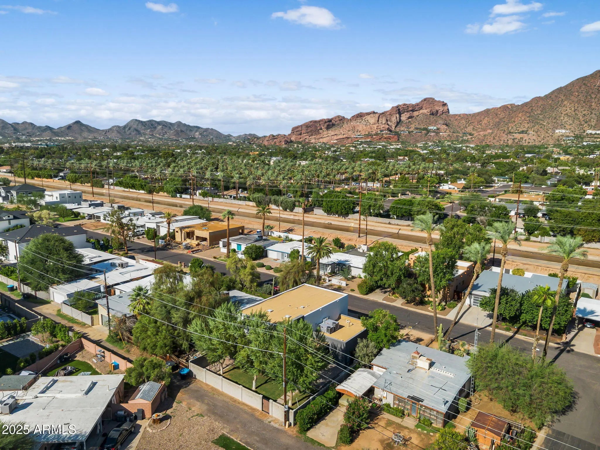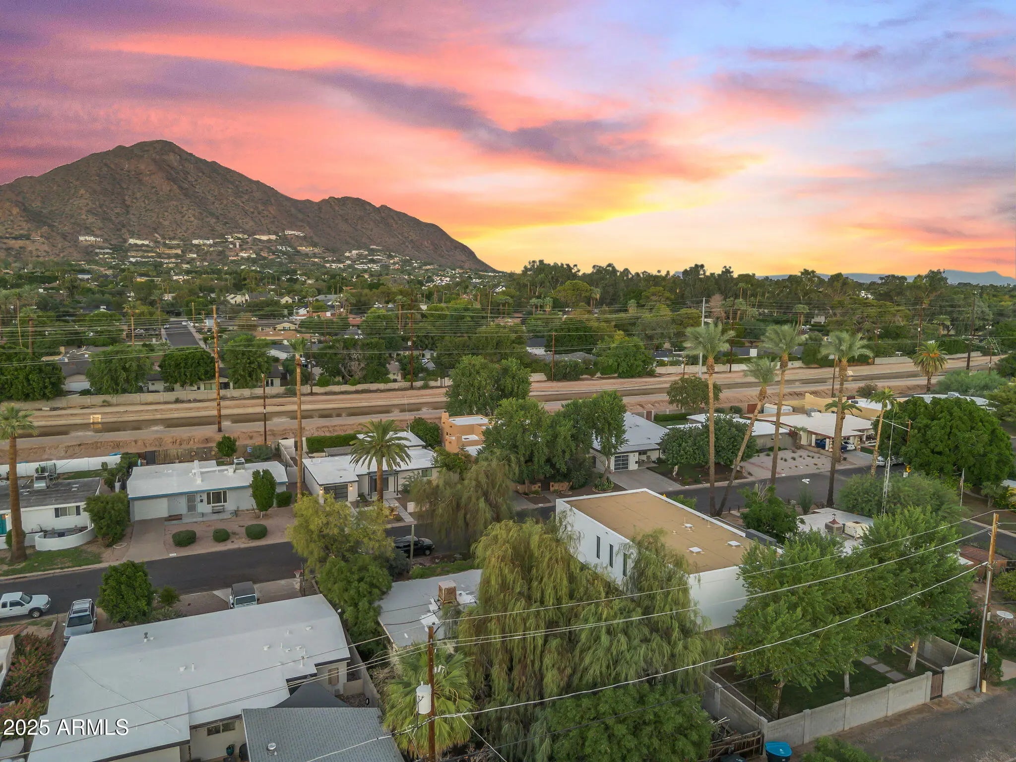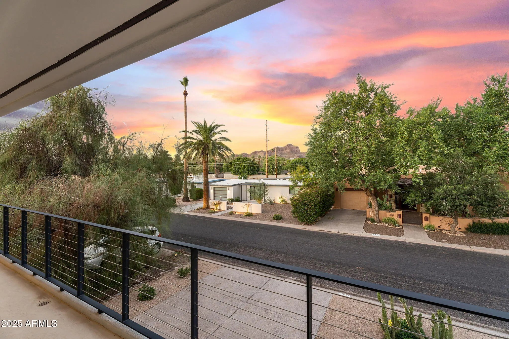 Stunning and rare view of Camelback from full-length front balcony of this state-of-the-art tech forward 2021 Arcadia rebuild. Aesthetic + Function + Comfort. Custom architecture utilizes the orientation of the lot to create maximum shade in the outdoor spaces, & design elements like multiple skylights to provide ample natural light inside. Every detail was meticulously chosen to suit the space and support energy efficiency. Soaring ceilings, custom staircase, gourmet kitchen with Bosch smart appliances, motorized blinds, tankless gas water heater, Caesarstone counters, soaking tub, stackable sliding glass doors, abundant lighting, canal adjacent. This home showcases quality construction, top of the line products, and optimal use of space to offer a unique luxury Arcadia living experience " 2,326 sq ft / 6,000 sq ft lot fully rebuilt in 2021 " 3 bedrooms / 2 bathrooms with split floor plan " Custom wood-block staircase, vaulted ceilings, exposed brick accents, and skylights in great room and primary bath " Gourmet quartz kitchen with Bosch smart appliances, oversized island, and custom cabinetry (incl. roll-up "garage-door" cabinet) Upstairs loft + primary suite open to full-length balcony with Camelback Mountain views " Primary suite features two walk-in closets and spa-style bath with quartz counters, walk-in shower, dual vanities, and bidet toilet " Downstairs: two bedrooms + oversized soaking tub bath; one bedroom with private patio access " Outdoor living: covered patio with gas fireplace, multiple shaded patios, private backyard with lawn, trees, and 6' privacy wall Smart features: recessed dimmable lighting, motorized blinds, Wi-Fi fans, Ring alarm + wiring for cameras, Ethernet/TV jacks in every room, centralized fiber hub " Dual industrial HVAC, tankless water heater, whole-home filtration " 2-car attached garage with smart opener, and Ethernet port Arcadia location walkable to restaurants, shops, grocery; minutes to Scottsdale, Phoenix, Camelback Mountain trails, and Arcadia High / SUSD schools