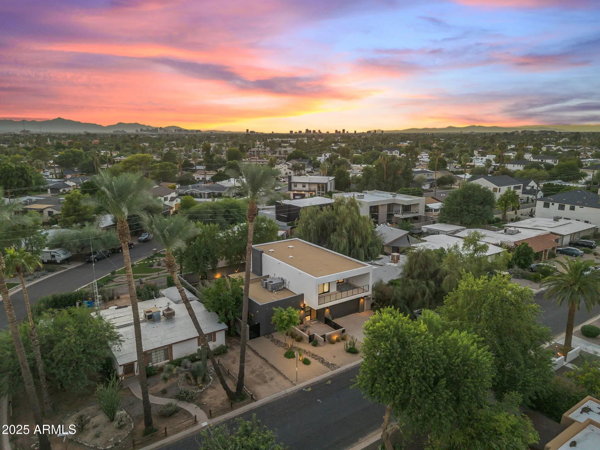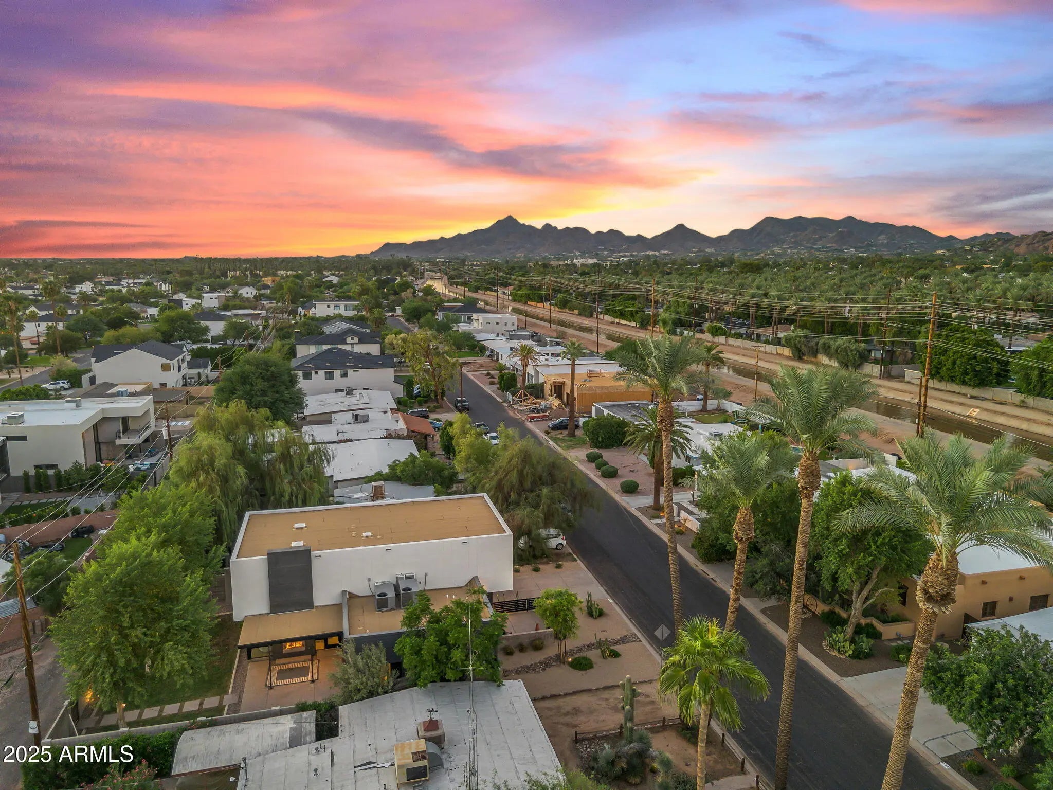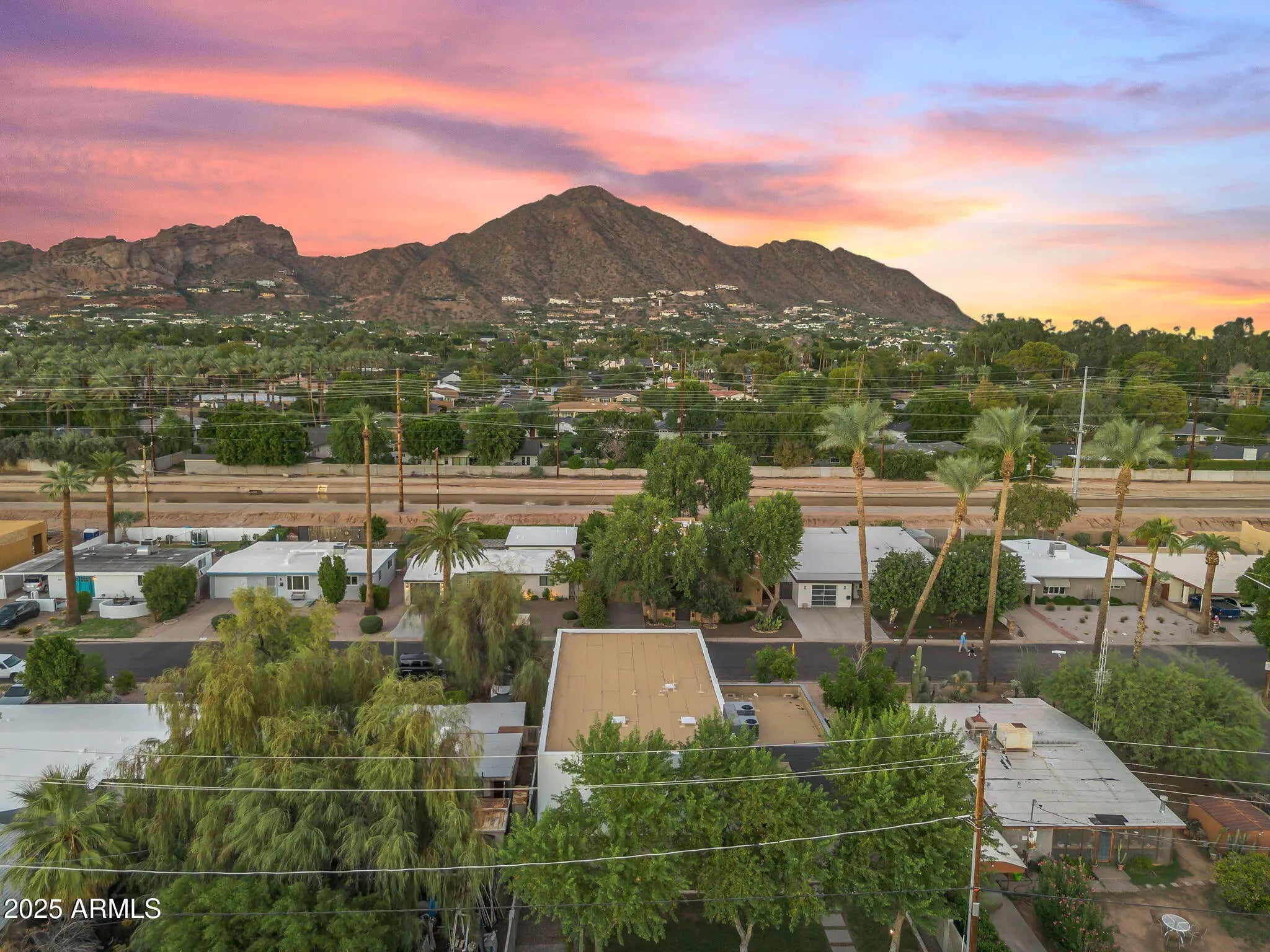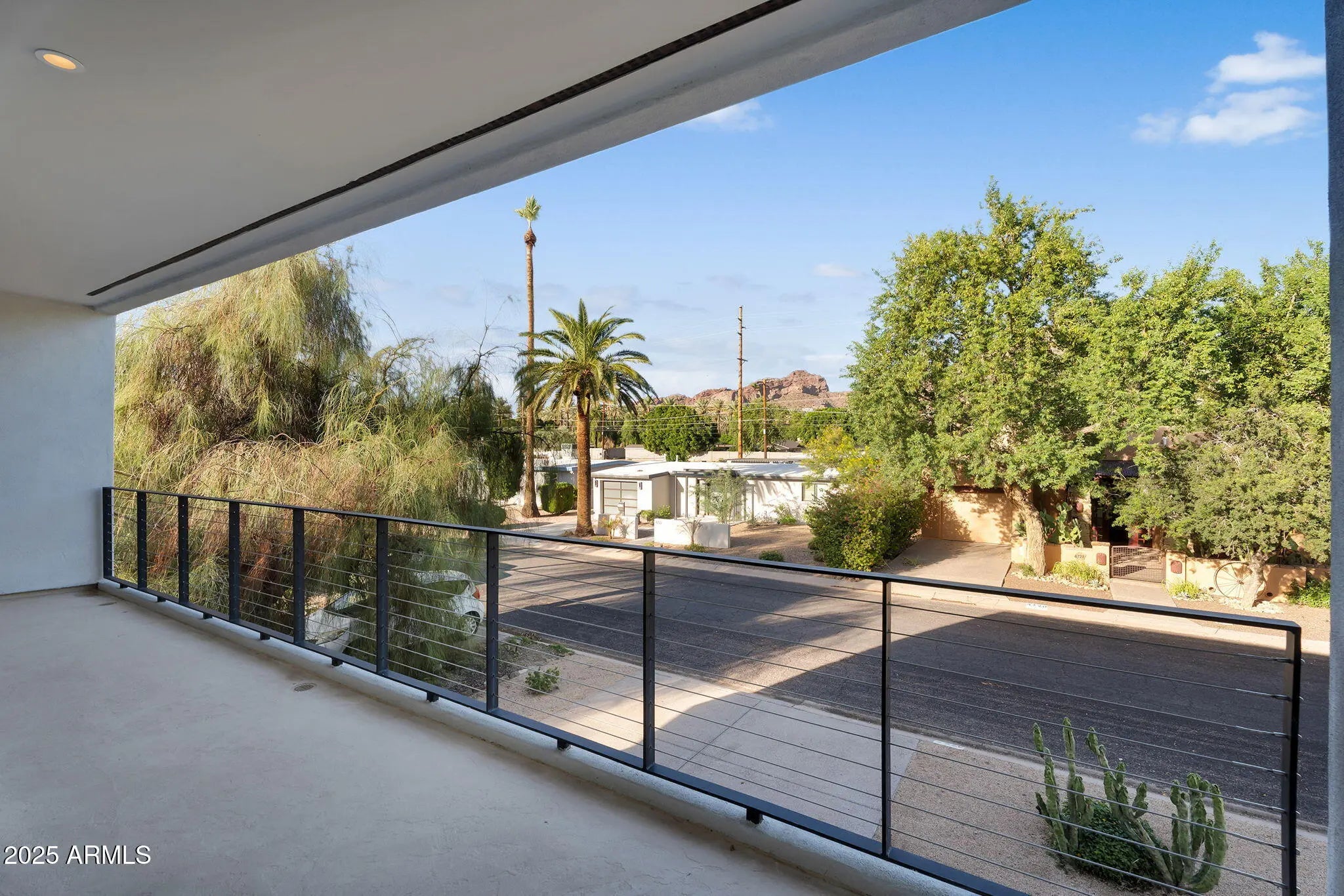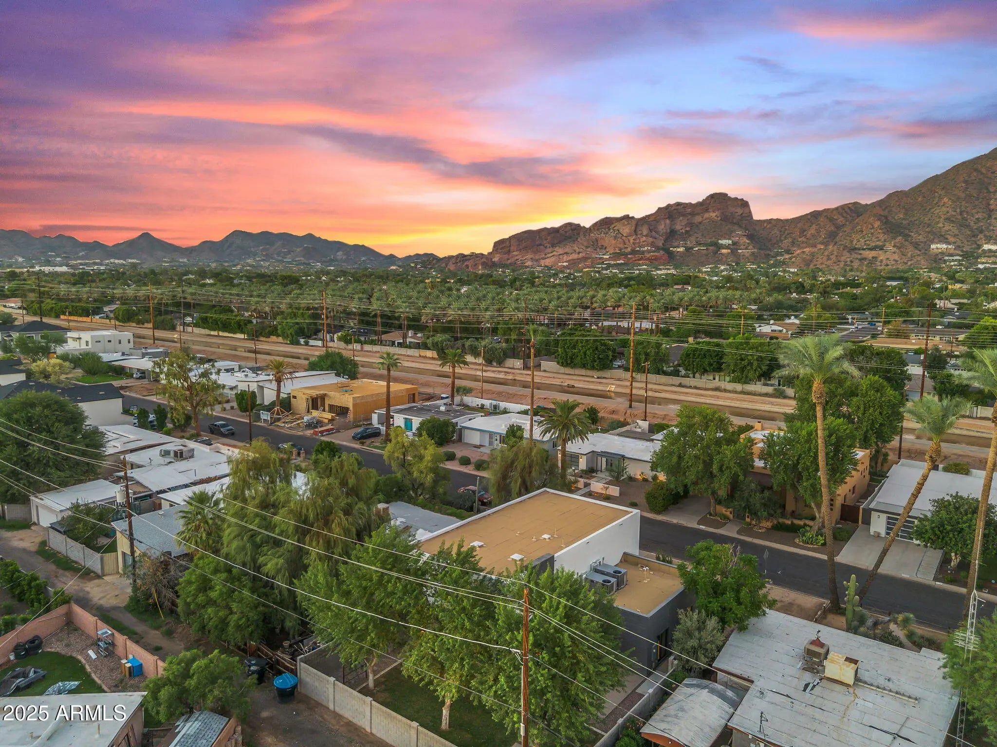 Stunning and rare view of Camelback from full-length front balcony of this state-of-the-art tech forward 2021 Arcadia rebuild. Aesthetic + Function + Comfort. Custom architecture utilizes the orientation of the lot to create maximum shade in the outdoor spaces, & design elements like multiple skylights to provide ample natural light inside. Every detail was meticulously chosen to suit the space and support energy efficiency. Soaring ceilings, custom staircase, gourmet kitchen with Bosch smart appliances, motorized blinds, tankless gas water heater, Caesarstone counters, soaking tub, stackable sliding glass doors, abundant lighting, canal adjacent. This home showcases quality construction, top of the line products, and optimal use of space to offer a unique luxury Arcadia living experience " 2,326 sq ft / 6,000 sq ft lot fully rebuilt in 2021 " 3 bedrooms / 2 bathrooms with split floor plan " Custom wood-block staircase, vaulted ceilings, exposed brick accents, and skylights in great room and primary bath " Gourmet quartz kitchen with Bosch smart appliances, oversized island, and custom cabinetry (incl. roll-up "garage-door" cabinet) Upstairs loft + primary suite open to full-length balcony with Camelback Mountain views " Primary suite features two walk-in closets and spa-style bath with quartz counters, walk-in shower, dual vanities, and bidet toilet " Downstairs: two bedrooms + oversized soaking tub bath; one bedroom with private patio access " Outdoor living: covered patio with gas fireplace, multiple shaded patios, private backyard with lawn, trees, and 6' privacy wall Smart features: recessed dimmable lighting, motorized blinds, Wi-Fi fans, Ring alarm + wiring for cameras, Ethernet/TV jacks in every room, centralized fiber hub " Dual industrial HVAC, tankless water heater, whole-home filtration " 2-car attached garage with smart opener, and Ethernet port Arcadia location walkable to restaurants, shops, grocery; minutes to Scottsdale, Phoenix, Camelback Mountain trails, and Arcadia High / SUSD schools