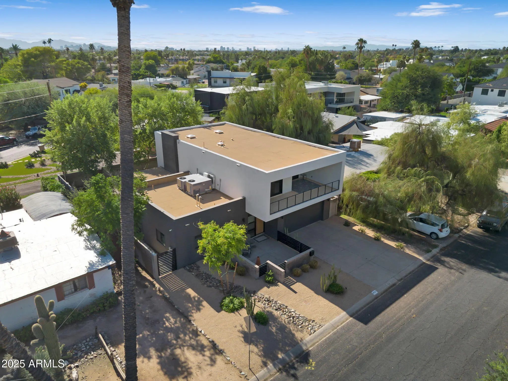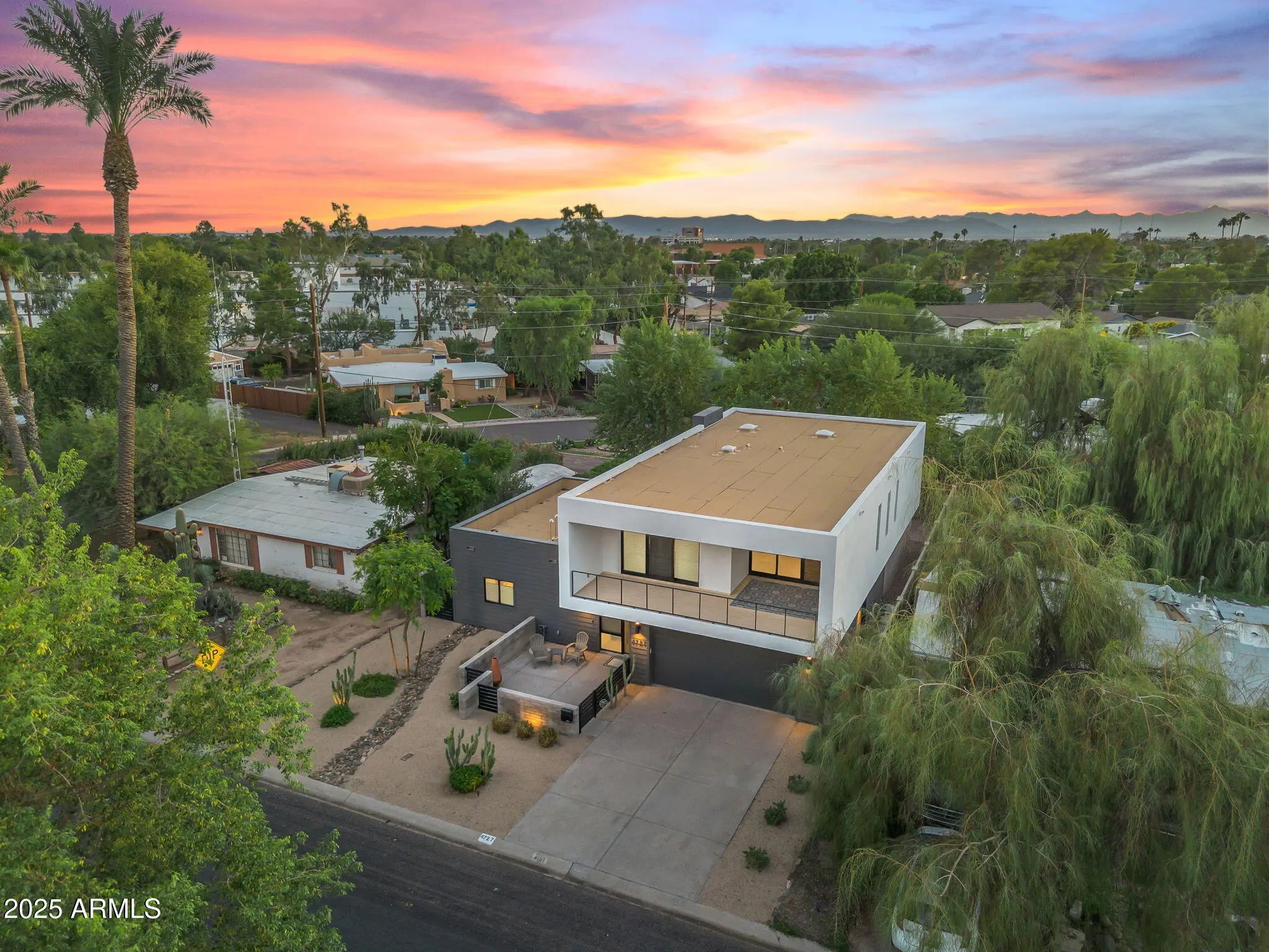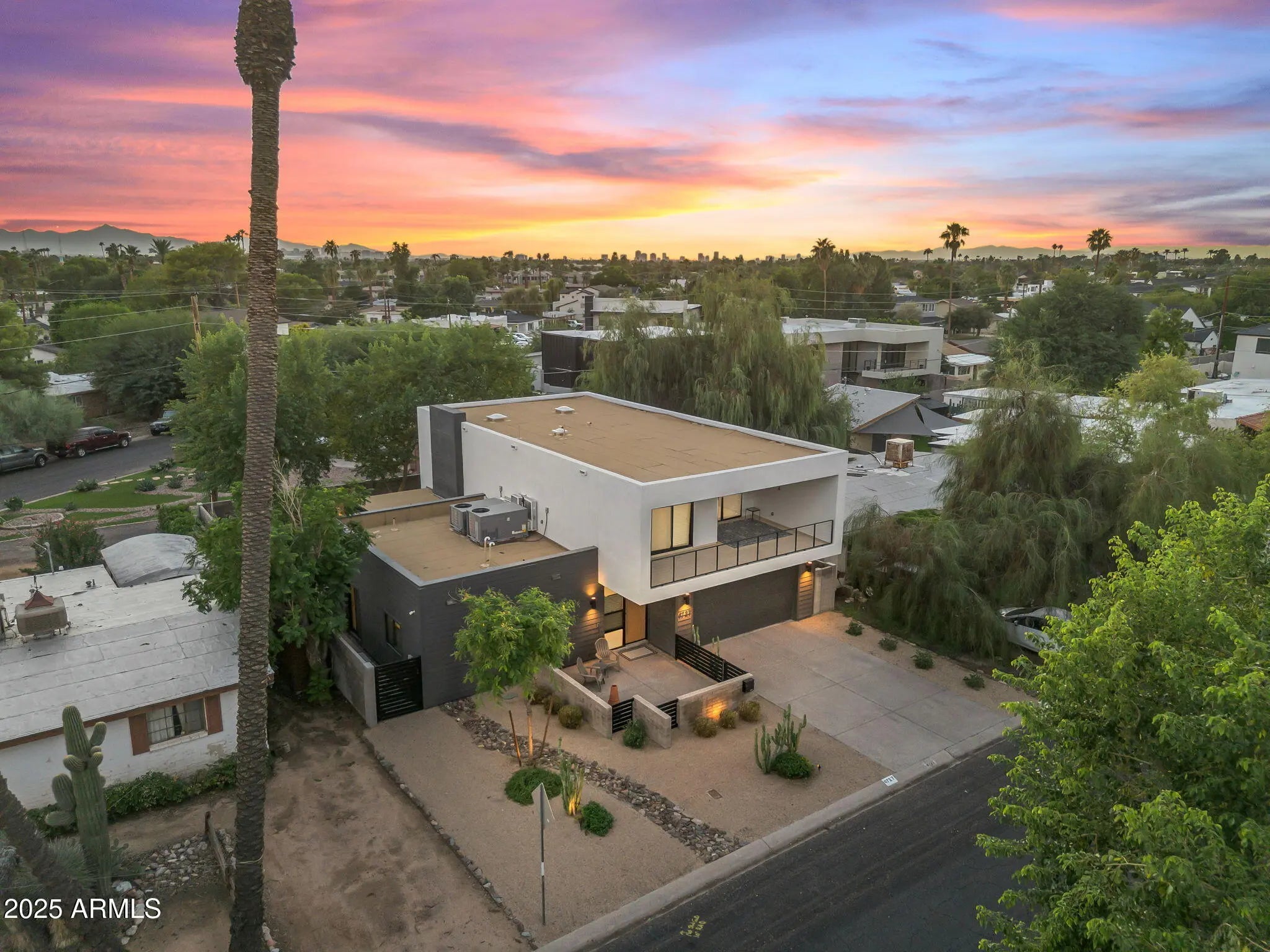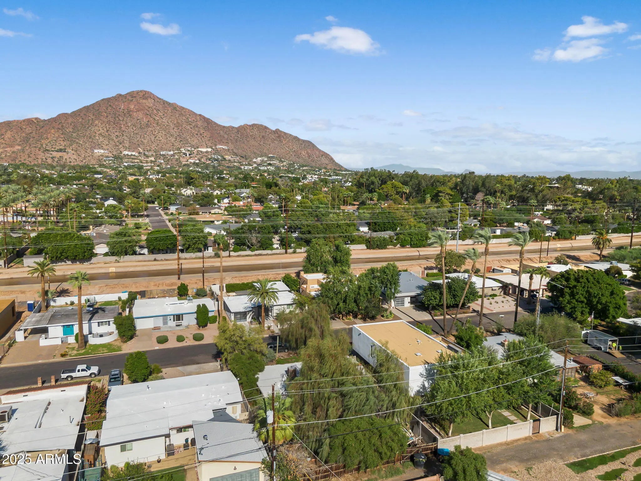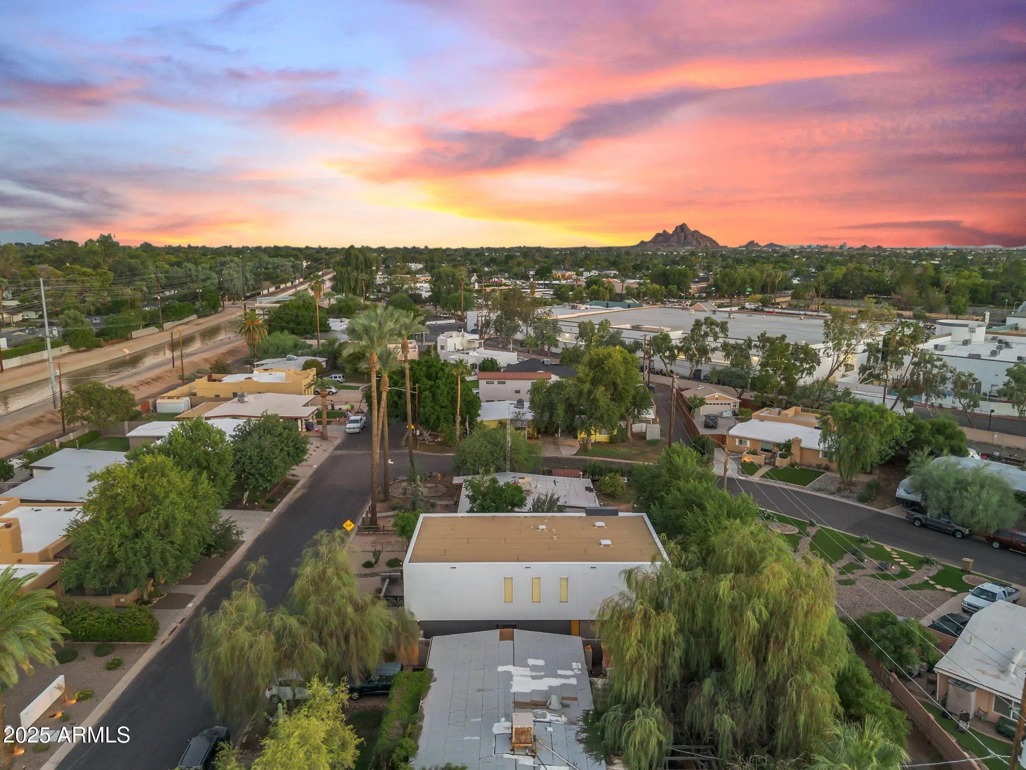 Stunning and rare view of Camelback from full-length front balcony of this state-of-the-art tech forward 2021 Arcadia rebuild. Aesthetic + Function + Comfort. Custom architecture utilizes the orientation of the lot to create maximum shade in the outdoor spaces, & design elements like multiple skylights to provide ample natural light inside. Every detail was meticulously chosen to suit the space and support energy efficiency. Soaring ceilings, custom staircase, gourmet kitchen with Bosch smart appliances, motorized blinds, tankless gas water heater, Caesarstone counters, soaking tub, stackable sliding glass doors, abundant lighting, canal adjacent. This home showcases quality construction, top of the line products, and optimal use of space to offer a unique luxury Arcadia living experience " 2,326 sq ft / 6,000 sq ft lot fully rebuilt in 2021 " 3 bedrooms / 2 bathrooms with split floor plan " Custom wood-block staircase, vaulted ceilings, exposed brick accents, and skylights in great room and primary bath " Gourmet quartz kitchen with Bosch smart appliances, oversized island, and custom cabinetry (incl. roll-up "garage-door" cabinet) Upstairs loft + primary suite open to full-length balcony with Camelback Mountain views " Primary suite features two walk-in closets and spa-style bath with quartz counters, walk-in shower, dual vanities, and bidet toilet " Downstairs: two bedrooms + oversized soaking tub bath; one bedroom with private patio access " Outdoor living: covered patio with gas fireplace, multiple shaded patios, private backyard with lawn, trees, and 6' privacy wall Smart features: recessed dimmable lighting, motorized blinds, Wi-Fi fans, Ring alarm + wiring for cameras, Ethernet/TV jacks in every room, centralized fiber hub " Dual industrial HVAC, tankless water heater, whole-home filtration " 2-car attached garage with smart opener, and Ethernet port Arcadia location walkable to restaurants, shops, grocery; minutes to Scottsdale, Phoenix, Camelback Mountain trails, and Arcadia High / SUSD schools