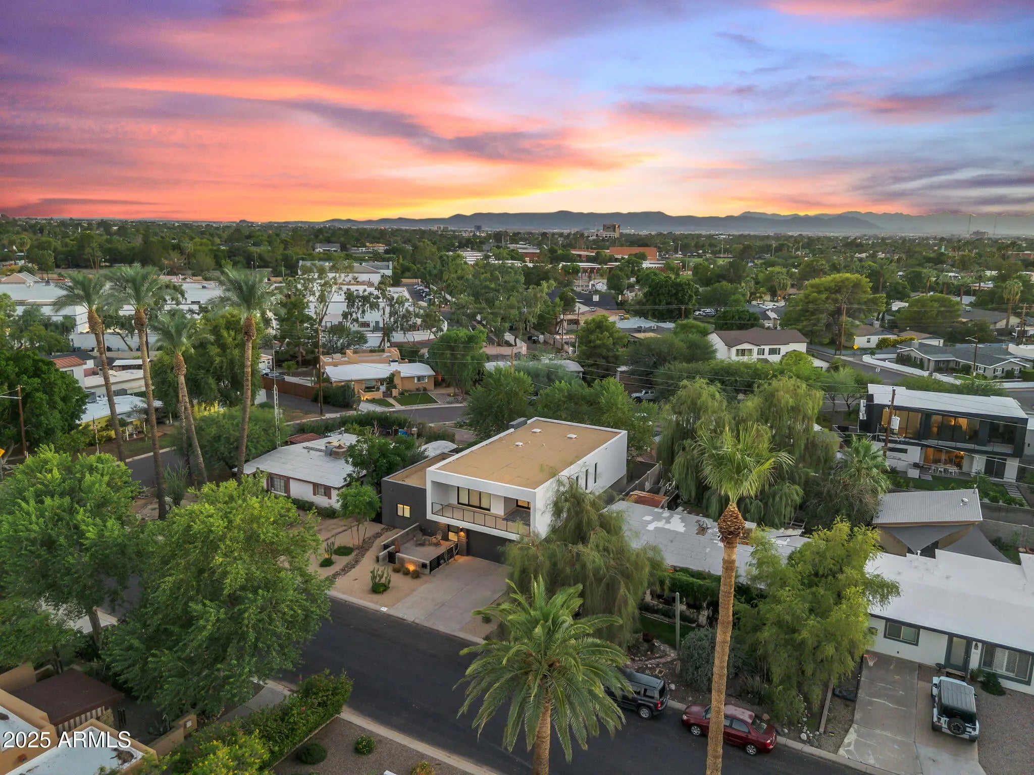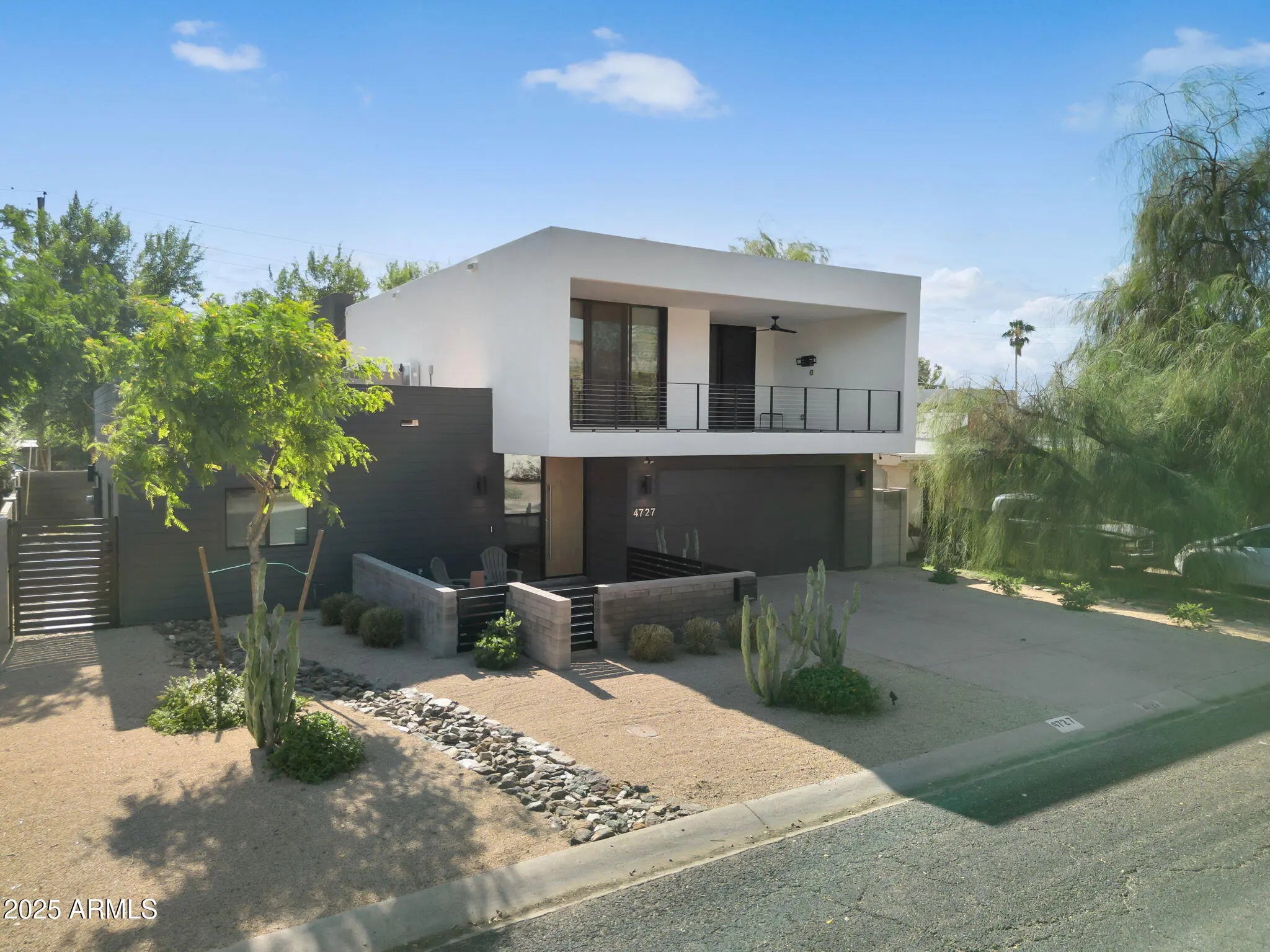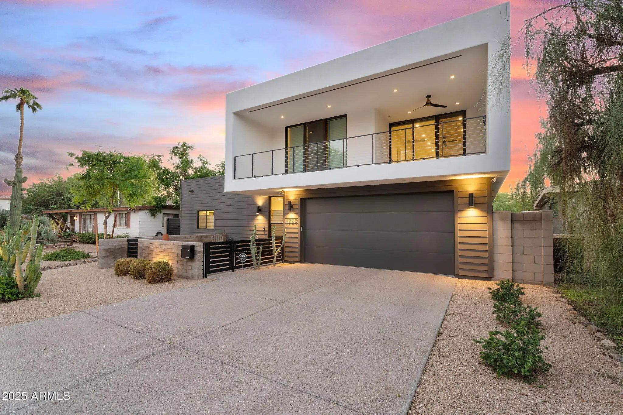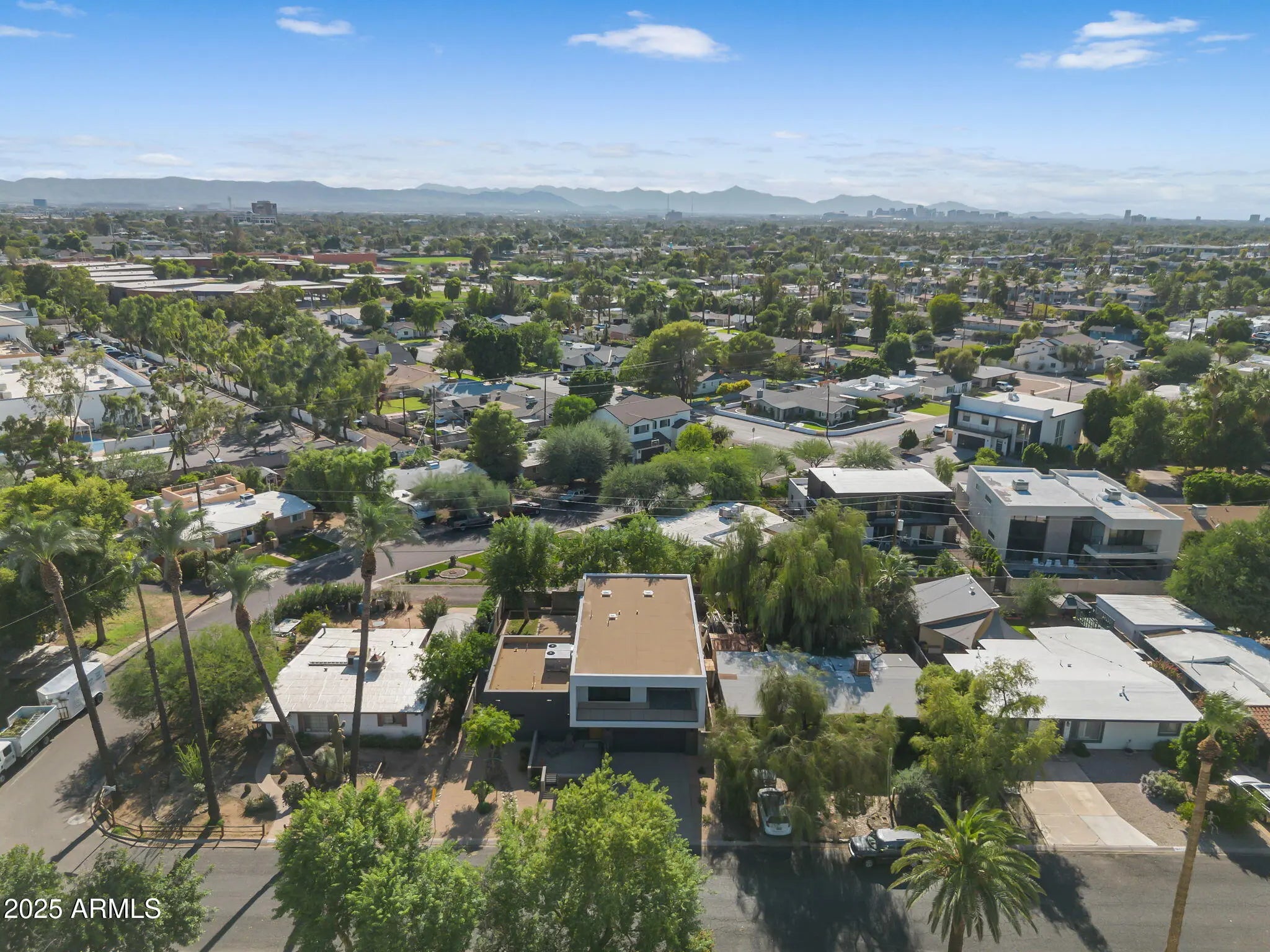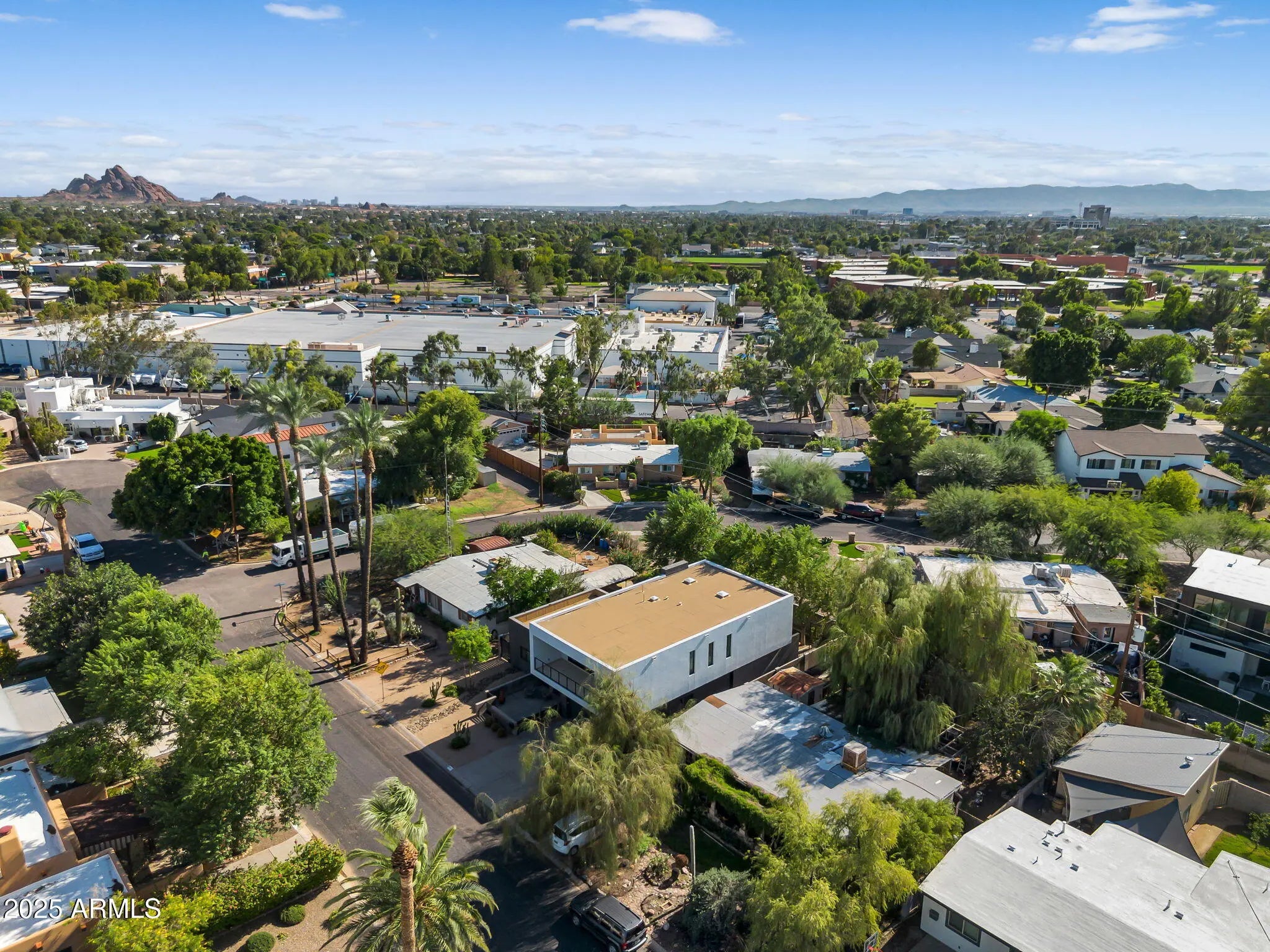 Stunning and rare view of Camelback from full-length front balcony of this state-of-the-art tech forward 2021 Arcadia rebuild. Aesthetic + Function + Comfort. Custom architecture utilizes the orientation of the lot to create maximum shade in the outdoor spaces, & design elements like multiple skylights to provide ample natural light inside. Every detail was meticulously chosen to suit the space and support energy efficiency. Soaring ceilings, custom staircase, gourmet kitchen with Bosch smart appliances, motorized blinds, tankless gas water heater, Caesarstone counters, soaking tub, stackable sliding glass doors, abundant lighting, canal adjacent. This home showcases quality construction, top of the line products, and optimal use of space to offer a unique luxury Arcadia living experience " 2,326 sq ft / 6,000 sq ft lot fully rebuilt in 2021 " 3 bedrooms / 2 bathrooms with split floor plan " Custom wood-block staircase, vaulted ceilings, exposed brick accents, and skylights in great room and primary bath " Gourmet quartz kitchen with Bosch smart appliances, oversized island, and custom cabinetry (incl. roll-up "garage-door" cabinet) Upstairs loft + primary suite open to full-length balcony with Camelback Mountain views " Primary suite features two walk-in closets and spa-style bath with quartz counters, walk-in shower, dual vanities, and bidet toilet " Downstairs: two bedrooms + oversized soaking tub bath; one bedroom with private patio access " Outdoor living: covered patio with gas fireplace, multiple shaded patios, private backyard with lawn, trees, and 6' privacy wall Smart features: recessed dimmable lighting, motorized blinds, Wi-Fi fans, Ring alarm + wiring for cameras, Ethernet/TV jacks in every room, centralized fiber hub " Dual industrial HVAC, tankless water heater, whole-home filtration " 2-car attached garage with smart opener, and Ethernet port Arcadia location walkable to restaurants, shops, grocery; minutes to Scottsdale, Phoenix, Camelback Mountain trails, and Arcadia High / SUSD schools