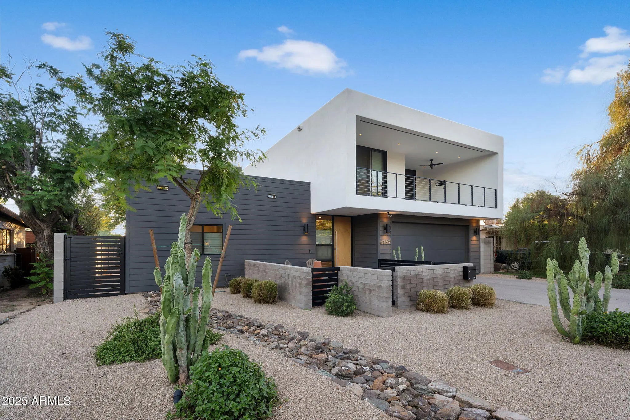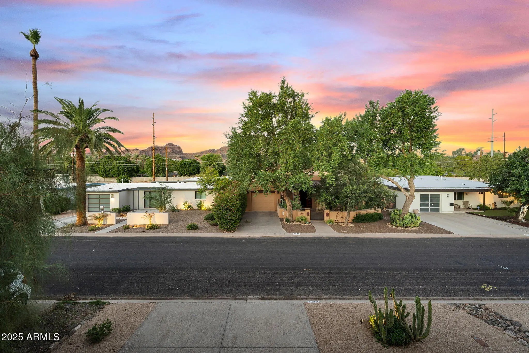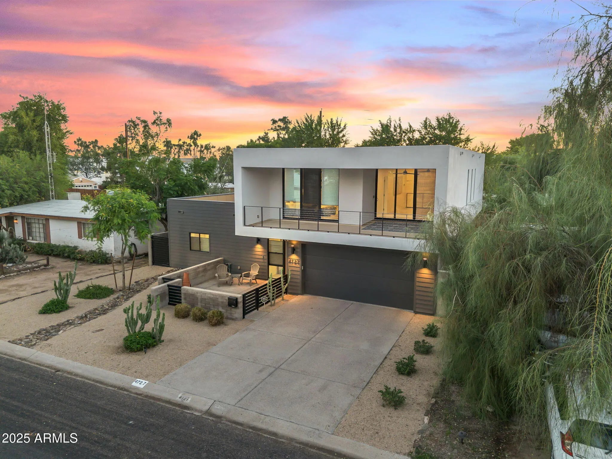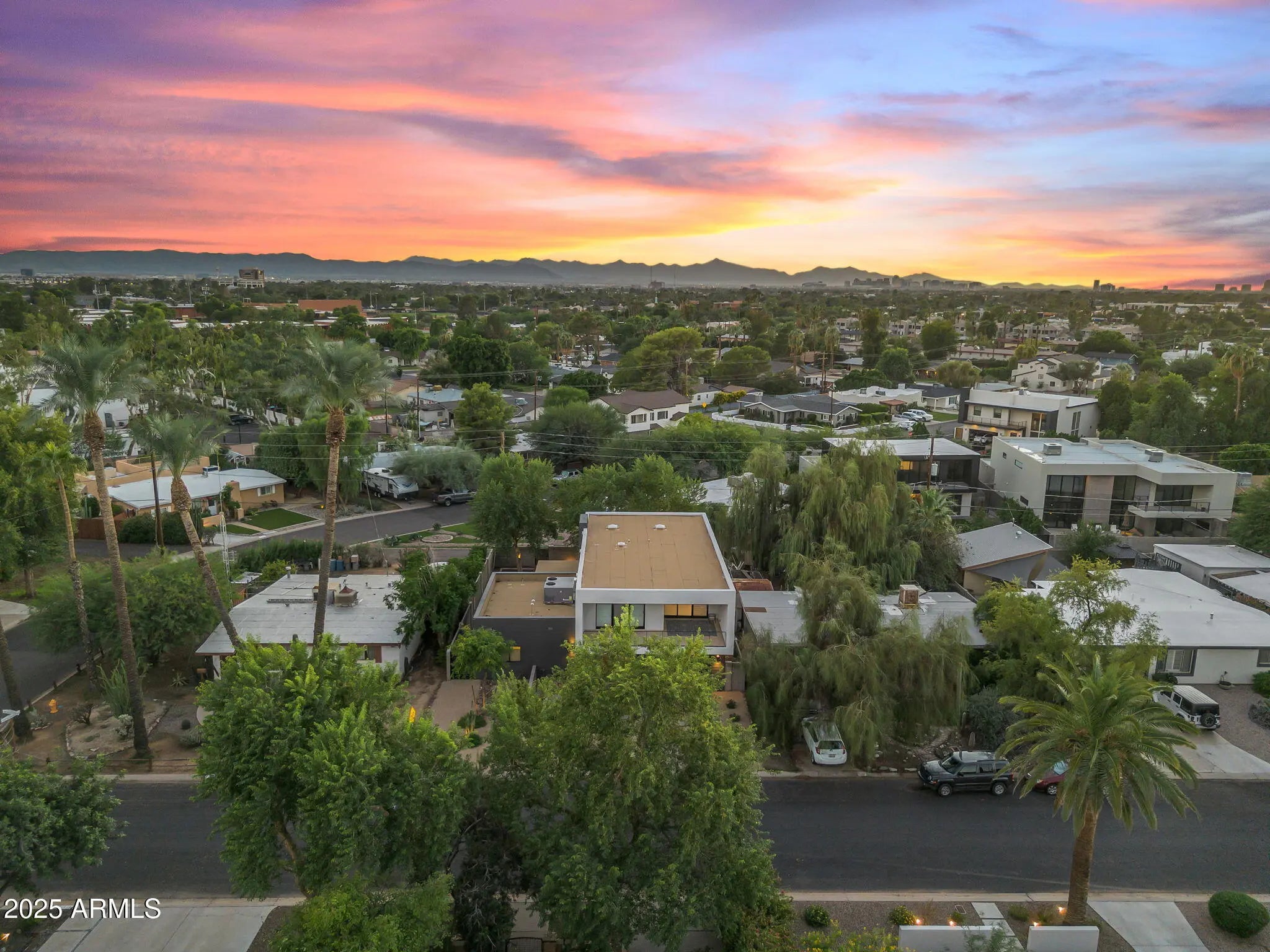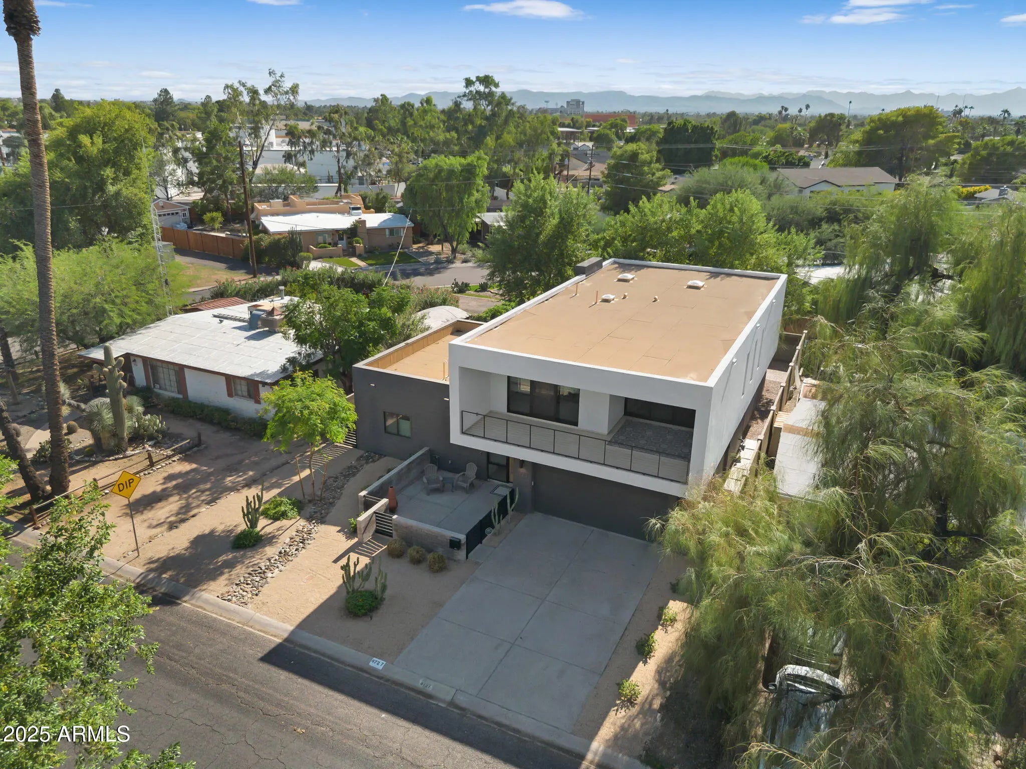 Stunning and rare view of Camelback from full-length front balcony of this state-of-the-art tech forward 2021 Arcadia rebuild. Aesthetic + Function + Comfort. Custom architecture utilizes the orientation of the lot to create maximum shade in the outdoor spaces, & design elements like multiple skylights to provide ample natural light inside. Every detail was meticulously chosen to suit the space and support energy efficiency. Soaring ceilings, custom staircase, gourmet kitchen with Bosch smart appliances, motorized blinds, tankless gas water heater, Caesarstone counters, soaking tub, stackable sliding glass doors, abundant lighting, canal adjacent. This home showcases quality construction, top of the line products, and optimal use of space to offer a unique luxury Arcadia living experience " 2,326 sq ft / 6,000 sq ft lot fully rebuilt in 2021 " 3 bedrooms / 2 bathrooms with split floor plan " Custom wood-block staircase, vaulted ceilings, exposed brick accents, and skylights in great room and primary bath " Gourmet quartz kitchen with Bosch smart appliances, oversized island, and custom cabinetry (incl. roll-up "garage-door" cabinet) Upstairs loft + primary suite open to full-length balcony with Camelback Mountain views " Primary suite features two walk-in closets and spa-style bath with quartz counters, walk-in shower, dual vanities, and bidet toilet " Downstairs: two bedrooms + oversized soaking tub bath; one bedroom with private patio access " Outdoor living: covered patio with gas fireplace, multiple shaded patios, private backyard with lawn, trees, and 6' privacy wall Smart features: recessed dimmable lighting, motorized blinds, Wi-Fi fans, Ring alarm + wiring for cameras, Ethernet/TV jacks in every room, centralized fiber hub " Dual industrial HVAC, tankless water heater, whole-home filtration " 2-car attached garage with smart opener, and Ethernet port Arcadia location walkable to restaurants, shops, grocery; minutes to Scottsdale, Phoenix, Camelback Mountain trails, and Arcadia High / SUSD schools