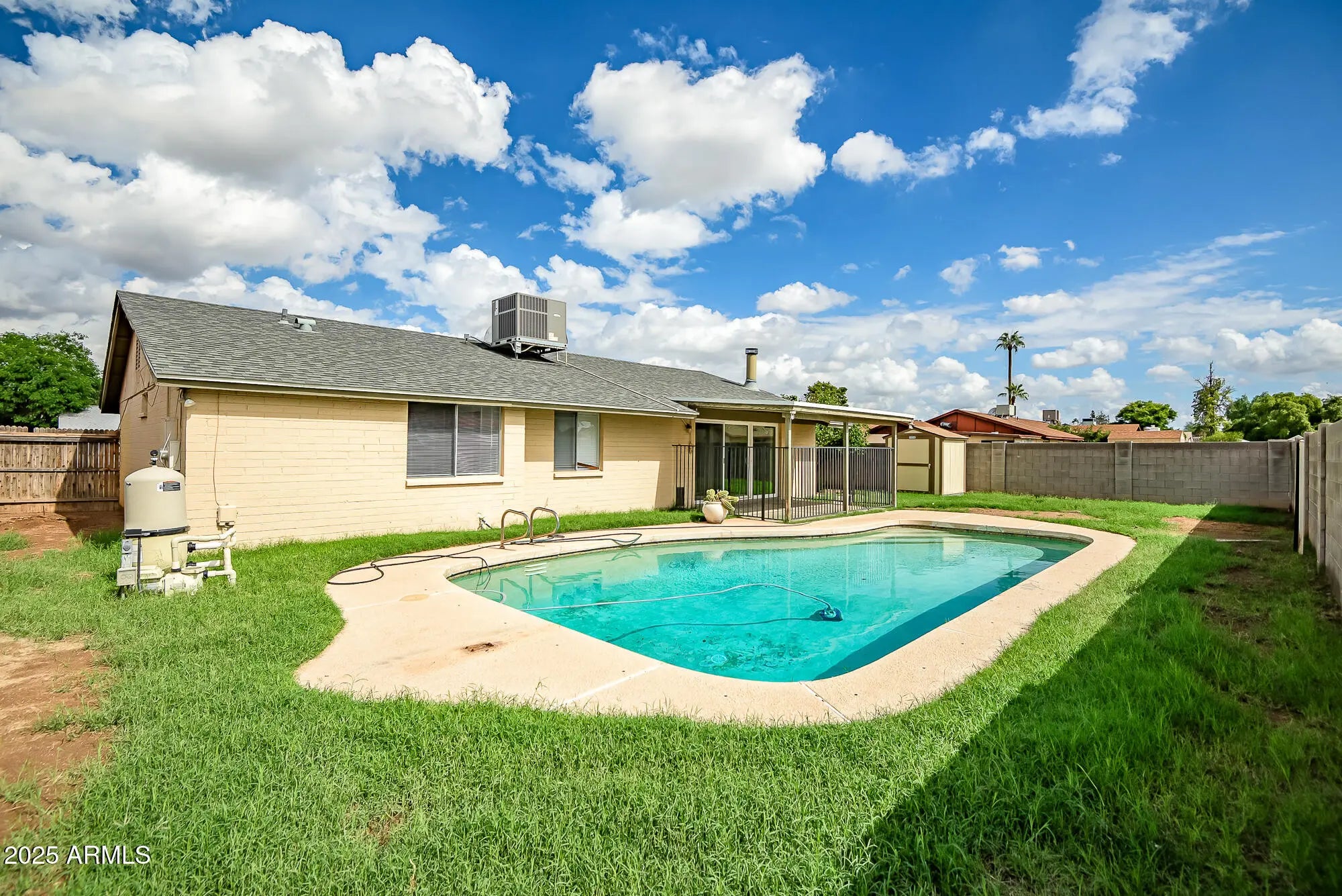 Charming 4 bed 2 bath brick home with a pool and RV parking. NO HOA. Gorgeous living room with vaulted ceilings, a stunning brick fireplace, durable wood look tile, and an extra-large dual pane slider to the backyard. The kitchen features new granite countertops, dual sinks, walk in pantry, and all appliances are included. All 4 bedrooms have new flooring, window coverings, and ceiling fans. New interior and exterior paint, newer roof and AC (both about 5 years old), washer and dryer are also included. Great location in this quiet neighborhood with a large park and playground right down the street, Glendale Community College and Saguaro Ranch Park are also right next door. Great value here, come see today!