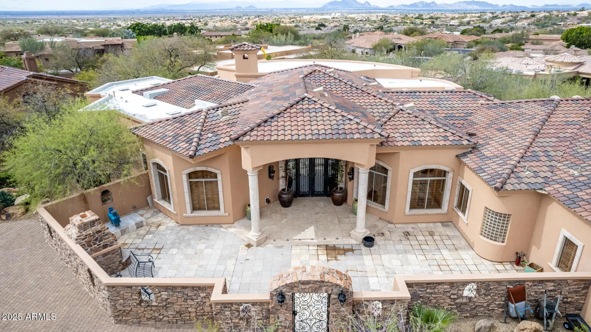 Nestled in the exclusive Rancho Trinidad enclave of North Scottsdale, this stunning 5,841 sq ft estate, built in 2002, redefines luxury across a private 2-acre lot. With 5 bedrooms and 6 bathrooms, this single-family masterpiece offers breathtaking vistas of Scottsdale Mountain, vibrant city lights, and the Sonoran Desert's iconic sunsets. A gated driveway ushers you into a serene courtyard, where a flickering fireplace sets an elegant tone. Inside, 18-foot coffered ceilings soar above meticulously crafted interiors, adorned with custom shutters, electronic sun shades, and bespoke artisan finishes. The gourmet kitchen, a culinary haven, boasts dual pantries, premium stainless appliances, and twin islands, seamlessly connecting to a grand great room warmed by a stately fireplace—perfect for sophisticated gatherings. The palatial primary suite is a private retreat, featuring a cozy fireplace, a spa-inspired ensuite with natural stone accents, and a walk-in closet rivaling high-end boutiques. Three additional en-suite bedrooms, including a fully appointed detached guest house, offer luxurious comfort for family or guests. Outdoors, the sprawling grounds unfold into a desert paradise: a resort-style pool and spa cascade amid terraced gardens, with expansive patios ideal for starlit entertaining. Located in the prestigious 85259 ZIP code, minutes from top-rated BASIS Scottsdale, the scenic McDowell Sonoran Preserve, and the vibrant DC Ranch community, this estate marries tranquility with connectivity. Embrace a lifestyle where every detail exudes timeless luxury and Arizona's natural splendor.