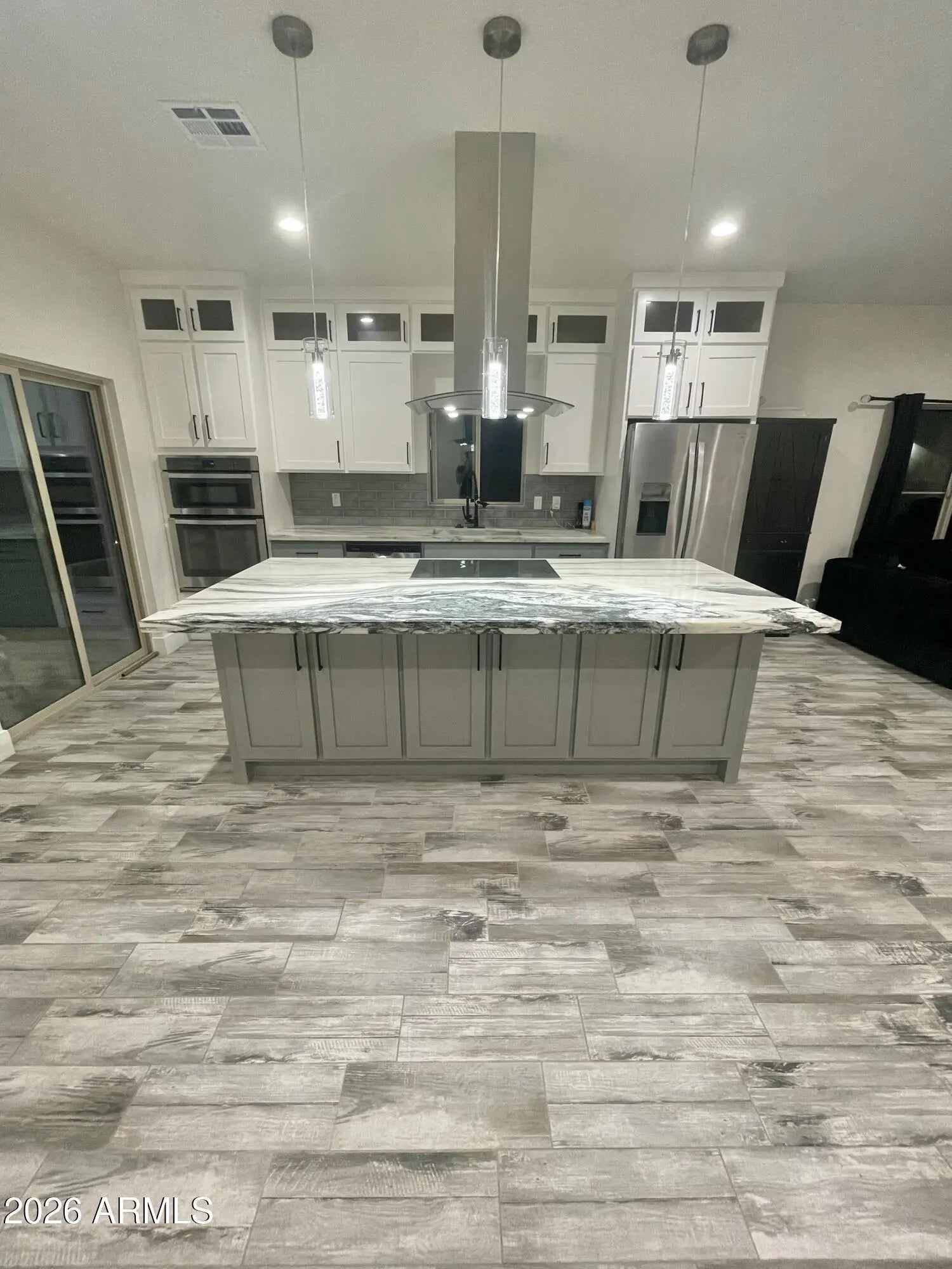Discover attainable luxury in this 2024-built AZ home where modern design meets small-town comfort. Sleek neutral tones, ceramic wood-look tile, and an open concept set the stage for high-end living. The designer kitchen features two-tone shaker cabinets, black hardware, quartz countertops, a spacious island with cooktop, wall oven, stainless steel appliances, gray tiled backsplash, and a farmhouse sink with waterfall faucet overlooking the expansive backyard. Positioned on a corner lot with added parking and RV gate. Well-appointed bedrooms feature laminate flooring, while the primary suite includes a walk-in closet and tiled shower. An upgraded laundry room with two-tone cabinets, washer, dryer, and utility sink leads to the two-car garage—bringing practicality together seamlessly!