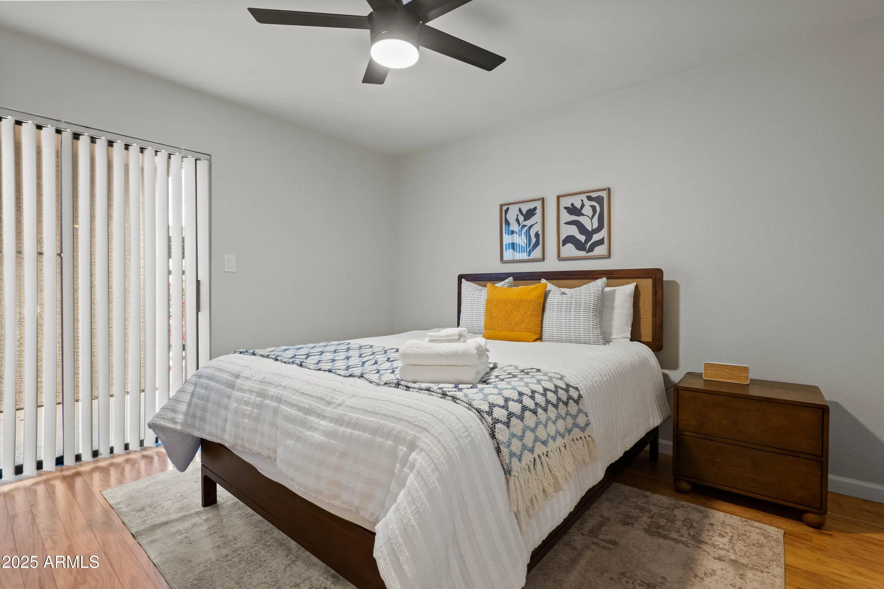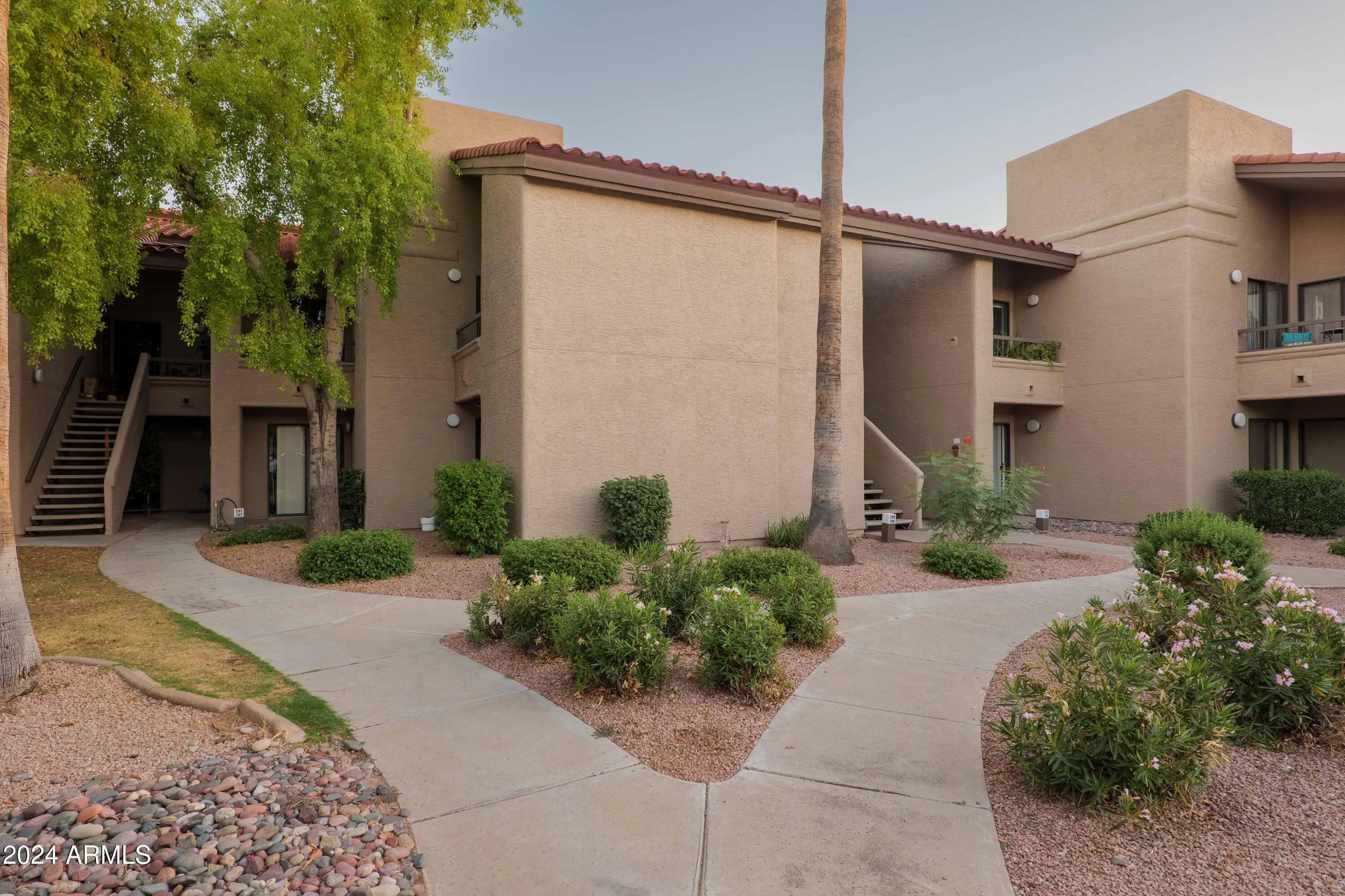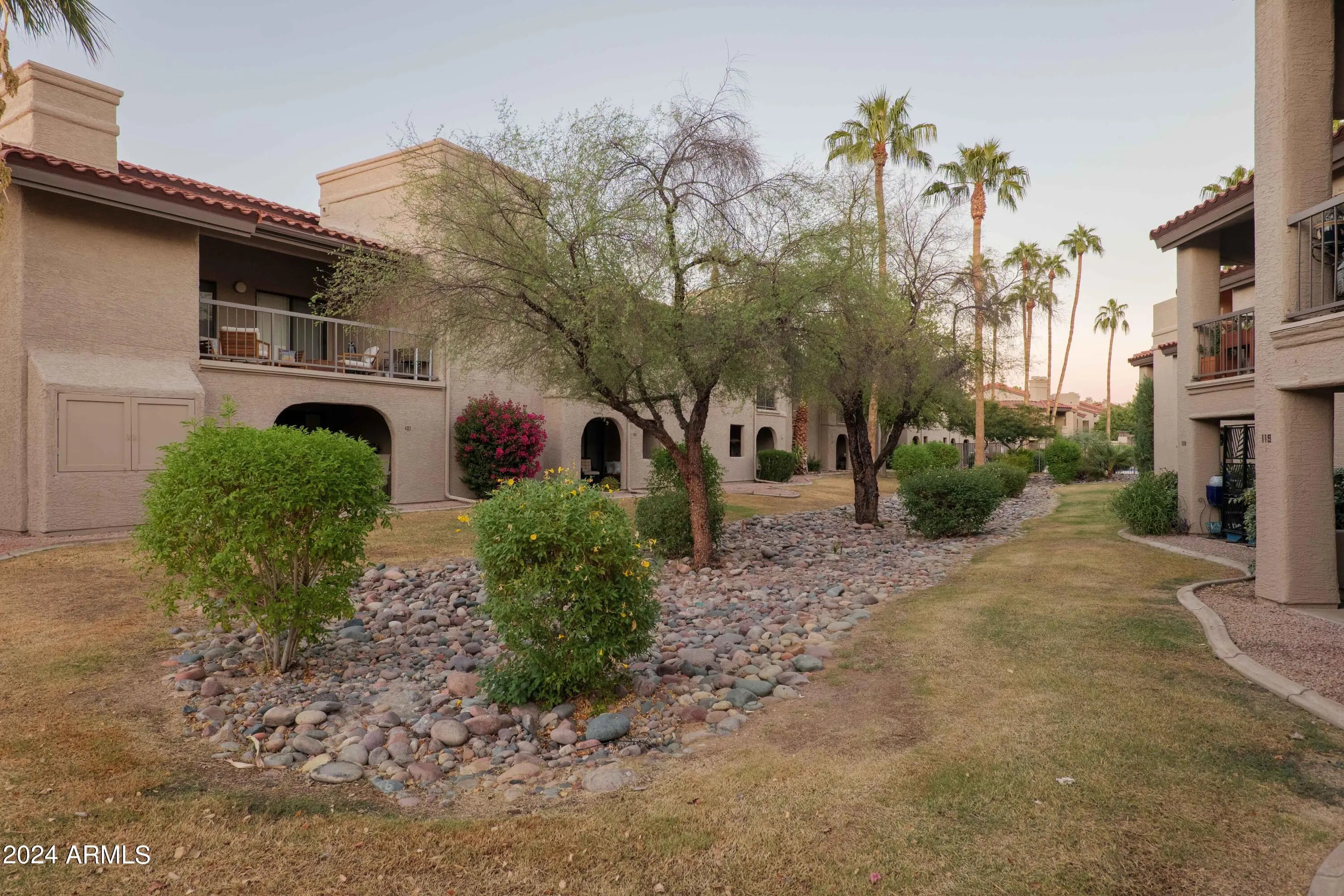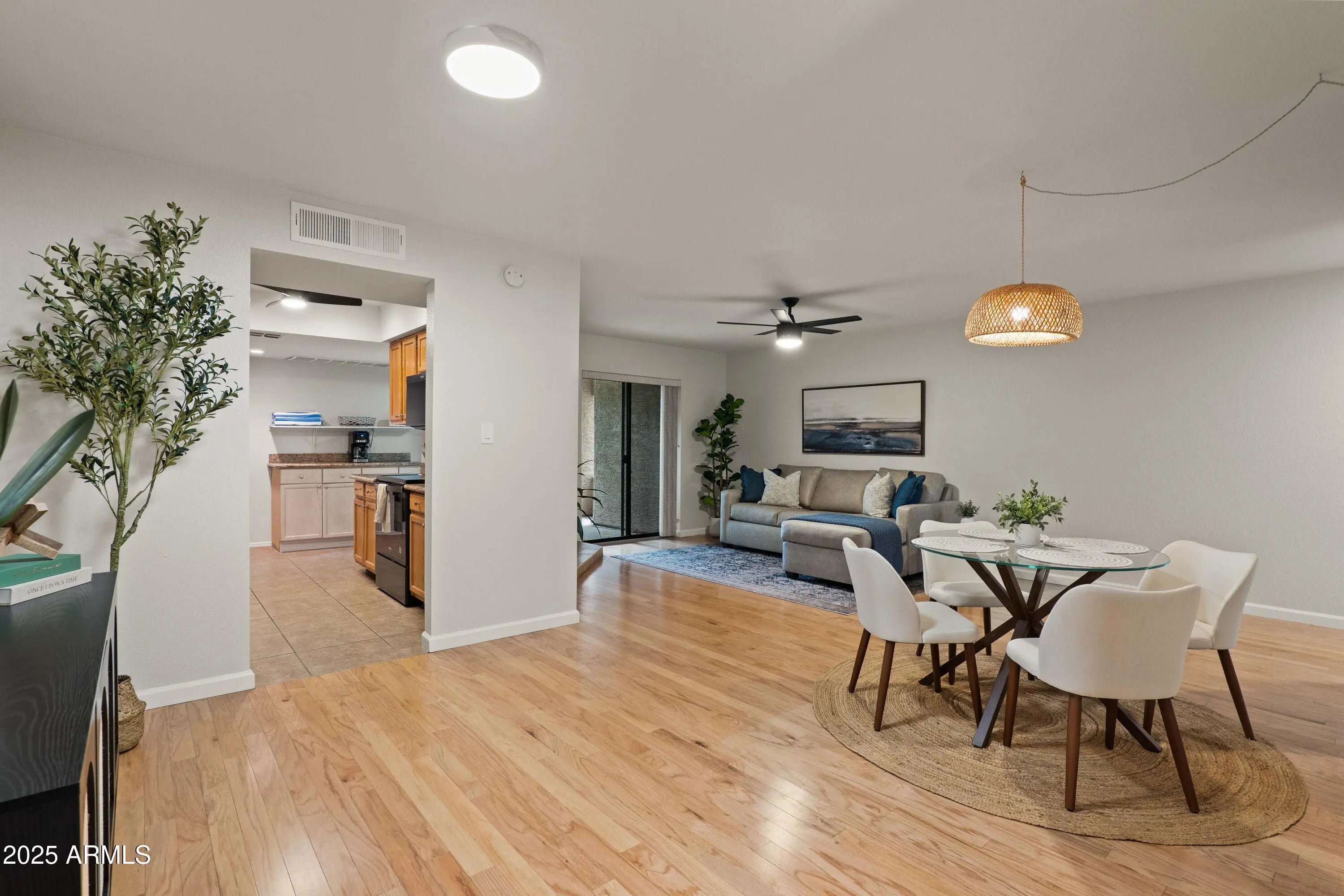 Fabulous ground-level condo in Village Three, a McCormick Ranch Community. Upon entry to this 2 bedroom/2 bath residence, warm hardwood oak flooring welcomes you into the spacious living room, replete with recessed lighting and cozy fireplace, with dining area and one of two great covered patios. The large kitchen features granite counters, wood cabinetry, durable ceramic tile, informal breakfast area and additional patio access. The oak wood flooring continues throughout both bedrooms, and primary bedroom features a large, walk-in closet and bath w/dual sinks. Both bedrooms have large sliding glass doors to the second covered patio and both bathrooms have real wood vanity cabinets. Entire unit has been painted, upgraded with new HVAC, ceiling fans & front-load laundry appliances.