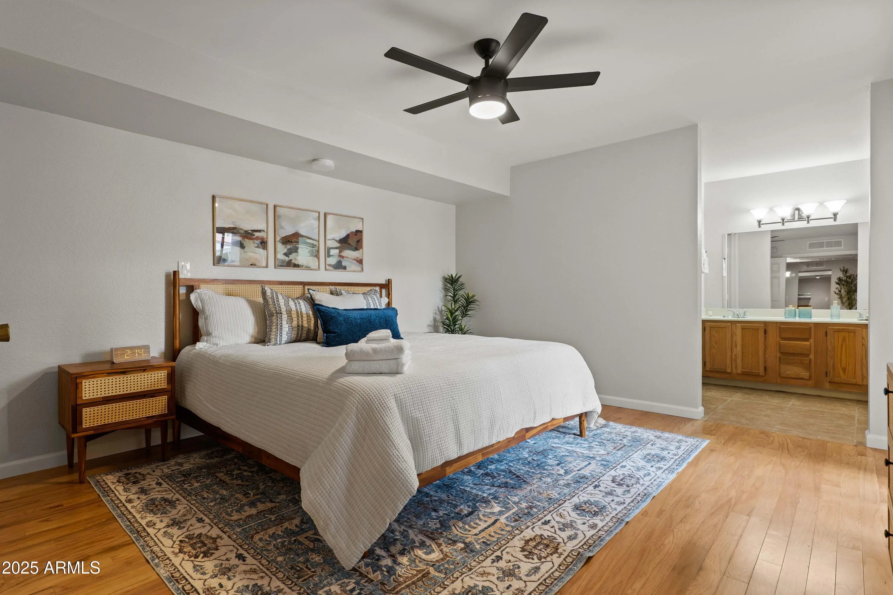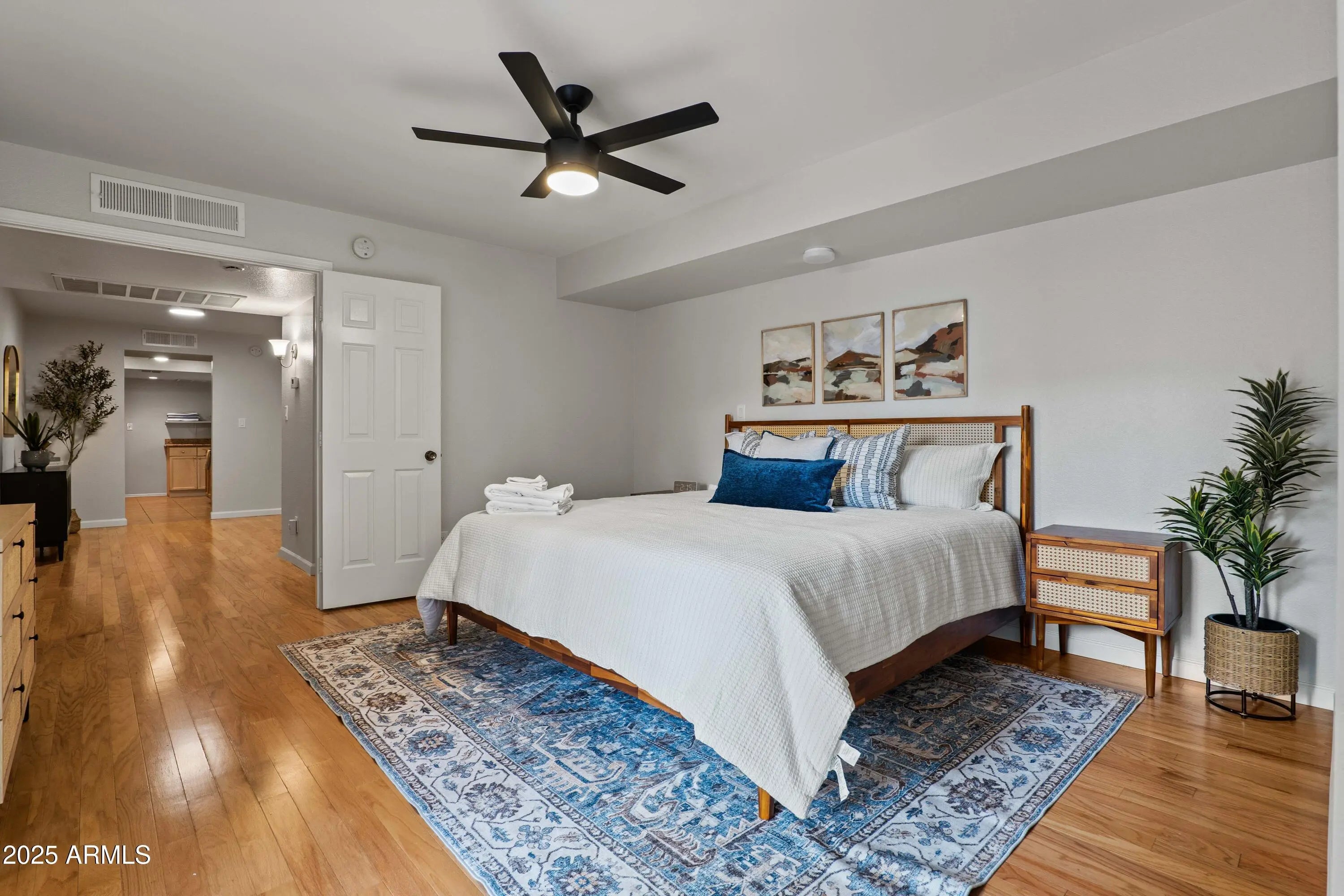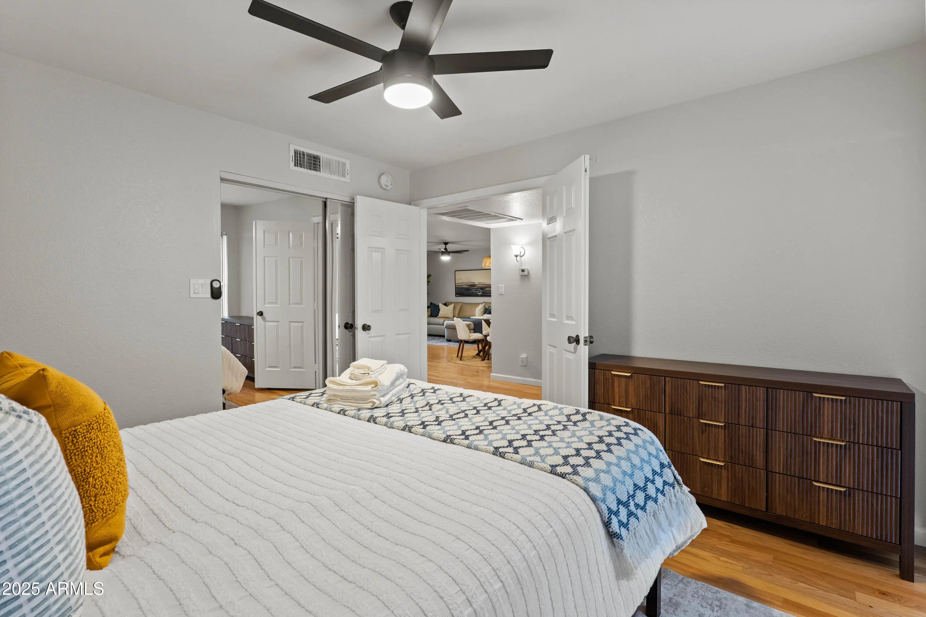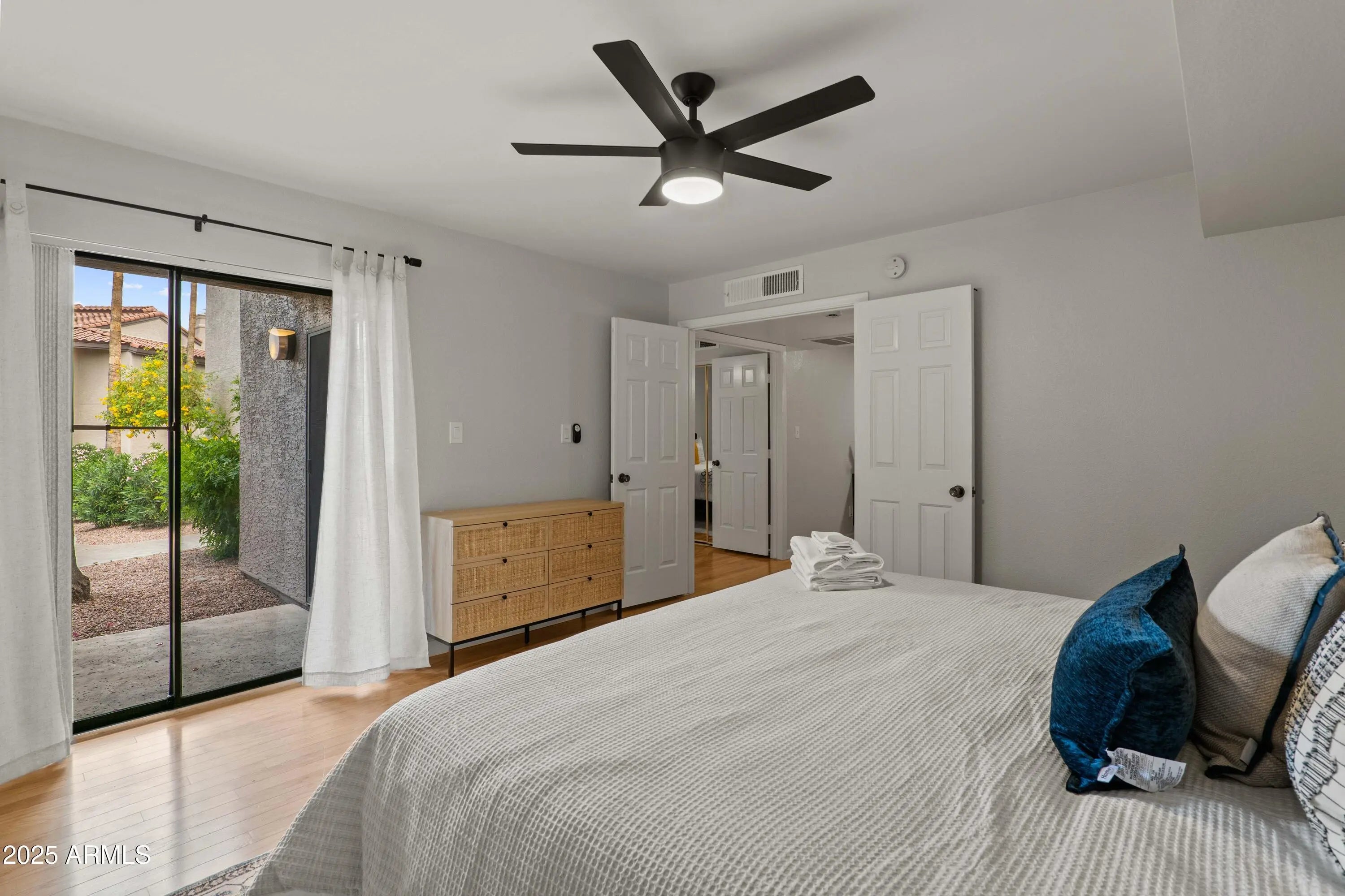 Fabulous ground-level condo in Village Three, a McCormick Ranch Community. Upon entry to this 2 bedroom/2 bath residence, warm hardwood oak flooring welcomes you into the spacious living room, replete with recessed lighting and cozy fireplace, with dining area and one of two great covered patios. The large kitchen features granite counters, wood cabinetry, durable ceramic tile, informal breakfast area and additional patio access. The oak wood flooring continues throughout both bedrooms, and primary bedroom features a large, walk-in closet and bath w/dual sinks. Both bedrooms have large sliding glass doors to the second covered patio and both bathrooms have real wood vanity cabinets. Entire unit has been painted, upgraded with new HVAC, ceiling fans & front-load laundry appliances.