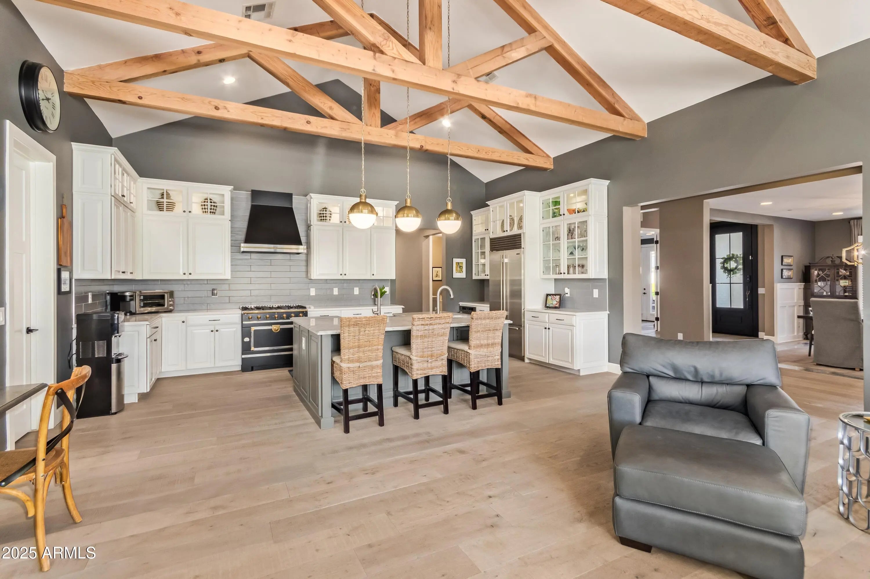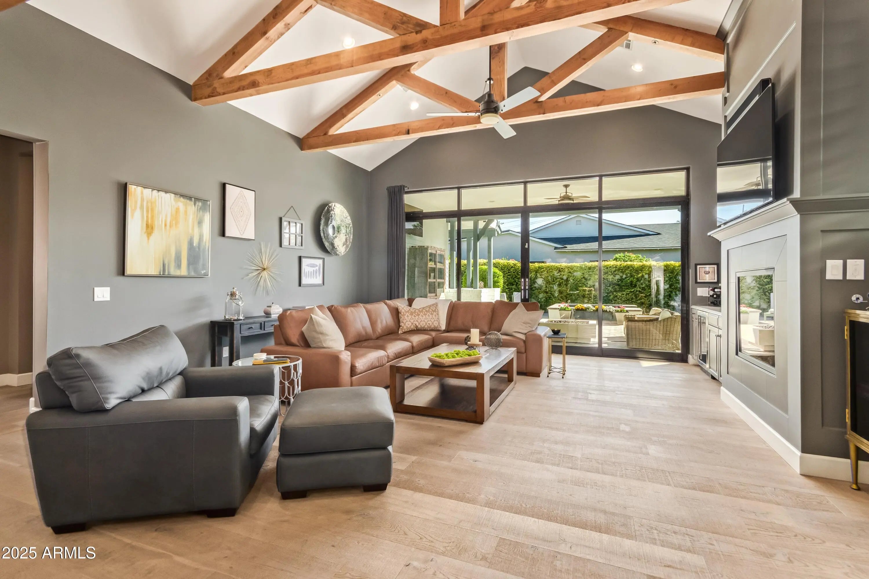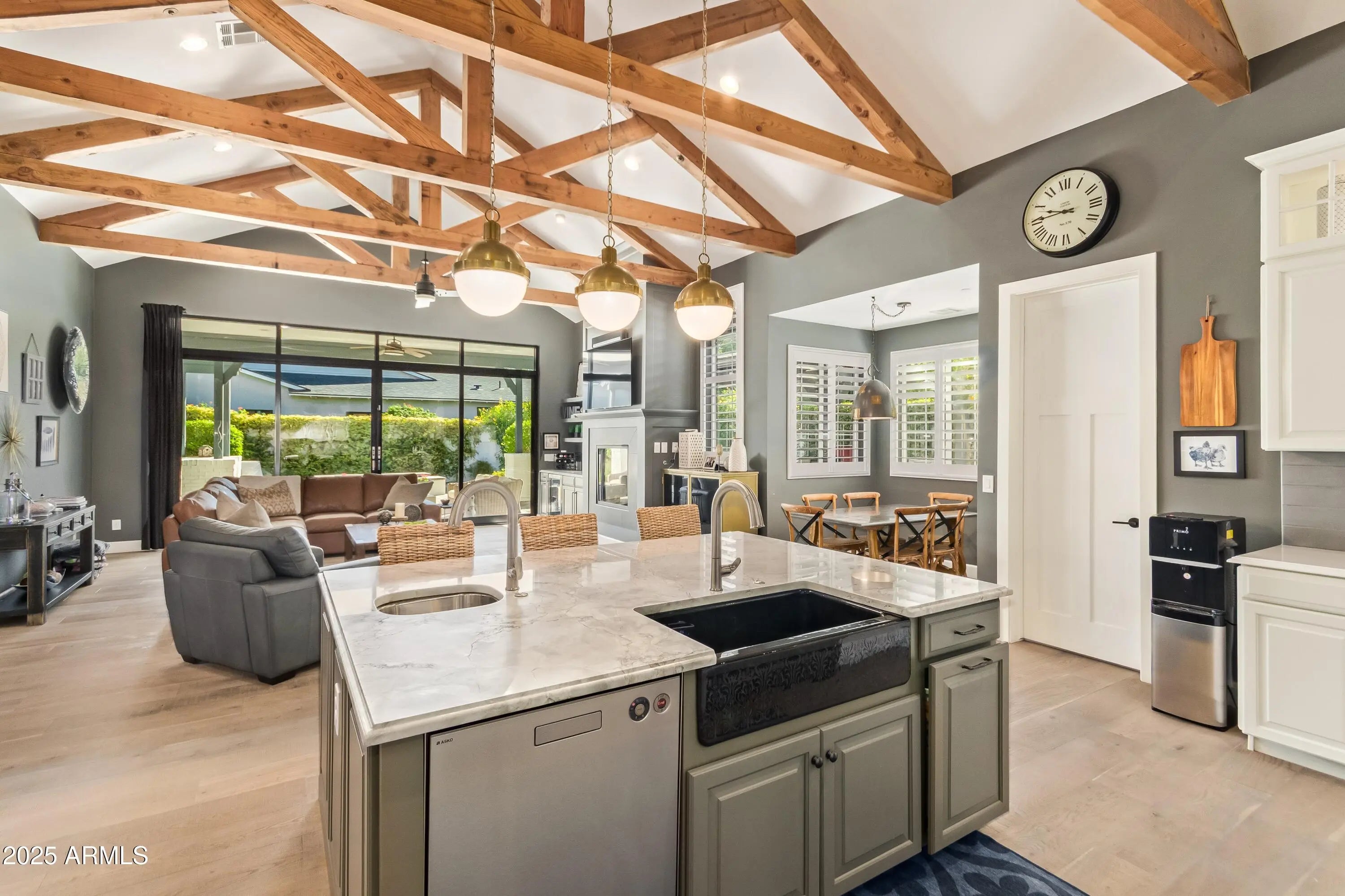 Located in Arcadia Proper, this refined modern farmhouse blends upscale design with relaxed livability on a large corner lot with manicured landscaping, white rose accents, mature oak trees, and beautiful Camelback Mountain views. The exterior was just professionally repainted, creating timeless curb appeal. Inside, warm wood tones and rich architectural detail enhance the inviting atmosphere. The vaulted family room features exposed wood rafters and a classic fireplace, while the designer kitchen showcases a Sub-Zero refrigerator, La Cornue range, and marble and Caesarstone Quartz surfaces. A rare Arcadia Proper offering.