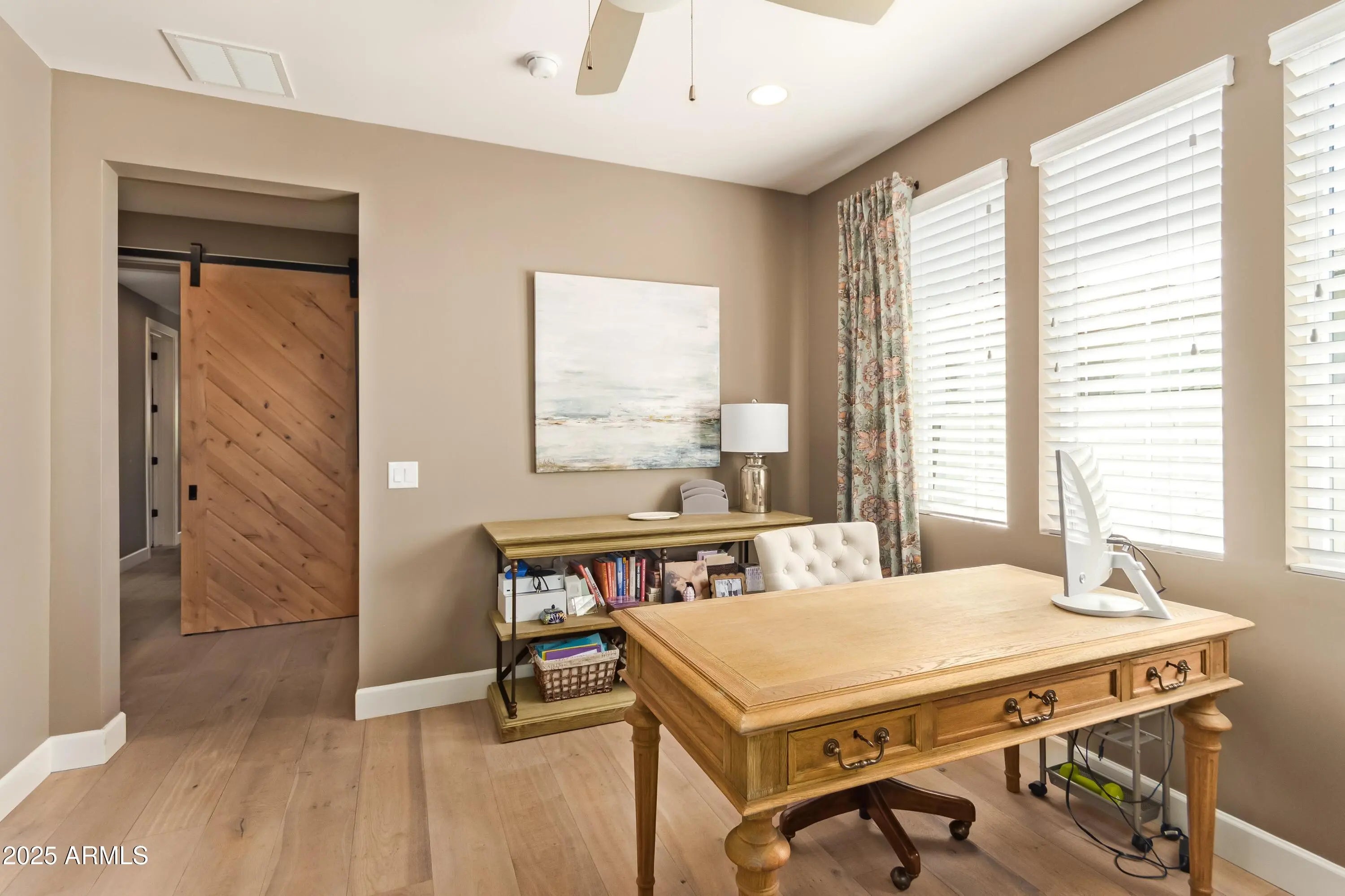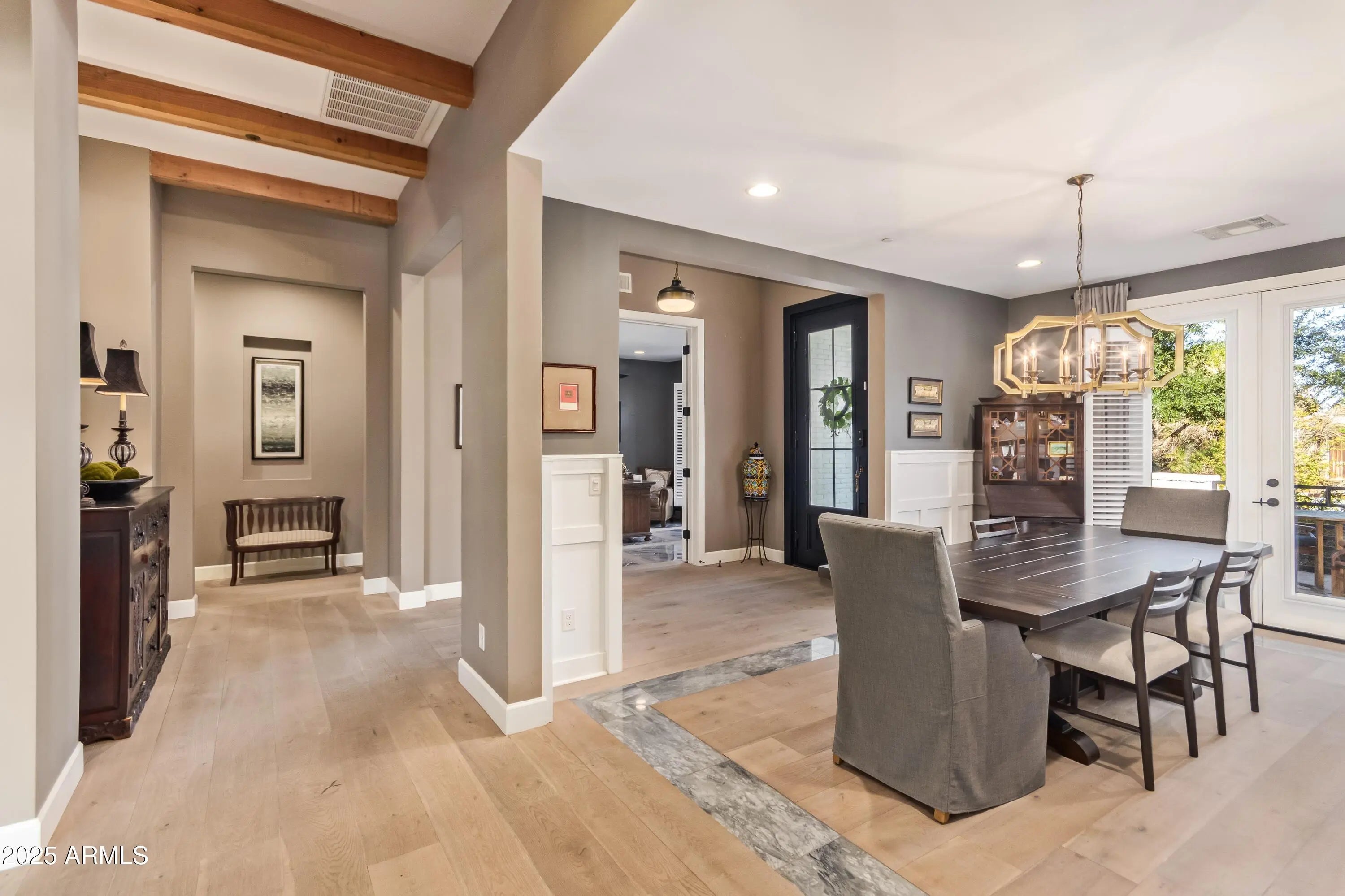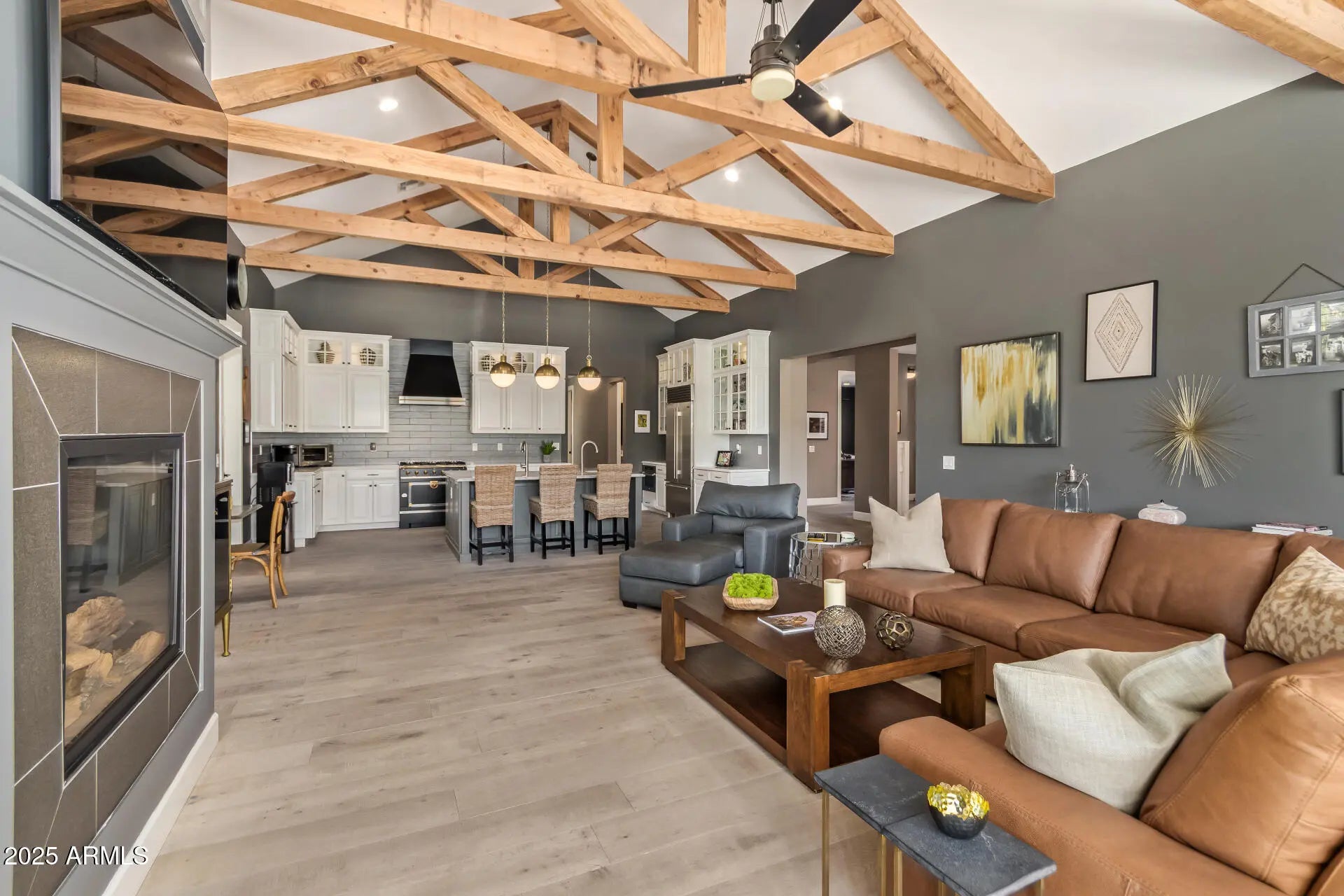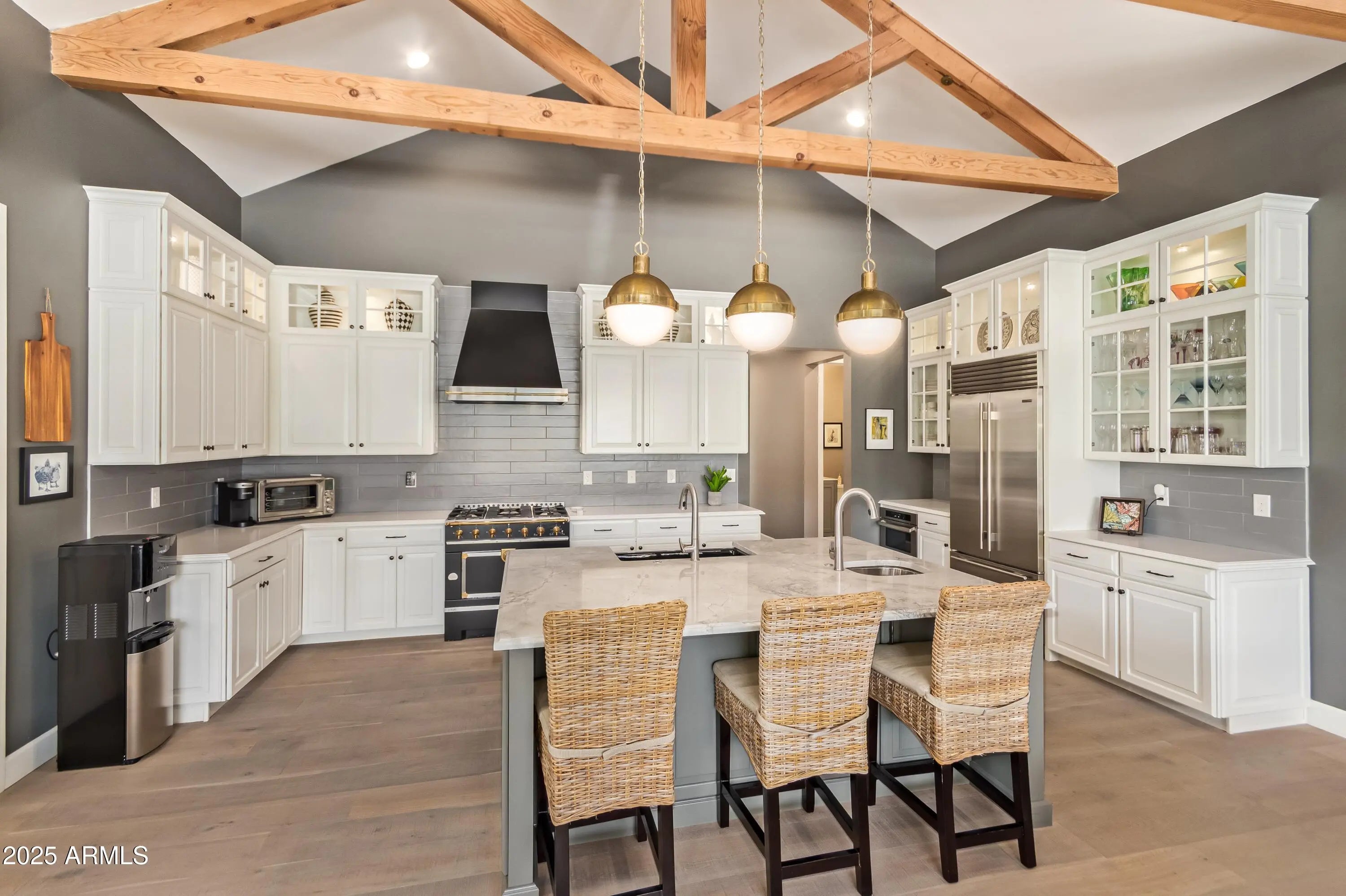 Located in Arcadia Proper, this refined modern farmhouse blends upscale design with relaxed livability on a large corner lot with manicured landscaping, white rose accents, mature oak trees, and beautiful Camelback Mountain views. The exterior was just professionally repainted, creating timeless curb appeal. Inside, warm wood tones and rich architectural detail enhance the inviting atmosphere. The vaulted family room features exposed wood rafters and a classic fireplace, while the designer kitchen showcases a Sub-Zero refrigerator, La Cornue range, and marble and Caesarstone Quartz surfaces. A rare Arcadia Proper offering.