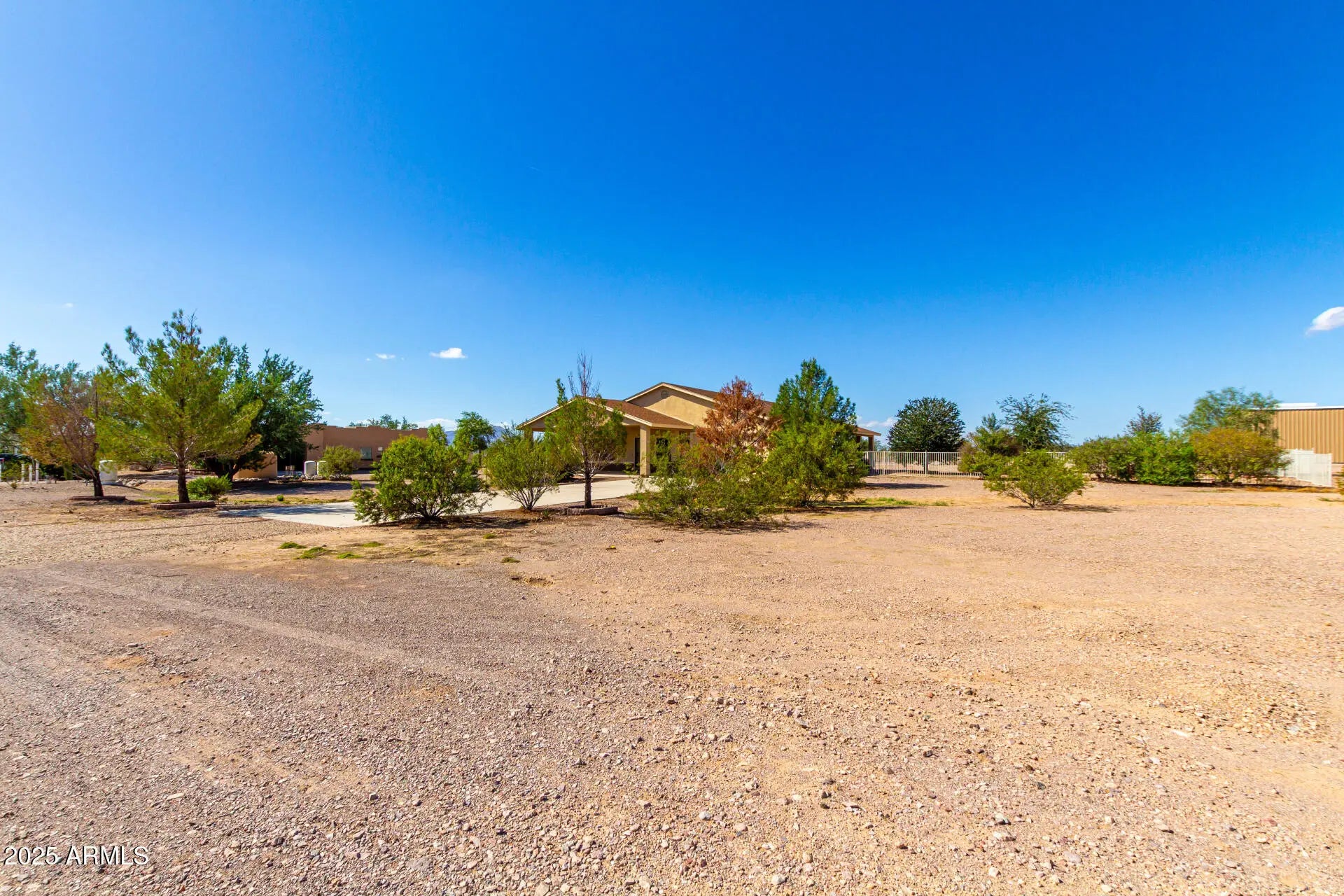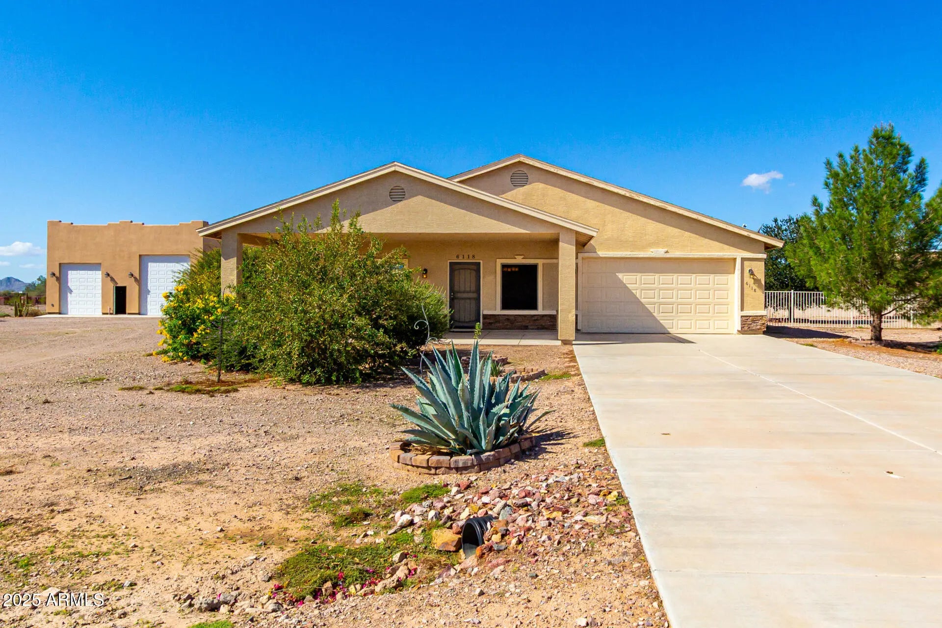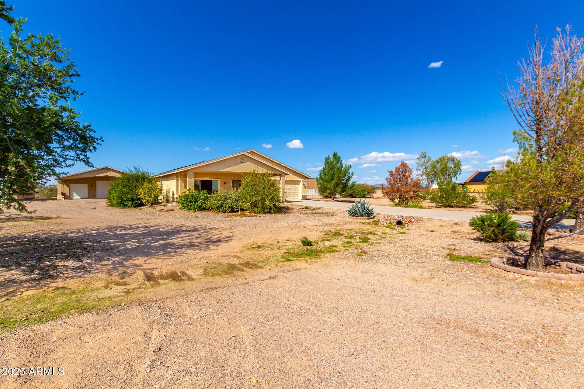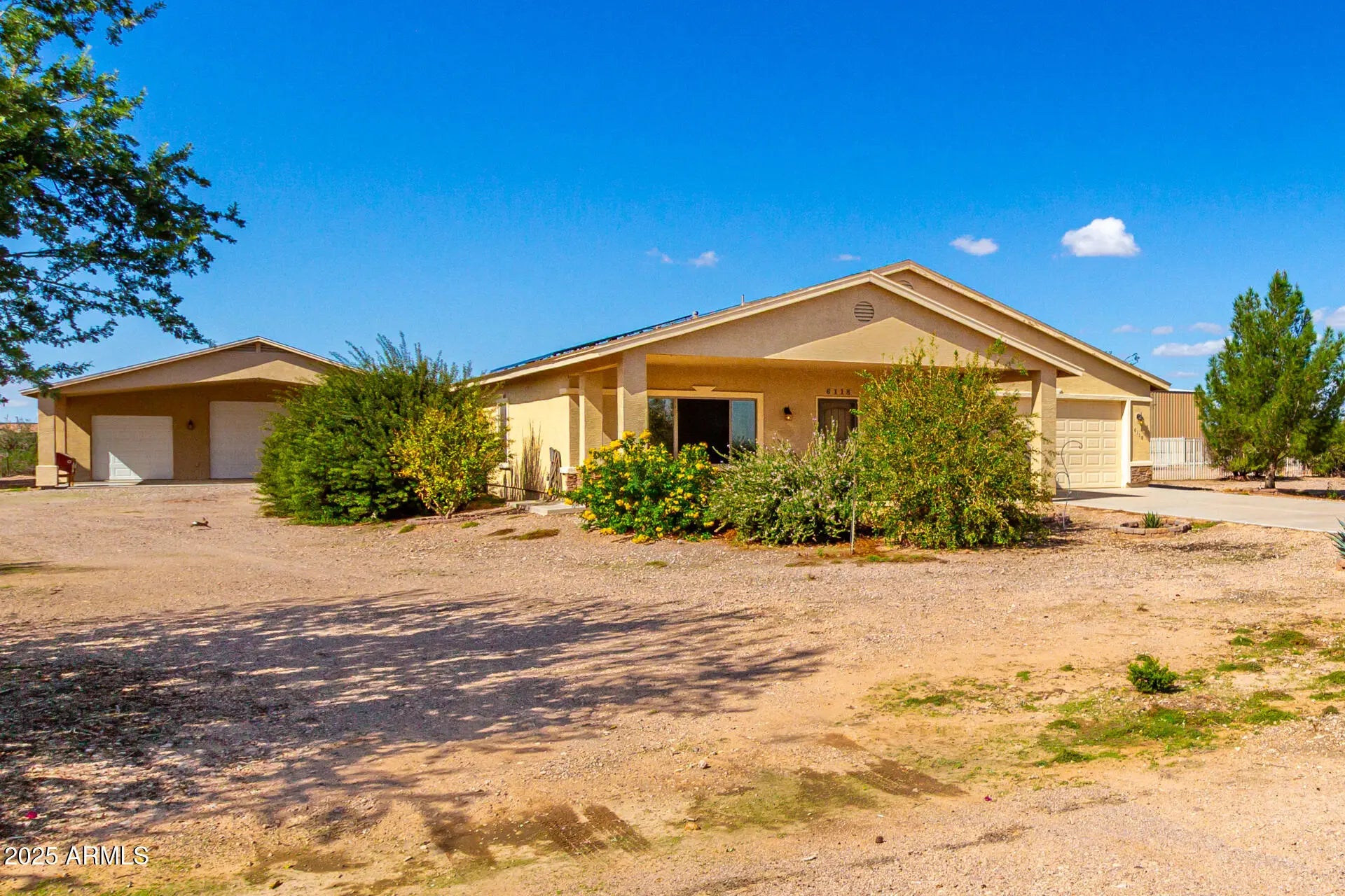 Do you need more garage space? This home is for you! This single level home offers nearly 2,200 sq ft of living space, 2 garages capable of holding up to 11 vehicles (climate controlled), additional covered parking for 5 vehicles & an acre of land! There are 3 large bedrooms with a den that could easily be a 4th bedroom if needed. Throughout you will notice tall ceilings (vaulted in the main spaces & 9' everywhere else), Tile/ Laminate wood floors (no carpet), neutral paint, 2'' faux wood blinds & ceiling fans in every room. The kitchen features oak cabinets & newer appliances (fridge included). The primary suite is HUGE & offers double sinks, renovated shower & large walk-in closet. Outside there are several covered patios overlooking your 1 acre lot. Mature trees, fenced yard & plenty of room for your horses, future pool, guest house or whatever you want to make it! The detached garage was built to match the house & is climate controlled. It offers plenty of LED lights, 100amp sub panel, lots of outlets (including 220 for your electric car, RV or welder), there is also water at the exterior of the building. There are 3 garage doors ranging 8' to 10' tall & interior ceiling height over 12' in some places allowing you to install car lifts or park an RV. Energy efficient items include sunscreens around the exterior windows & solar for lower electric bills! Tremendous value! 6,302 sq ft under roof (2,178 sq ft living space, 1,692 sq ft garage space, 1,282 sq ft carport space & 1,150 sq ft of covered patios), a home built in 2008 & an acre of land. Come purchase your slice of paradise today!