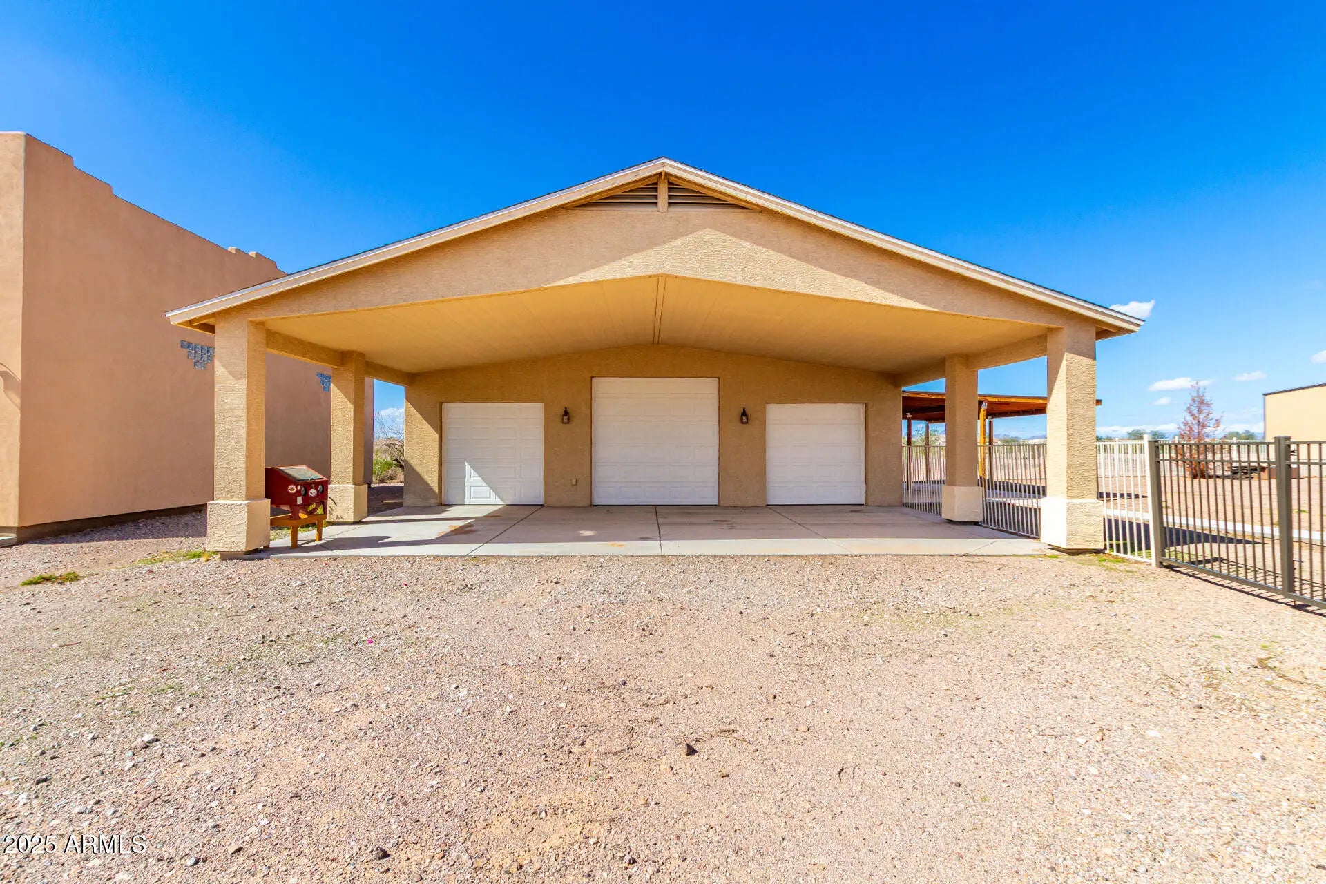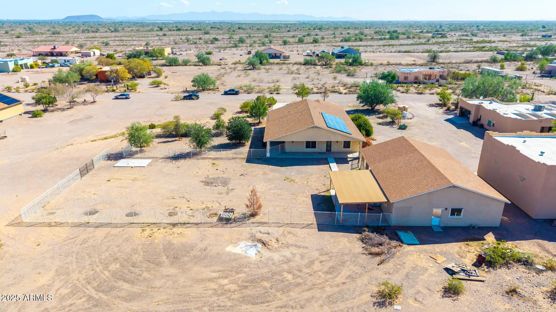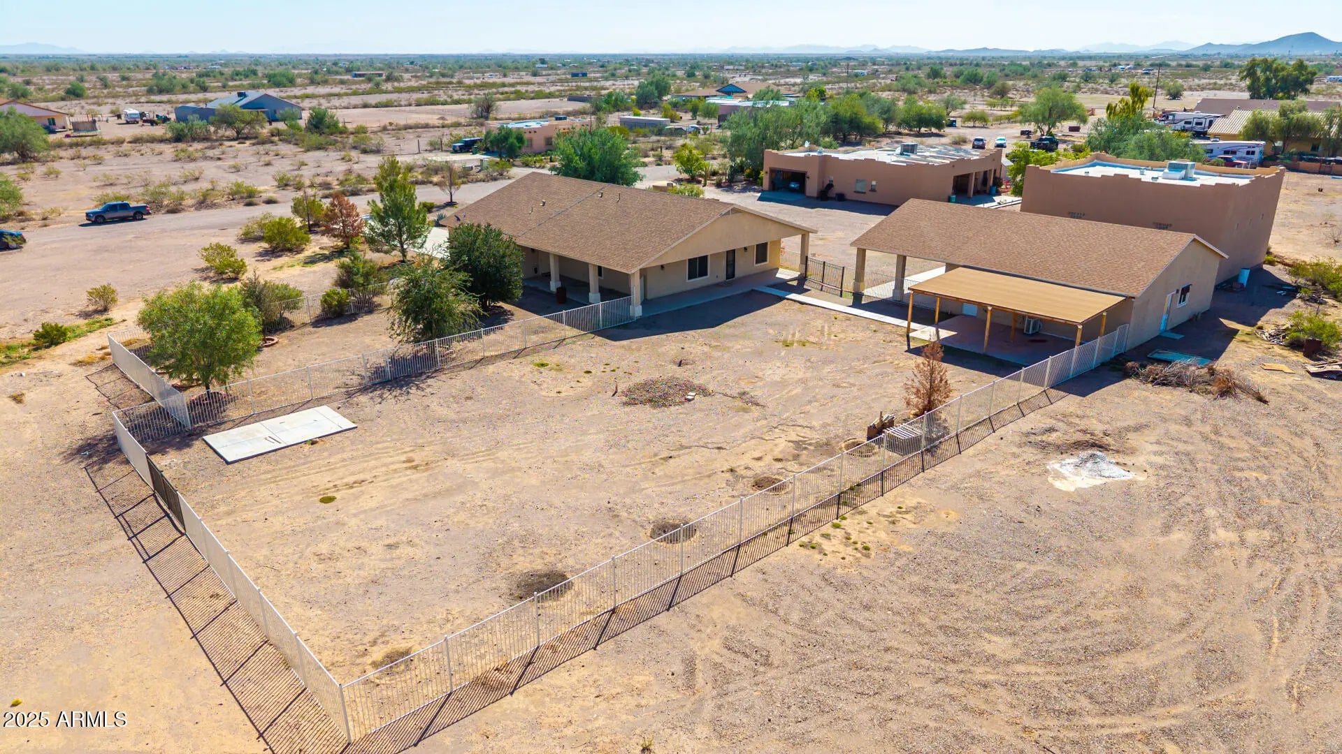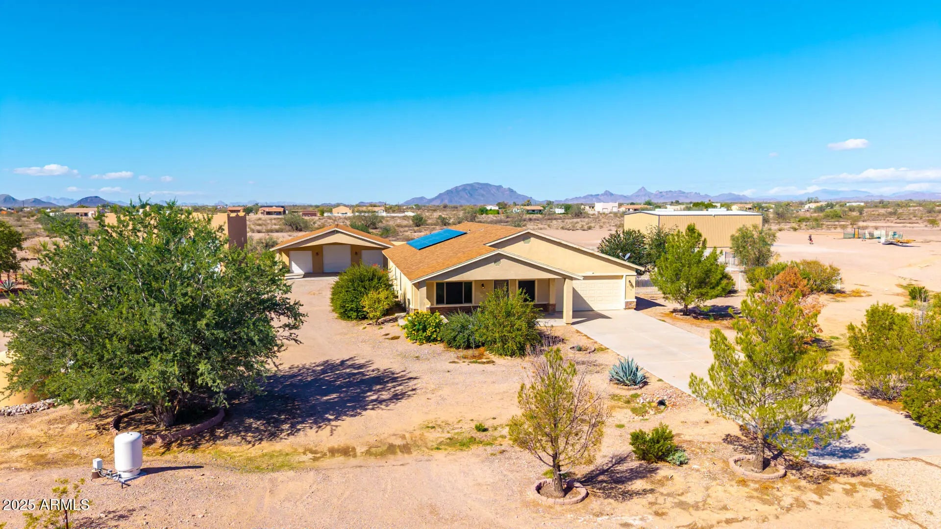 Do you need more garage space? This home is for you! This single level home offers nearly 2,200 sq ft of living space, 2 garages capable of holding up to 11 vehicles (climate controlled), additional covered parking for 5 vehicles & an acre of land! There are 3 large bedrooms with a den that could easily be a 4th bedroom if needed. Throughout you will notice tall ceilings (vaulted in the main spaces & 9' everywhere else), Tile/ Laminate wood floors (no carpet), neutral paint, 2'' faux wood blinds & ceiling fans in every room. The kitchen features oak cabinets & newer appliances (fridge included). The primary suite is HUGE & offers double sinks, renovated shower & large walk-in closet. Outside there are several covered patios overlooking your 1 acre lot. Mature trees, fenced yard & plenty of room for your horses, future pool, guest house or whatever you want to make it! The detached garage was built to match the house & is climate controlled. It offers plenty of LED lights, 100amp sub panel, lots of outlets (including 220 for your electric car, RV or welder), there is also water at the exterior of the building. There are 3 garage doors ranging 8' to 10' tall & interior ceiling height over 12' in some places allowing you to install car lifts or park an RV. Energy efficient items include sunscreens around the exterior windows & solar for lower electric bills! Tremendous value! 6,302 sq ft under roof (2,178 sq ft living space, 1,692 sq ft garage space, 1,282 sq ft carport space & 1,150 sq ft of covered patios), a home built in 2008 & an acre of land. Come purchase your slice of paradise today!